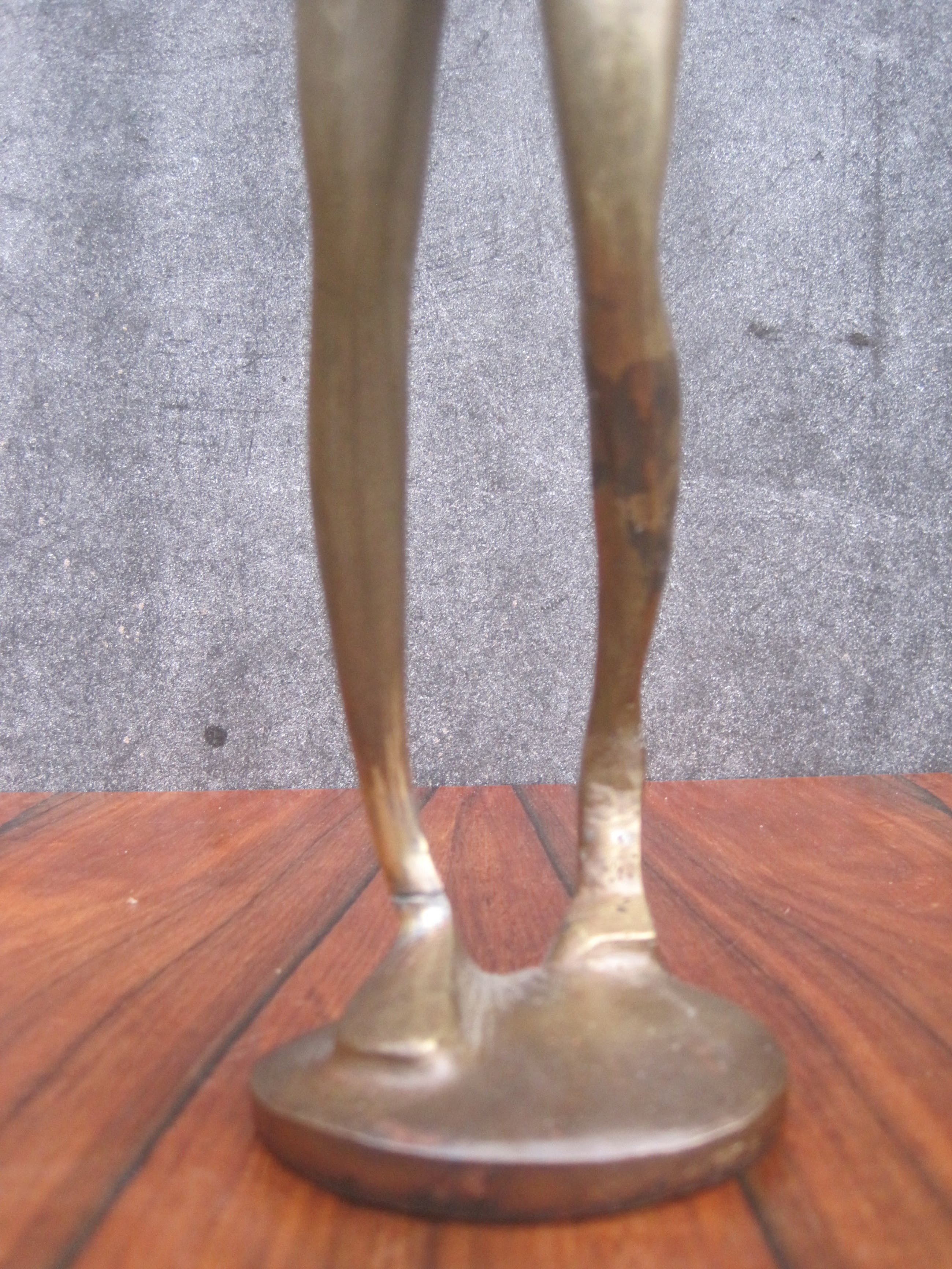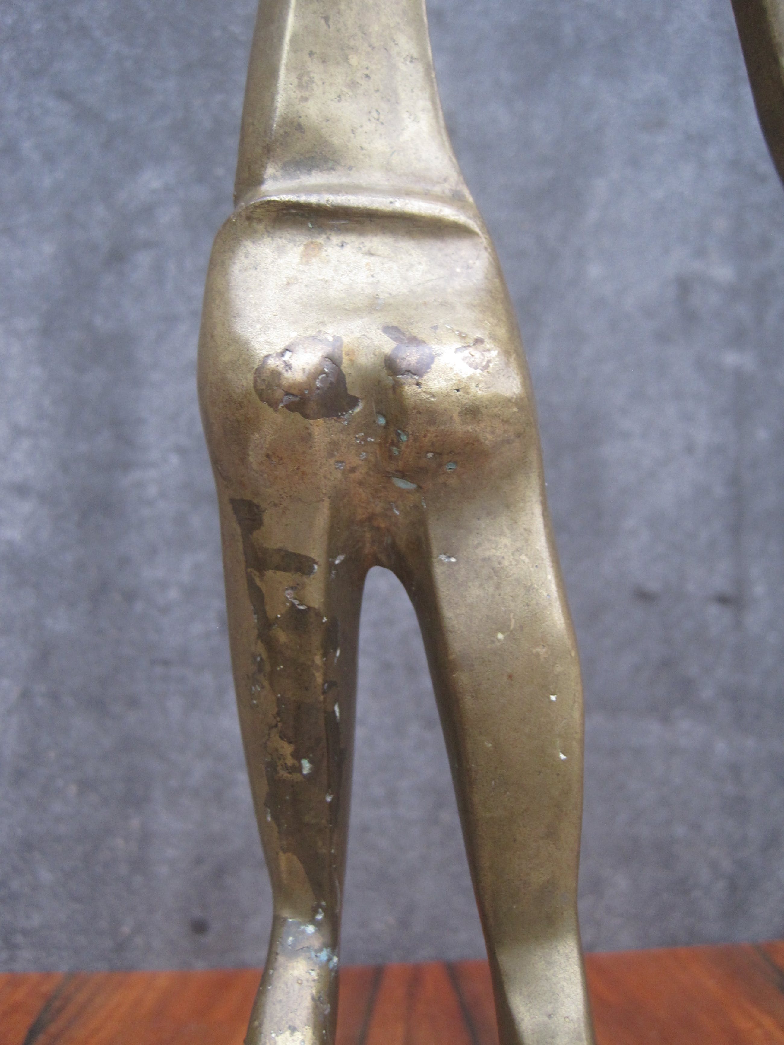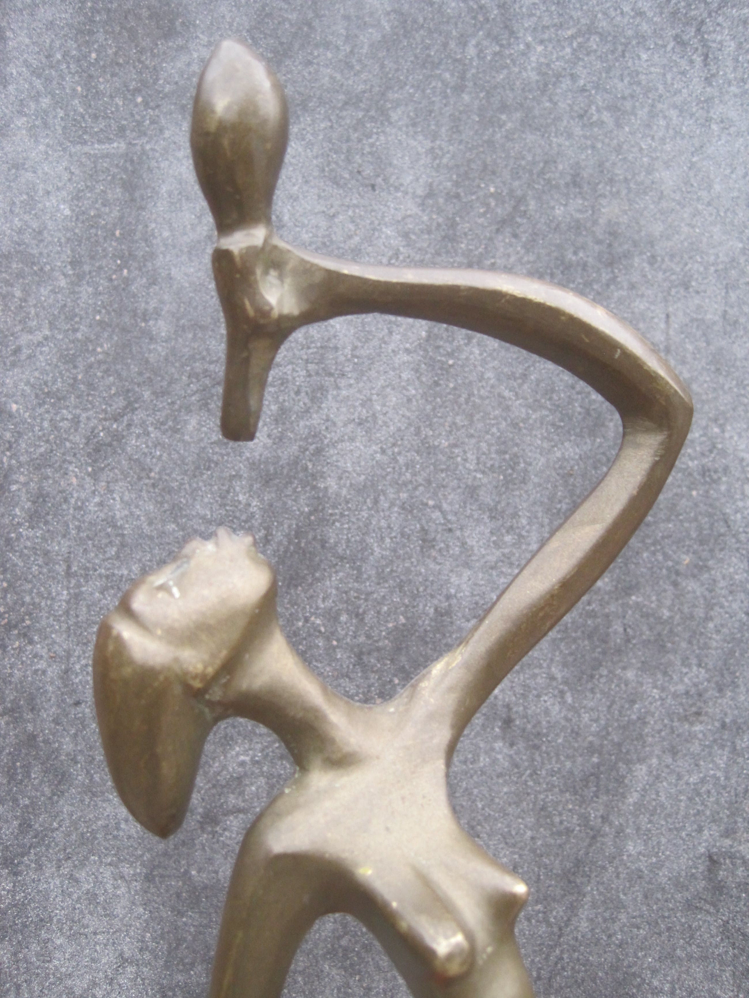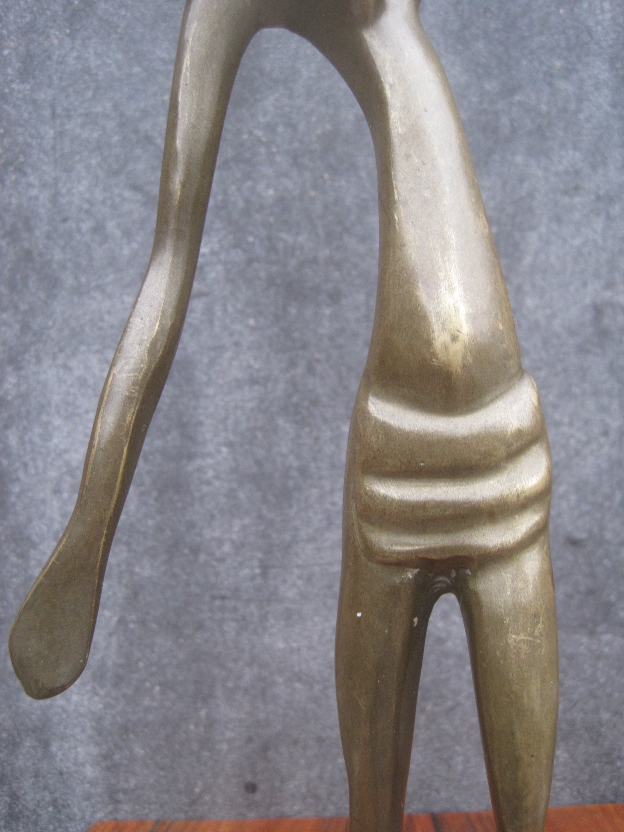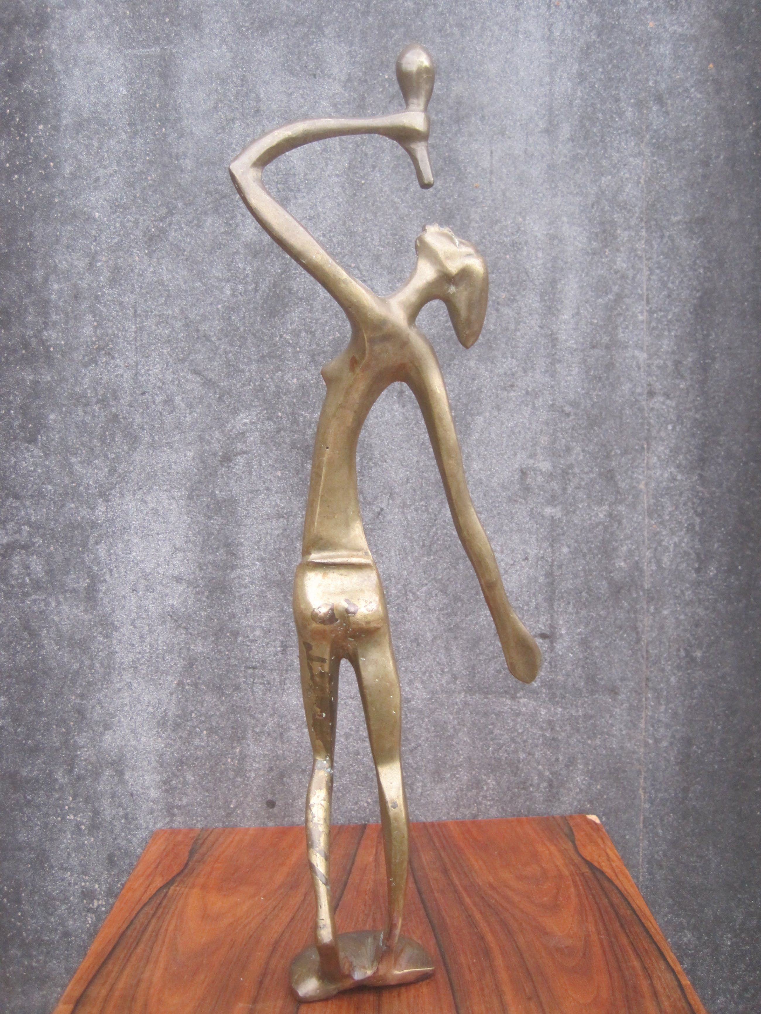 Een slank en gestileerd zwaar bronzen beeld van een feestende vrouw. Gegoten in Hagenauer stijl. Dit beeld heeft aan de achterkant enkele plekken met wat donkerder brons. In haar rechter enkel zit een barst.