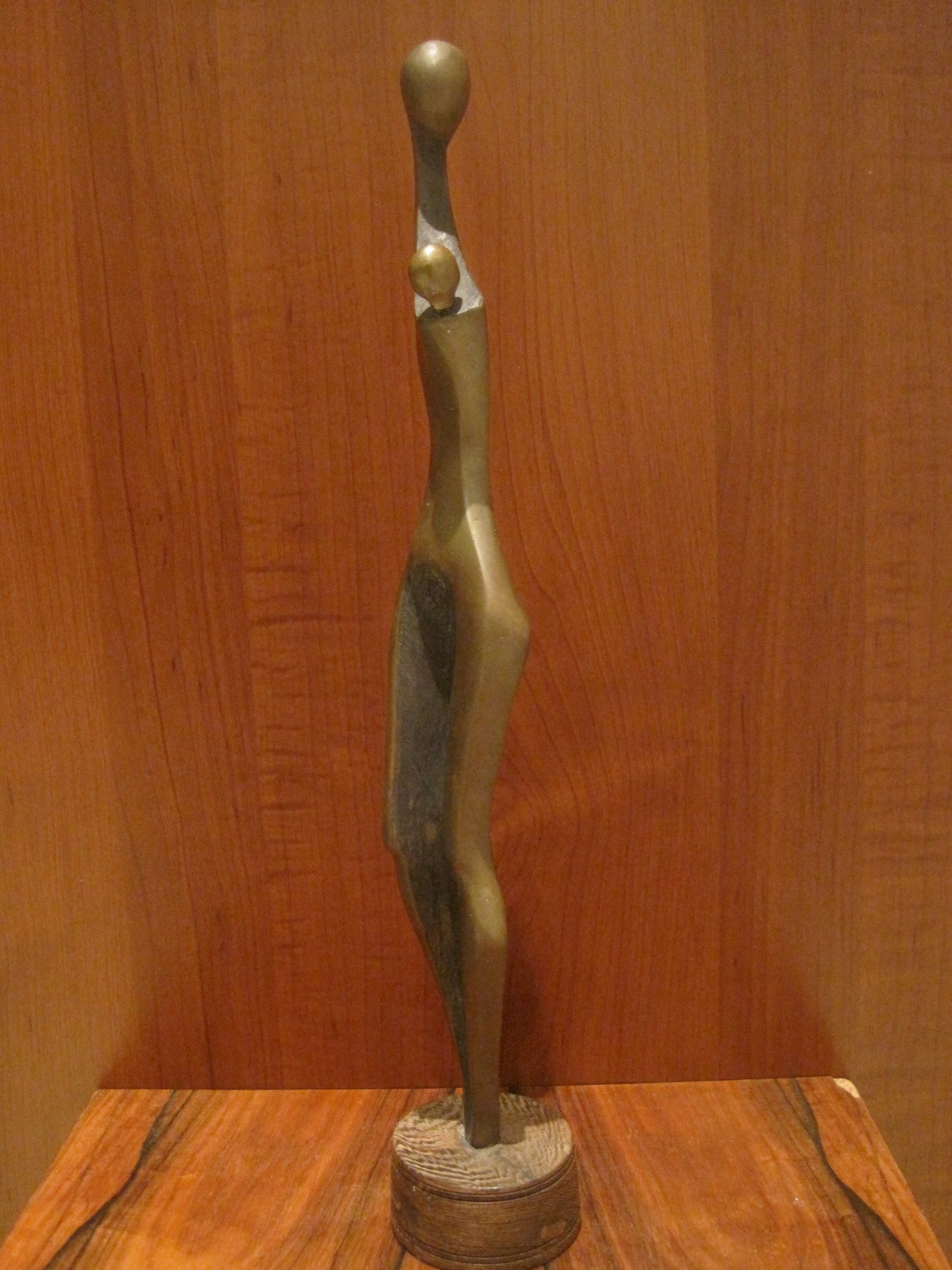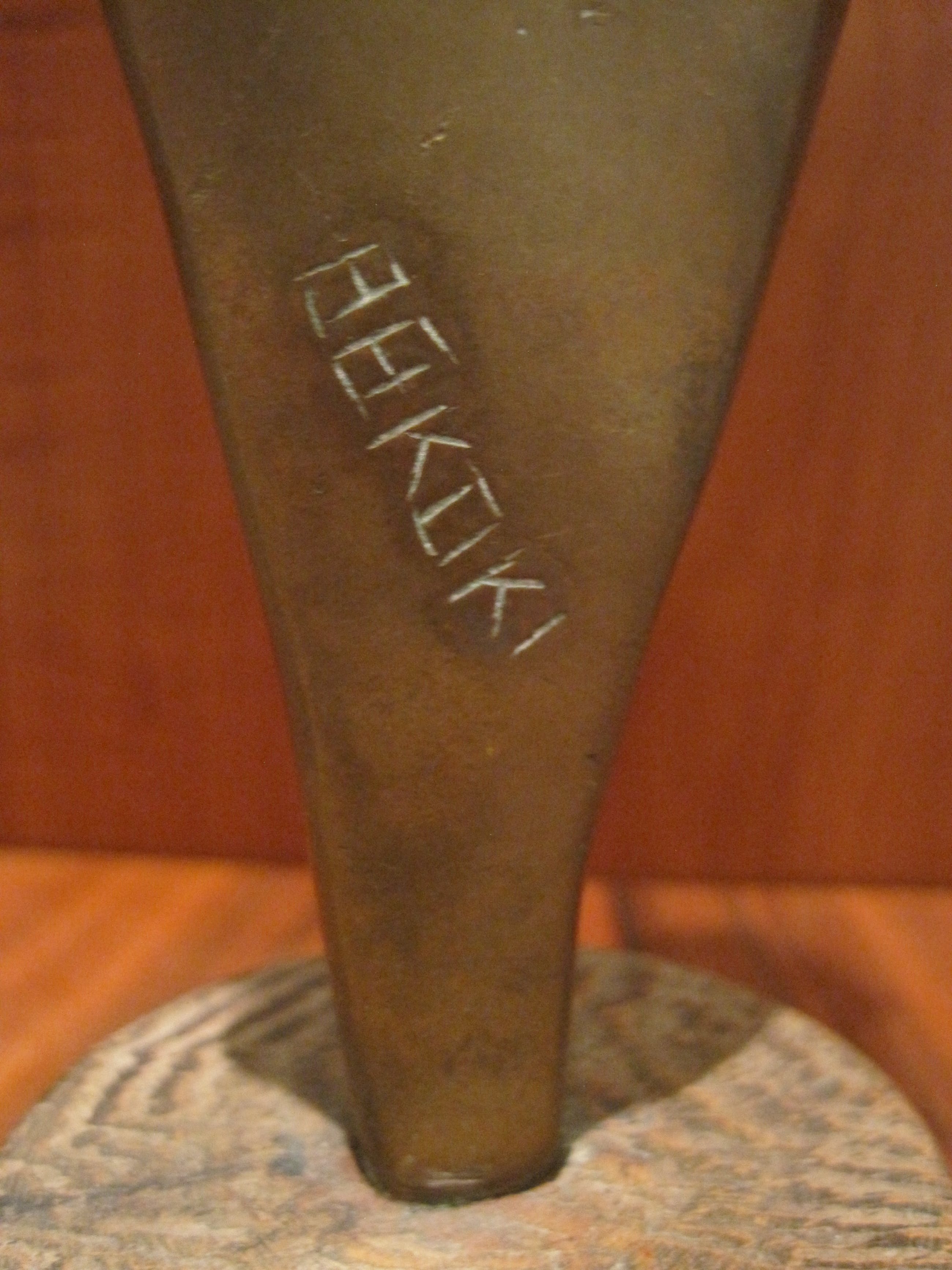 Een elegant massief bronzen beeld. Het beeld is gesigneerd en mogelijk gedateerd: 88KOKI ? Het beeld staat op een fraaie houten sokkel.