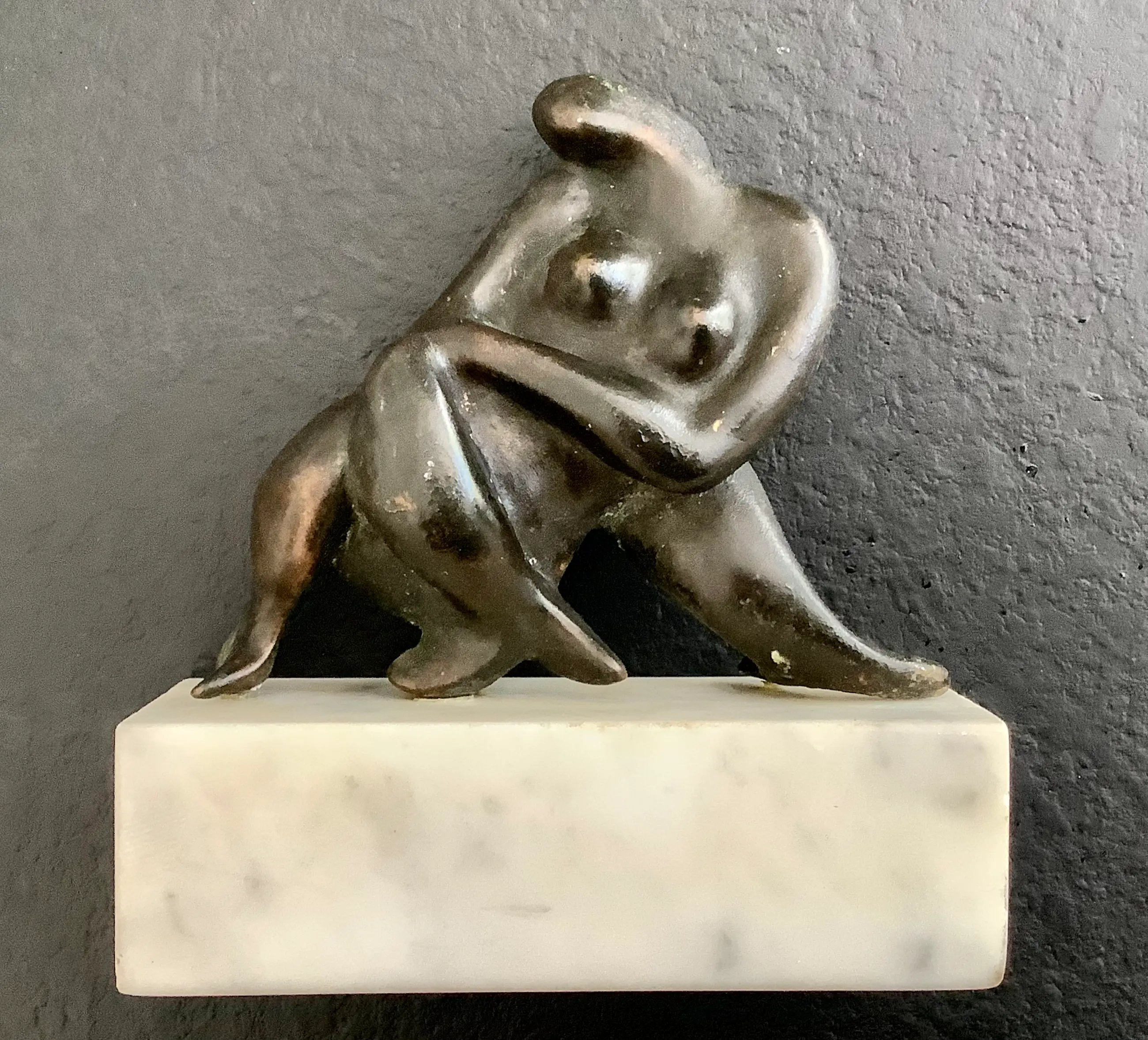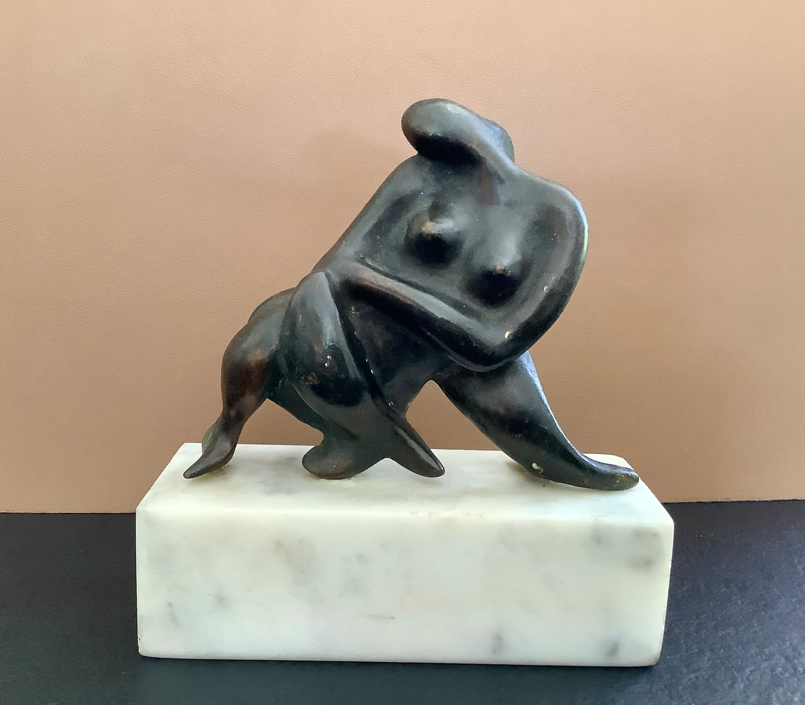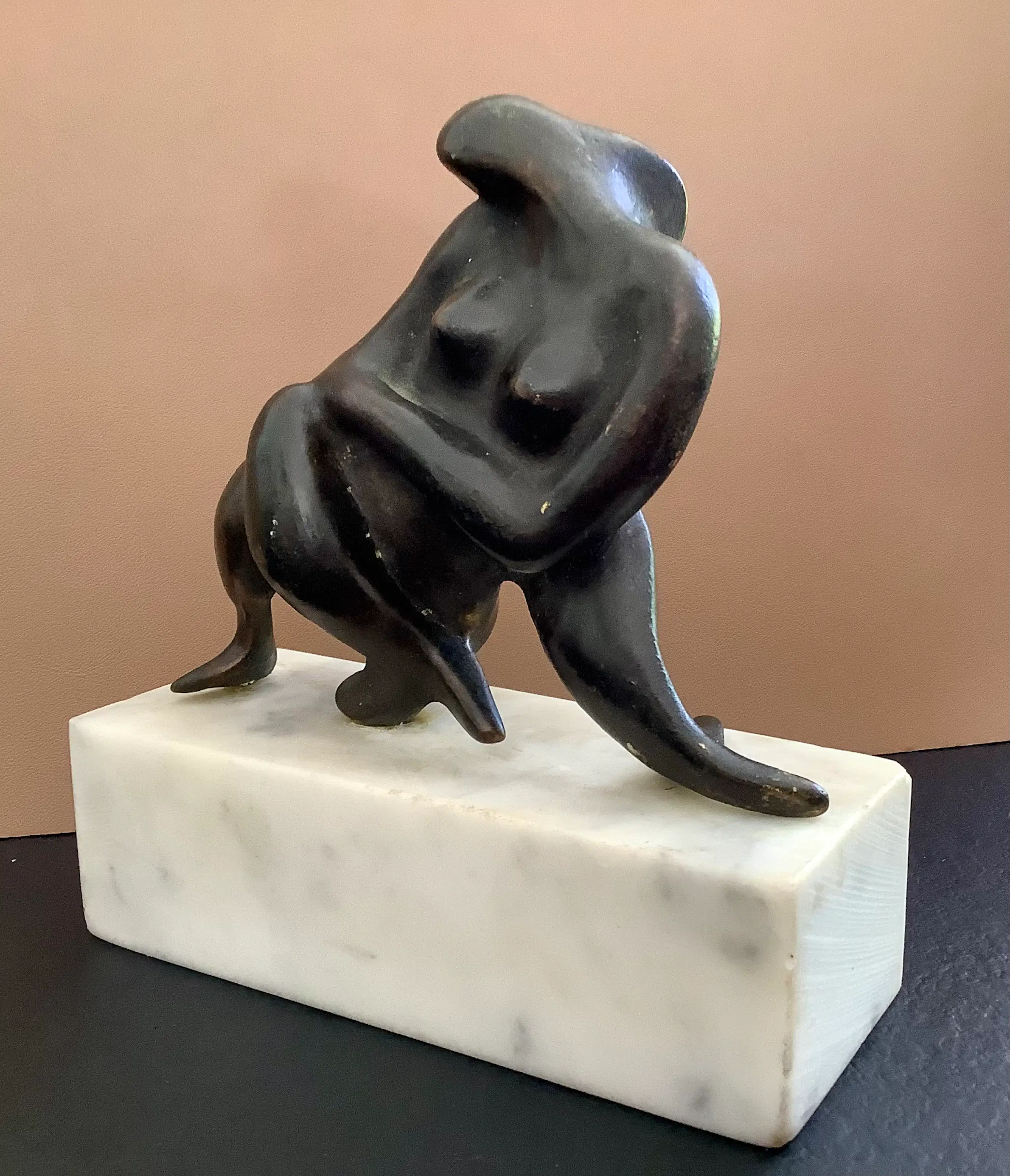 Fraaie elegante sculptuur in brons op wit marmeren sokkel.