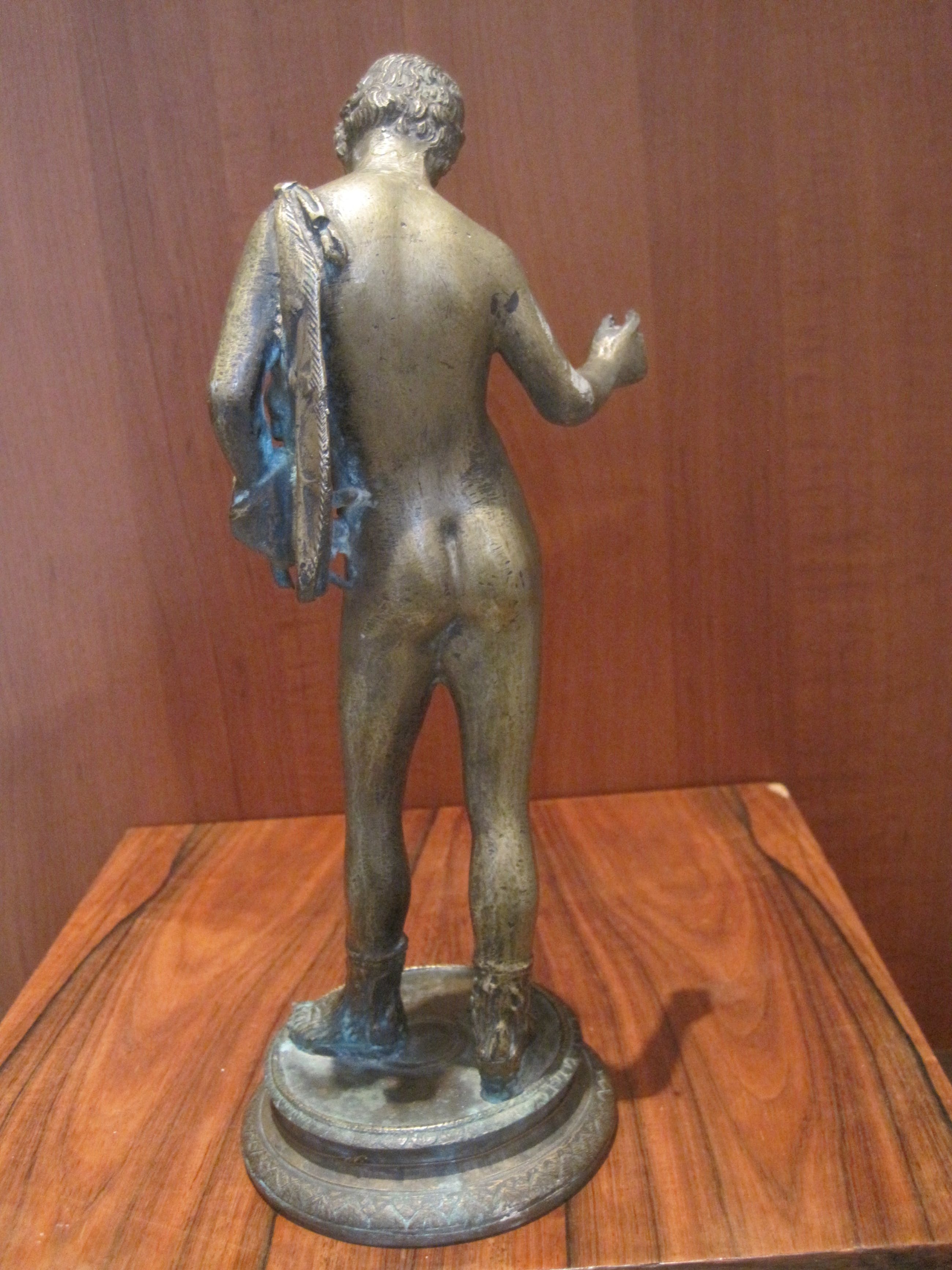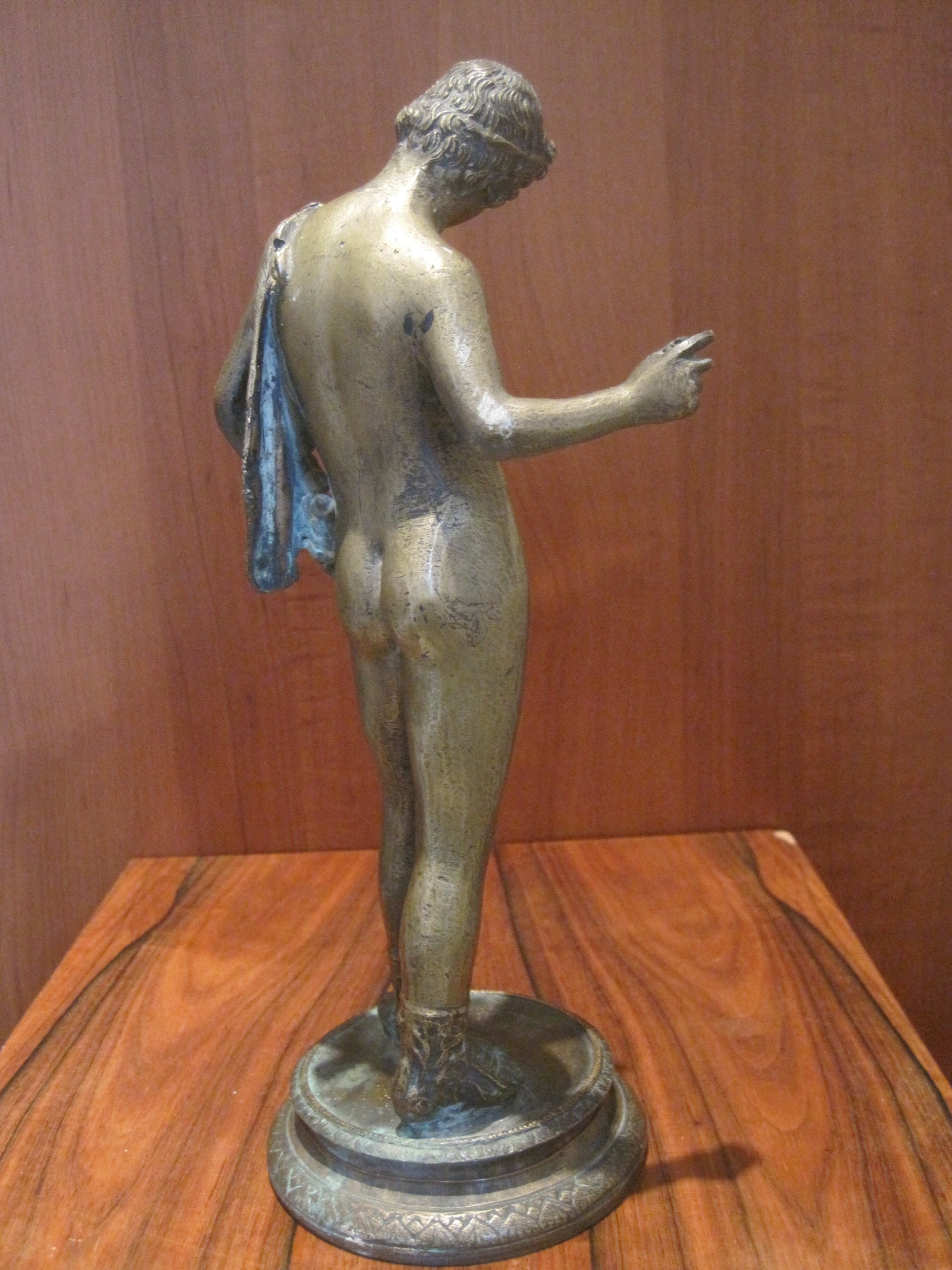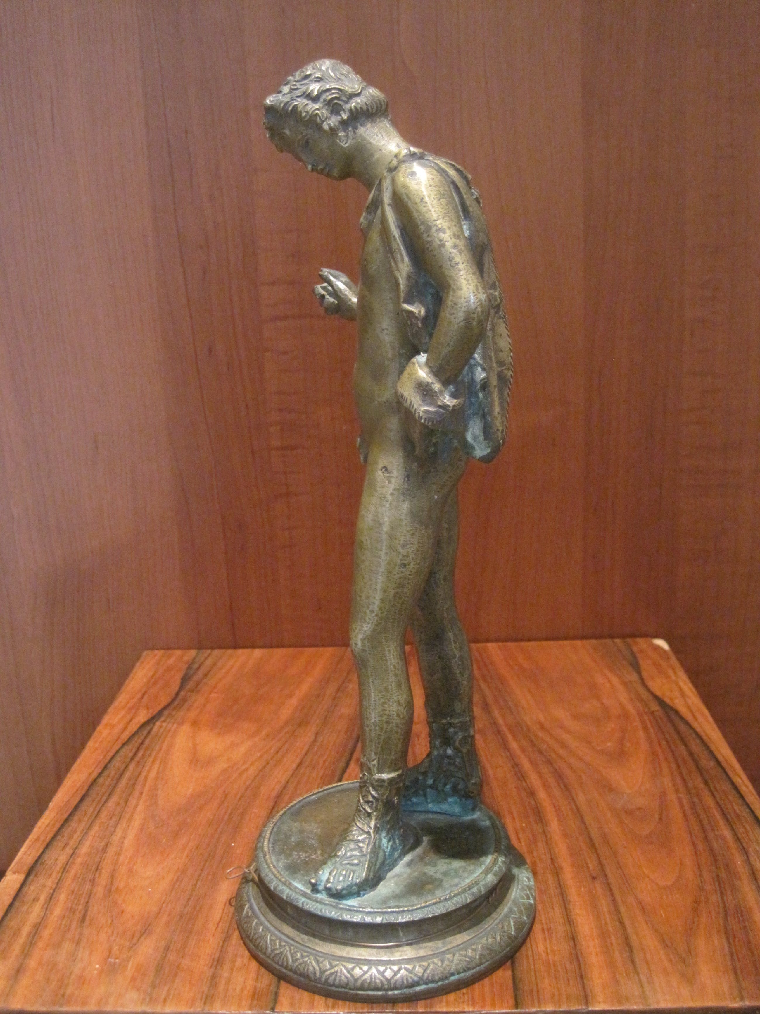 Een fraai bronzen beeld van Narcissus, een figuur uit de Griekse mythologie, die verliefd werd op zijn spiegelbeeld.