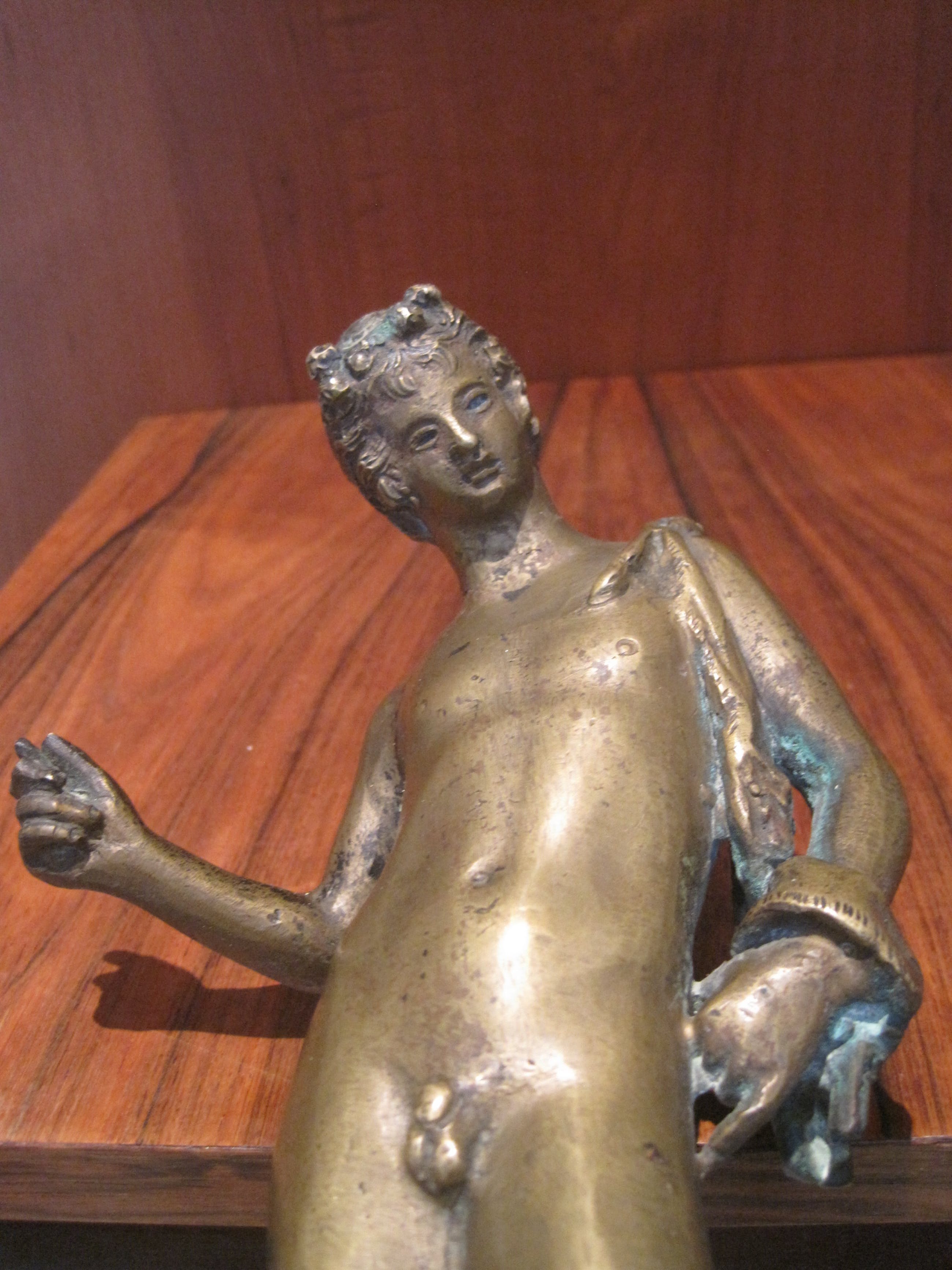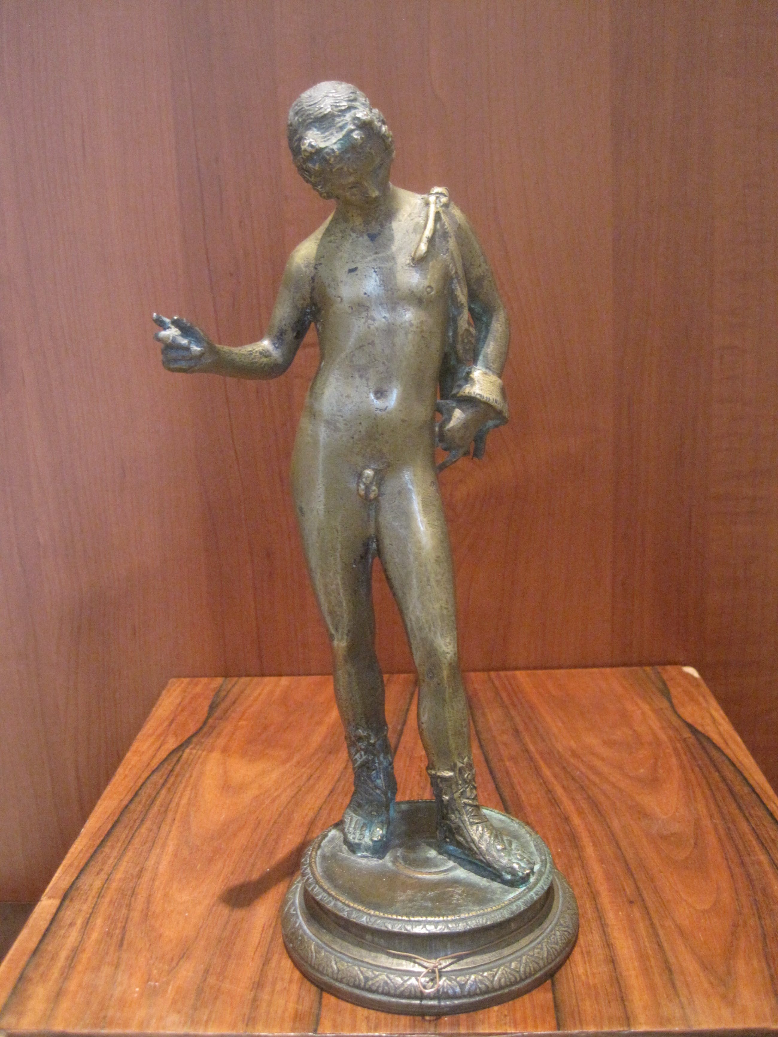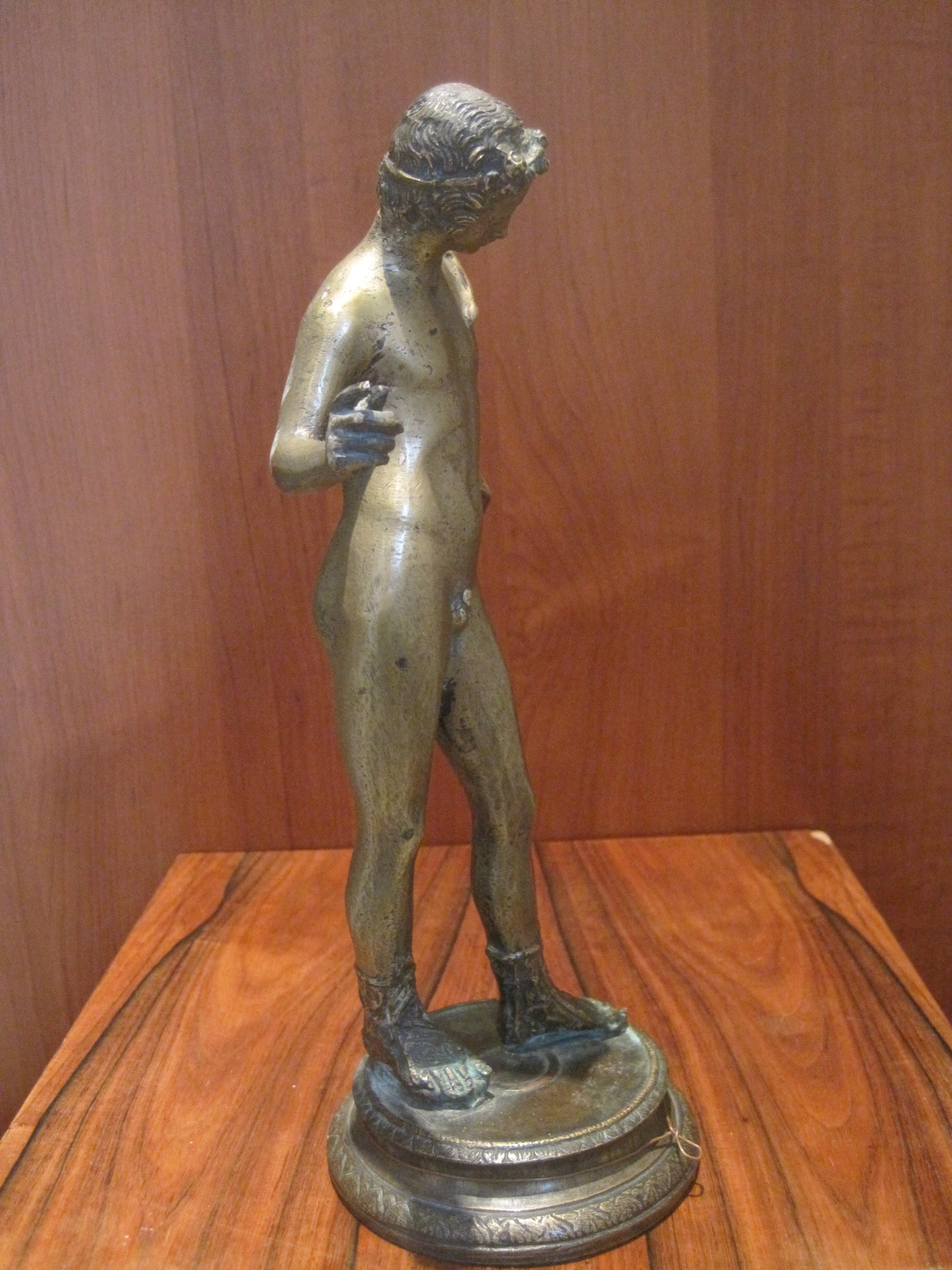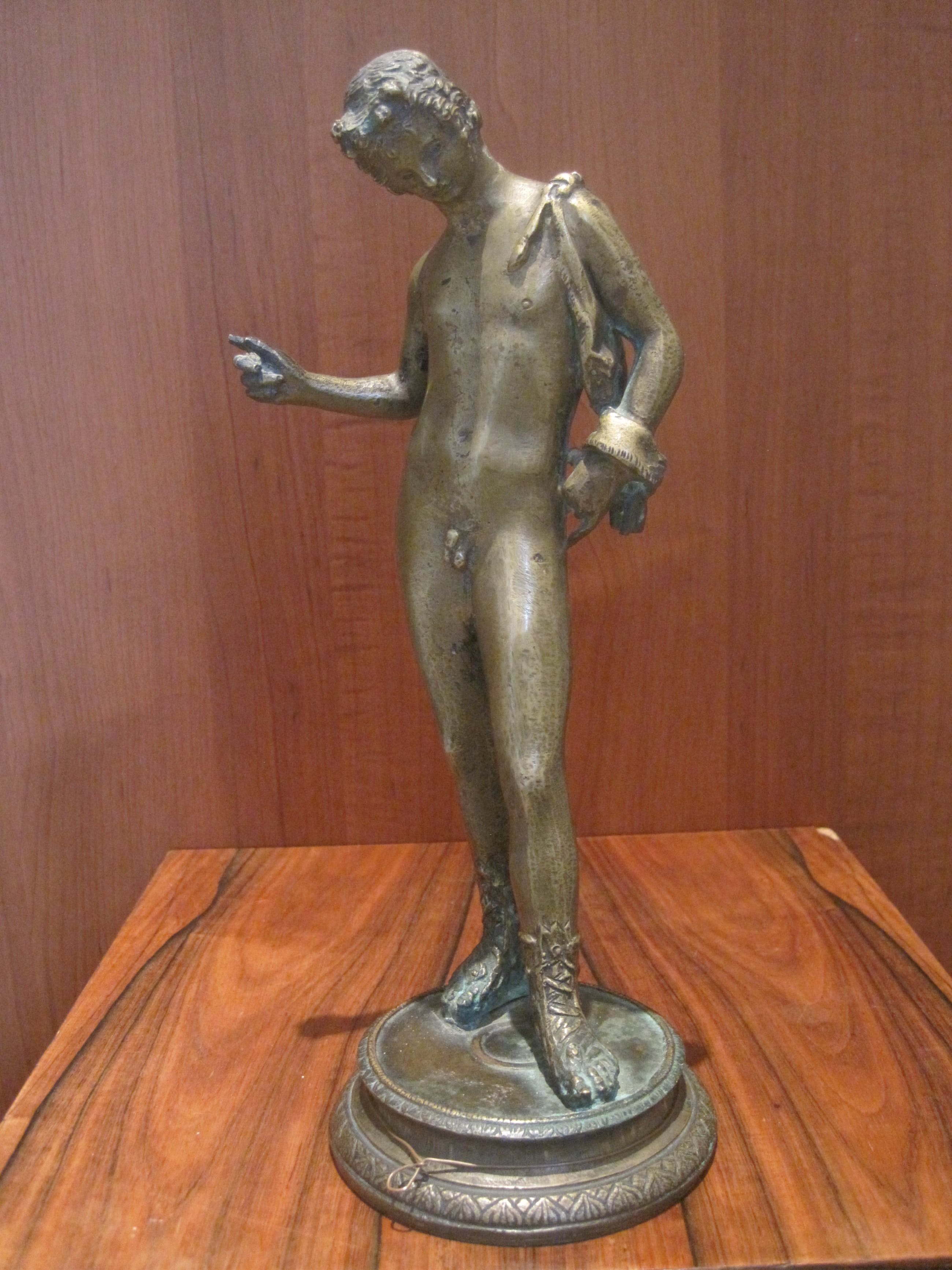 Een fraai bronzen beeld van Narcissus, een figuur uit de Griekse mythologie, die verliefd werd op zijn spiegelbeeld.