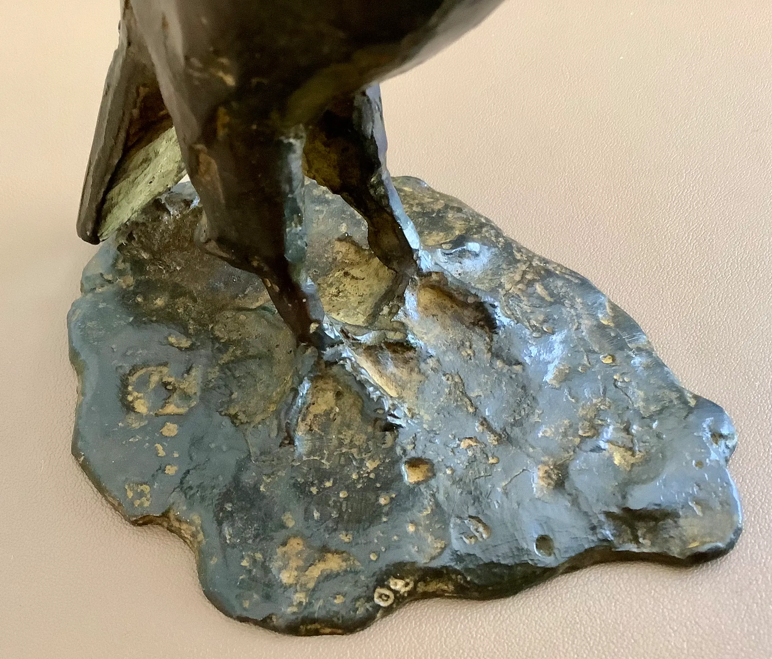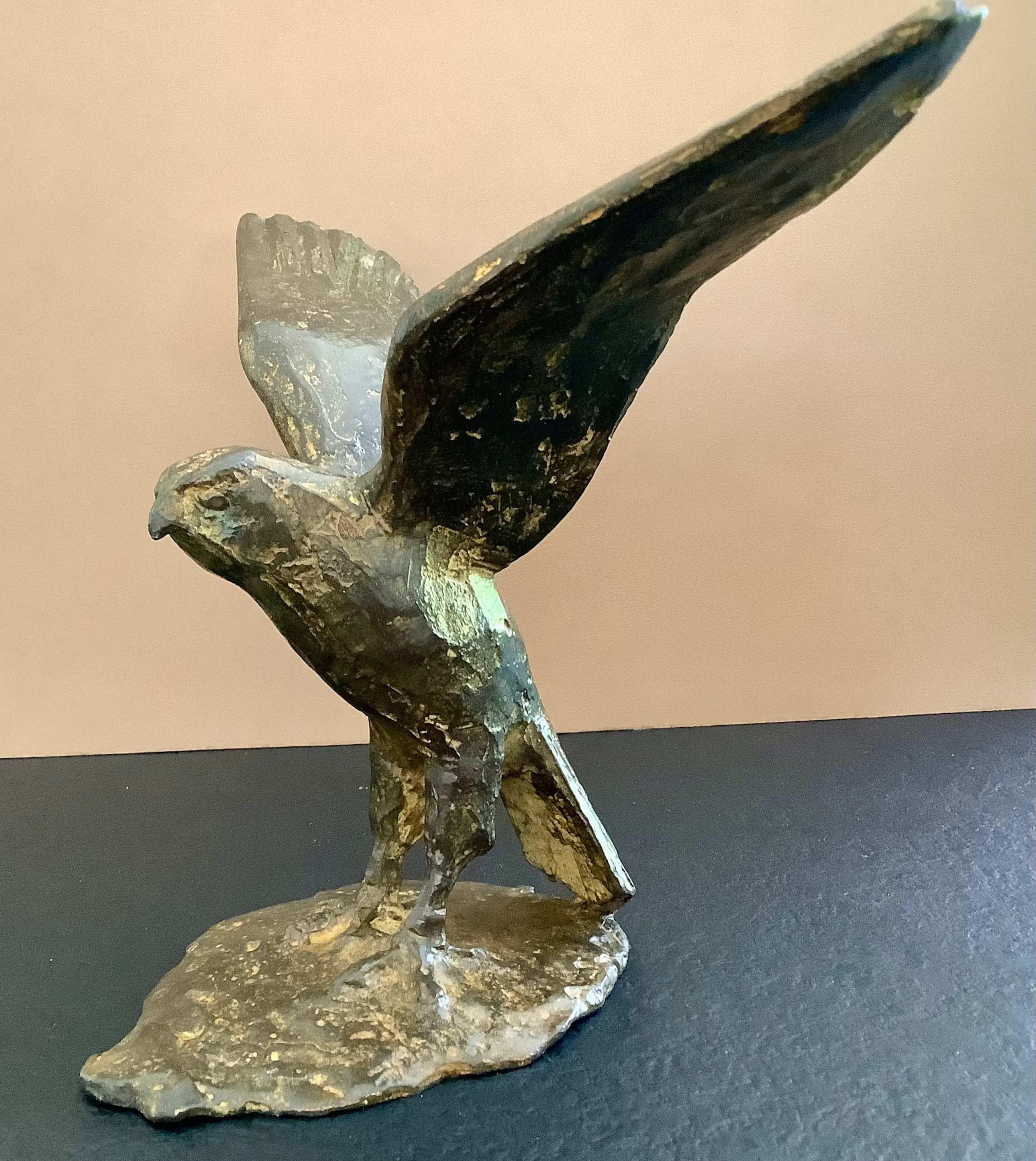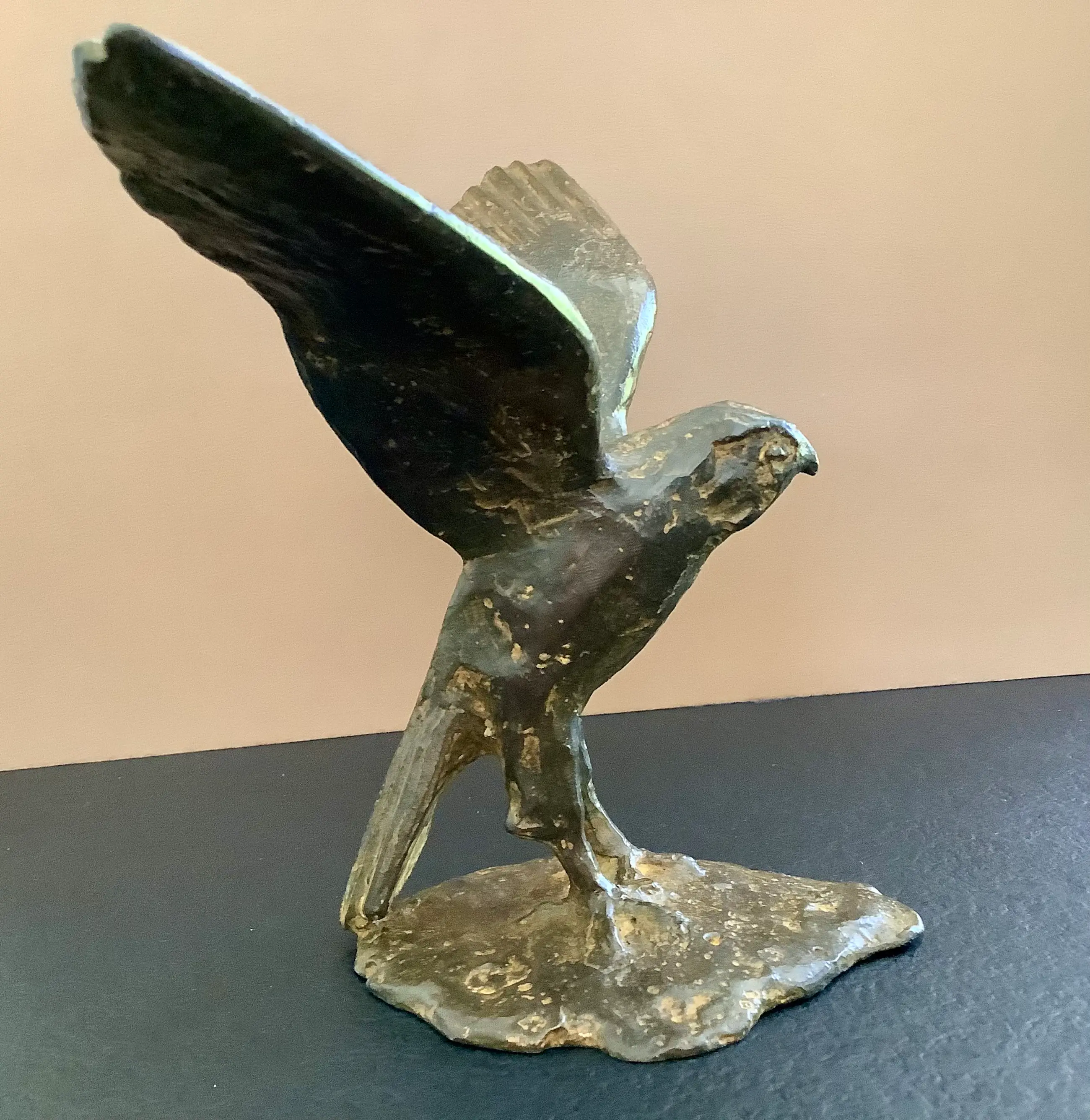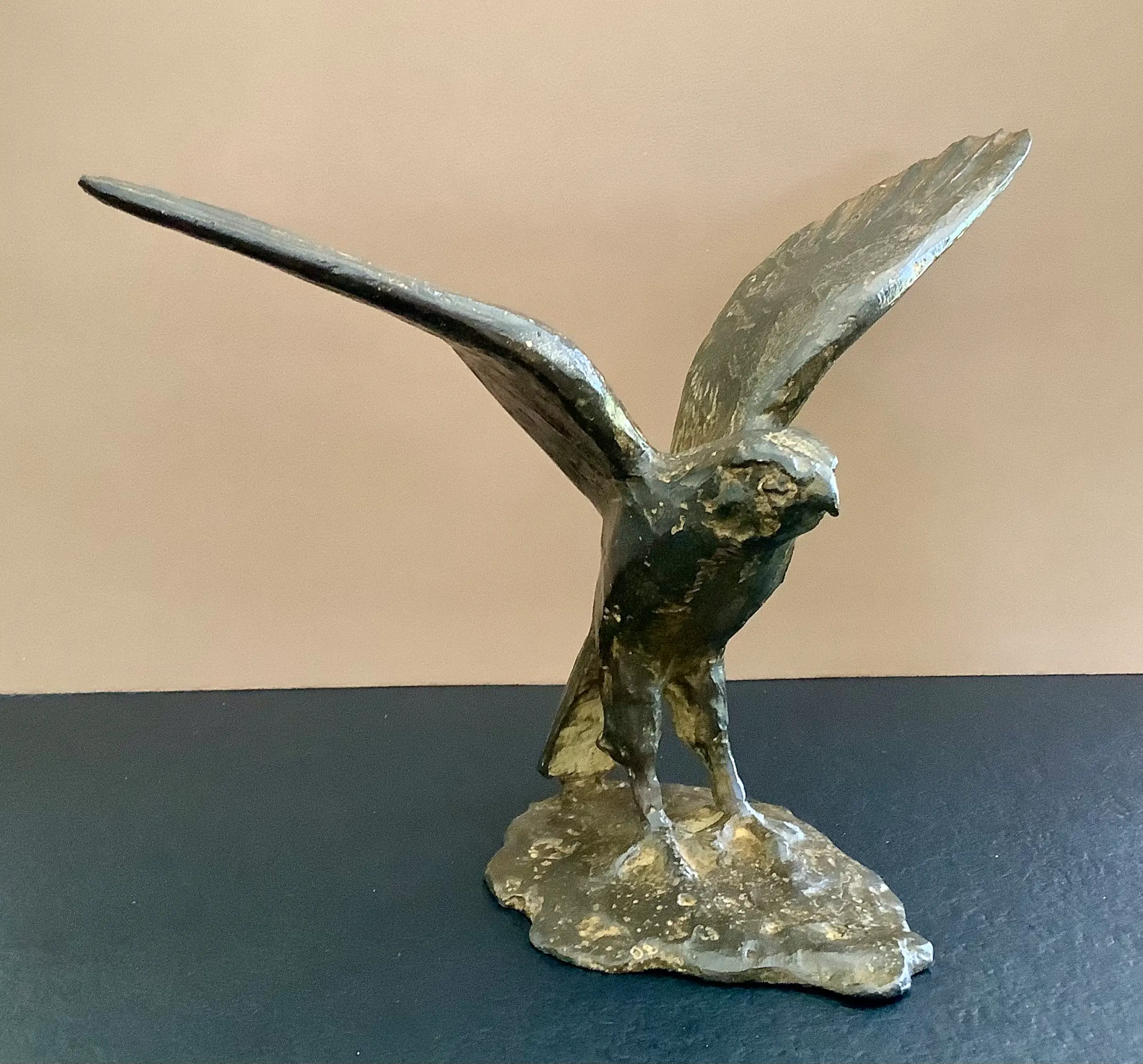 Goed gemodelleerde weergave in brons van een vogel met gespreide vleugels.