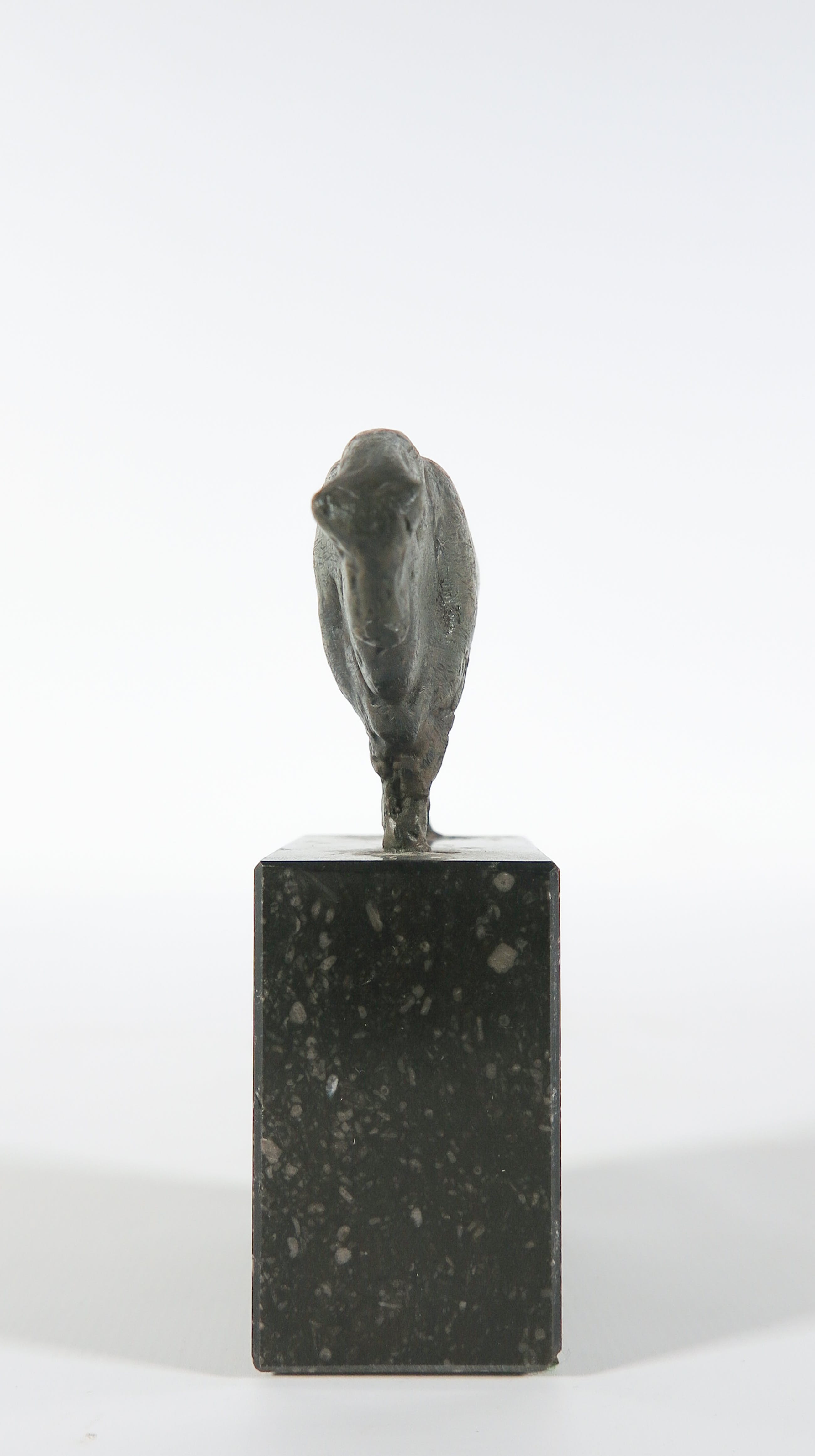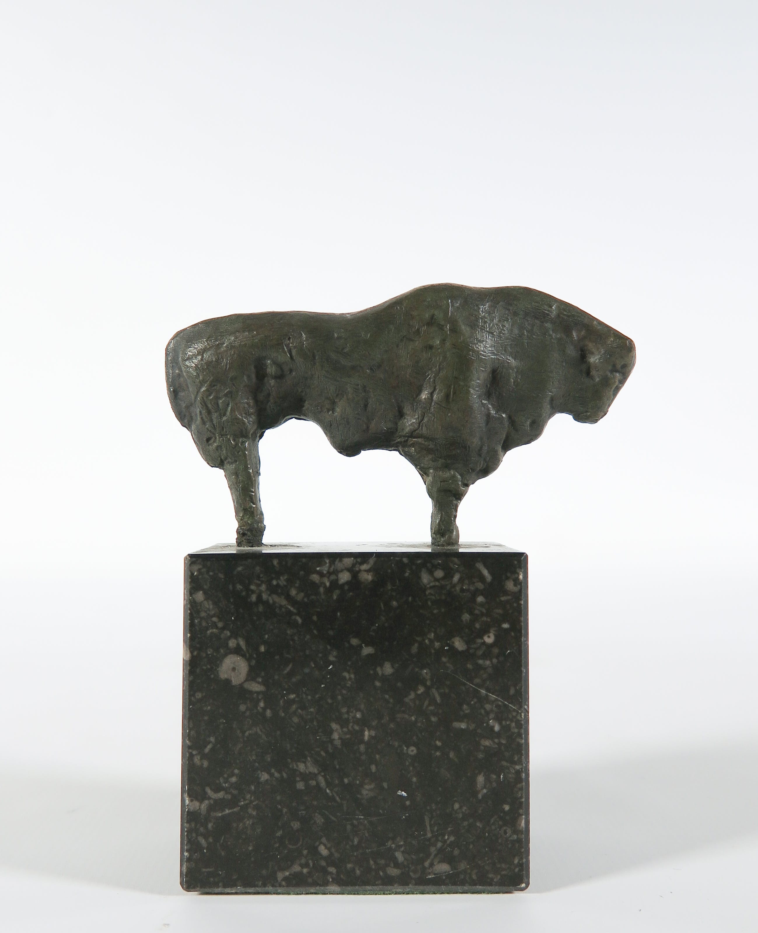 Ingetogen bronzen beeldje van een stier. Op granieten voet.