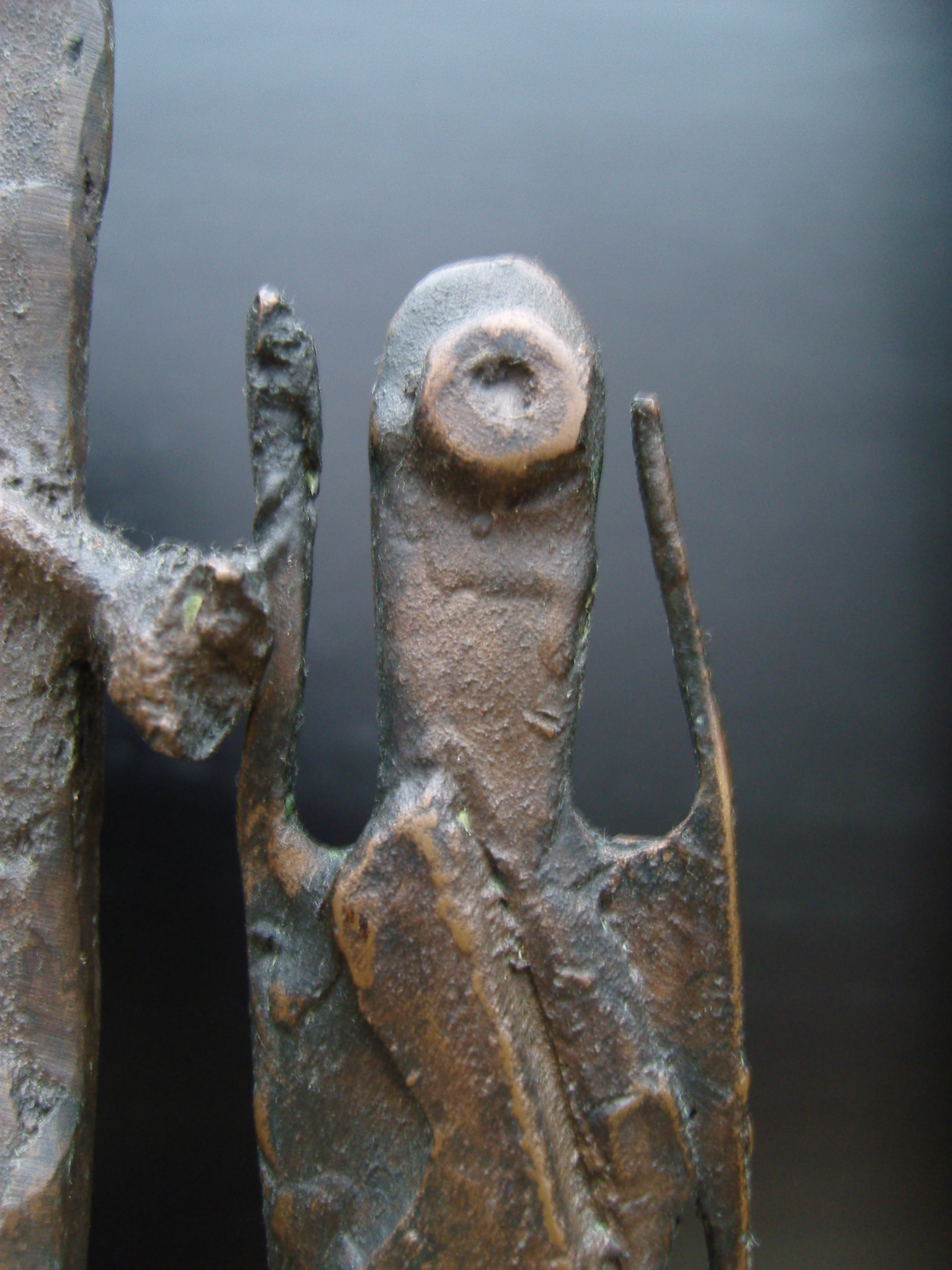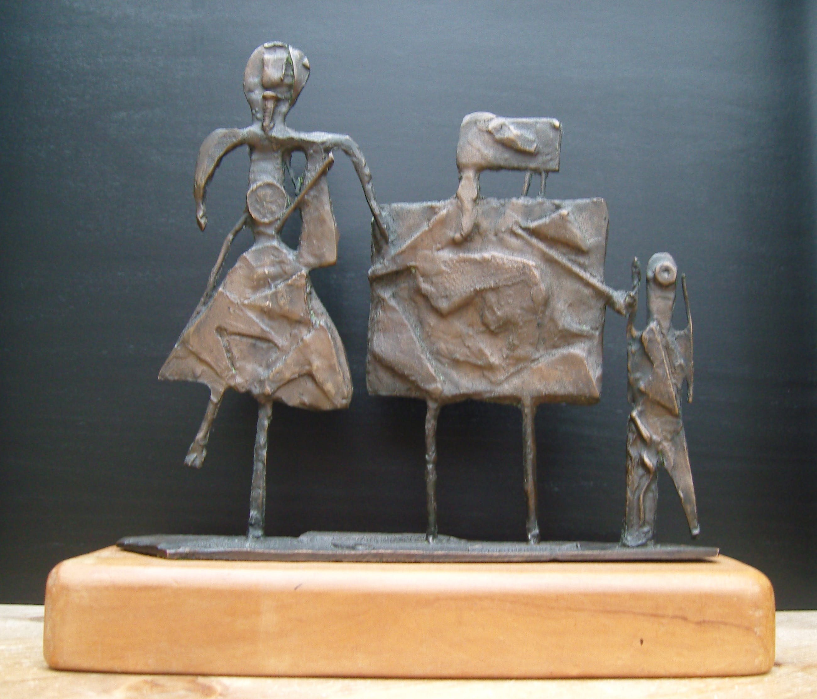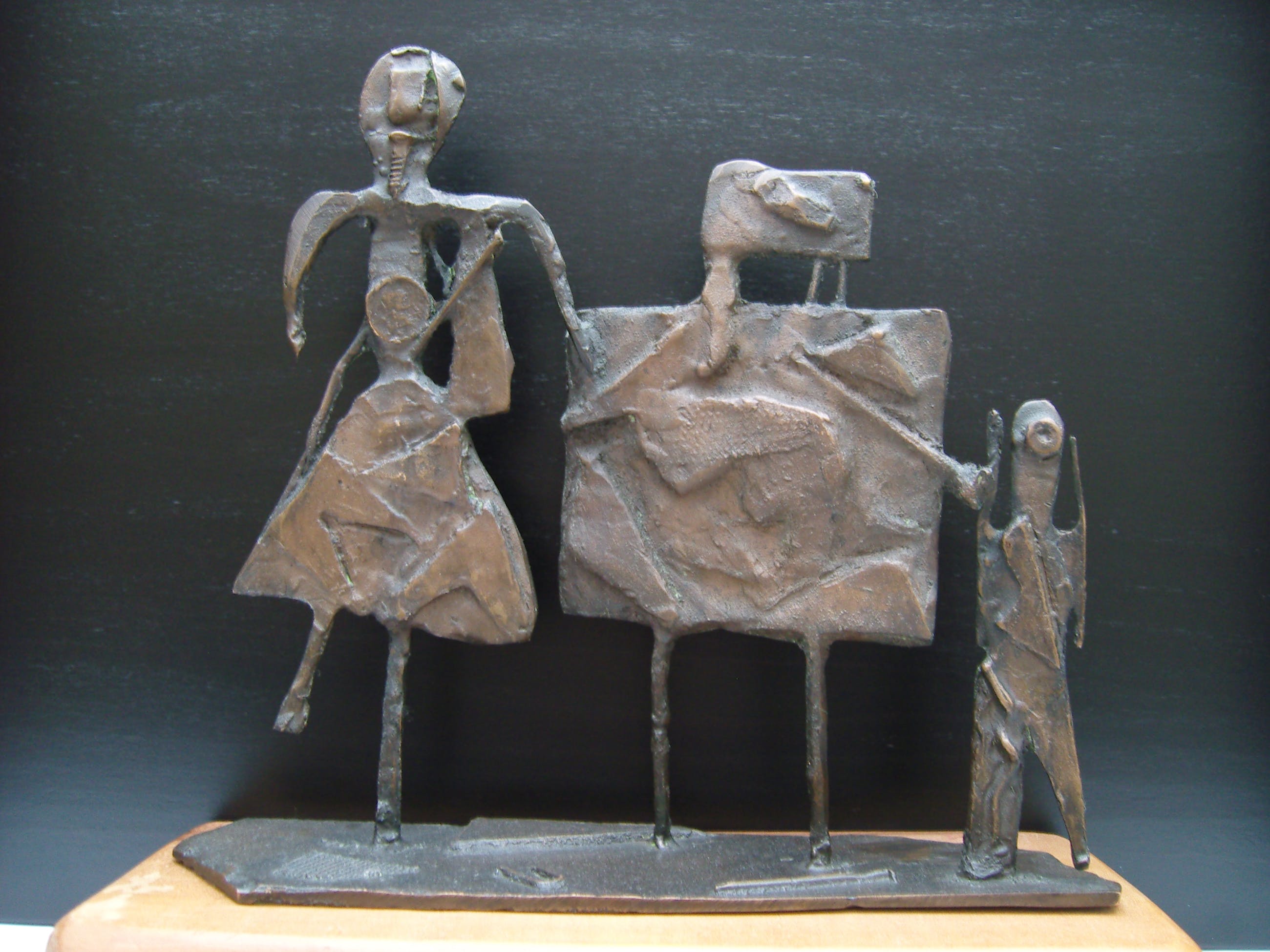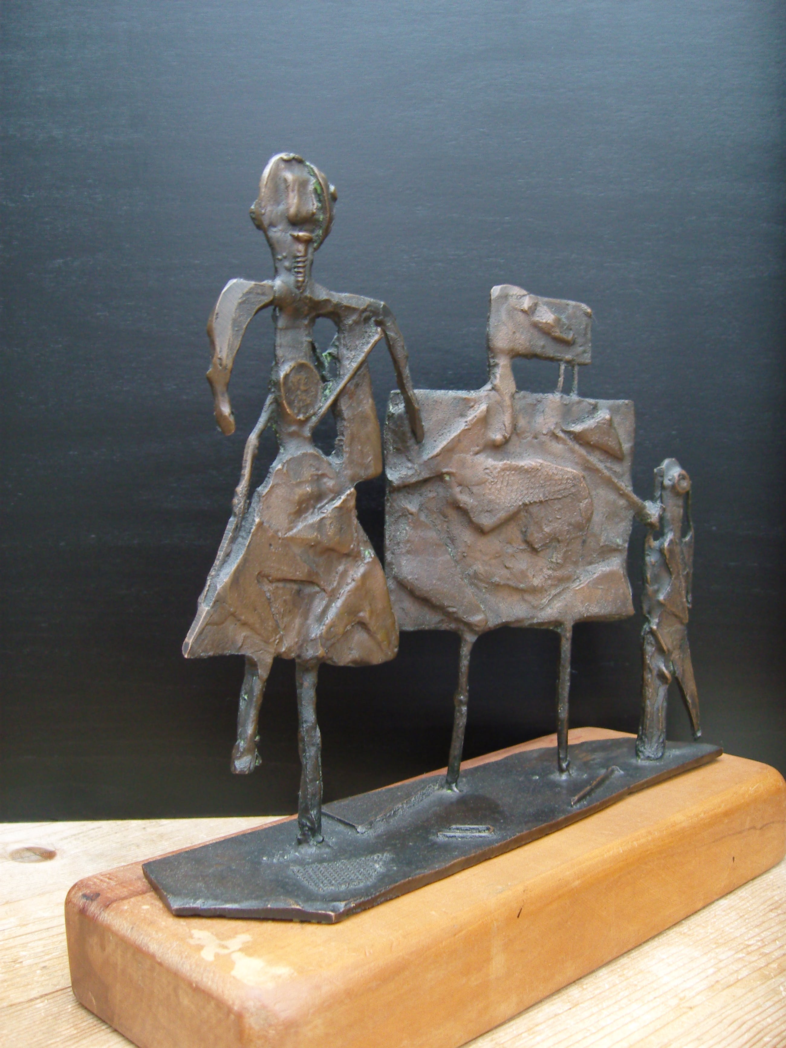 Zeer fraai en bijzonder beeldje "la famille", gemaakt omstreeks 1955 . Onderaan de houten sokkel zitten een tweetal stickers:1. Dienst voor 's Rijks verspreide kunstvoorwerpen 's Gravenhage. Hierop staat achter kunstenaar de naam "Tajiri" te lezen en de titel "la famille". 2. Hyugens museum Hofwijck, Voorburg en de classificatie "niet geplaatst". Een uitgebreid onderzoek met medewerking van de Rijksdienst voor het Cultureel Erfgoed heeft helaas niet mogen leiden tot het vinden van de kunstenaar. Dat het beeldje , zoals de sticker doet vermoeden, door Shinkichi Tajiri gemaakt is lijkt echter niet te kloppen. Voor de kunstliefhebber die nog wat verder onderzoek wil doen wellicht een buitenkansje.............want het is hoe men het ook wendt of keert een bijzonder beeld. De vermelde maten zijn inclusief de houten sokkel.
