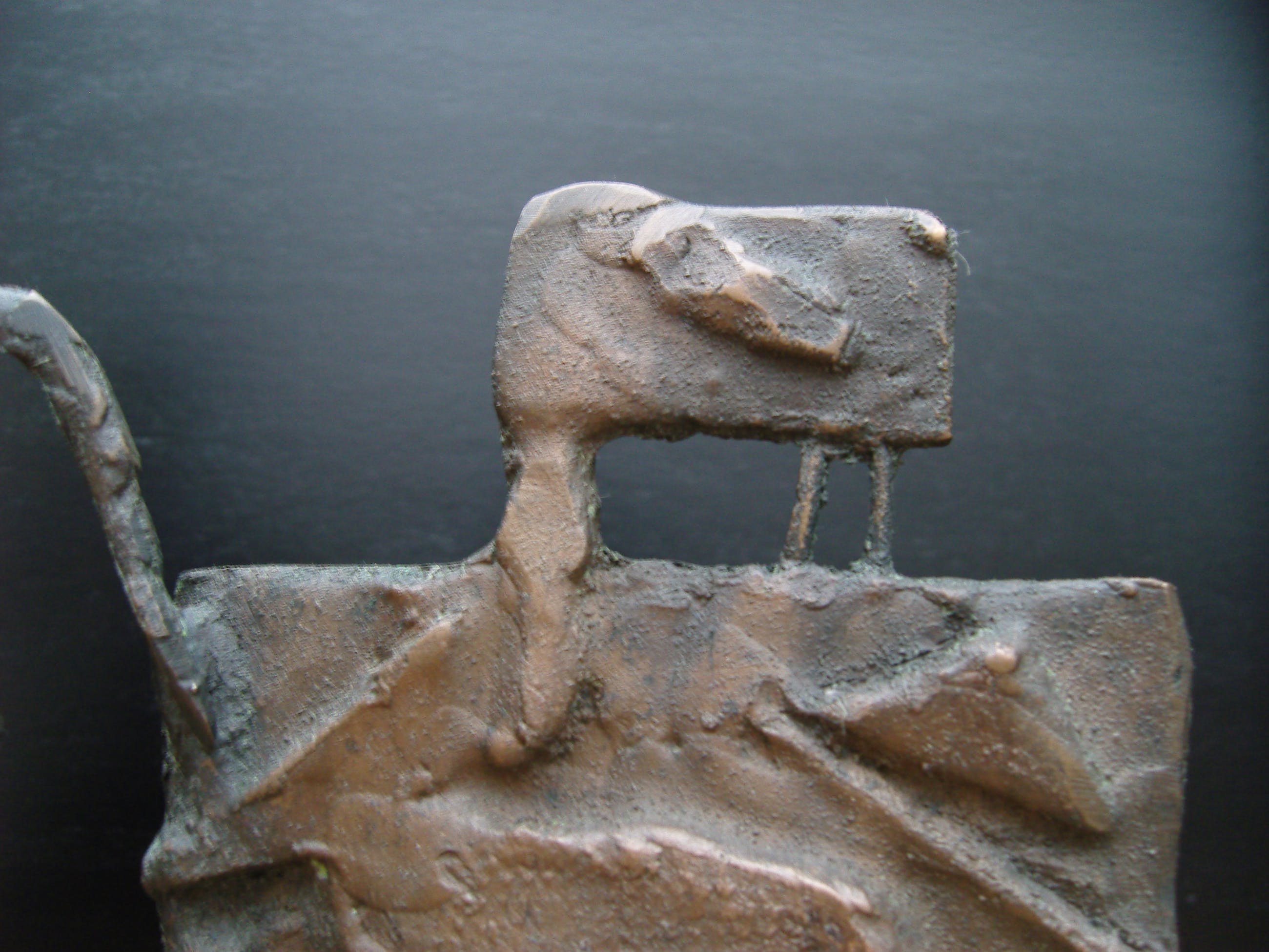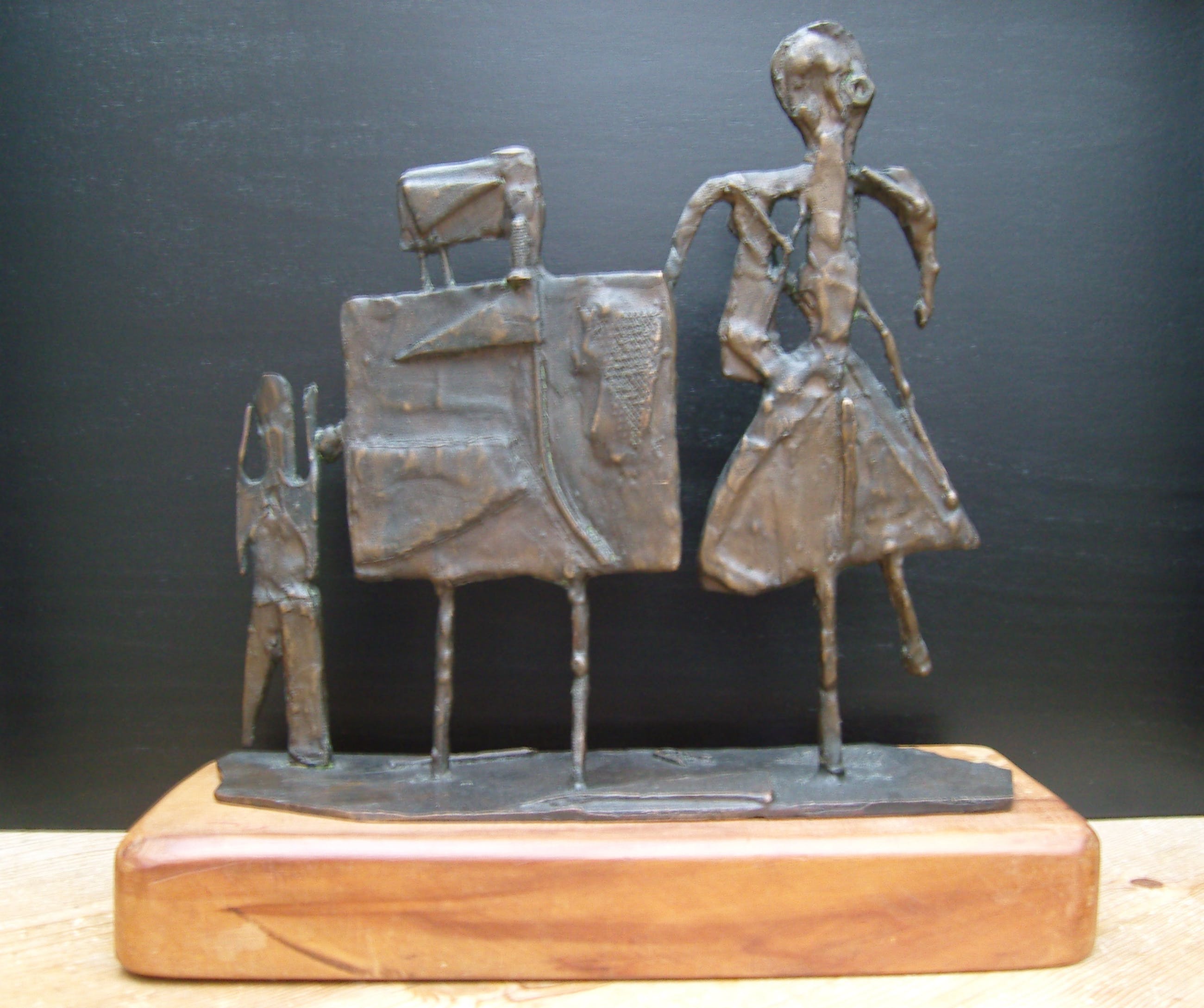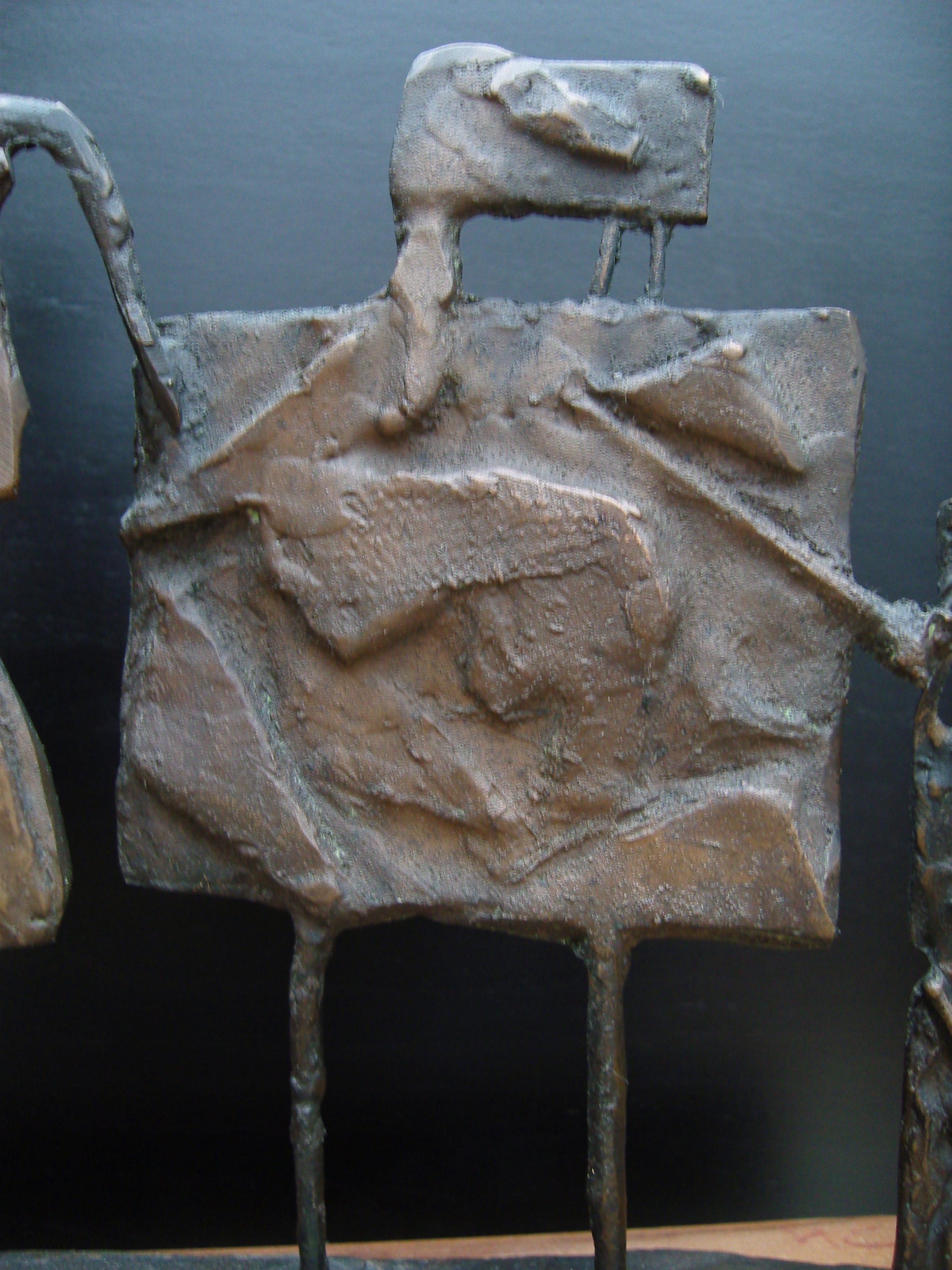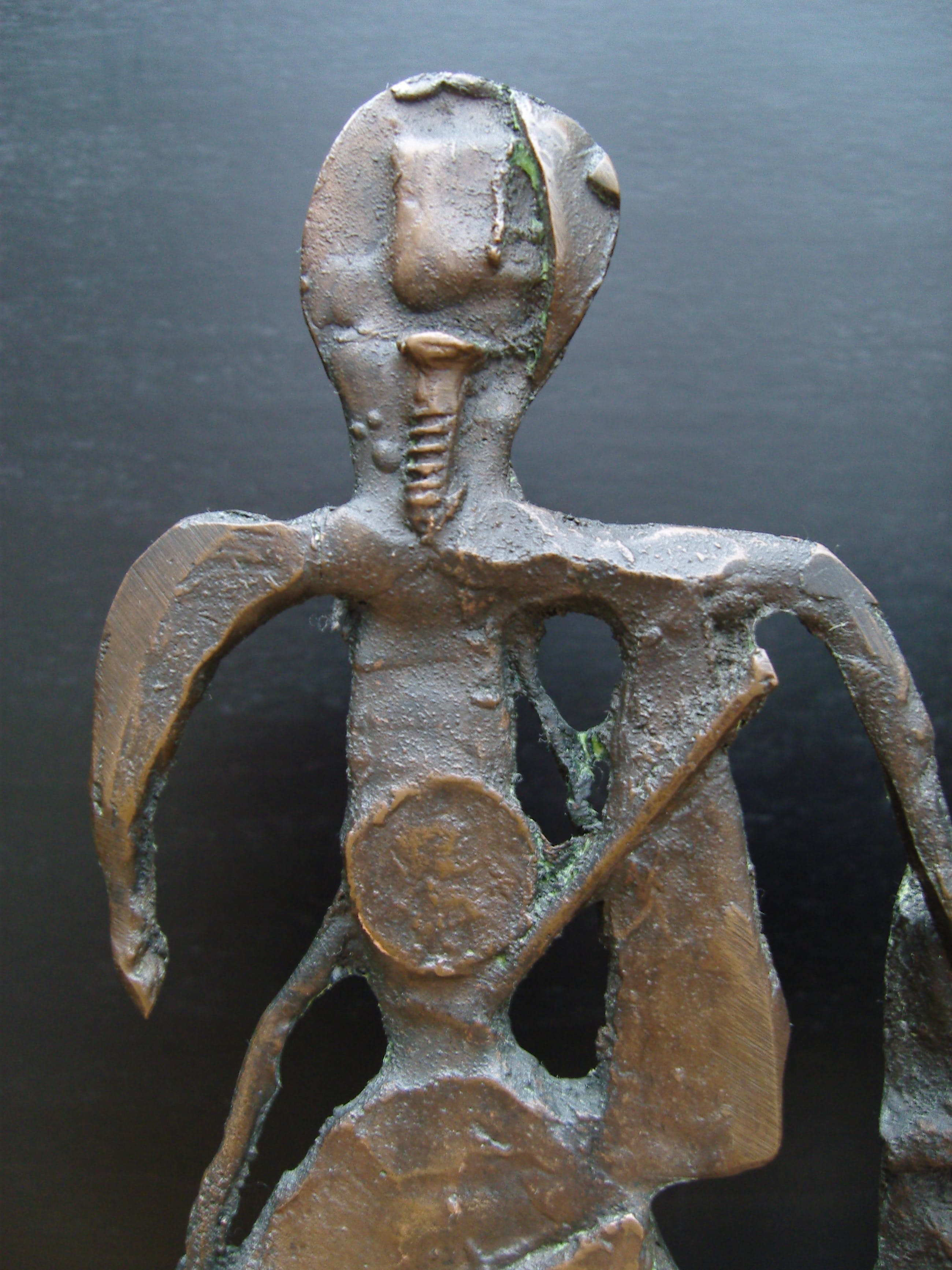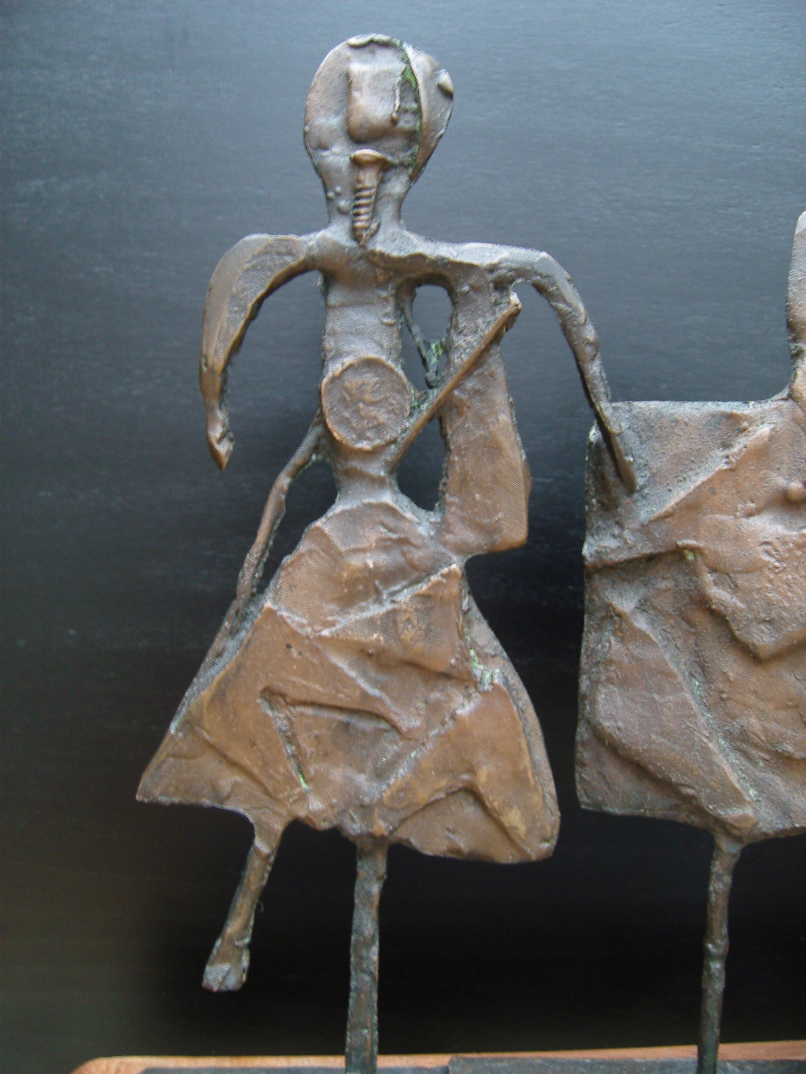 Zeer fraai en bijzonder beeldje "la famille", gemaakt omstreeks 1955 . Onderaan de houten sokkel zitten een tweetal stickers:1. Dienst voor 's Rijks verspreide kunstvoorwerpen 's Gravenhage. Hierop staat achter kunstenaar de naam "Tajiri" te lezen en de titel "la famille". 2. Hyugens museum Hofwijck, Voorburg en de classificatie "niet geplaatst". Een uitgebreid onderzoek met medewerking van de Rijksdienst voor het Cultureel Erfgoed heeft helaas niet mogen leiden tot het vinden van de kunstenaar. Dat het beeldje , zoals de sticker doet vermoeden, door Shinkichi Tajiri gemaakt is lijkt echter niet te kloppen. Voor de kunstliefhebber die nog wat verder onderzoek wil doen wellicht een buitenkansje.............want het is hoe men het ook wendt of keert een bijzonder beeld. De vermelde maten zijn inclusief de houten sokkel.