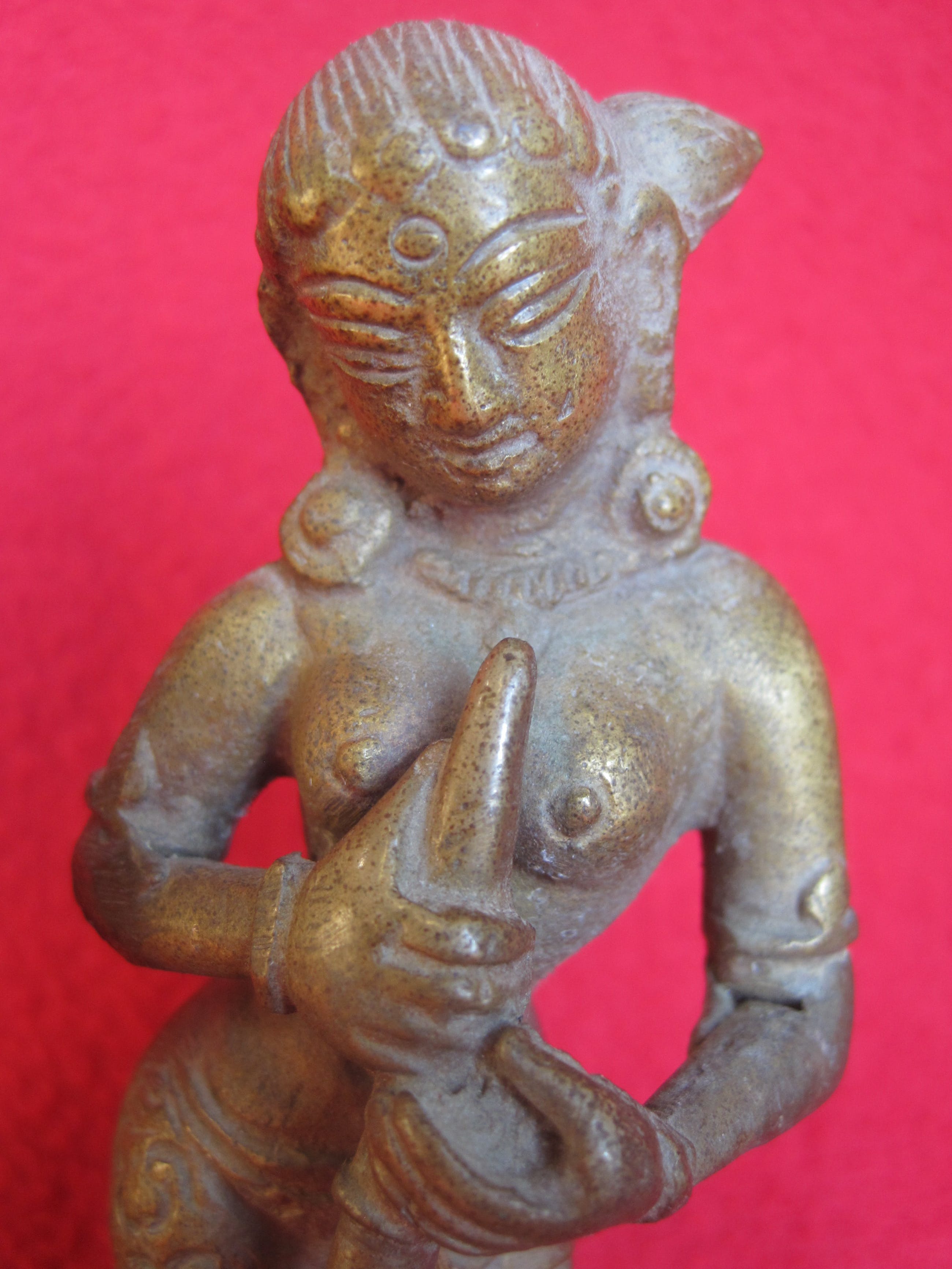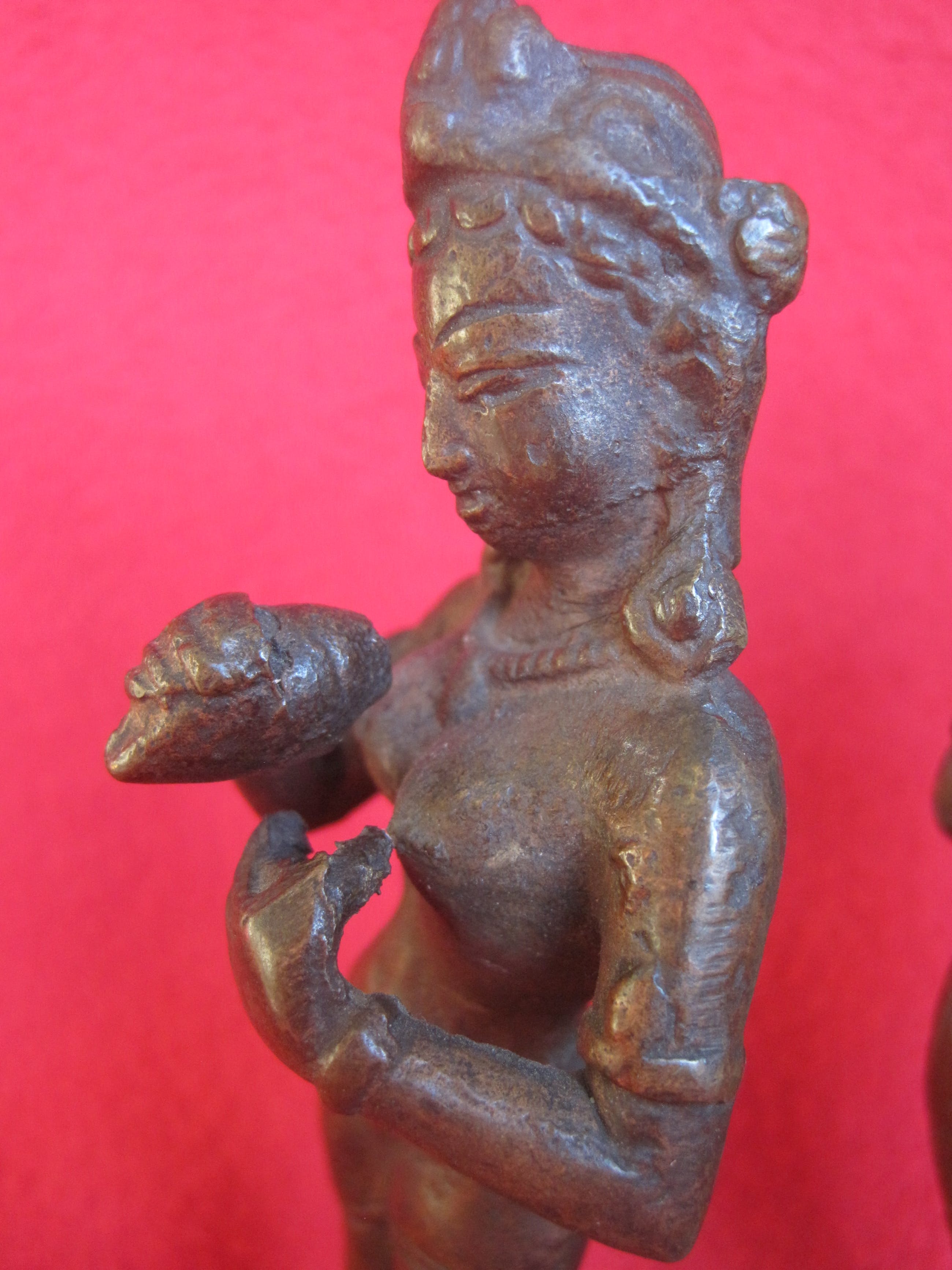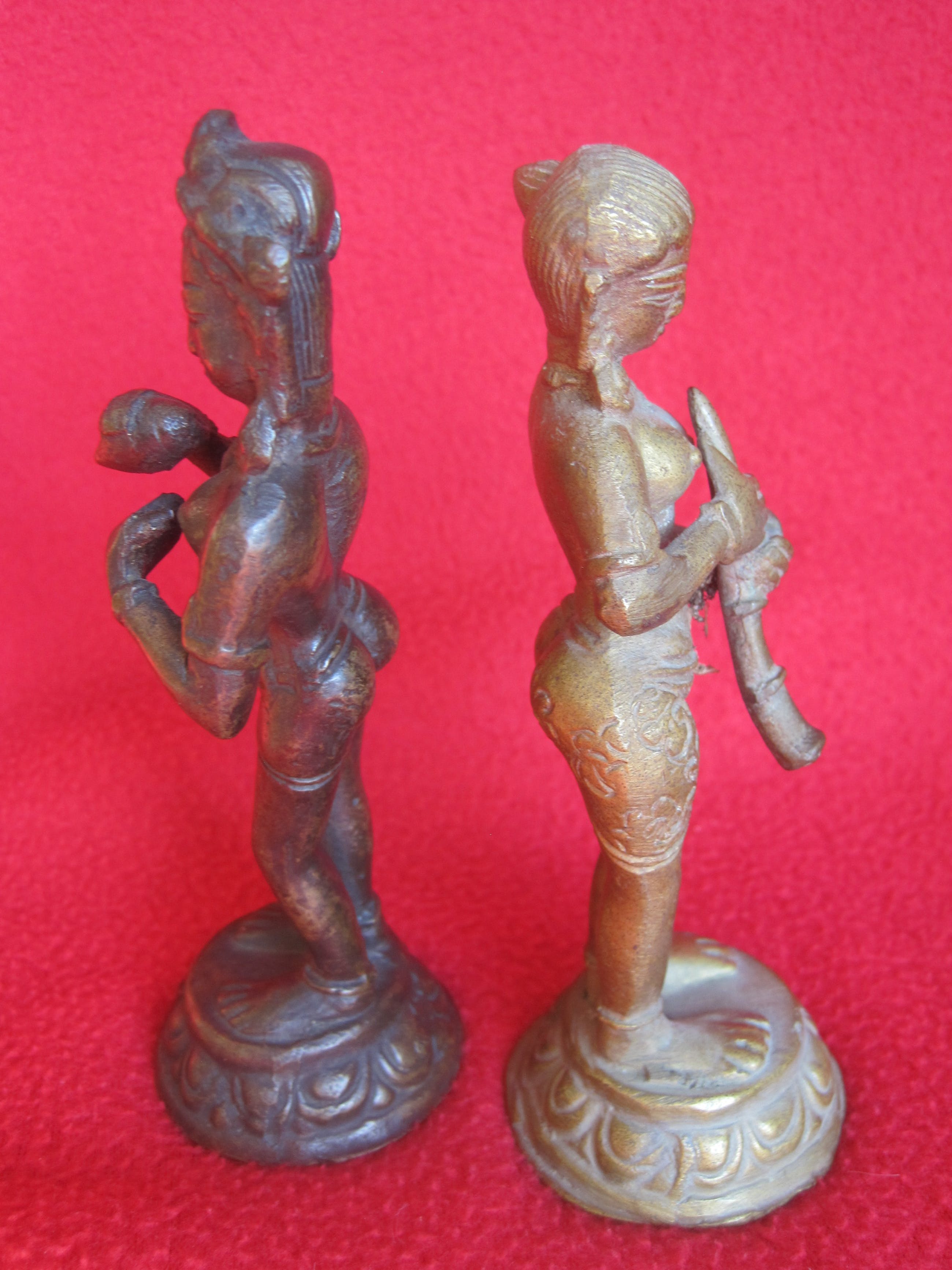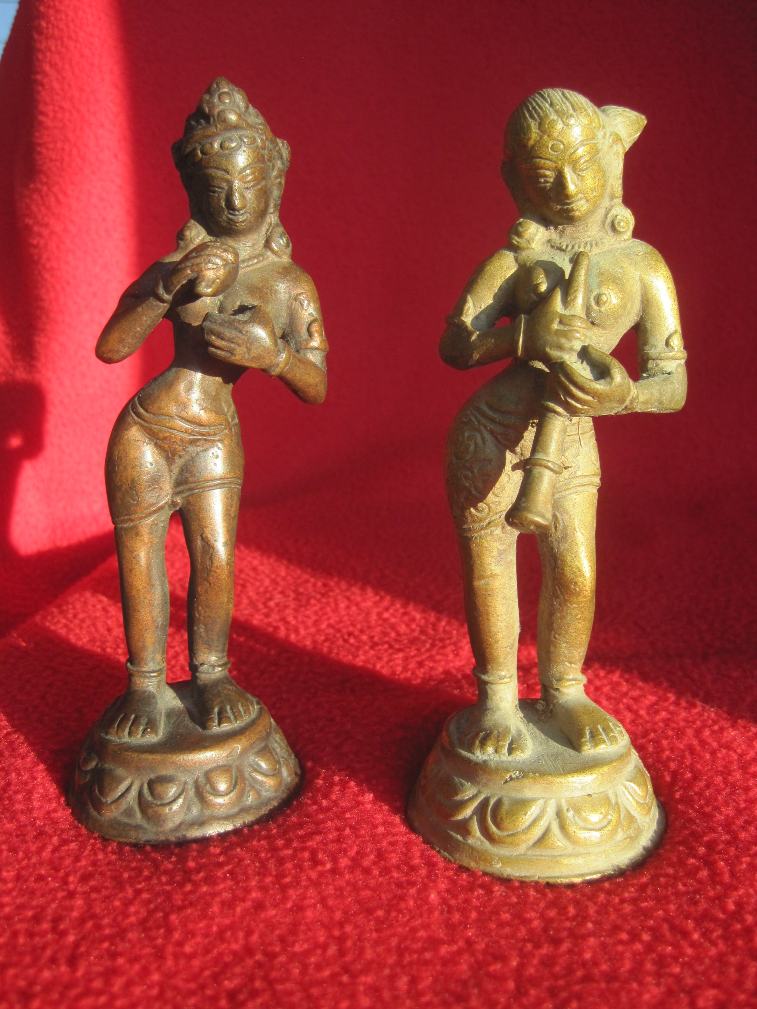 Twee Hindoeïstische bronzen beeldjes van de godinnen Lakshmi en Radha.