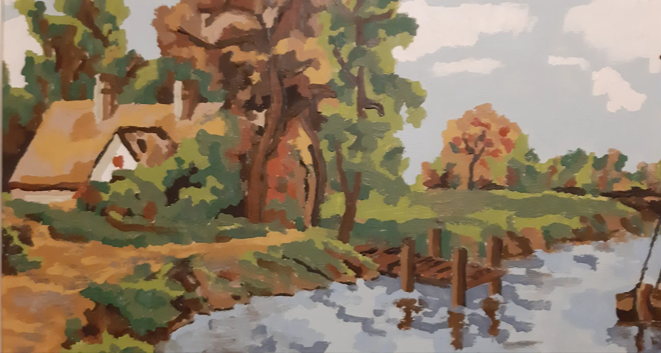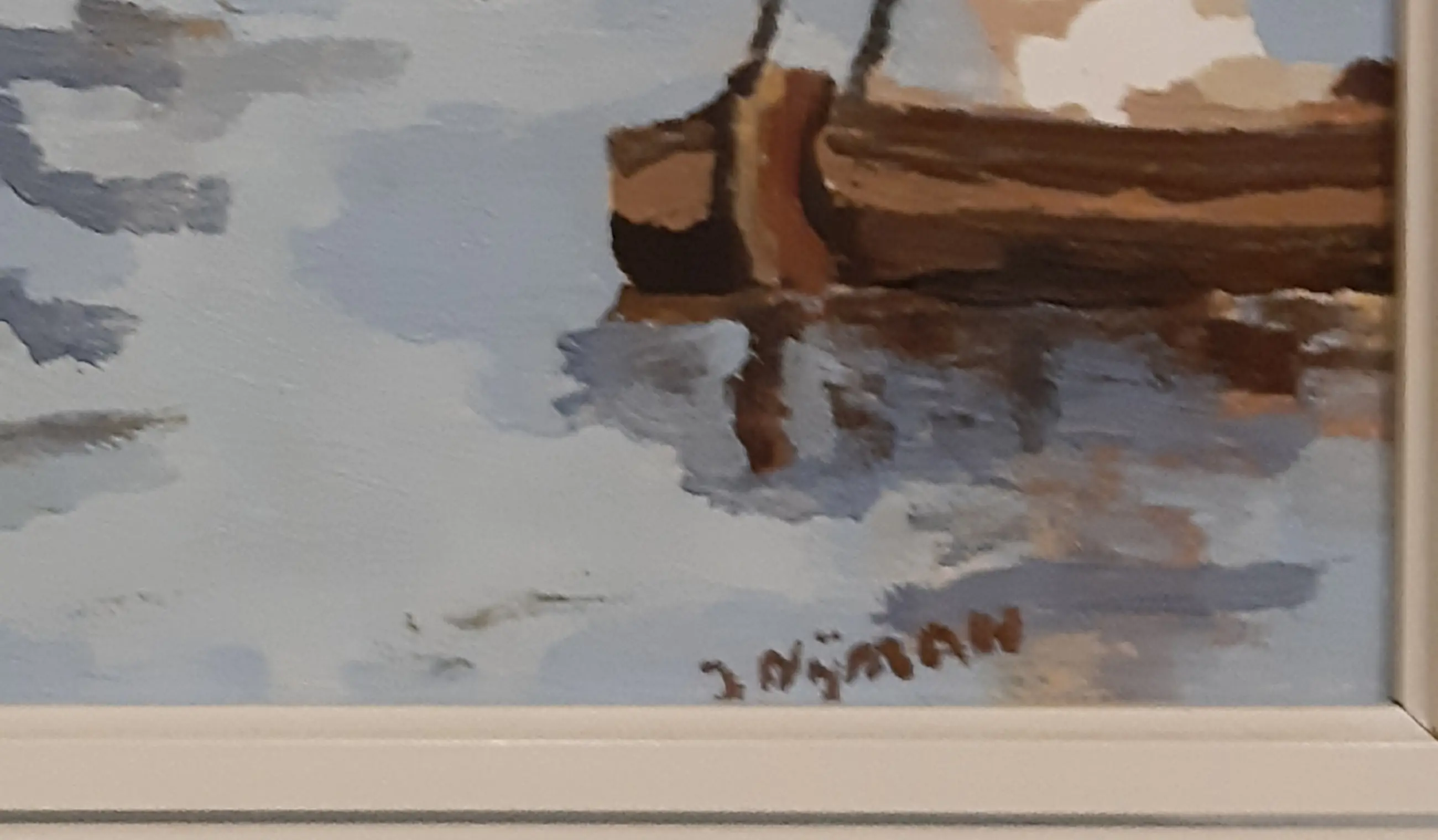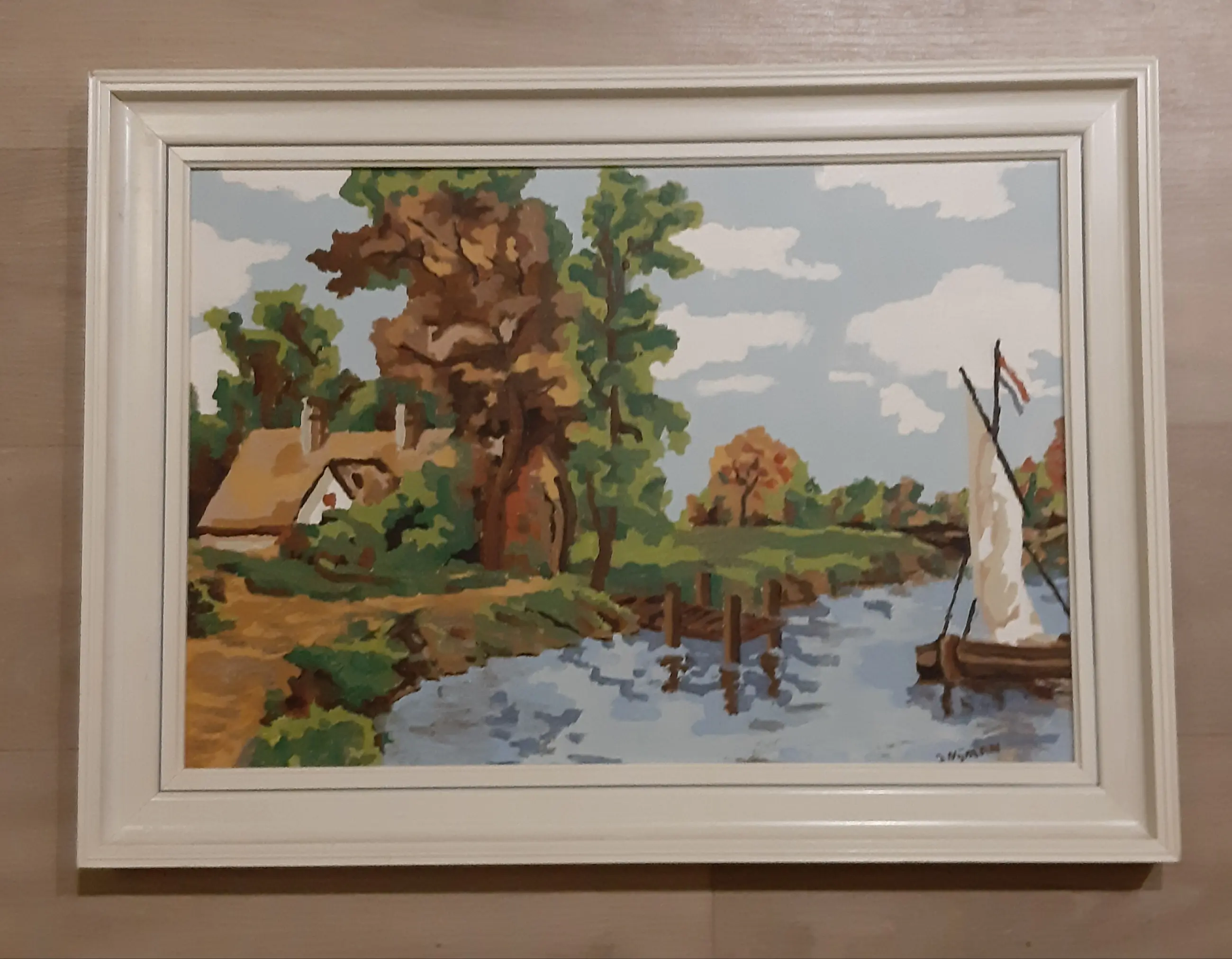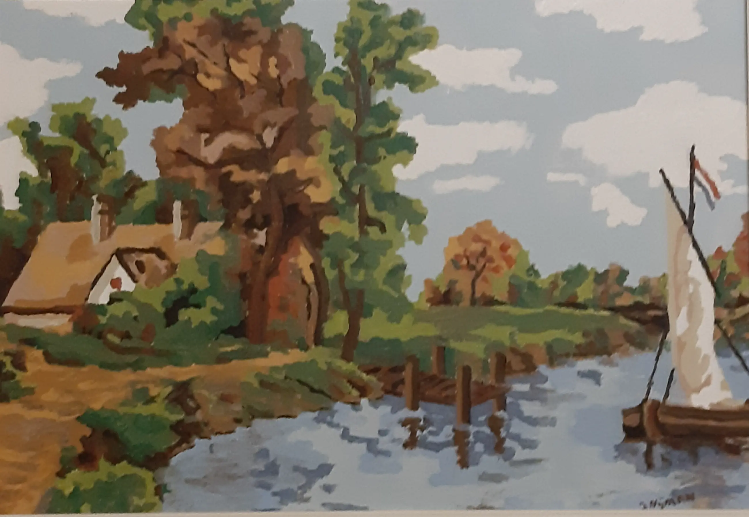 U kijkt hier naar een kleurijk werk van deze schilder in een mooie klassieke lijst Het werk is opgezet met een rake toets Boerderij en een bootje in een Hollandse polder Geschilderd door J Nijman in mooie kleuren