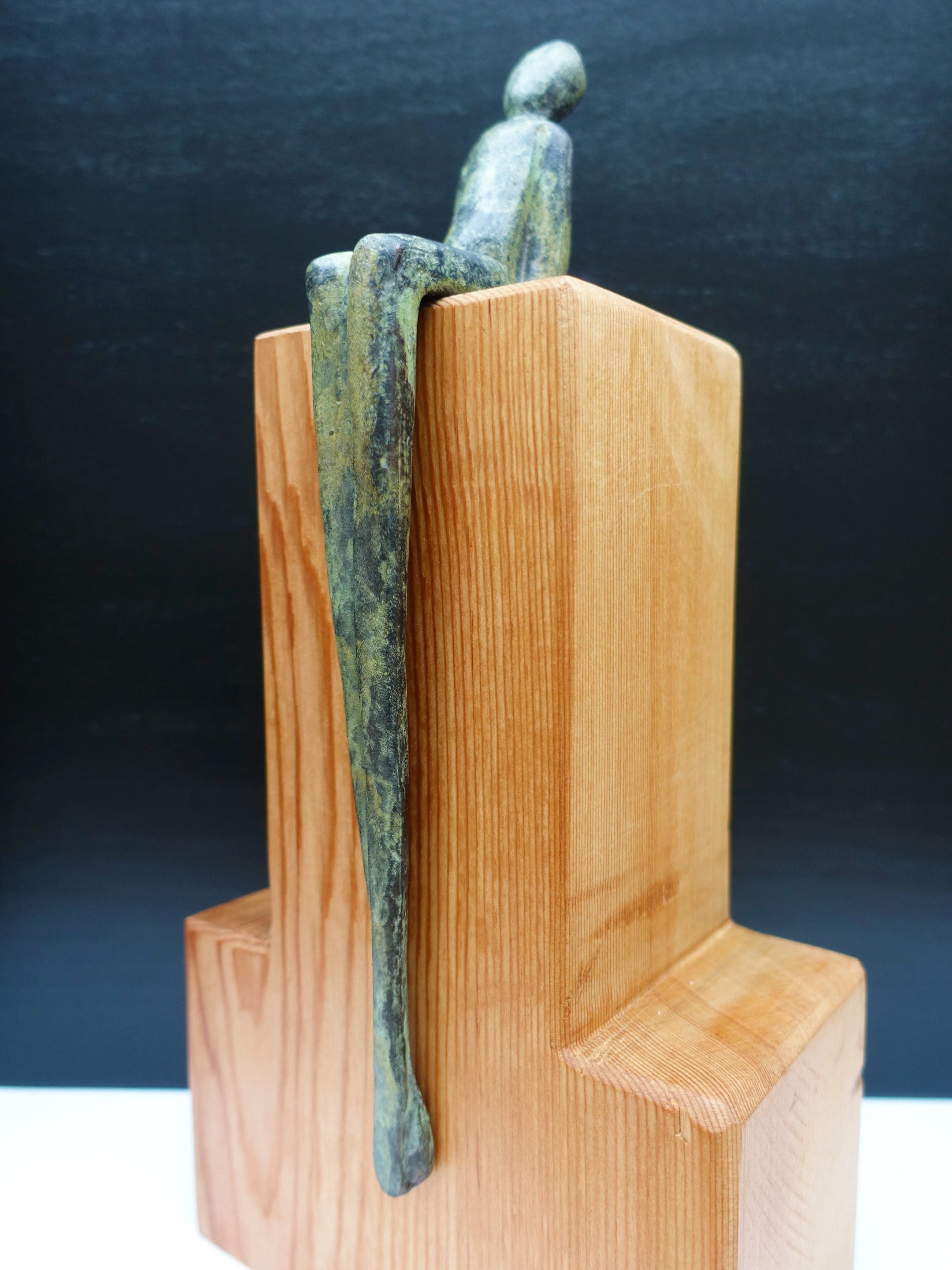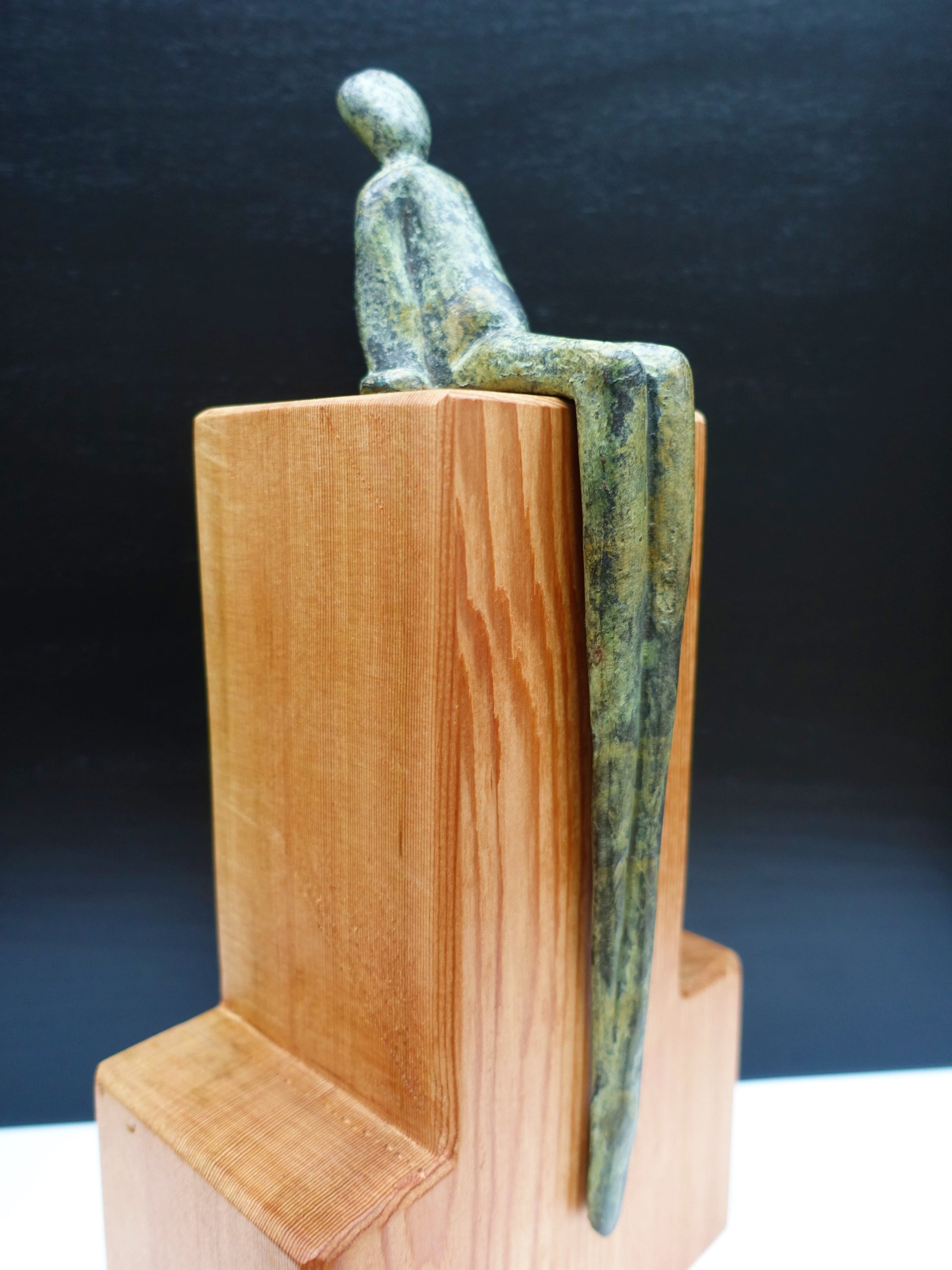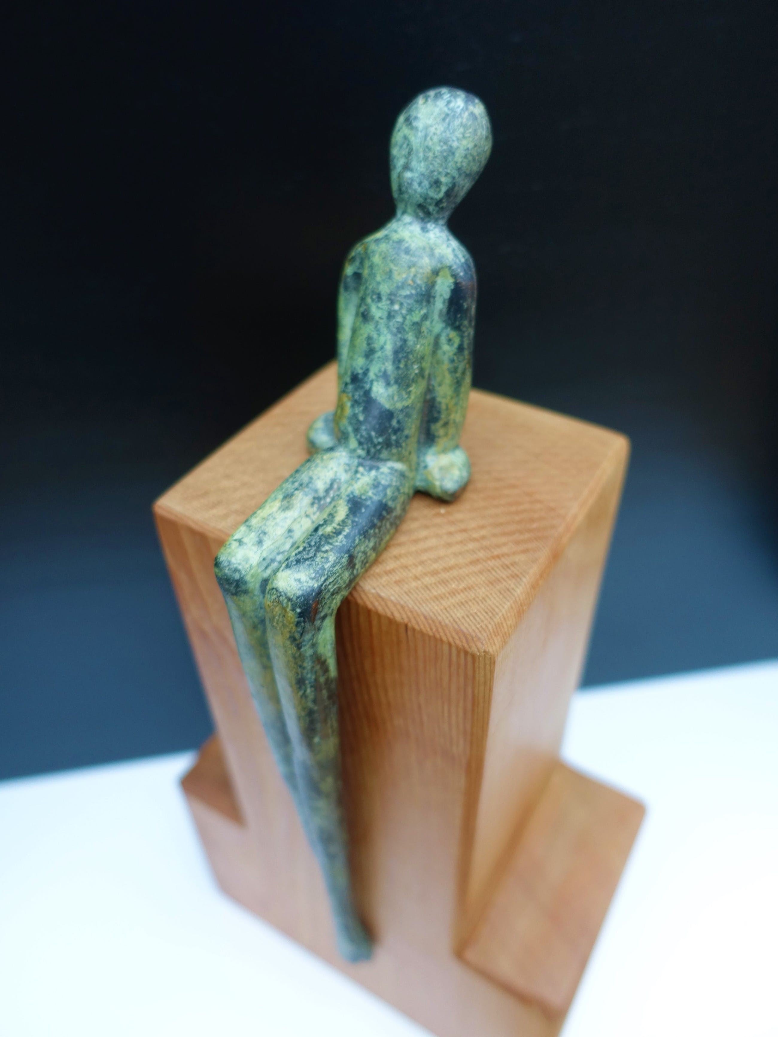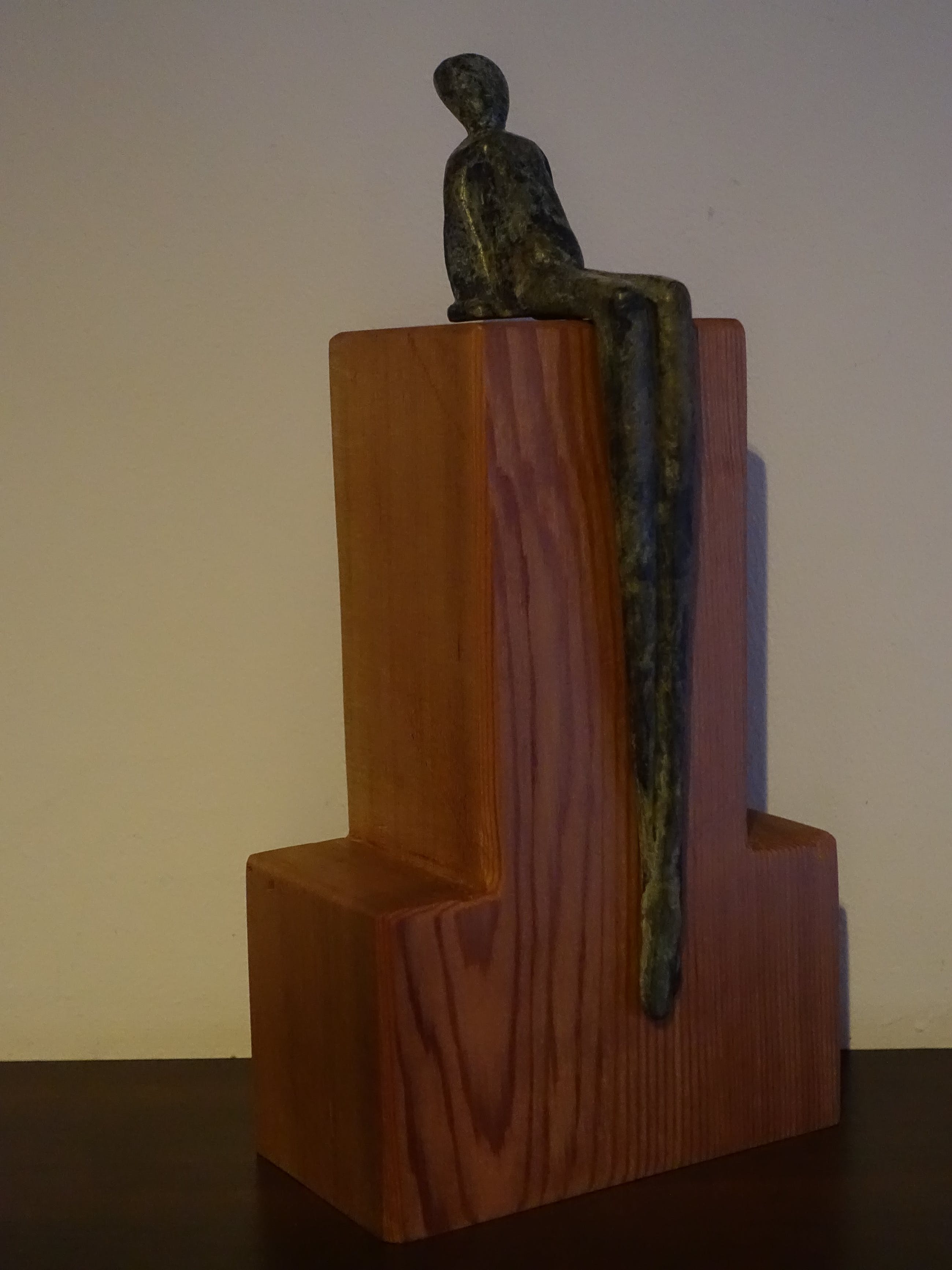 Leuk bronzen beeld van zittende figuur. Foto 1 geeft het best weer hoe het beeld er echt uitziet, de andere foto's zijn  wat overbelicht. Het beeld zit nu op een houten ( red cedar?) blok, maar zou ook op een tafel of in de vensterbank kunnen zitten.  Het beeld is gesigneerd aan de achterzijde met  de letter A. De afmetingen zijn exclusief het blok. Het blok meet 27 h x 18 b.
