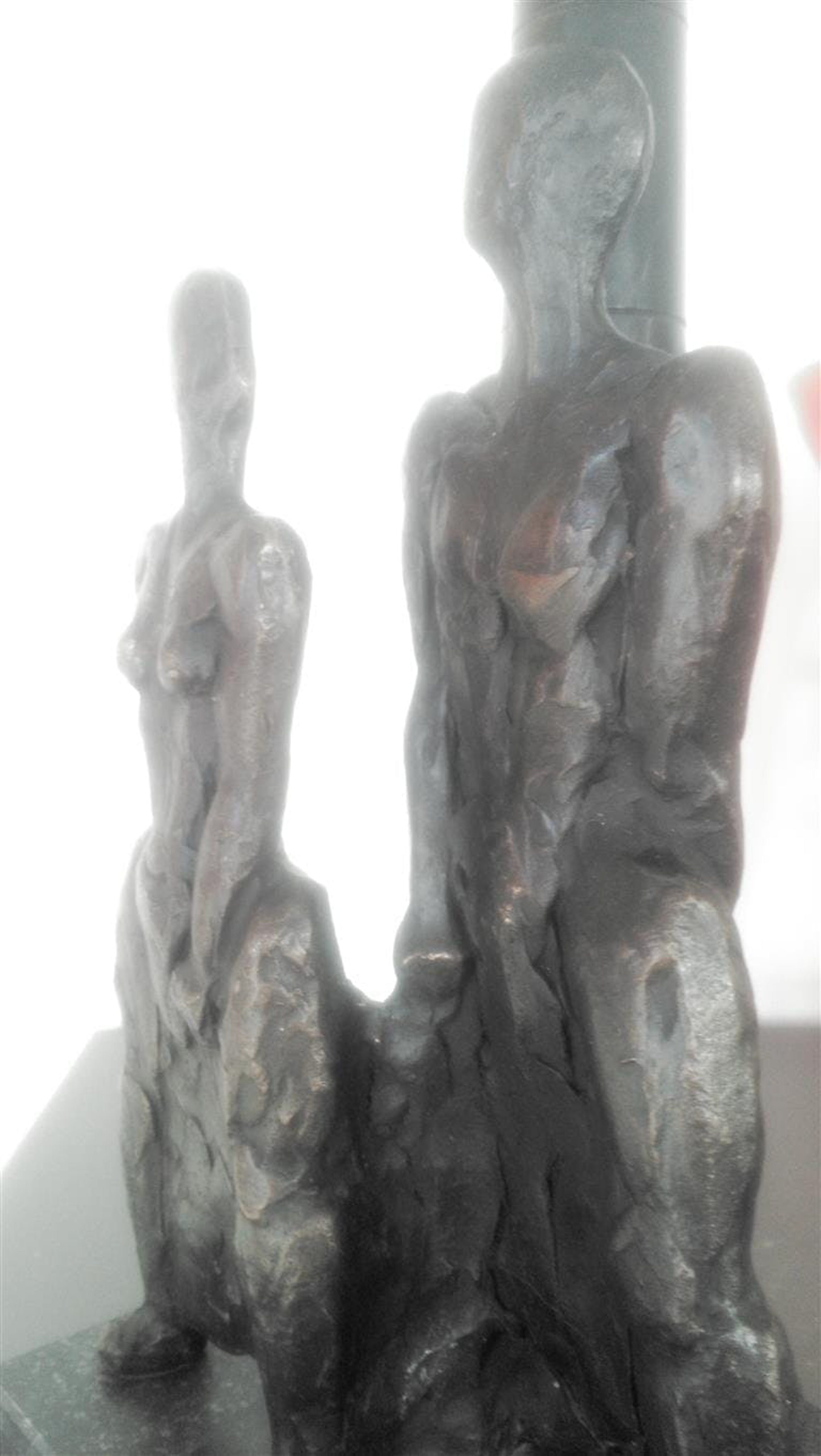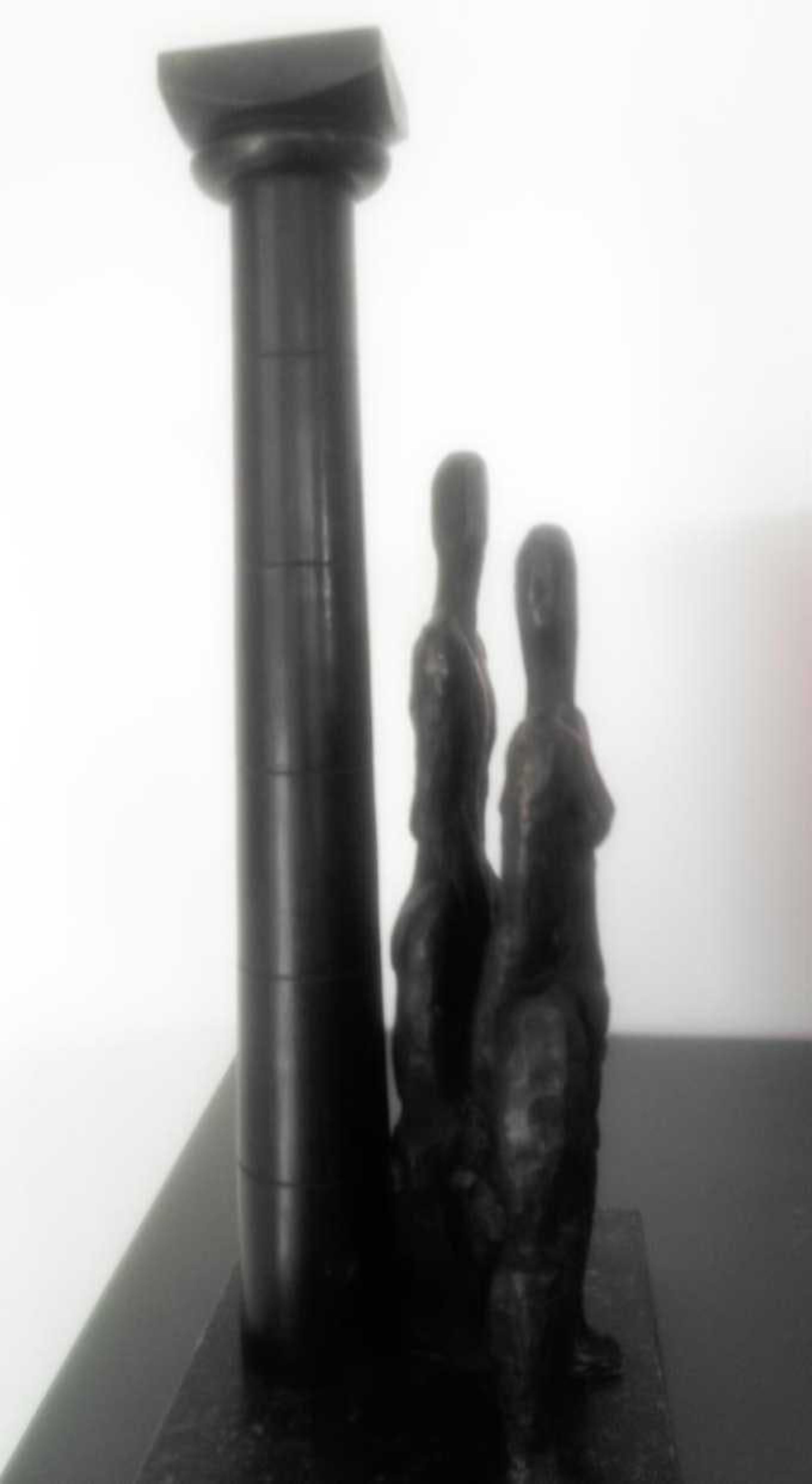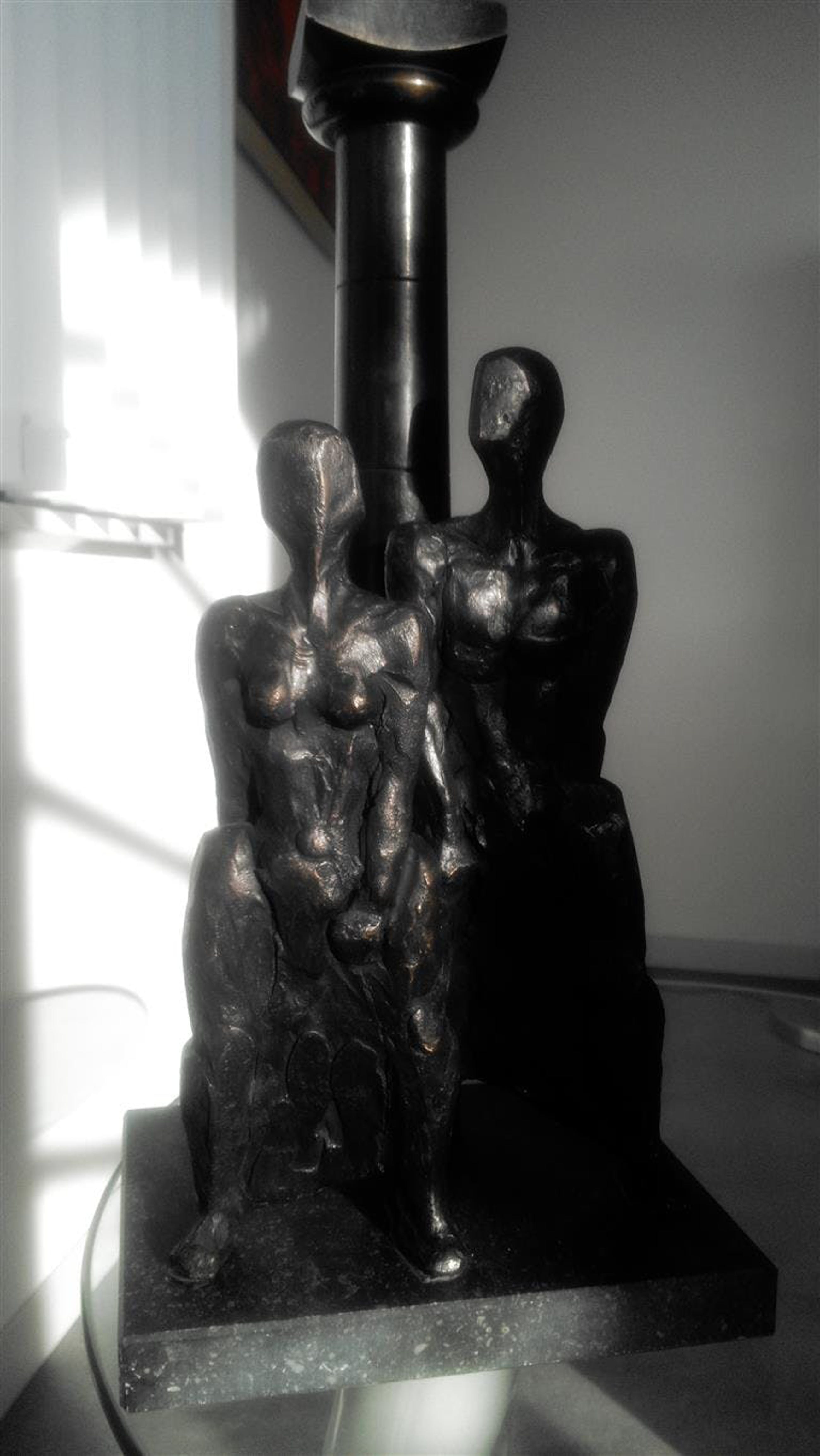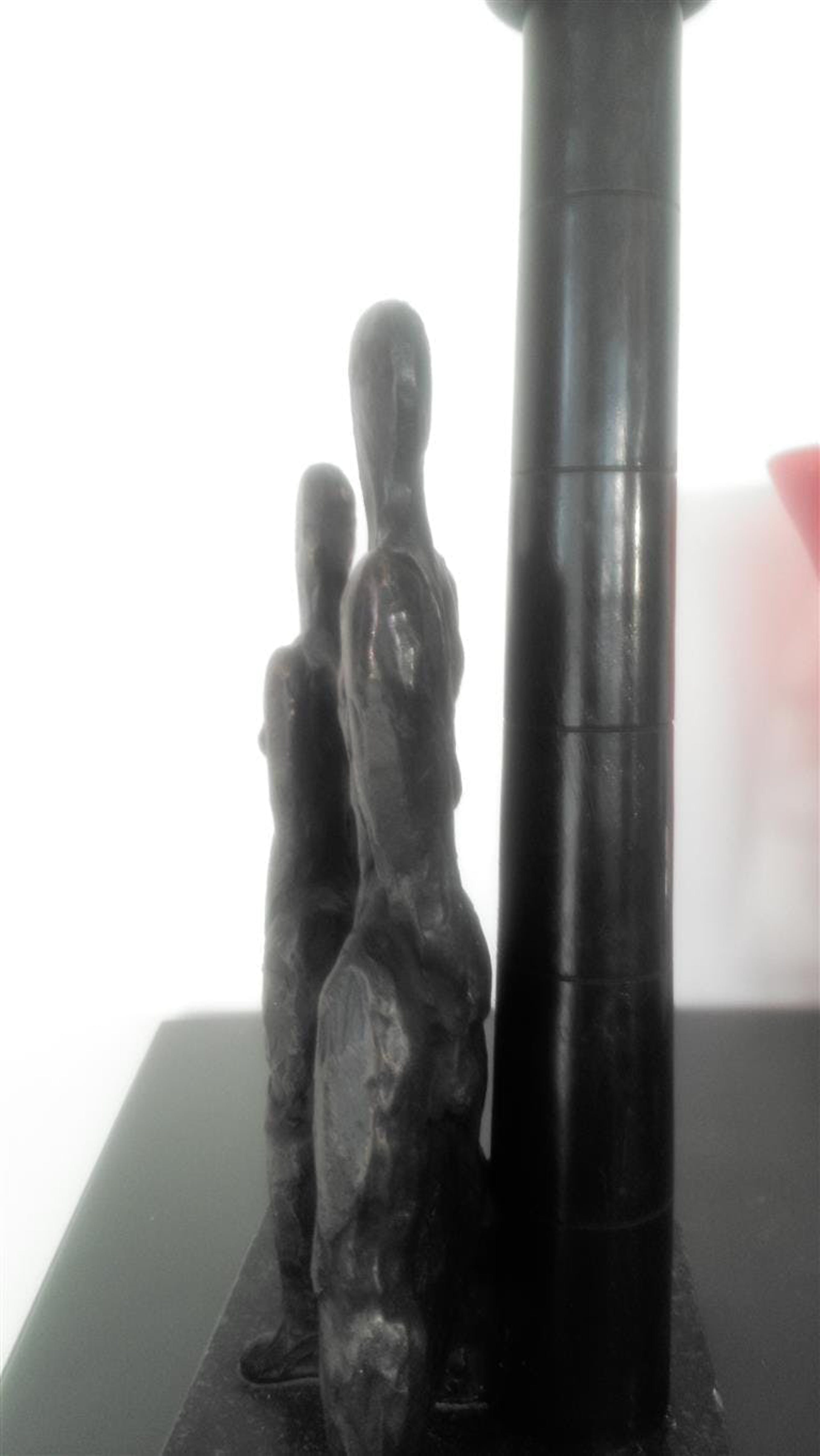 Gesigneerd H.V.B. (Henk van Bommel de man bekend van zijn penningen?) Zwaar beeld los op natuurstenen plateau Boven op de pilaar een logo