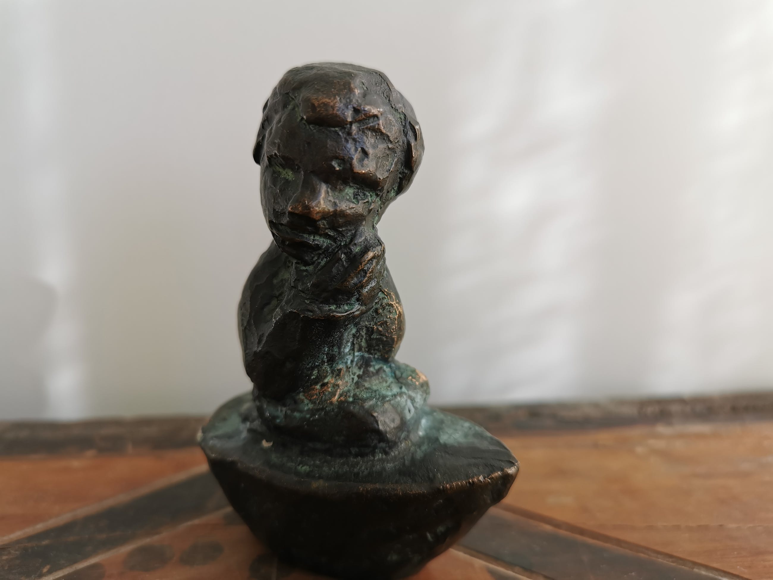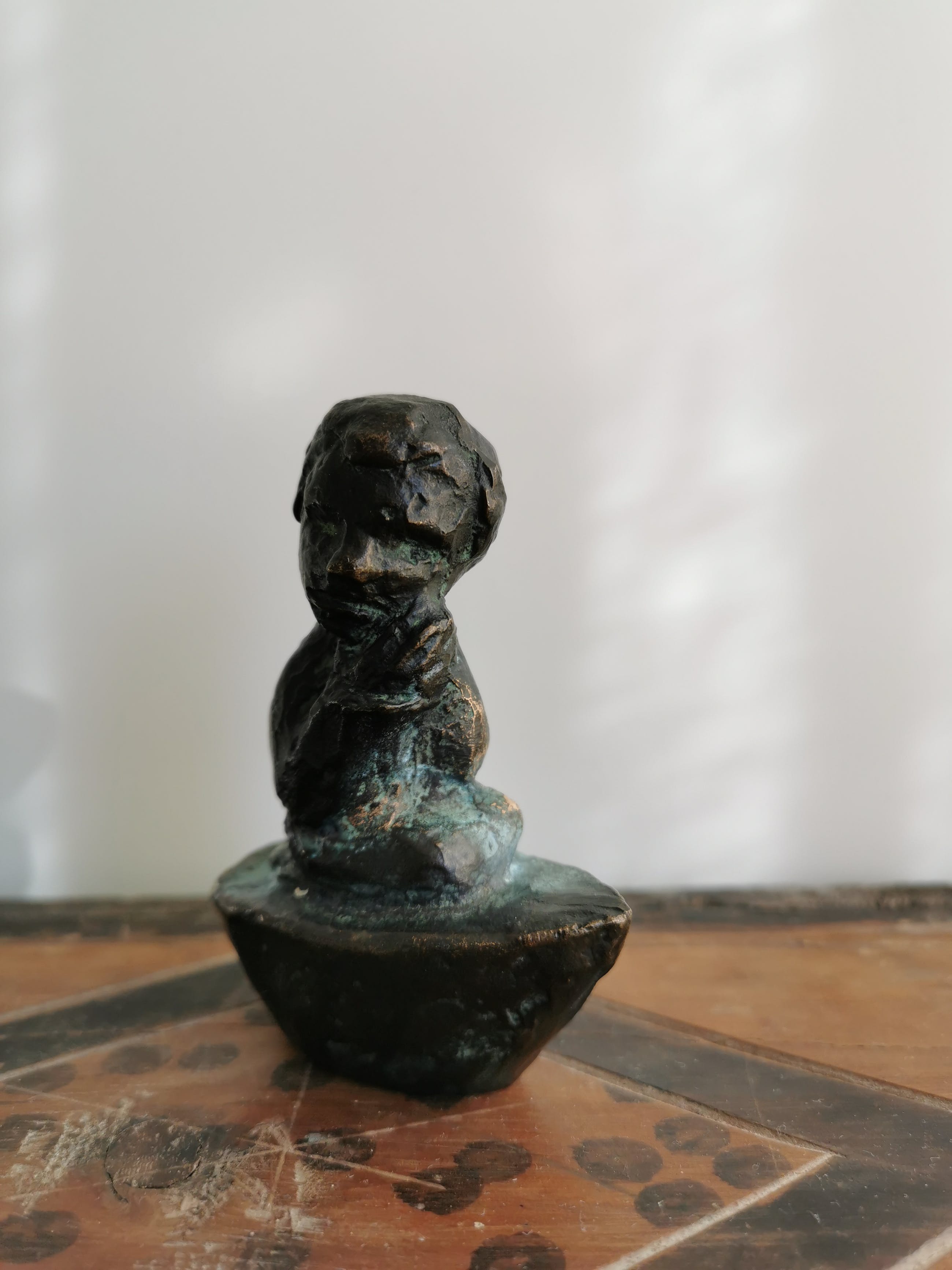 Prachtig gedetailleerd klein bronzen beeldje van een man met gevouwen armen in zijn nek op een voetstuk dat lijkt op een boot.