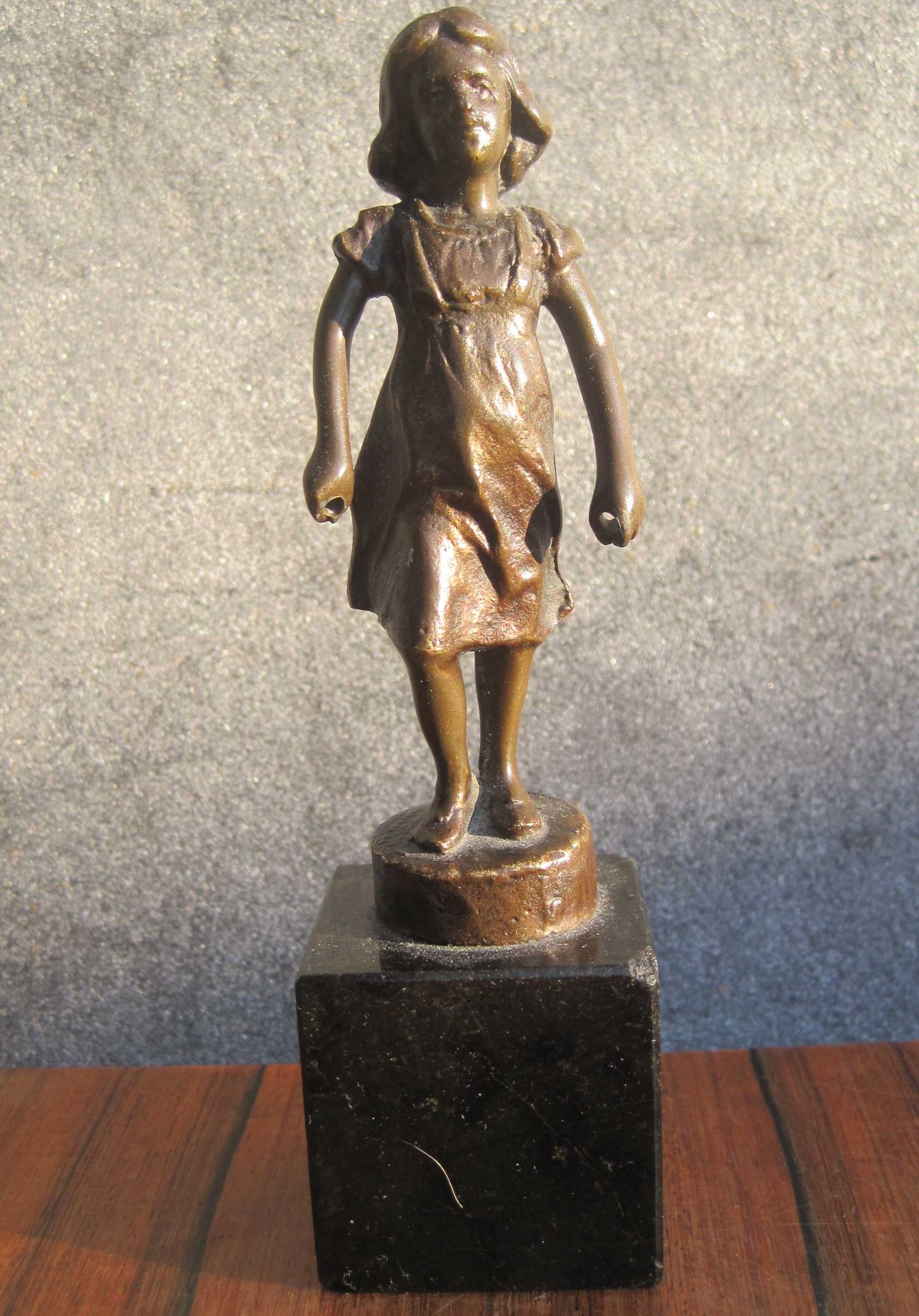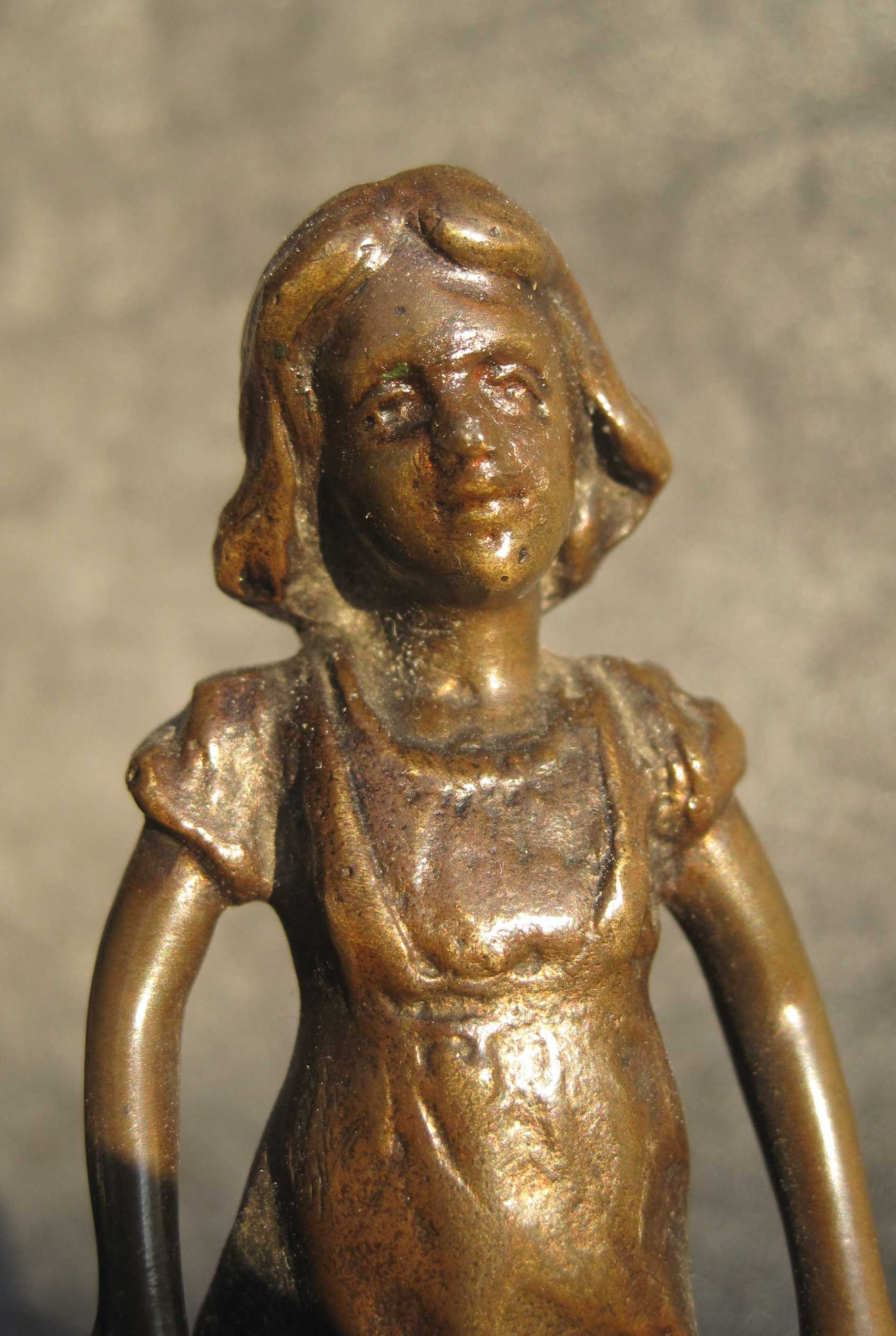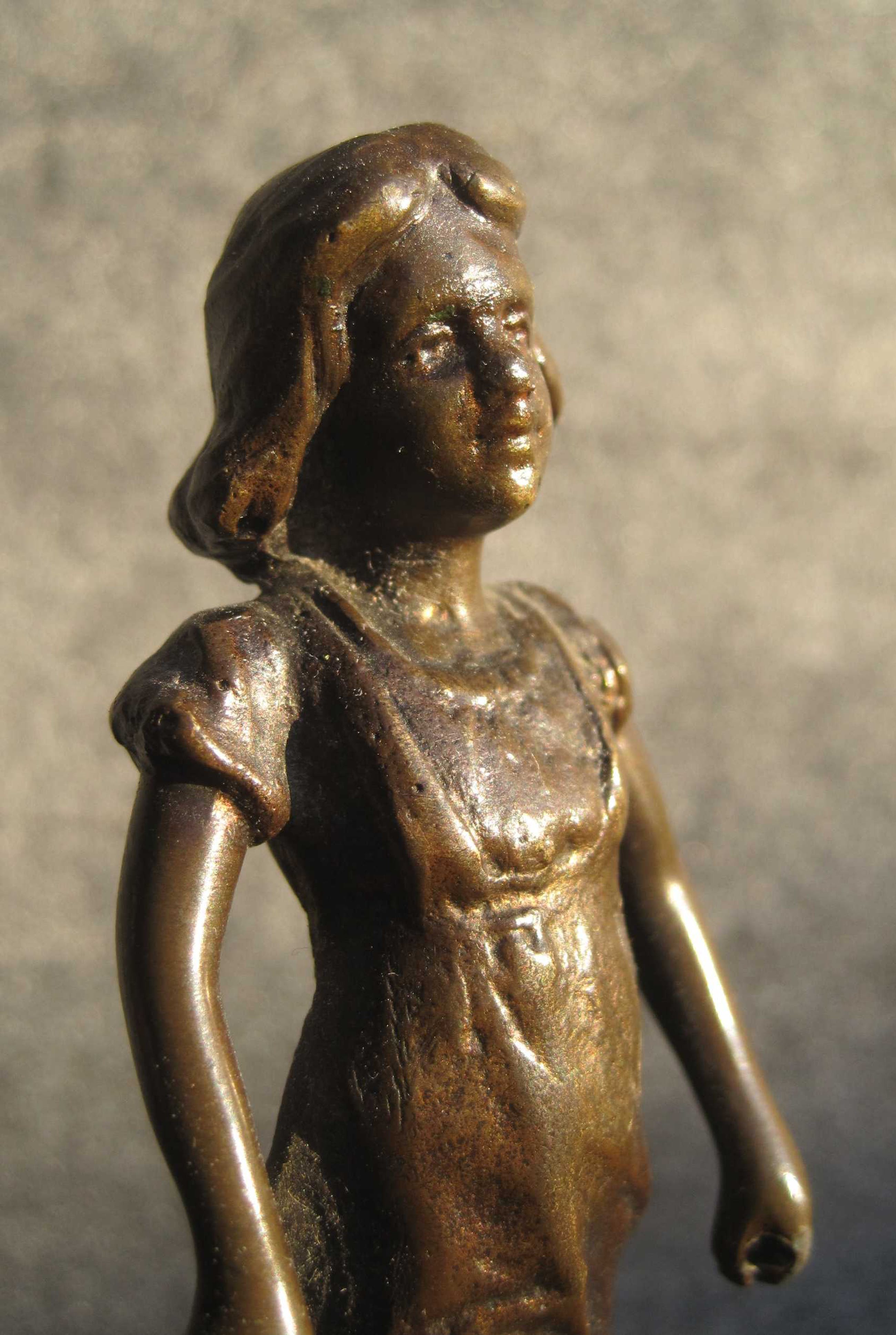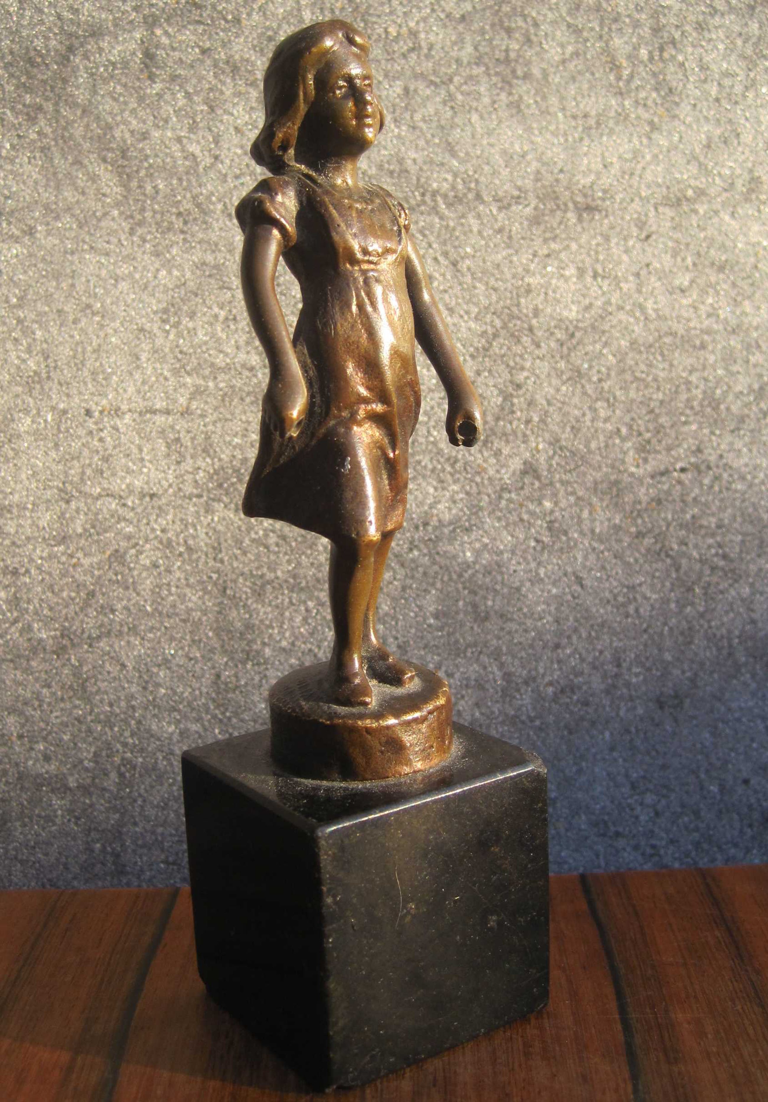 Lief bronzen beeldje van een meisje dat haar springtouw kwijt is. Ik weet niet uit welk materiaal het springtouw was gemaakt. Dit beeldje is gemaakt naar een ontwerp van Julius Schmidt-Felling. ( 1835 - 1920 ) Op de sokkel staat Felling en Bronze. De zwarte marmeren sokkel heeft op 2 hoeken 'n beschadiging.