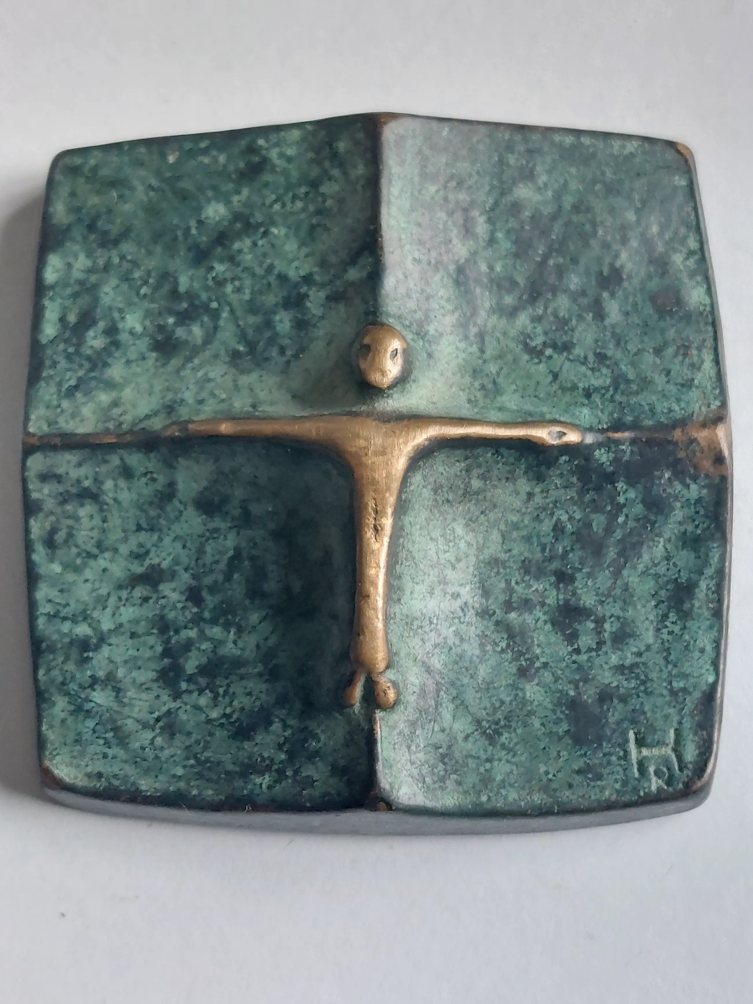 U kunt hier bieden op een hele mooie kunstzinnige plaquette, waar een waar gestileerd figuurtje met gespreide armen de voorzijde siert. De keerzijde is blanco. Betreft een gegoten plaquette.