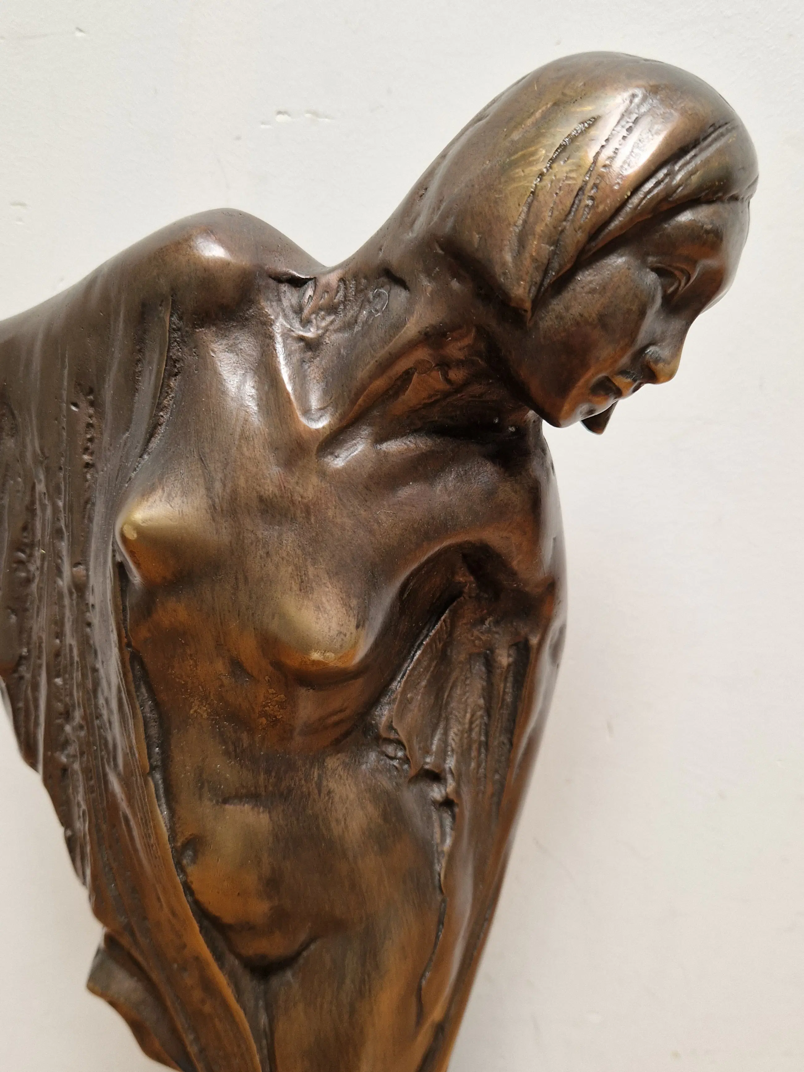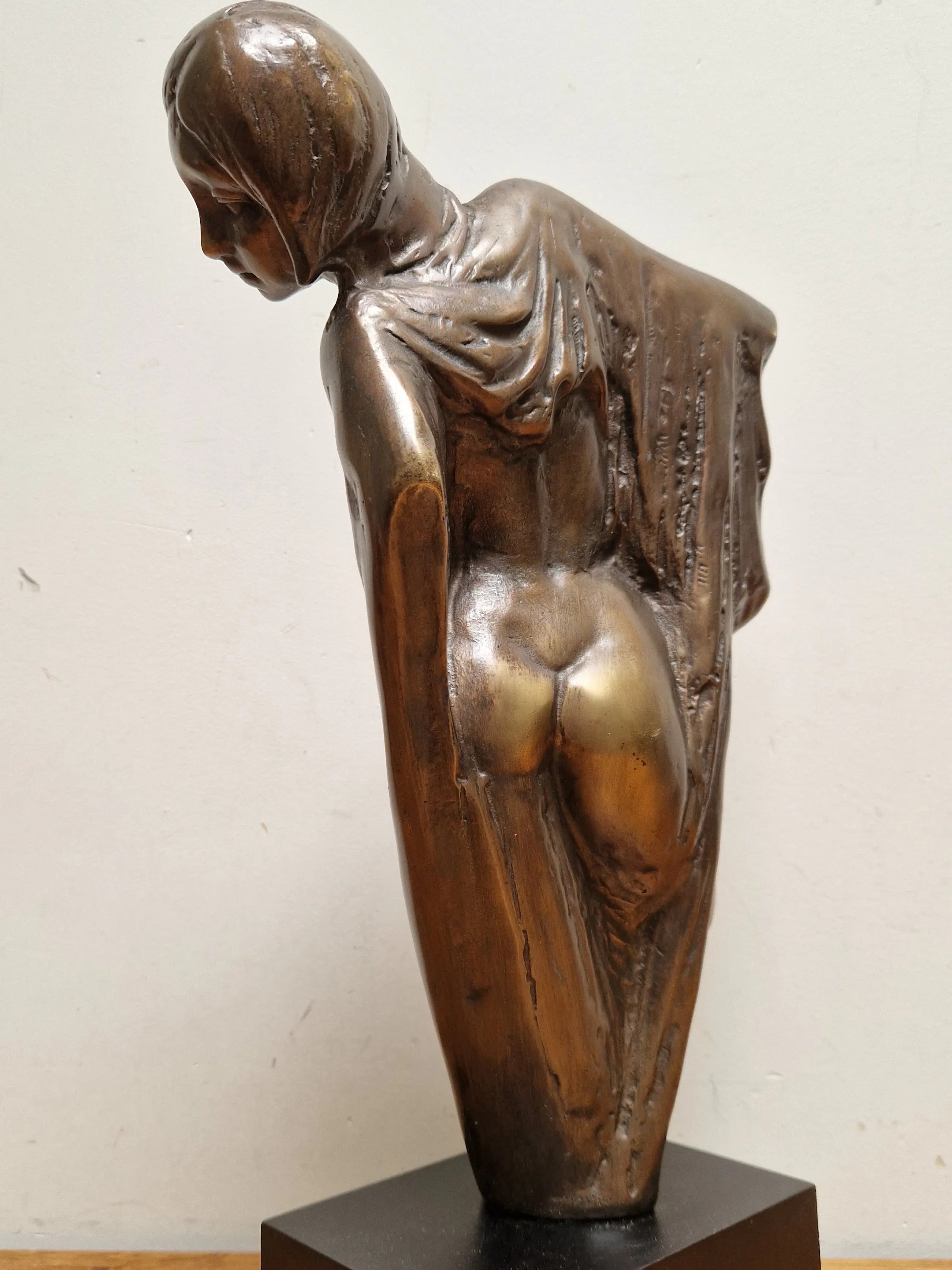 Fraai vormgegeven bronzen beeld. De naaktheid wordt benadrukt door het kleed dat ze nog gedeeltelijk om heeft.