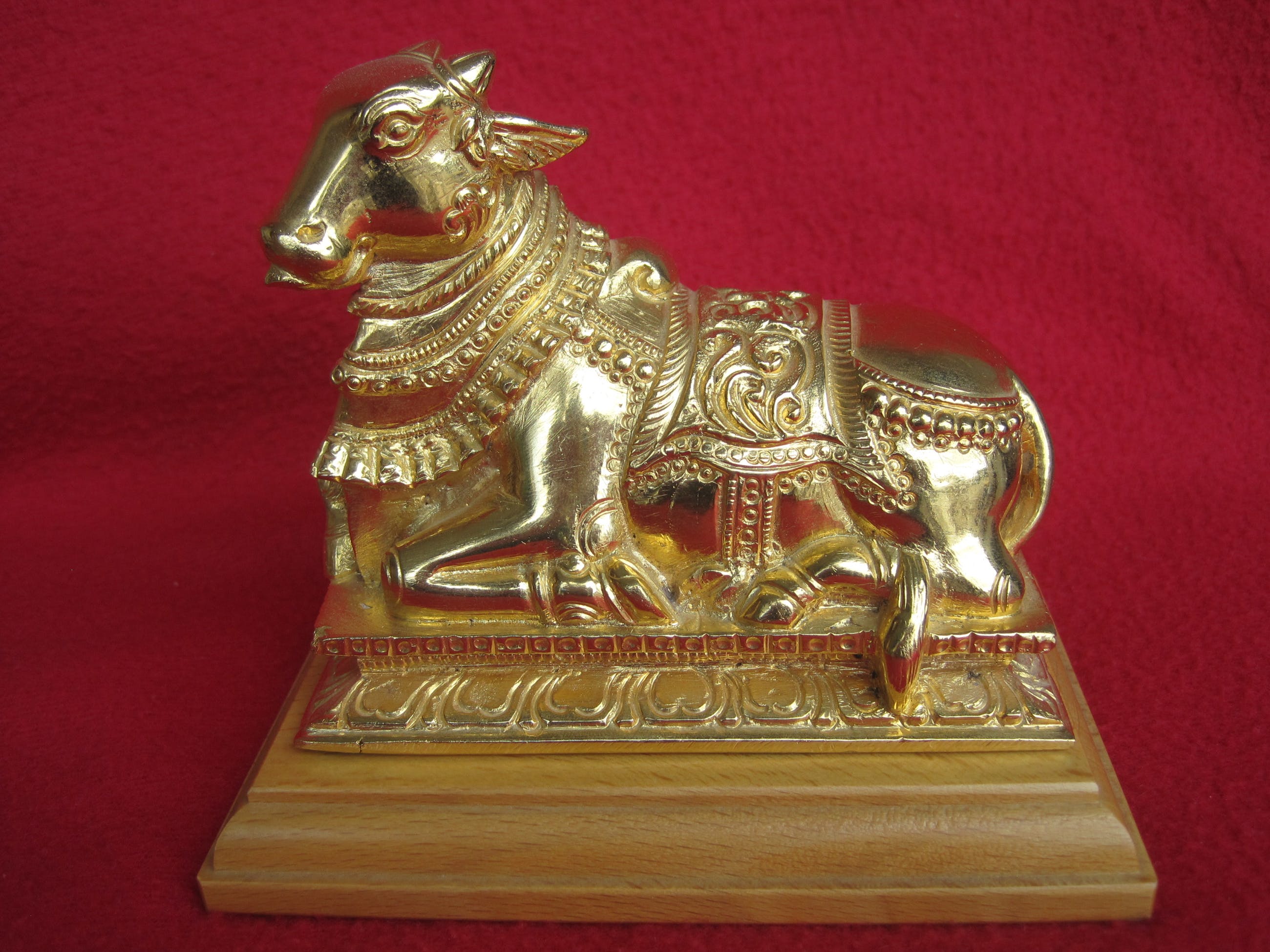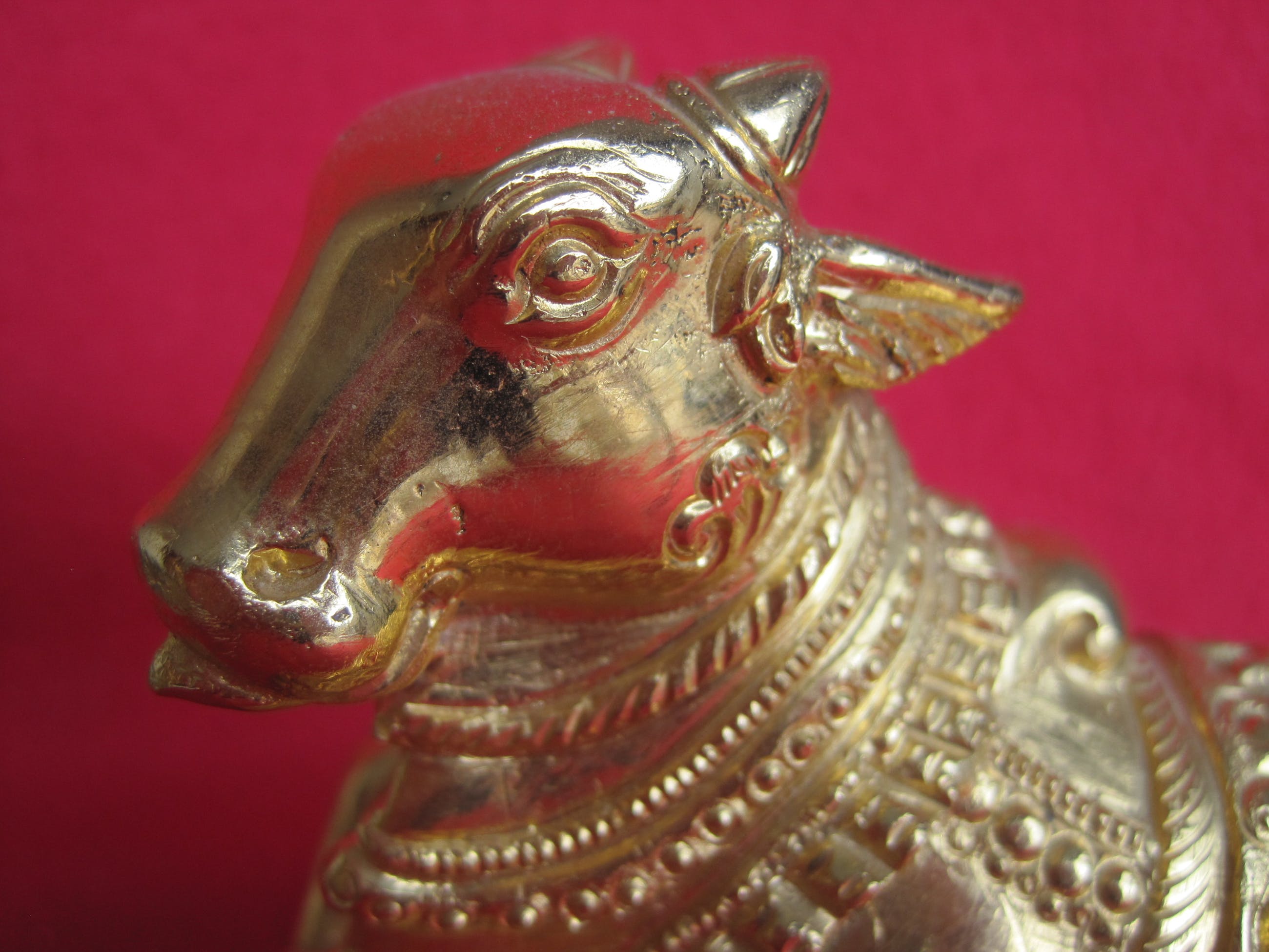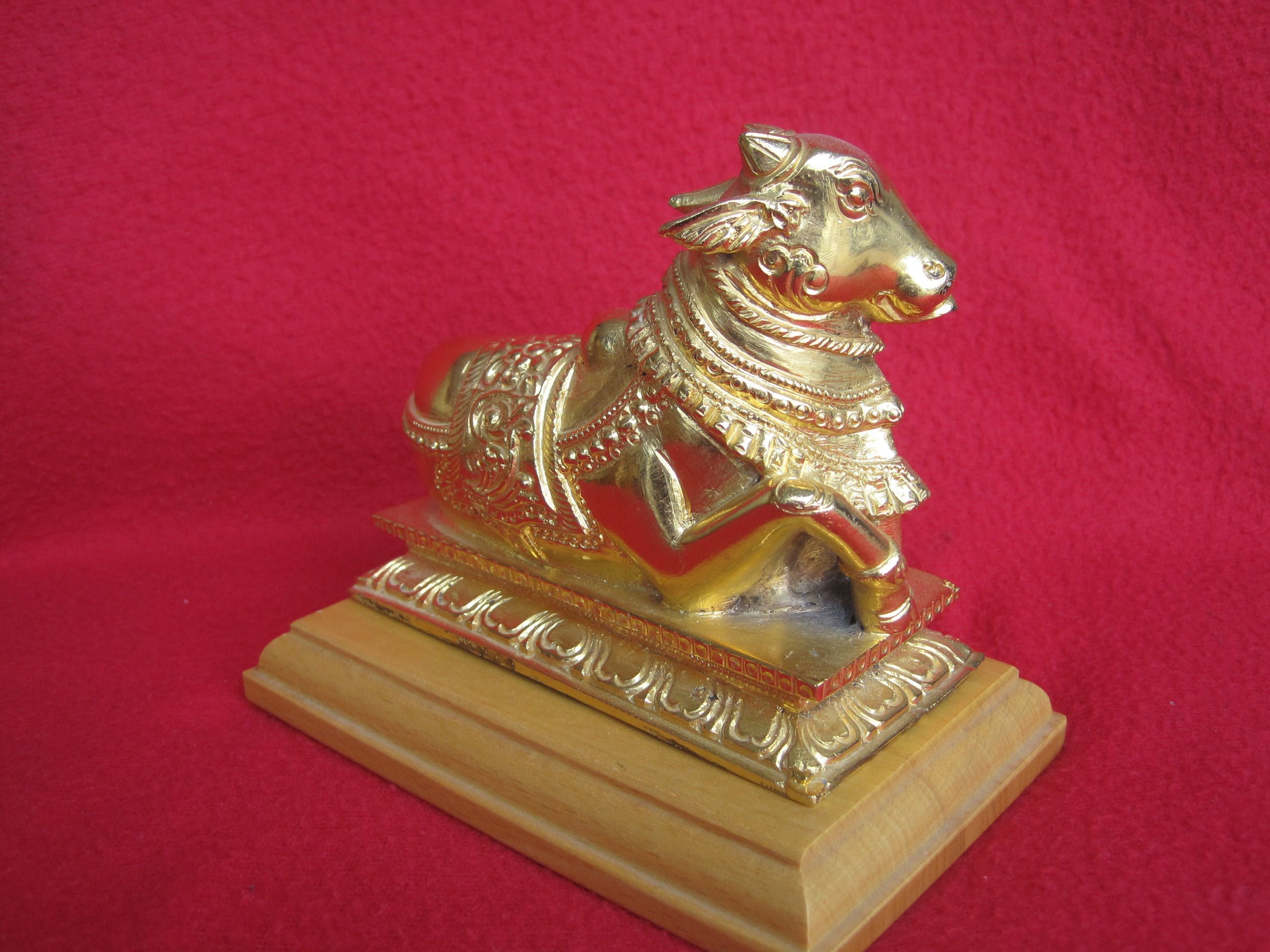 Fraai gemodelleerd beeldje van de heilige stier Nandi uit het Hindoeísme.Het is een gegoten bronzen beeldje wat is verguld.Voorzien van mooie details.Er hoort een losse houten sokkel bij.