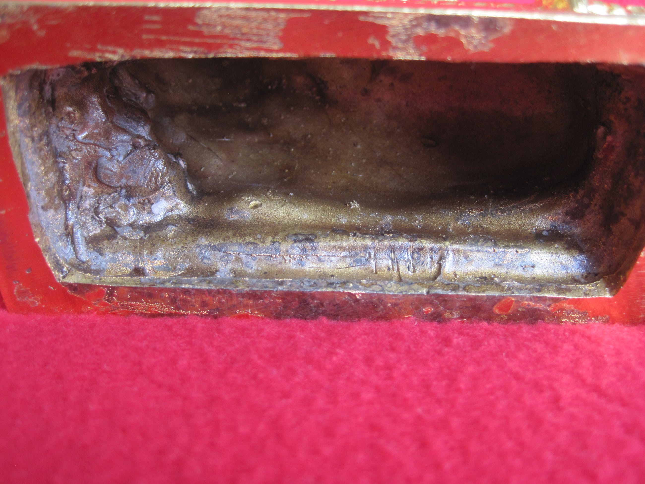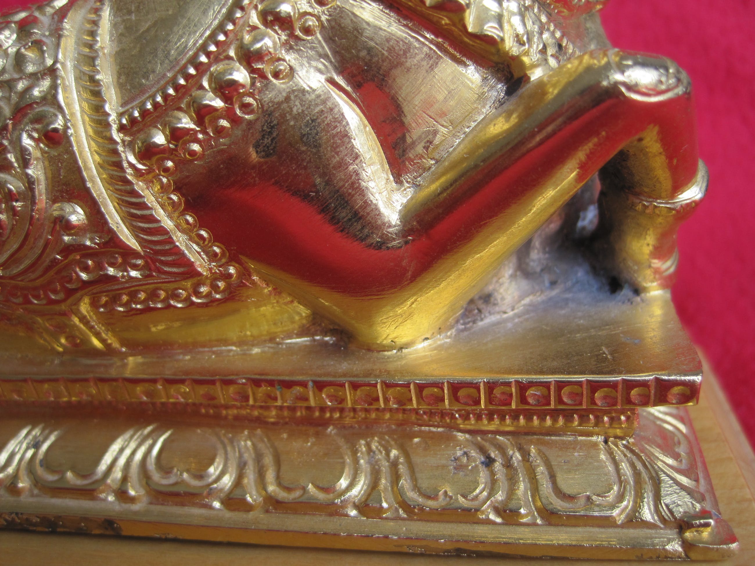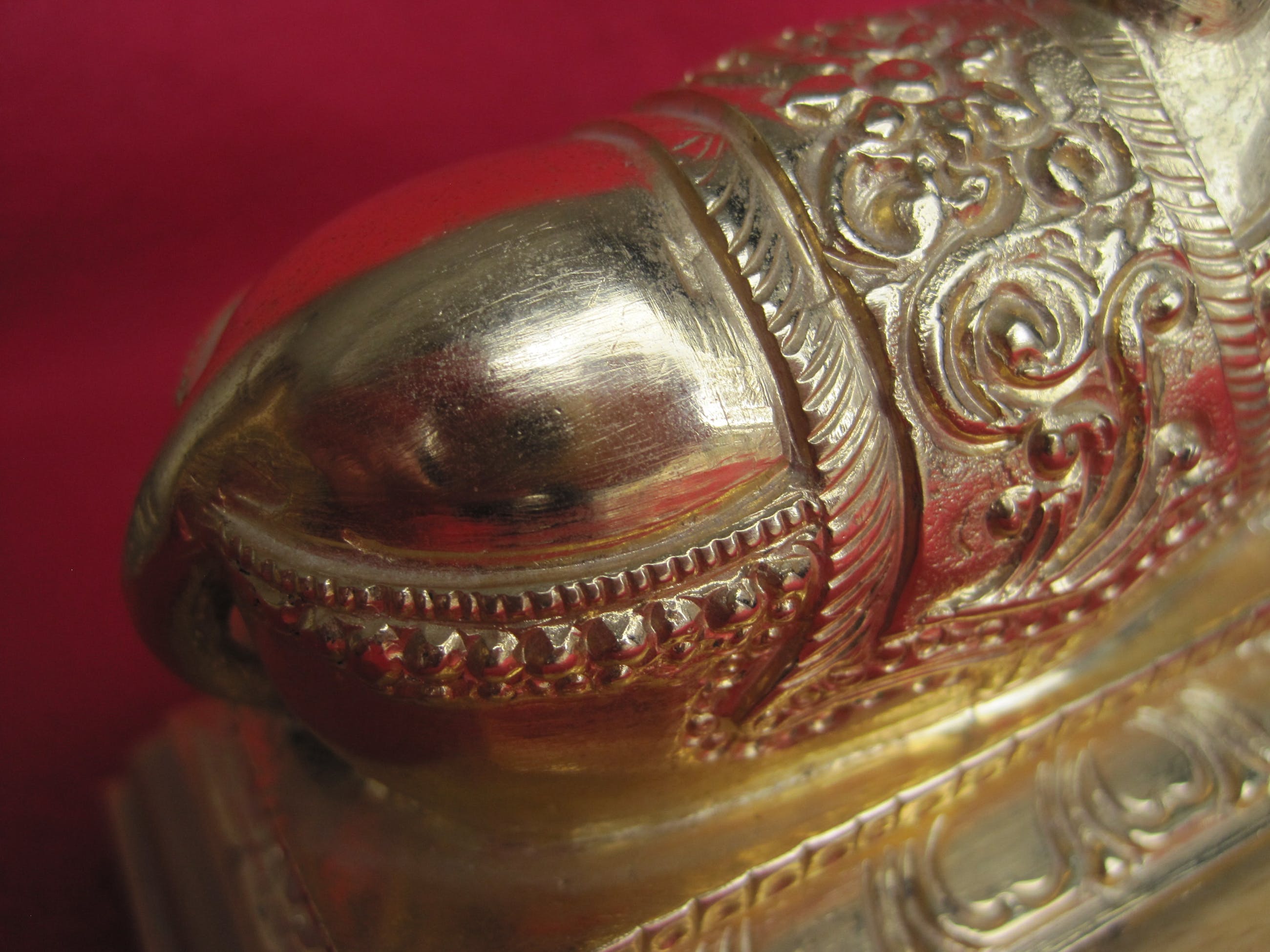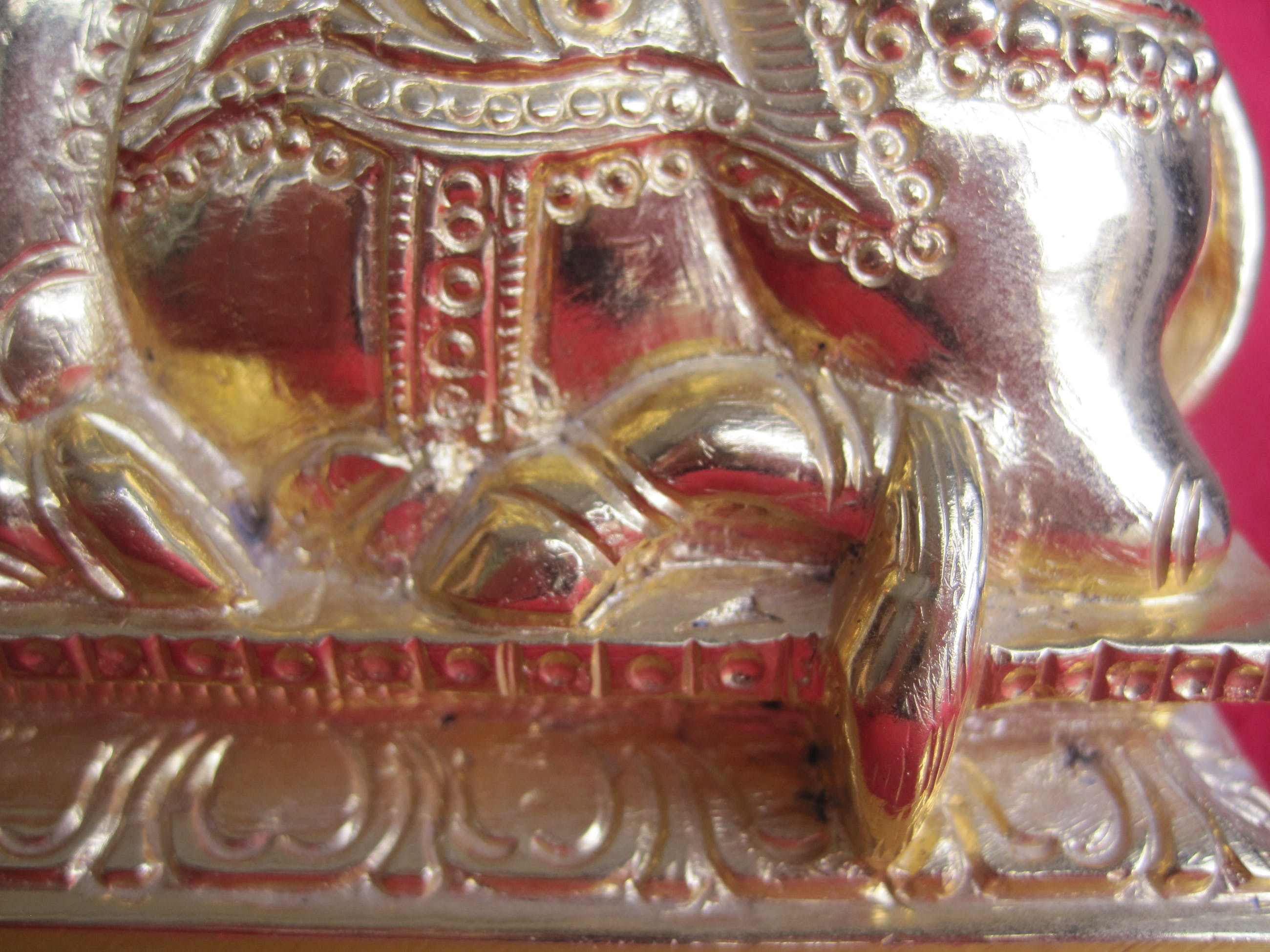 Fraai gemodelleerd beeldje van de heilige stier Nandi uit het Hindoeísme.Het is een gegoten bronzen beeldje wat is verguld.Voorzien van mooie details.Er hoort een losse houten sokkel bij.