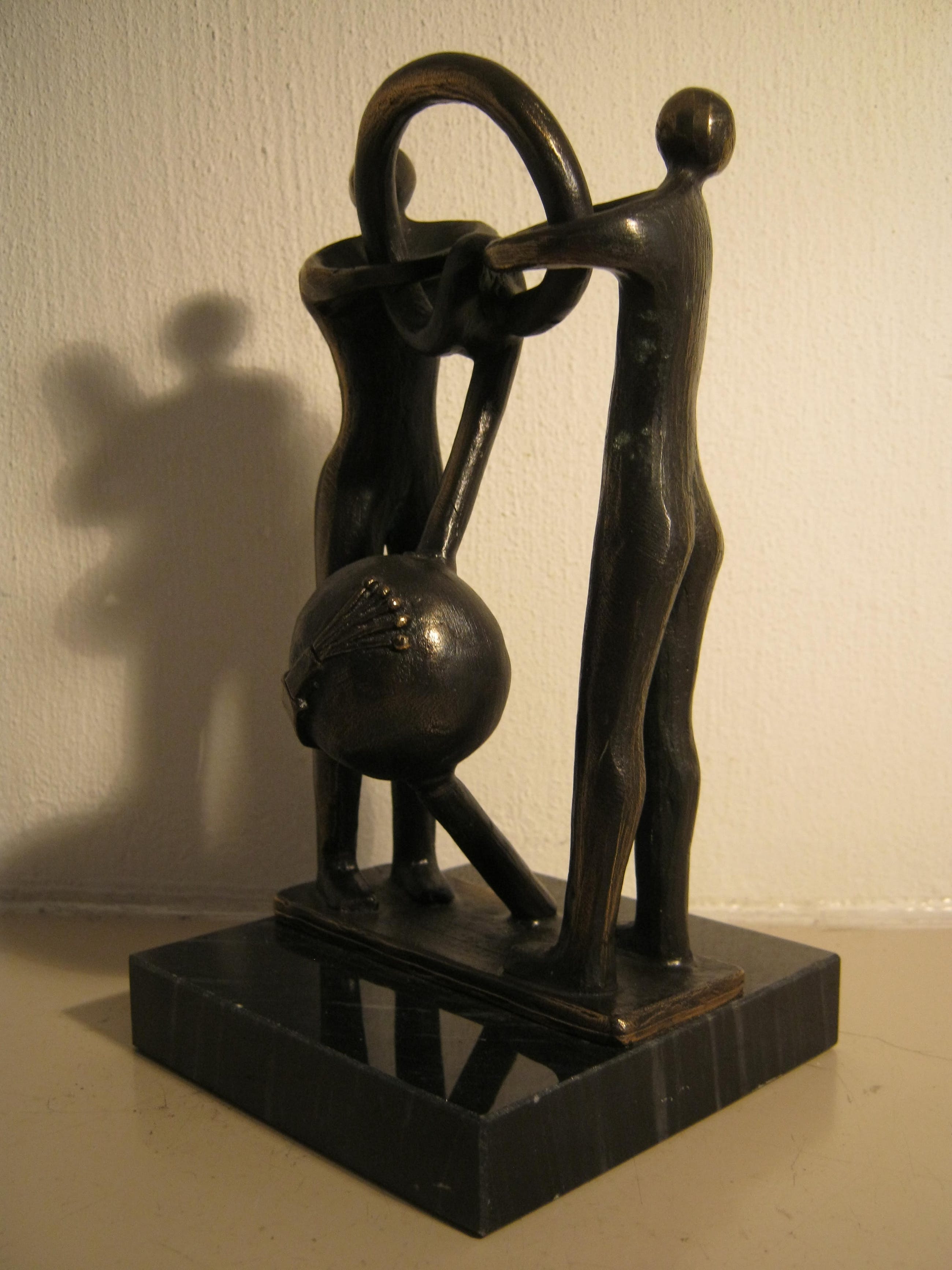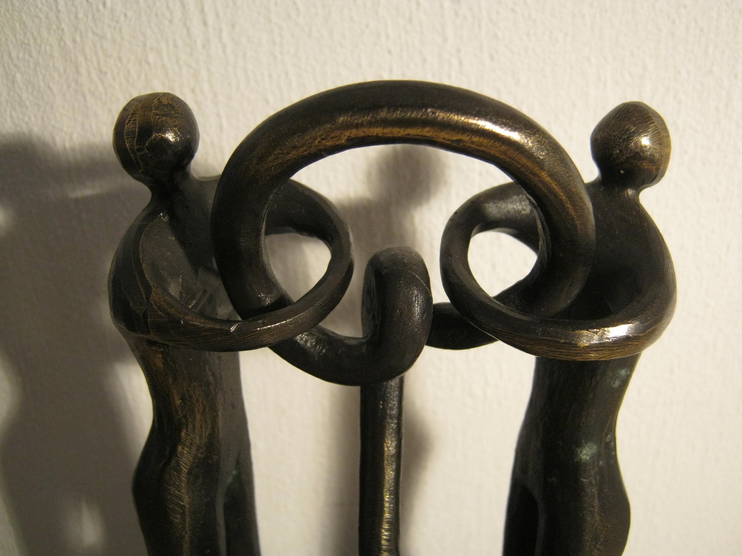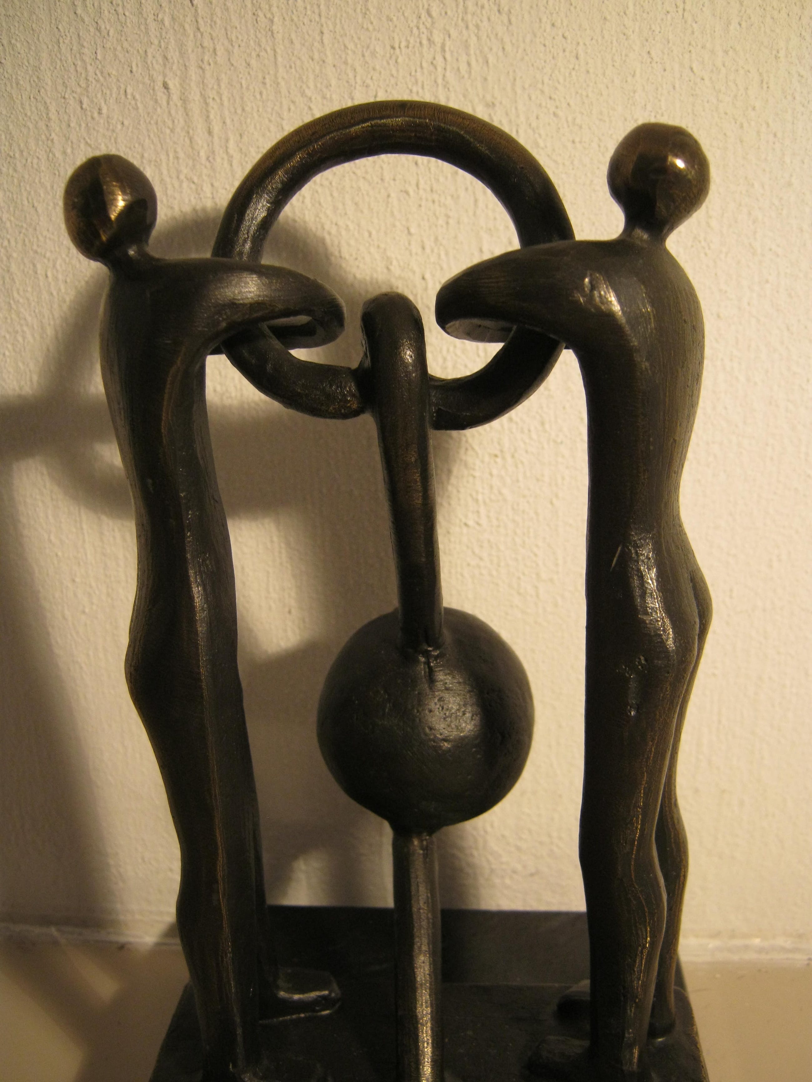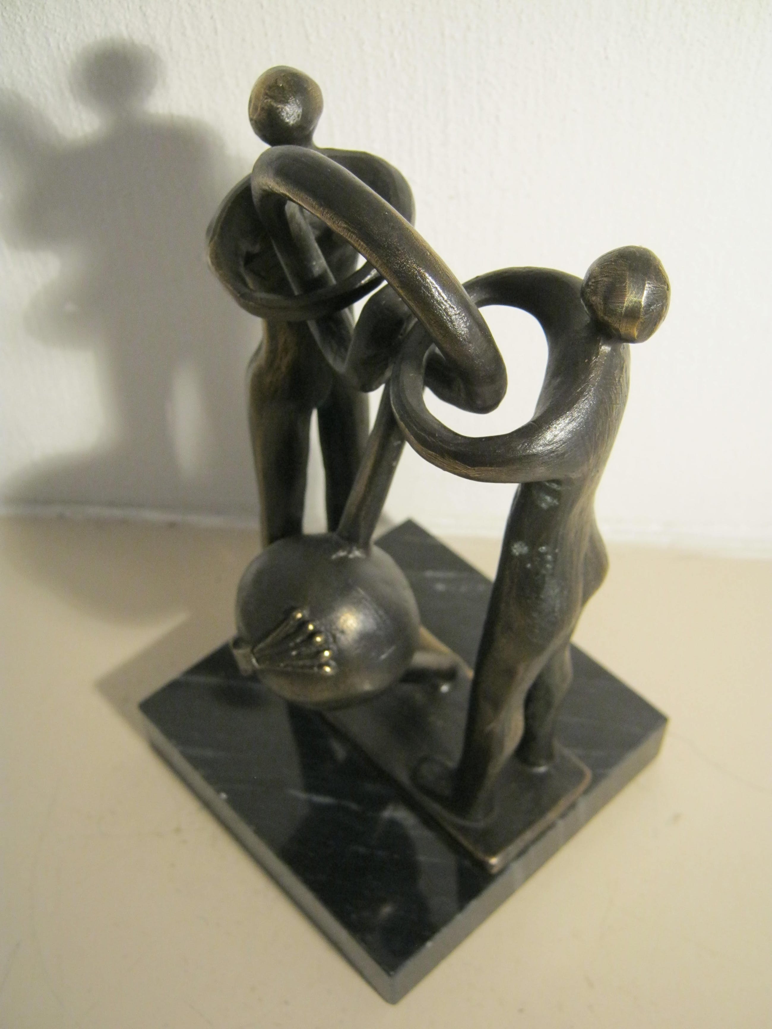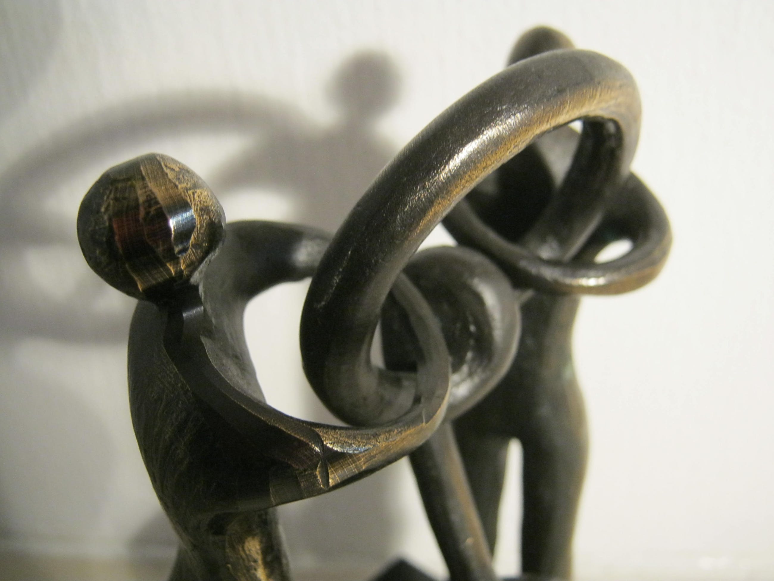 Zwaar brons sculptuur van twee mensfiguren op marmeren sokkel.
