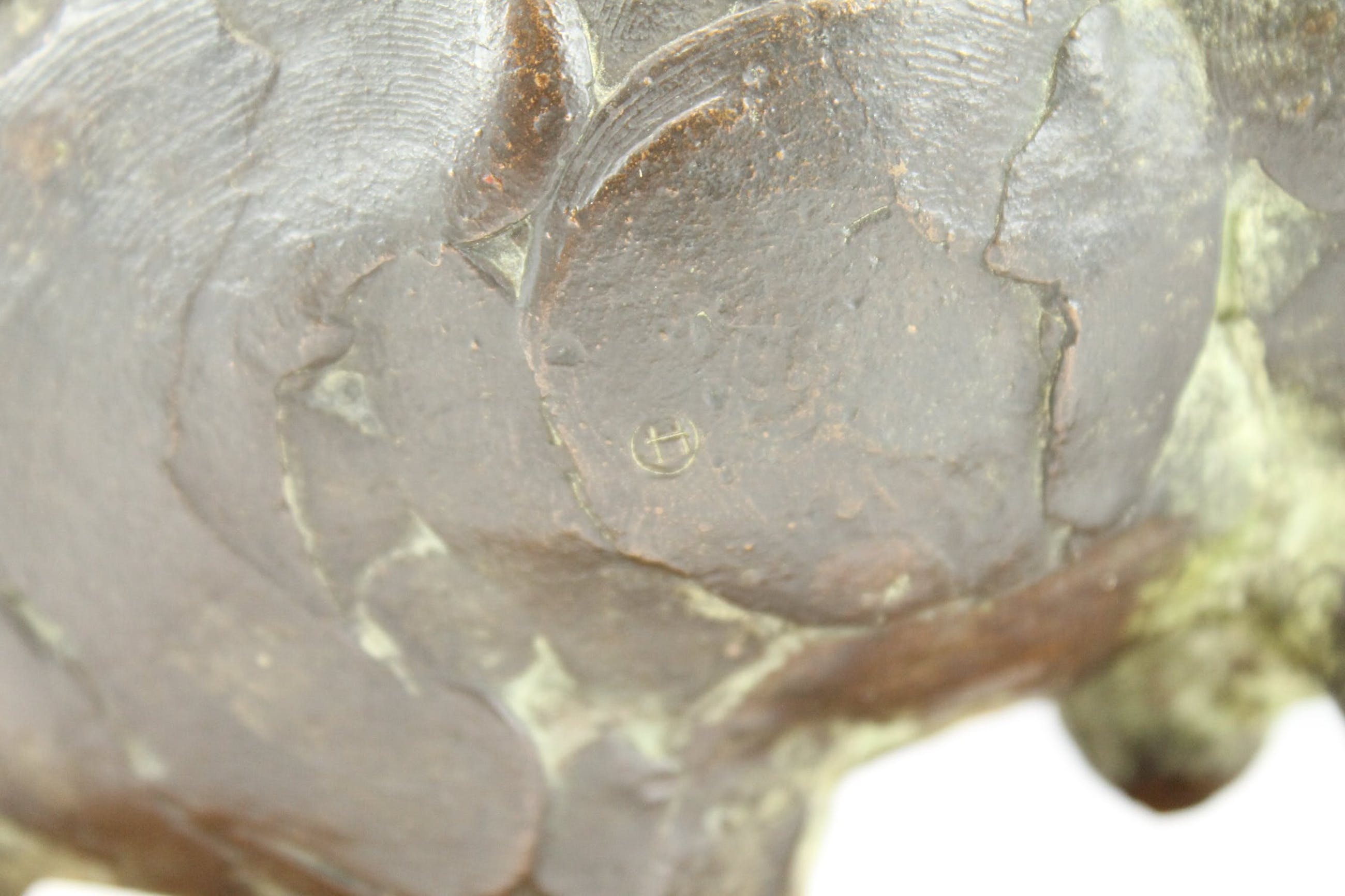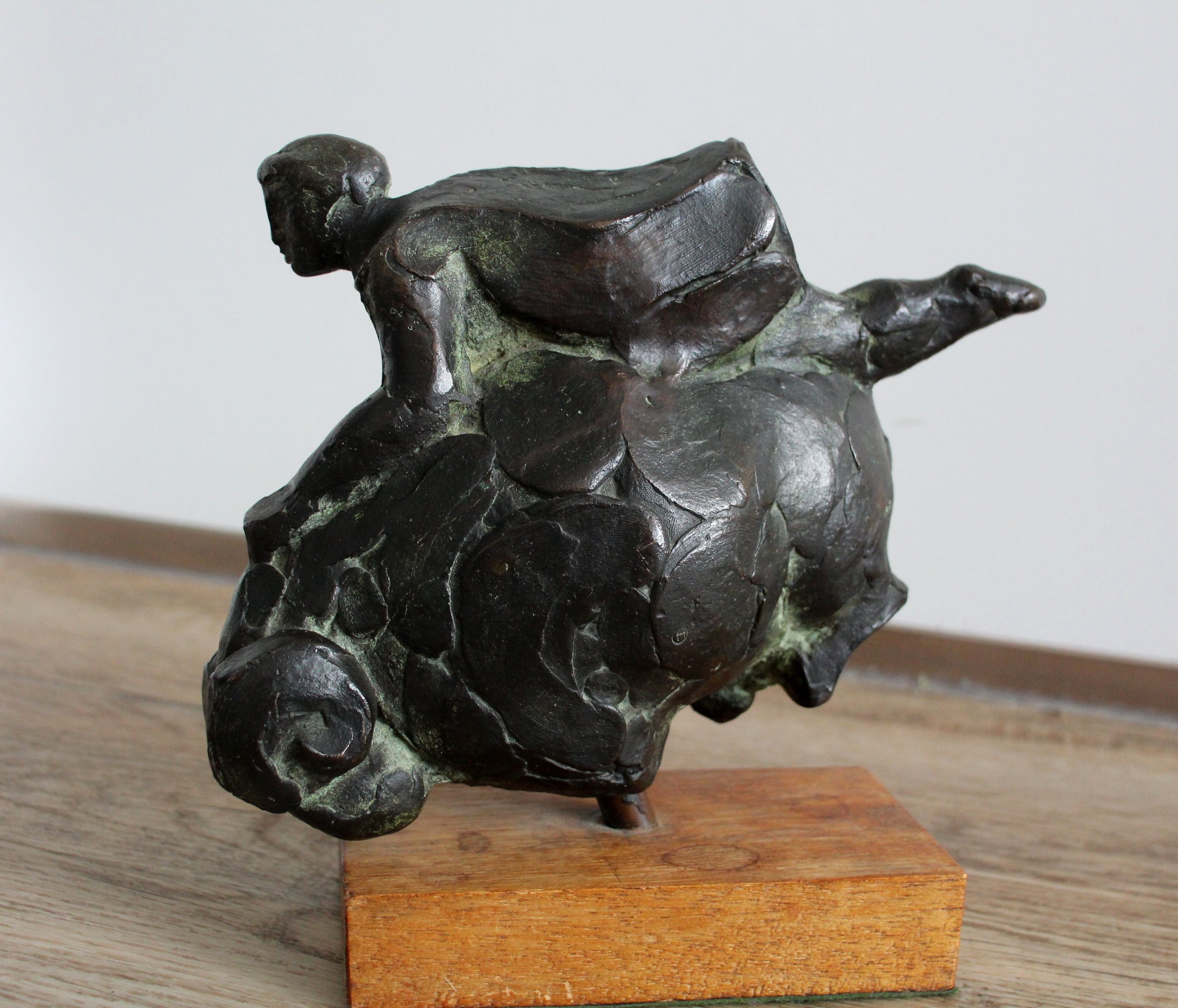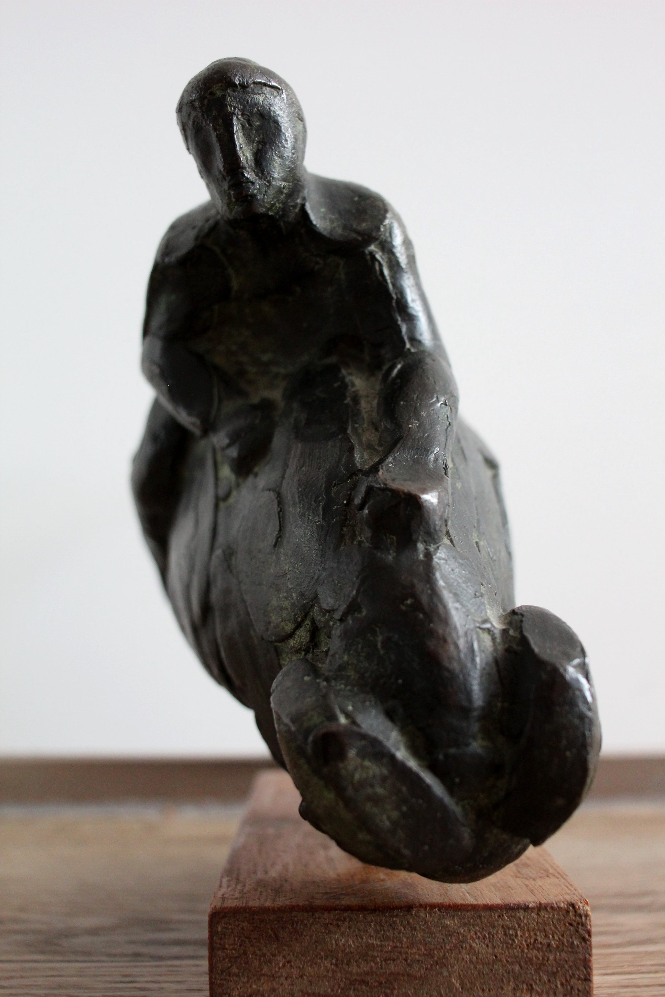 Prachtig bronzen beeld op houten basement. Titel: de bokkerijder. Het werk is gesigneerd. De kunstenaar is echter niet bekend.