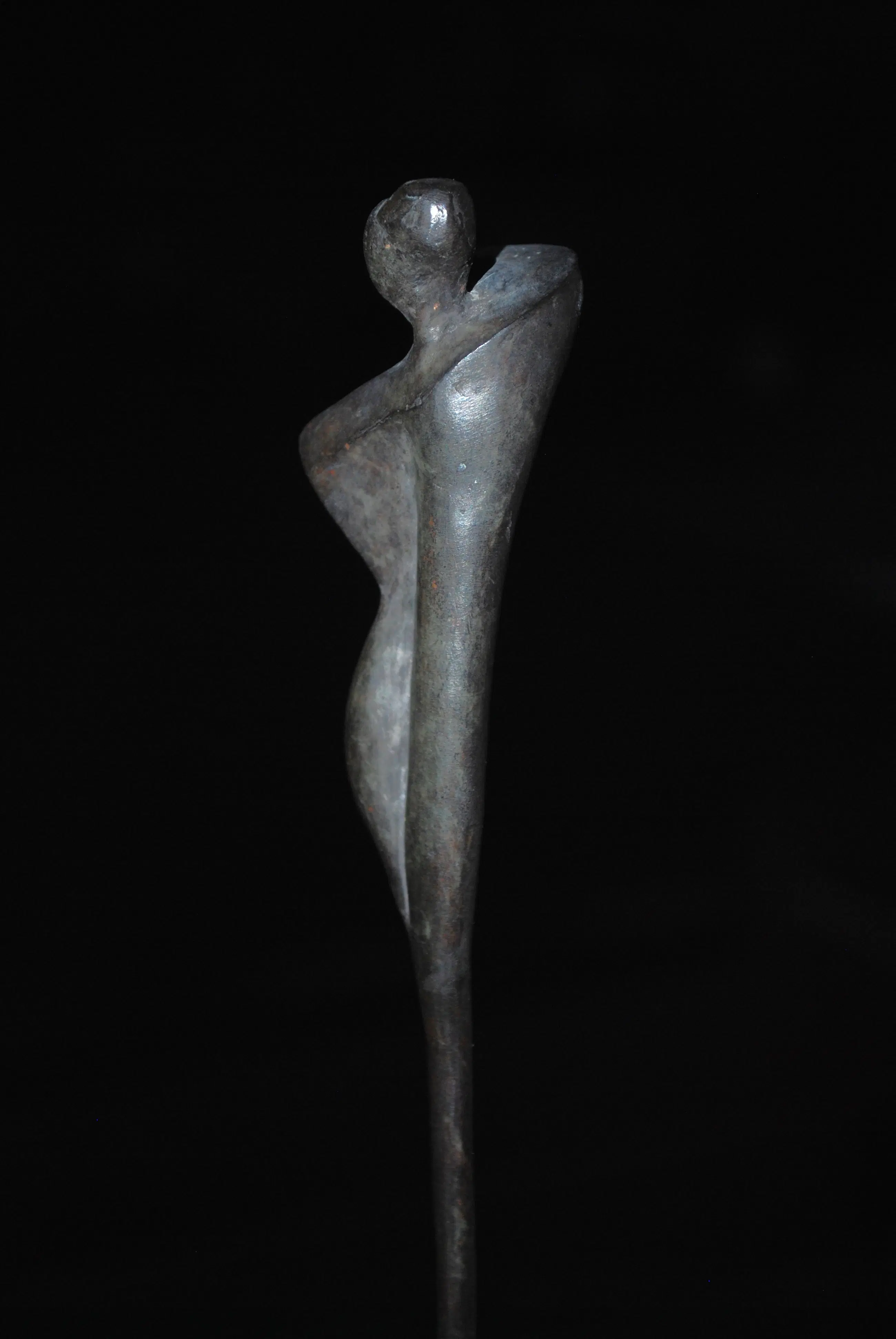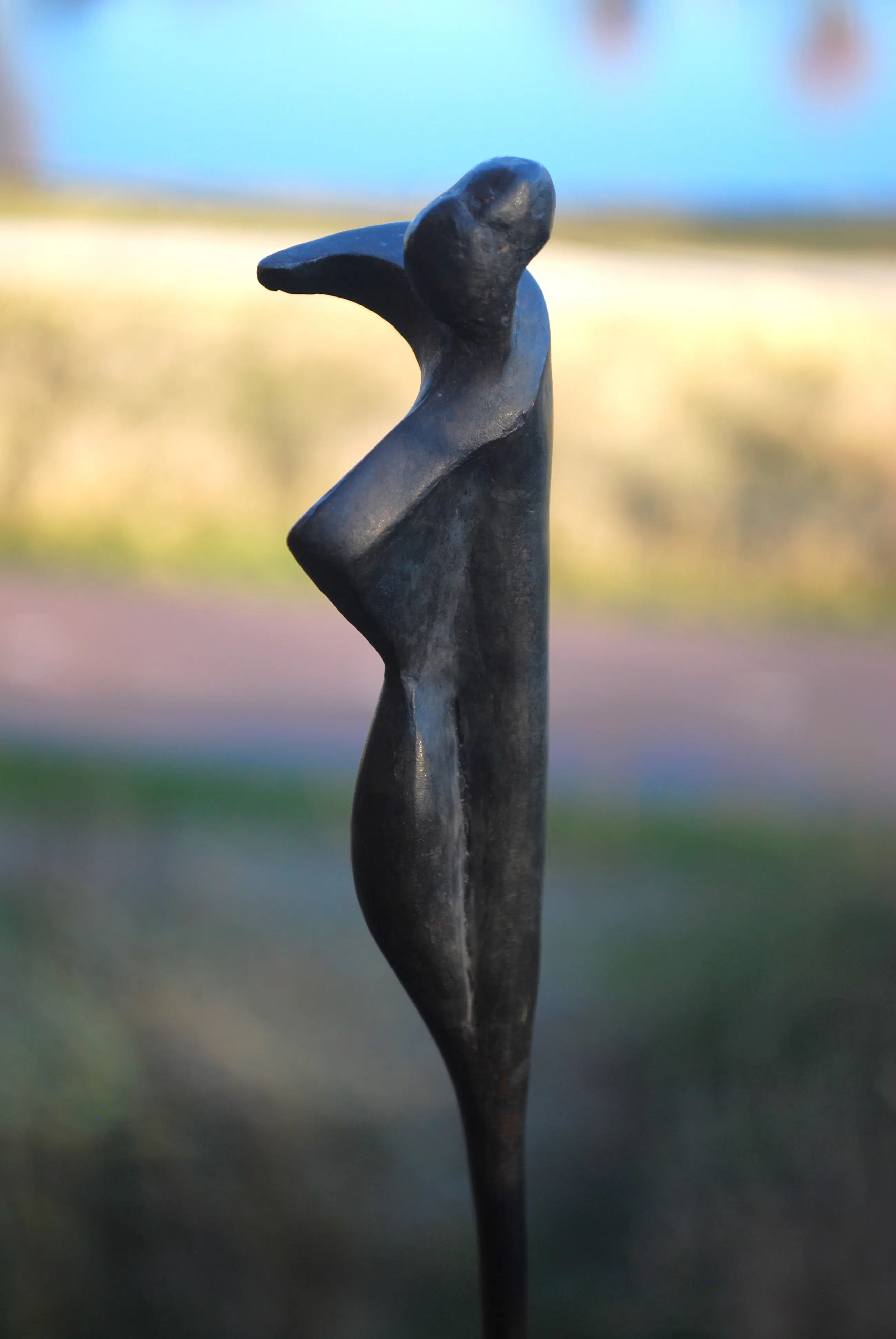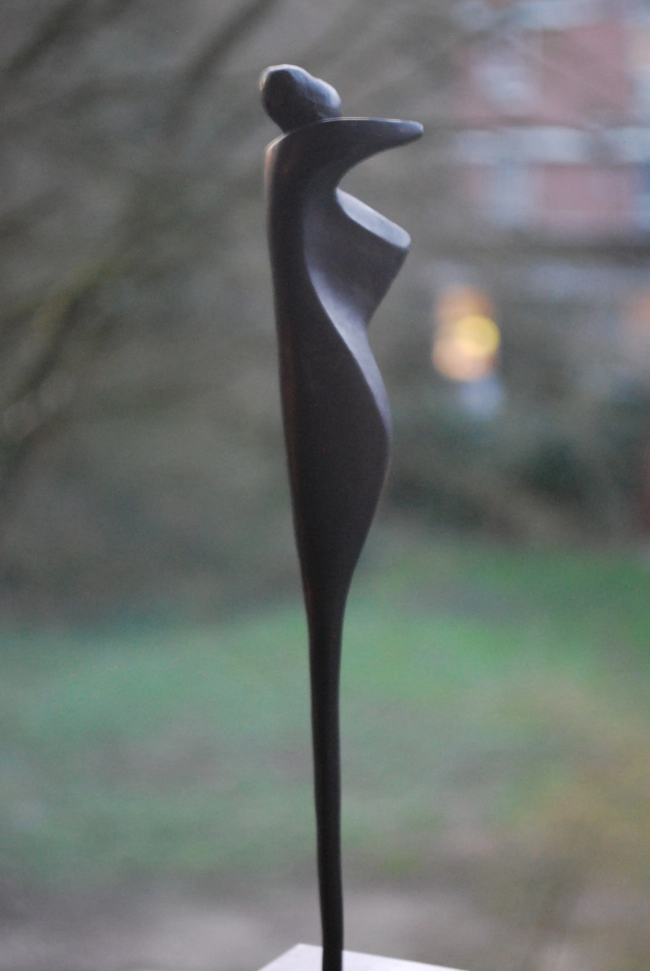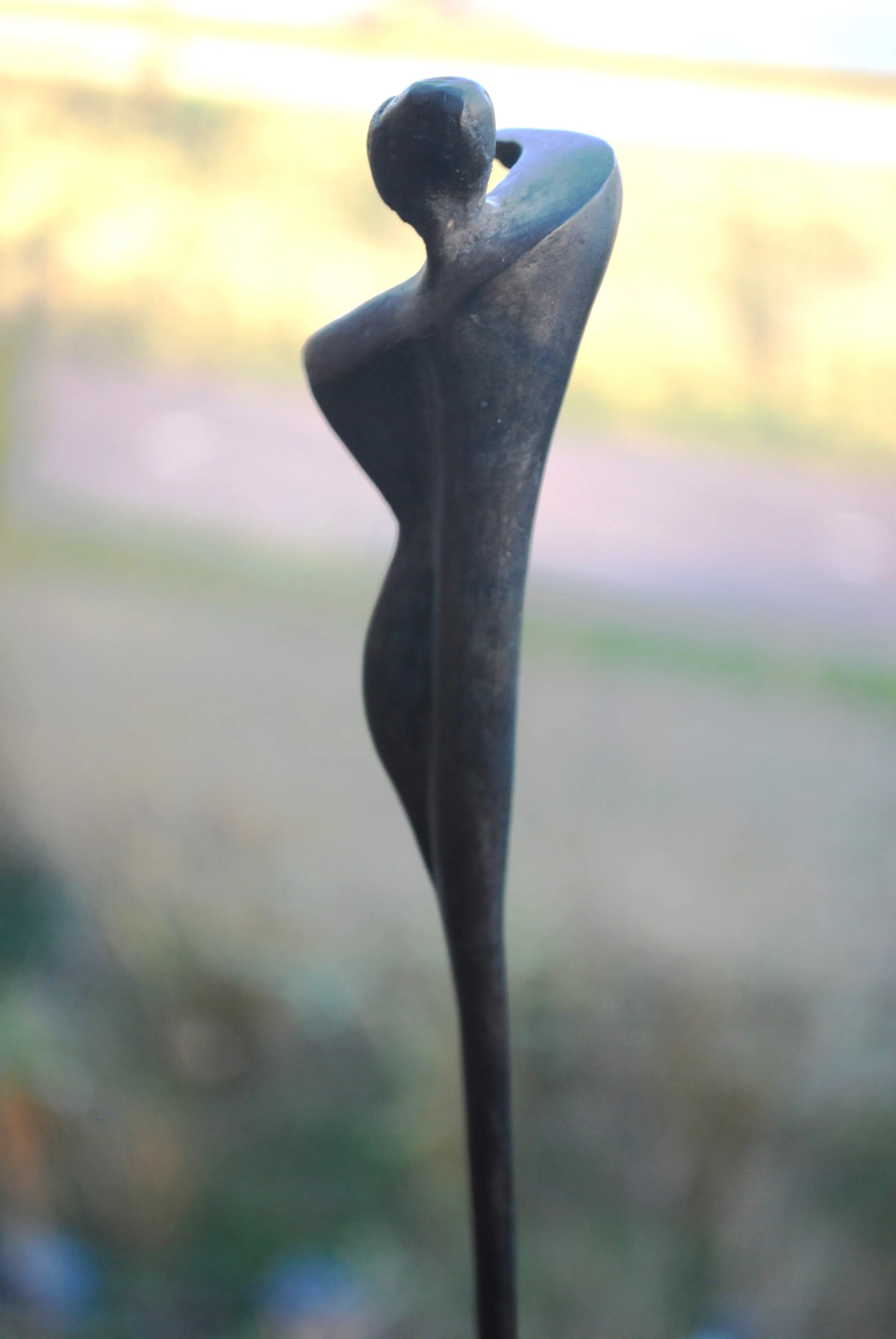 Fraai gestileerde figuur, een dansende vrouw. Onduidelijk gesigneerd onderaan, vlak boven de stenen sokkel.
