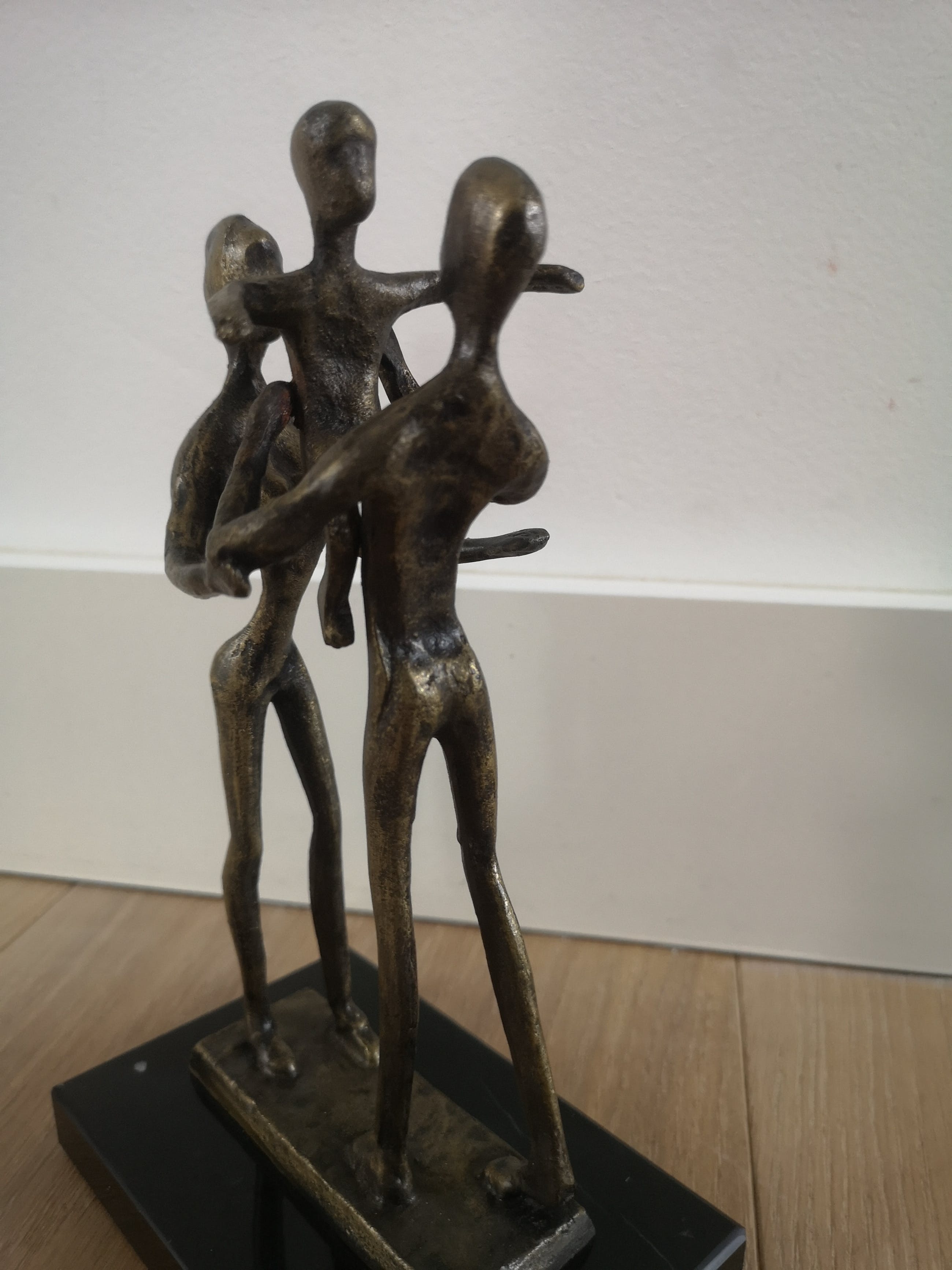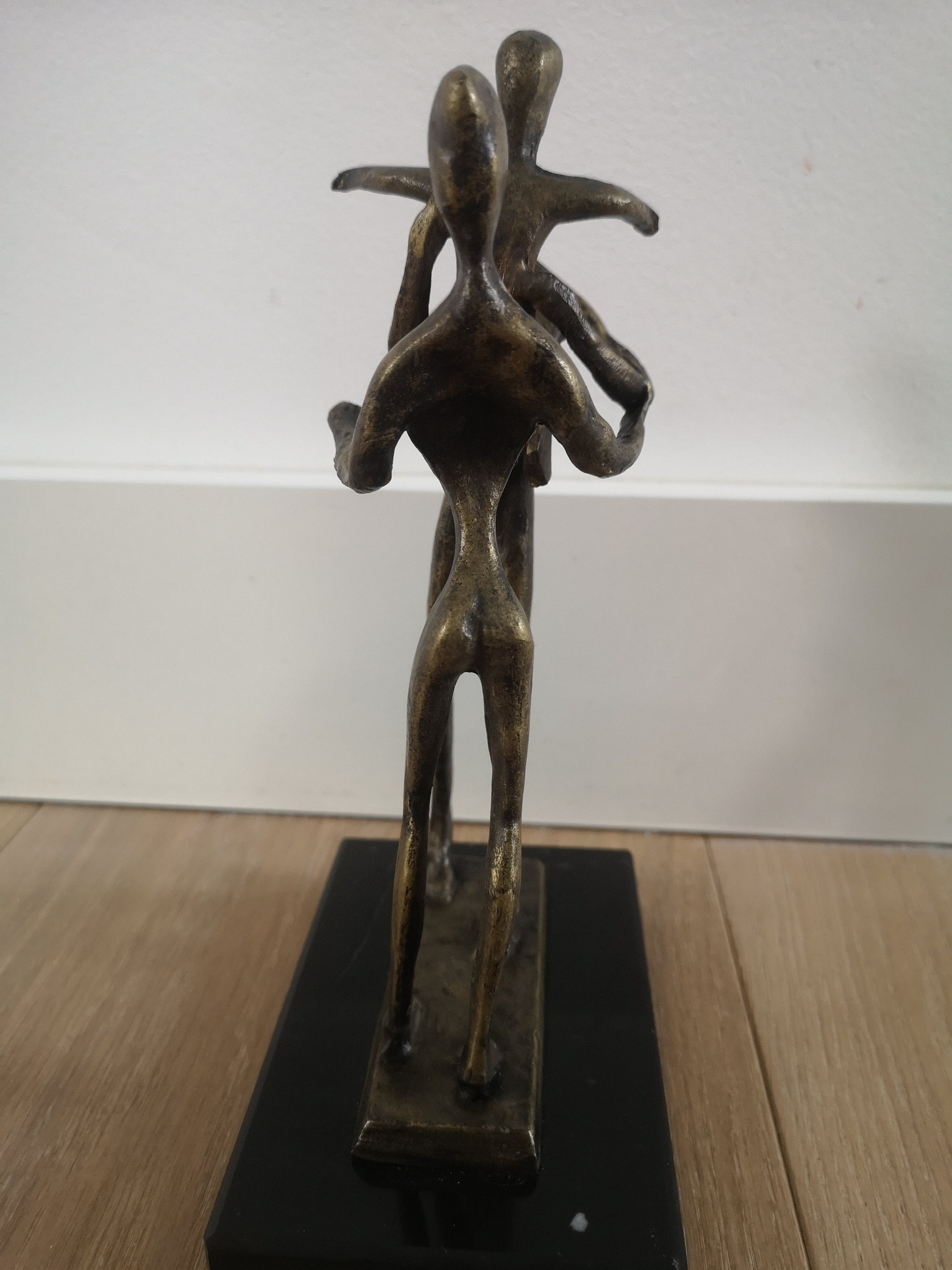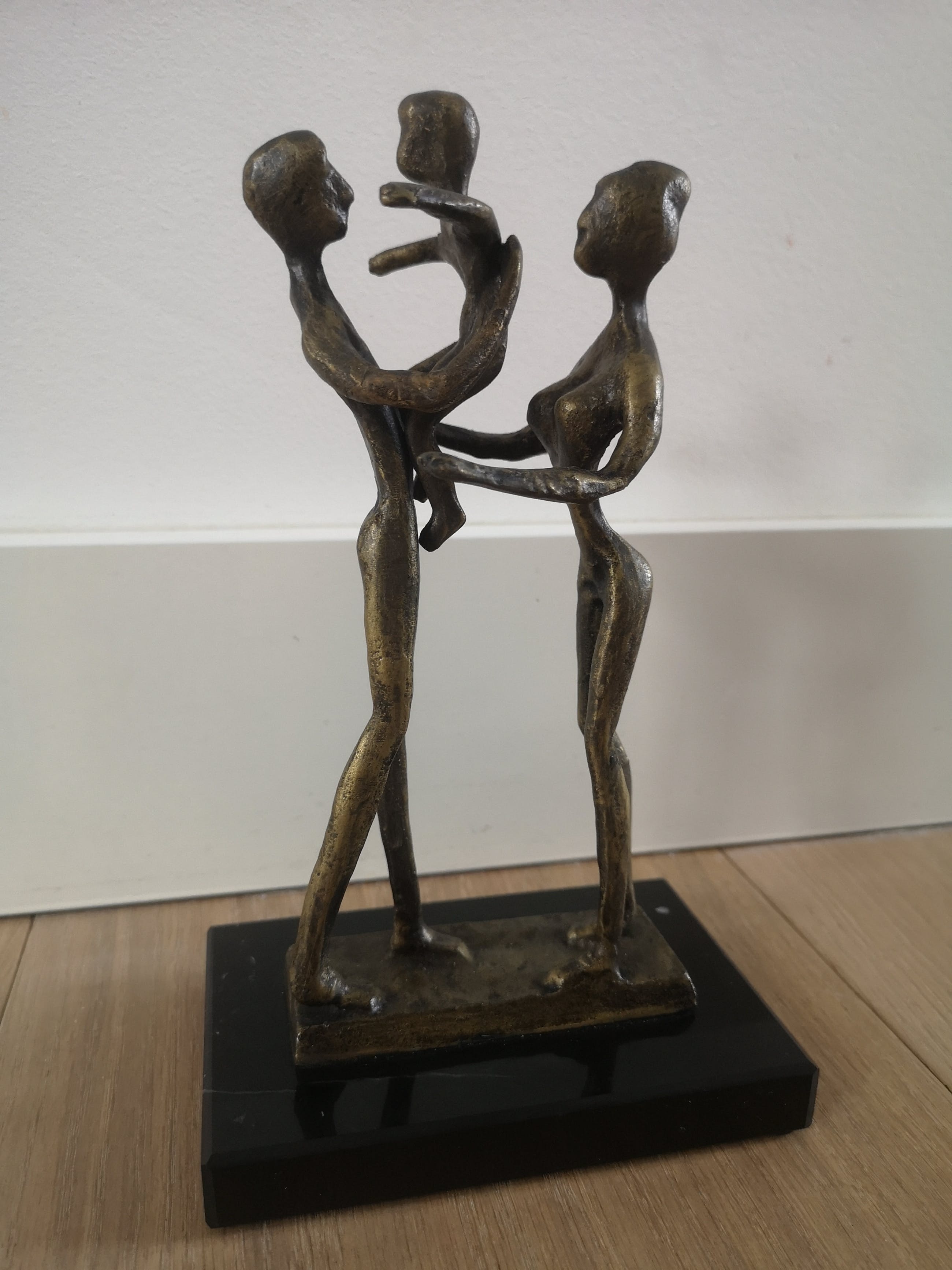 Erg mooi bronzen beeld van een man en vrouw welke gezamenlijk een kindje vasthouden. Beeld staat op een mooi marmeren voet. Hoogte van de marmeren voet is 2cm.