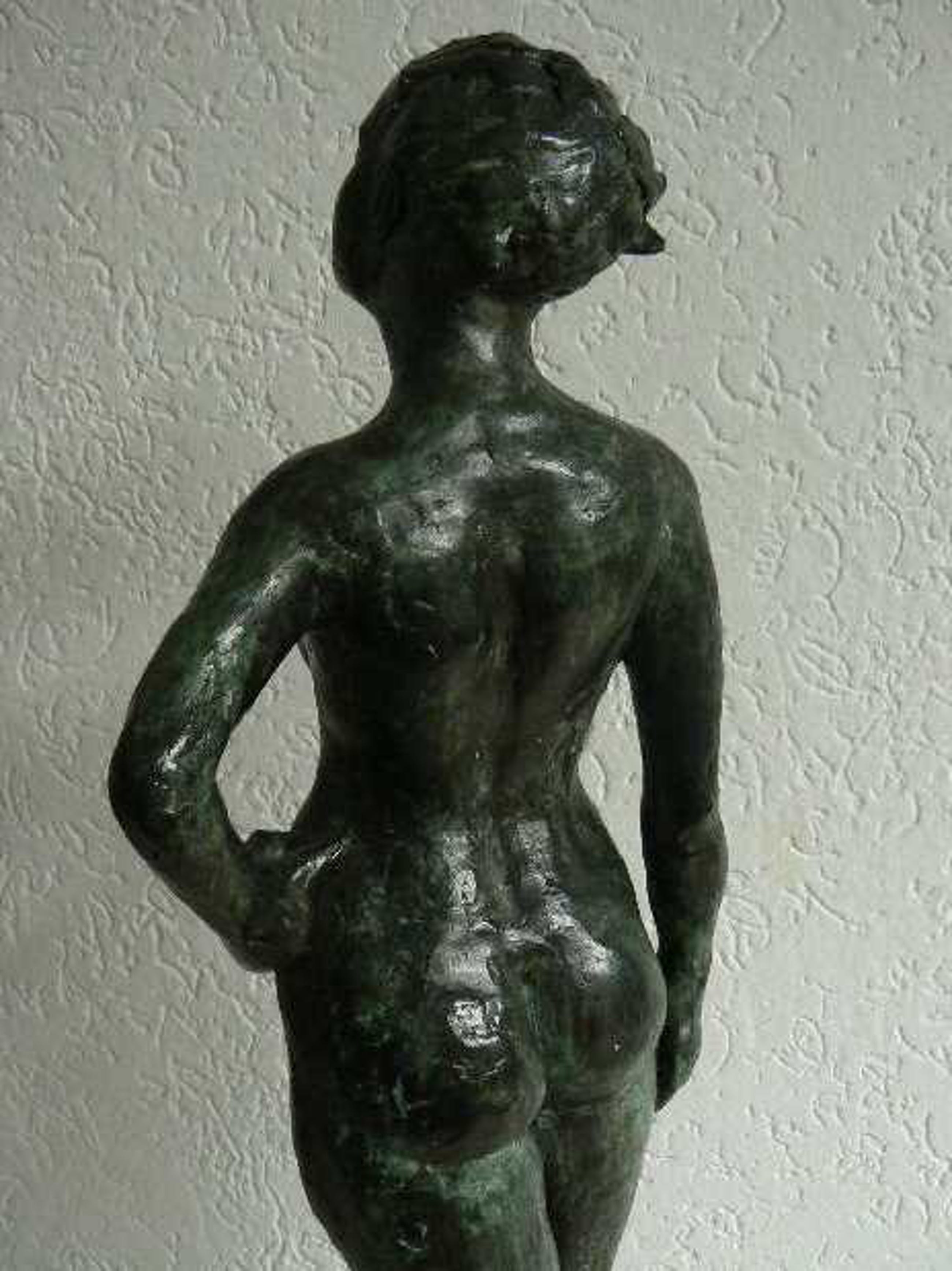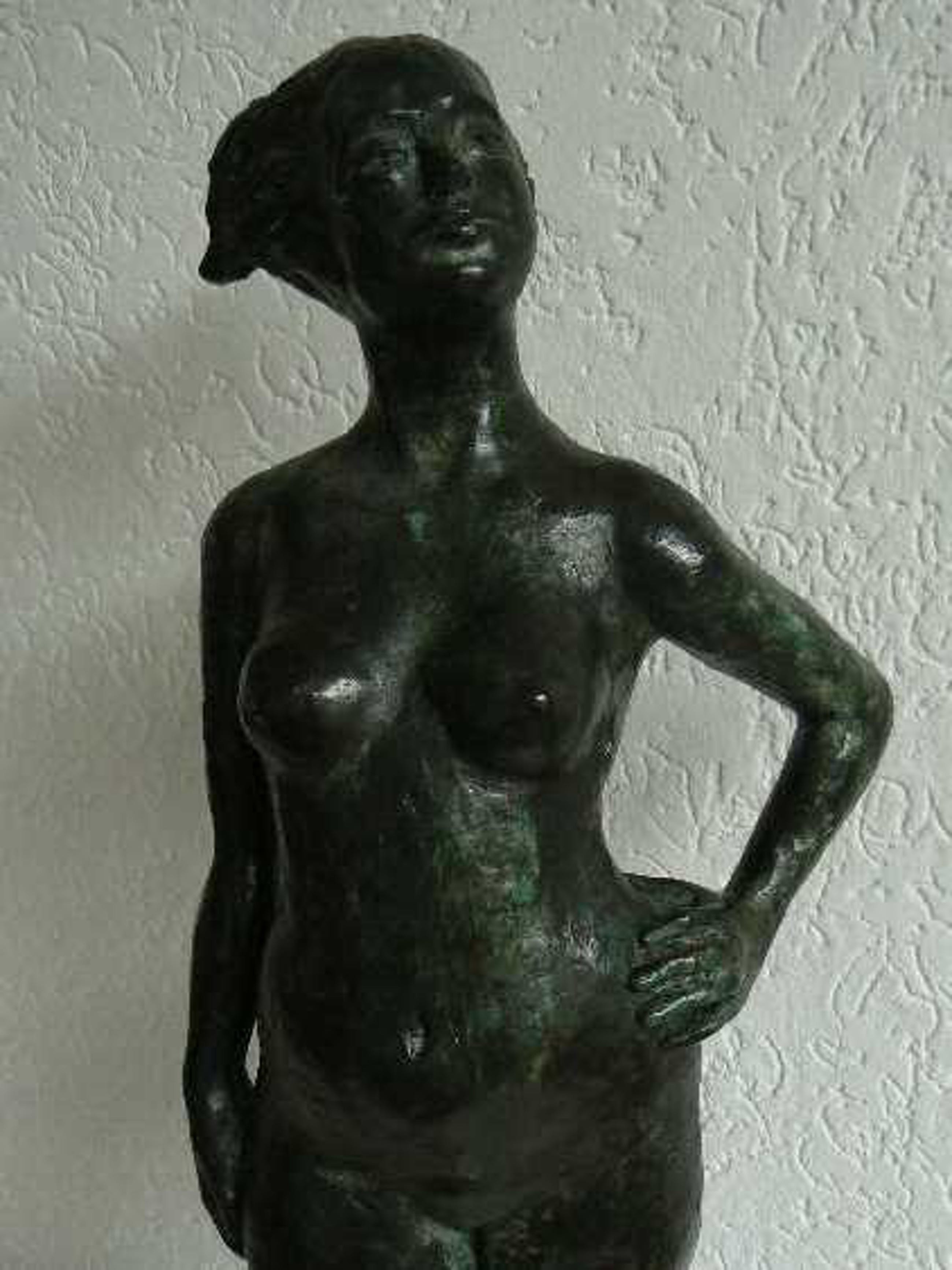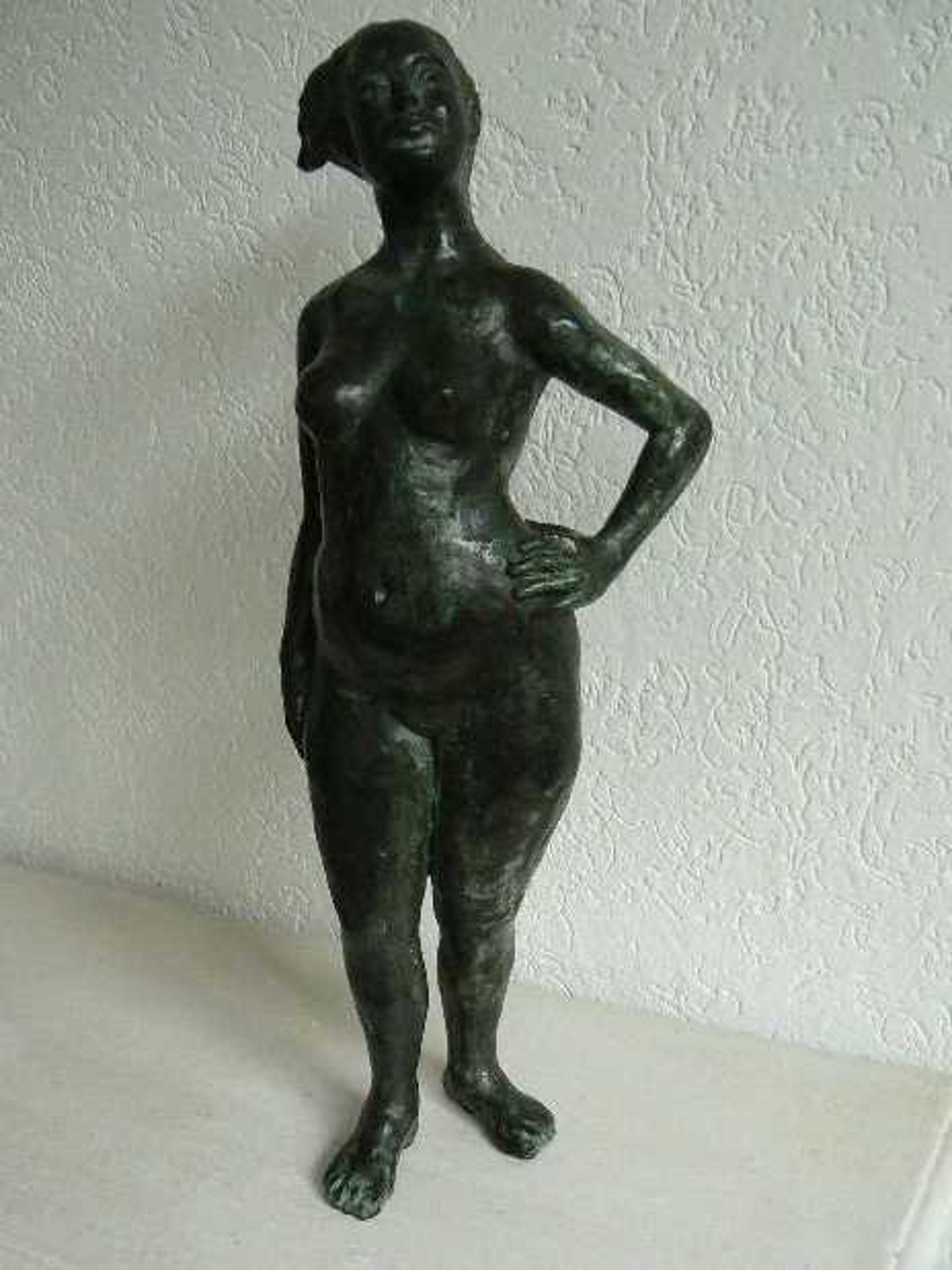 Brons naakt werk genaamd Pomoda gemaakt door Joke van der Mijle ( Dordrecht).Een zwaar beeld van ongeveer 15 kg gegoten door Myron waar maar 1 van gemaakt is dus uniek!Kan op een sokkel geplaatst worden, ( bijv voor tuin ornament) door dat er 4 schroef gaten aanwezig zijn aan de onderzijde.
