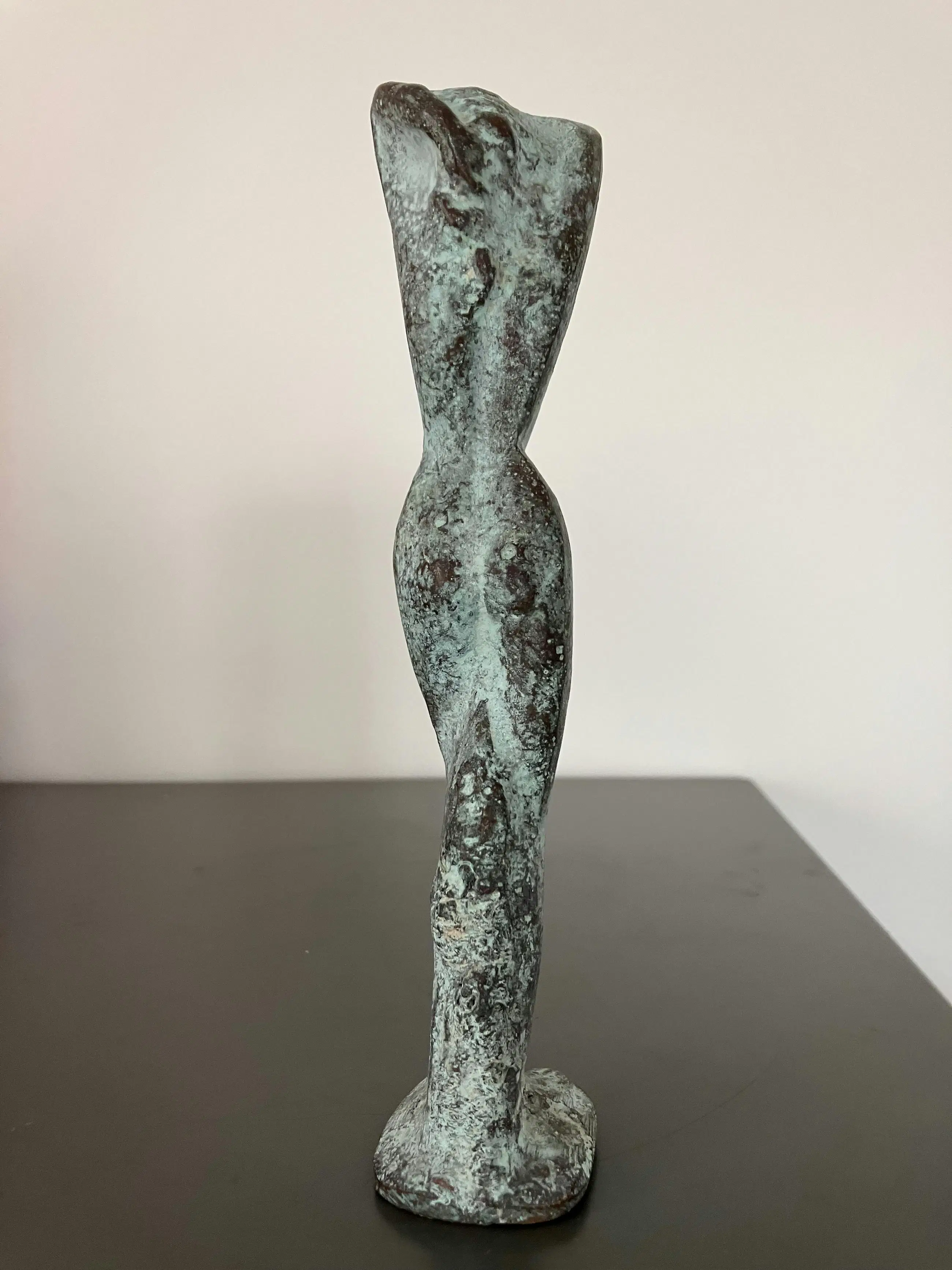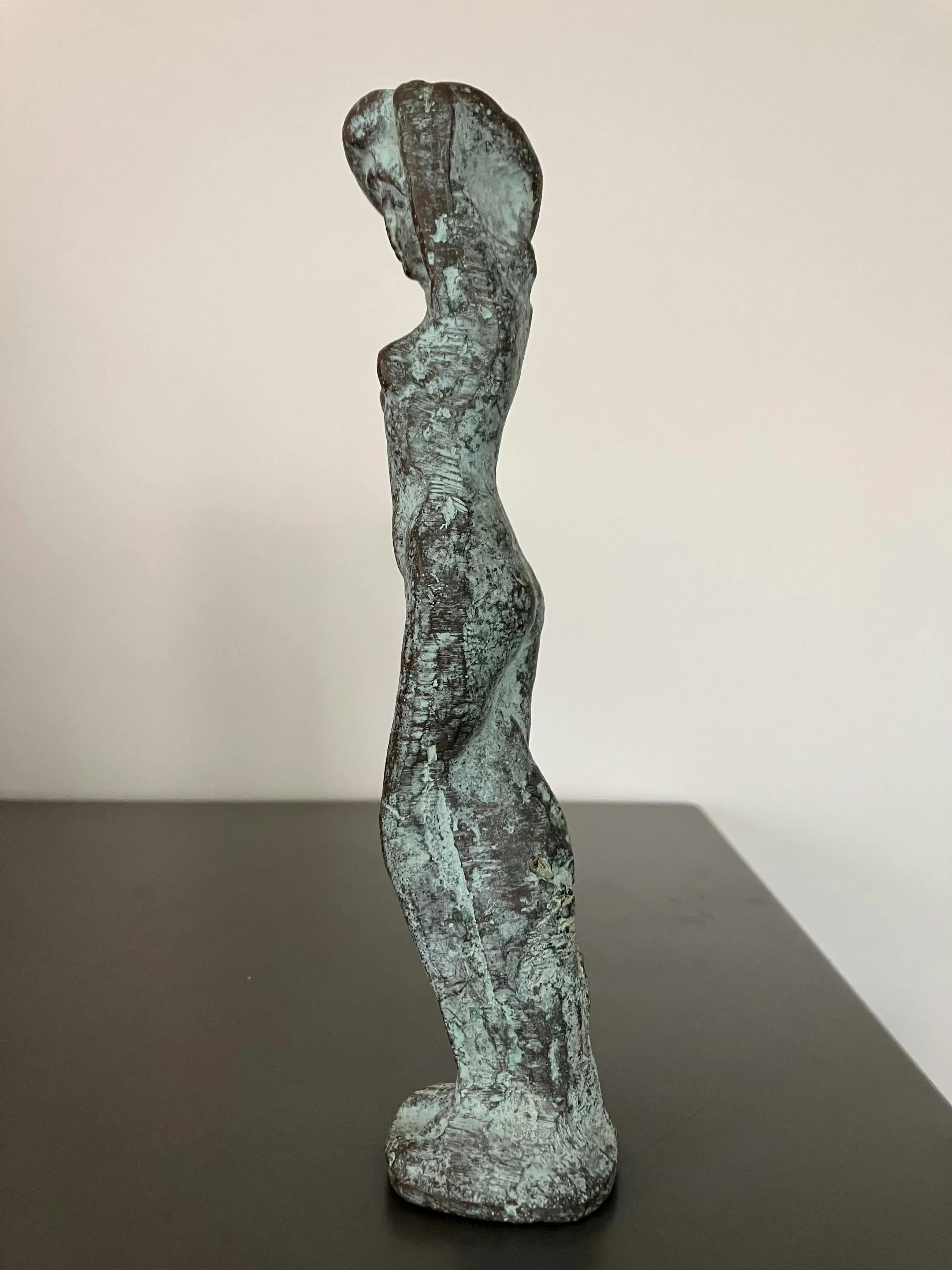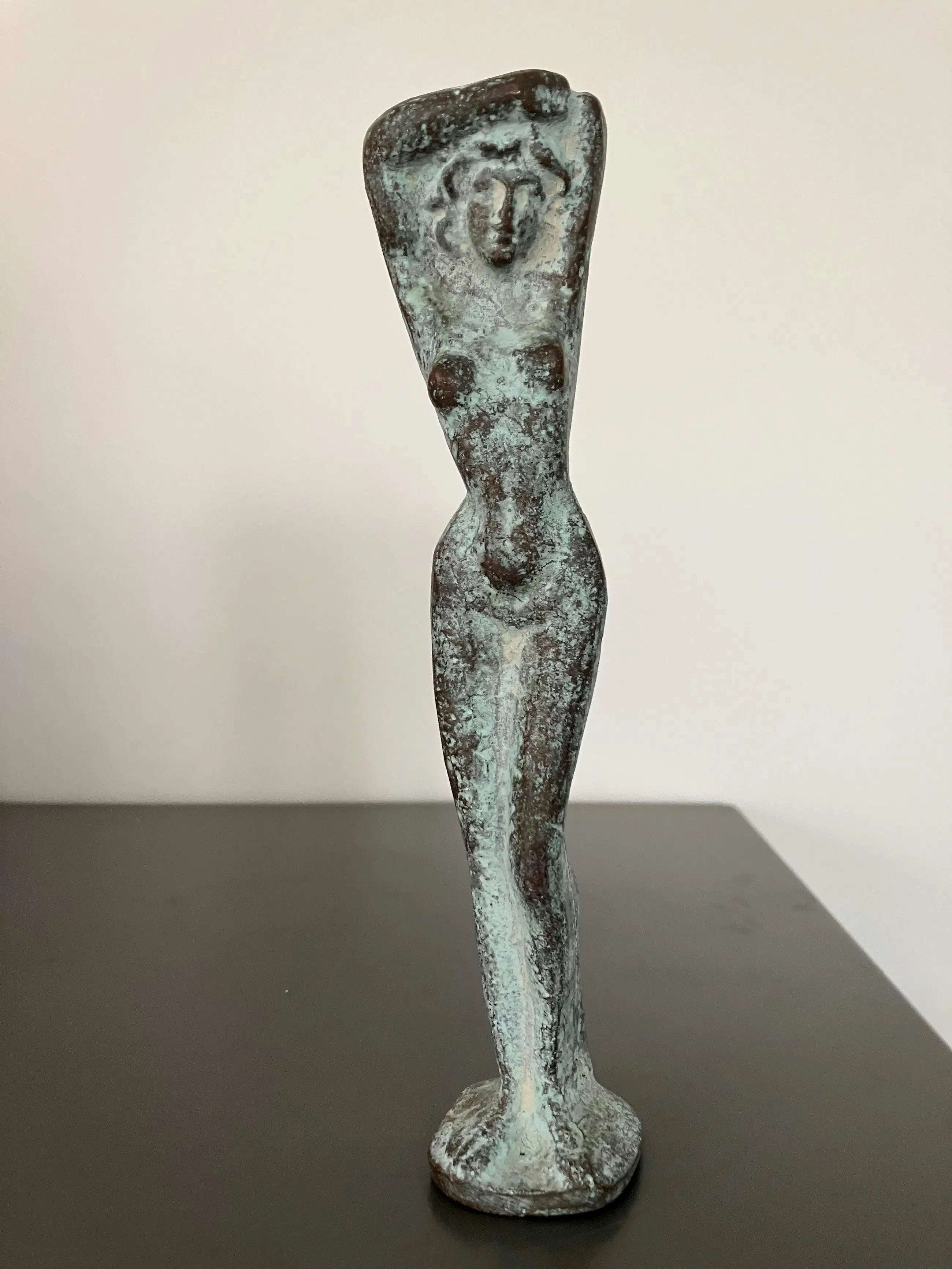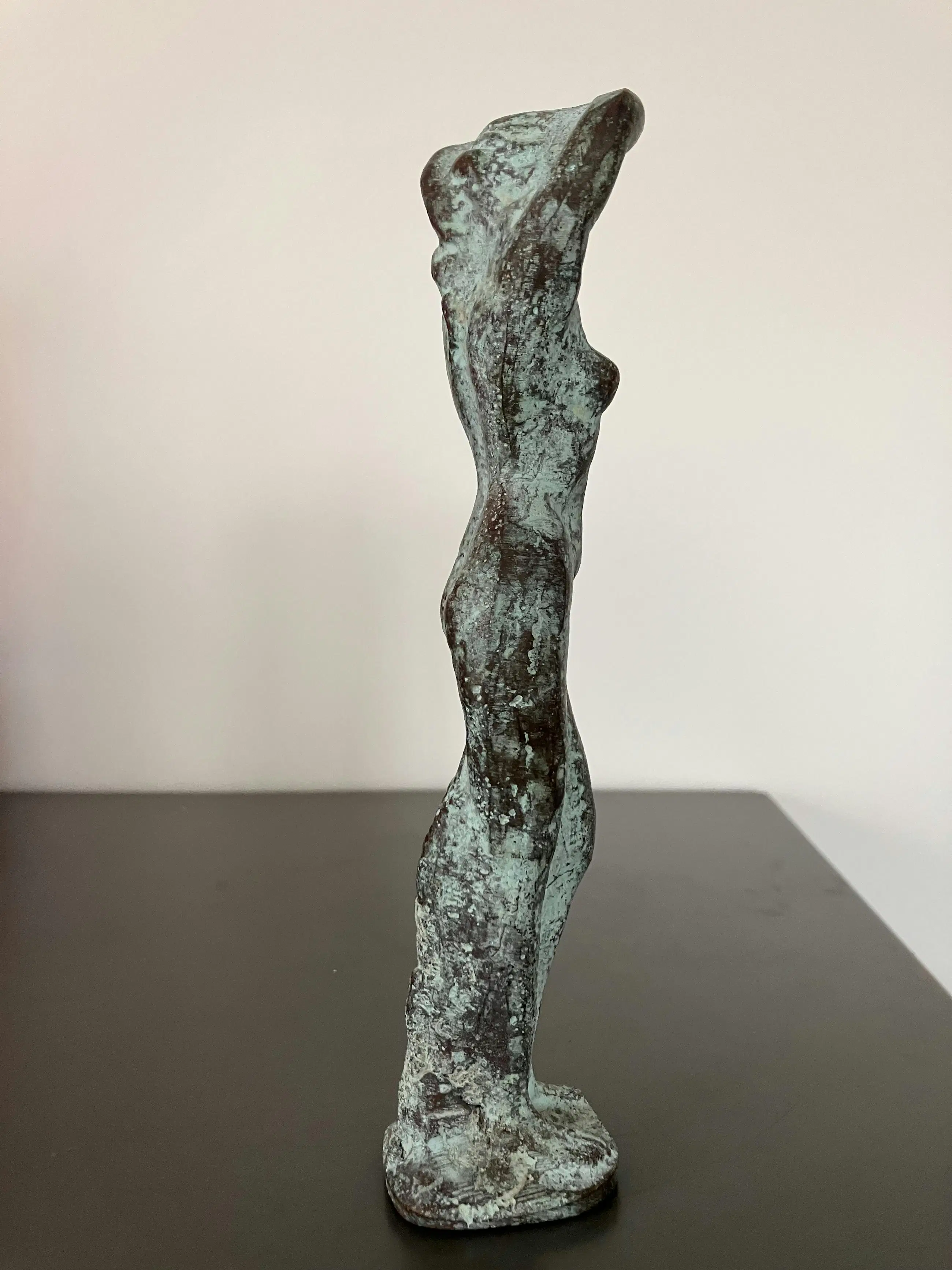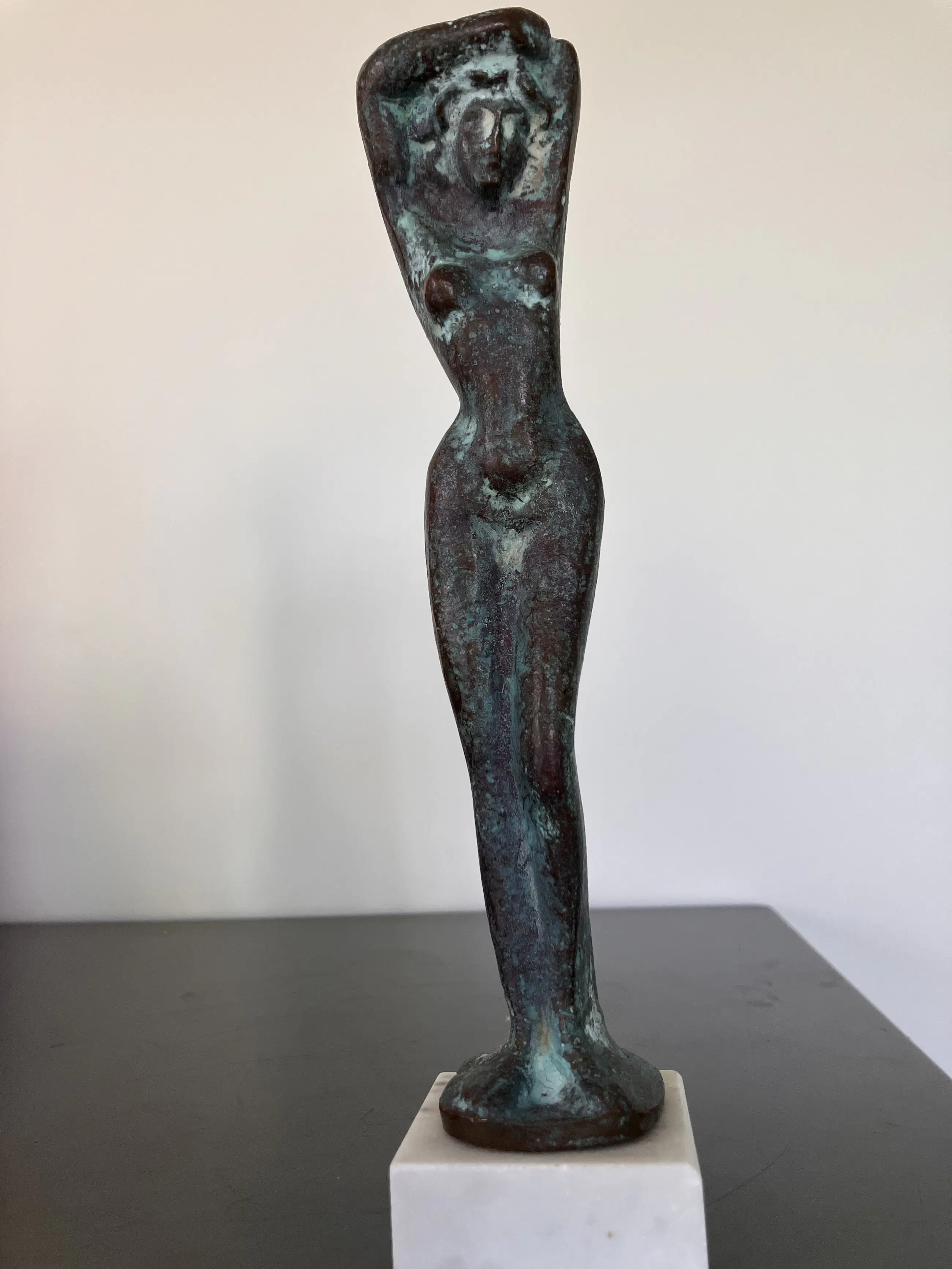 Massief beeldje van staande jonge vrouw met haar armen boven het hoofd
