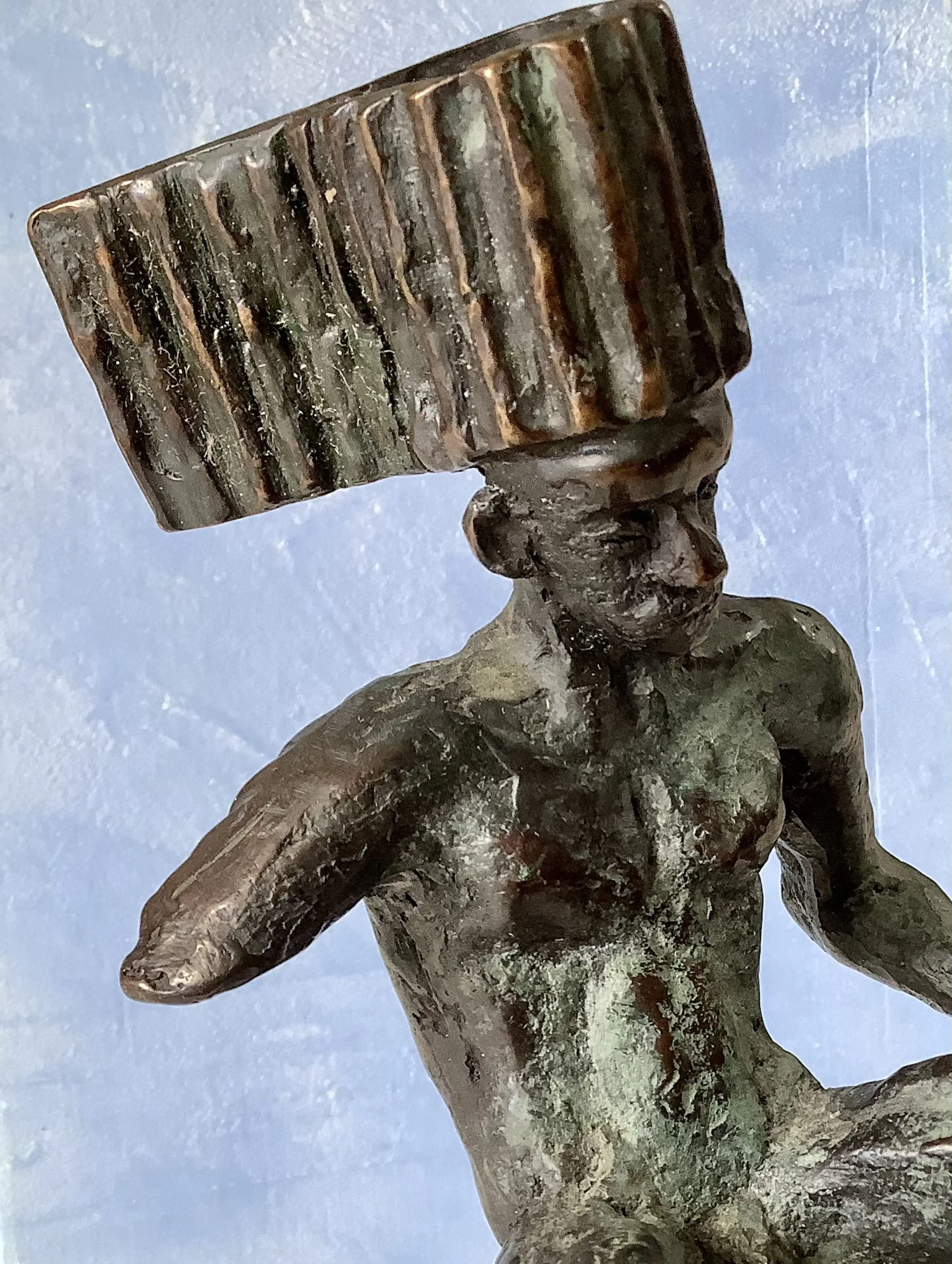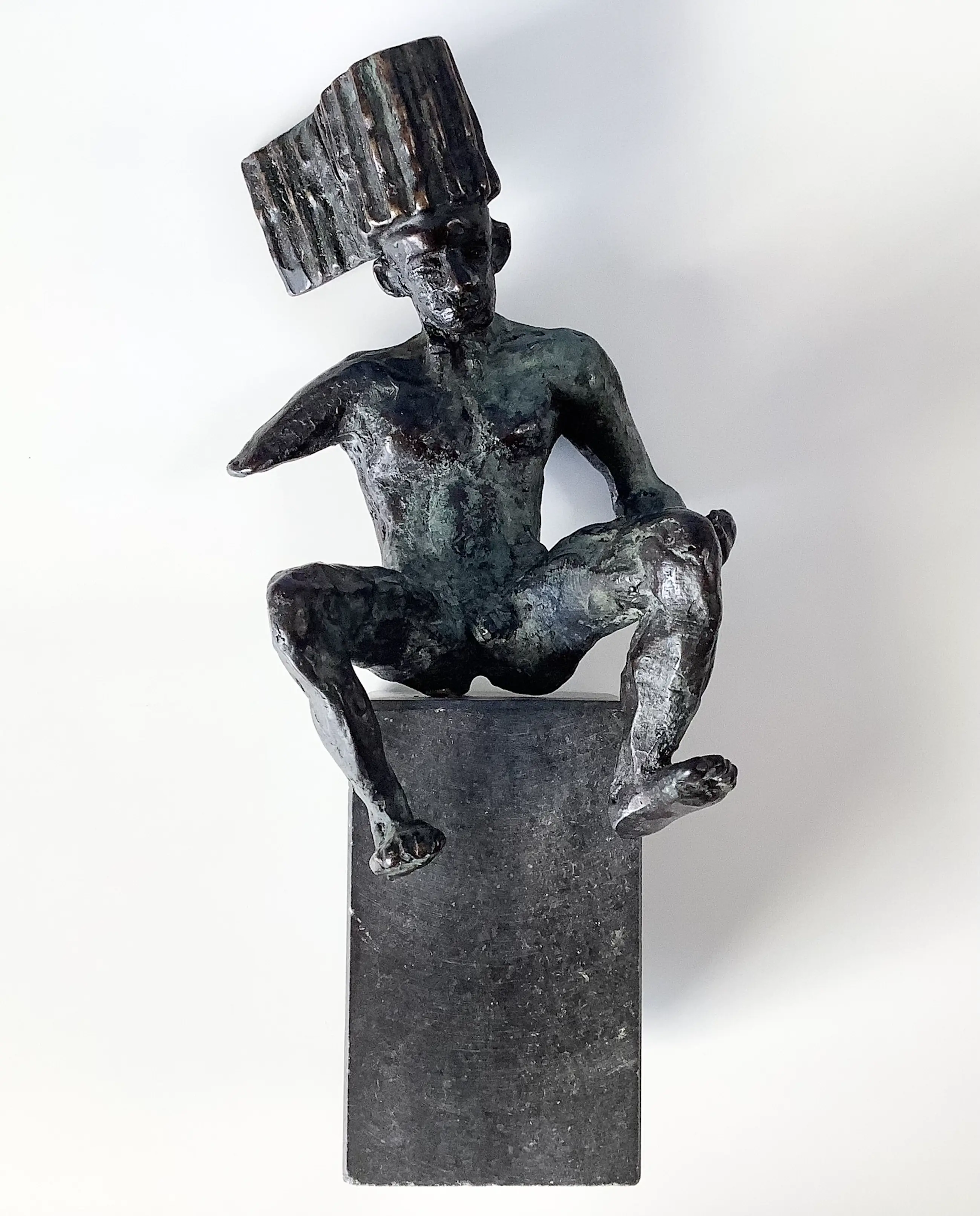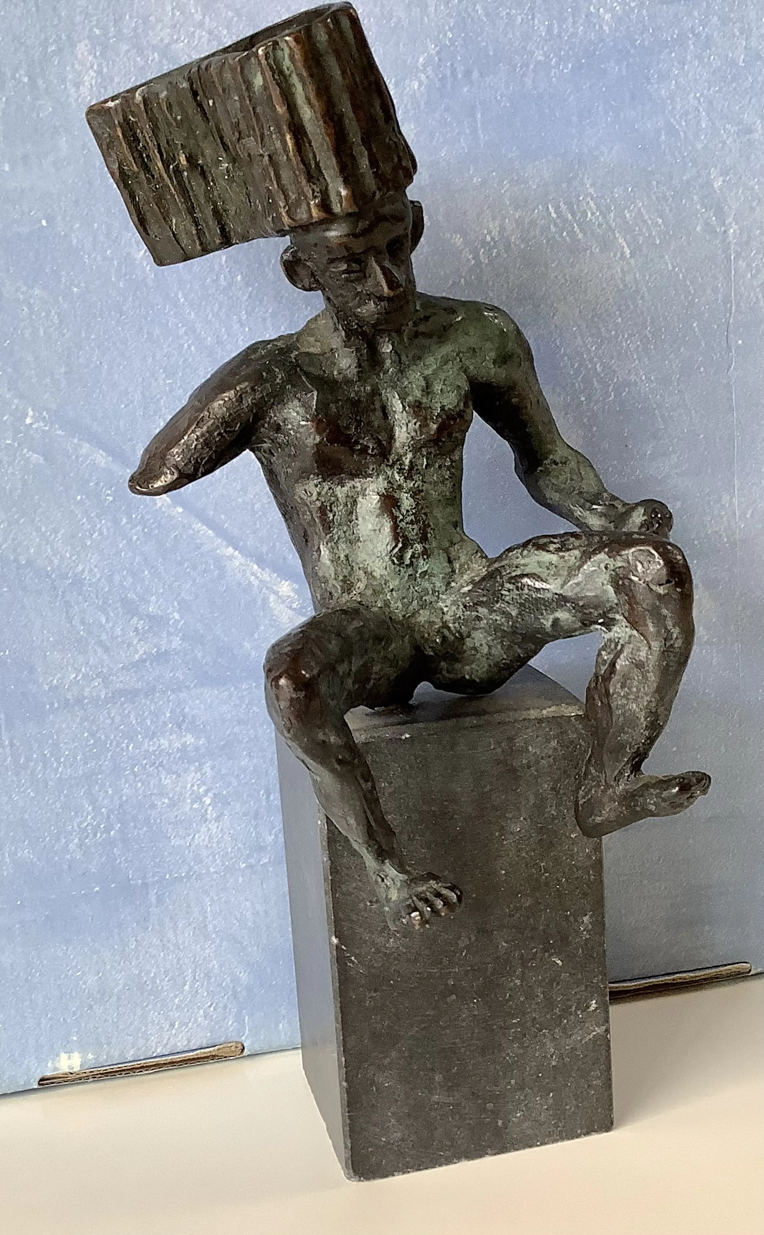 Intrigerende bronzen man met vleugel en bijzonder hoofddeksel. Massief brons op natuursteen sokkel. Hoogte figuur 17 cm.