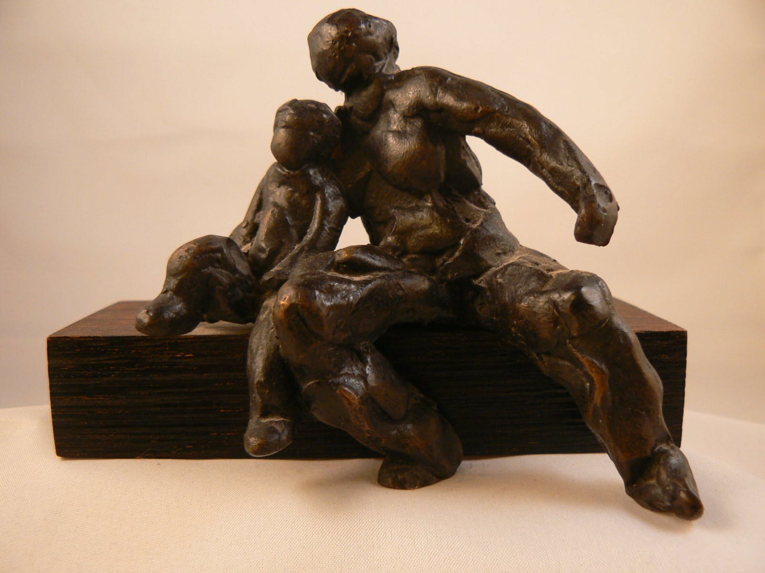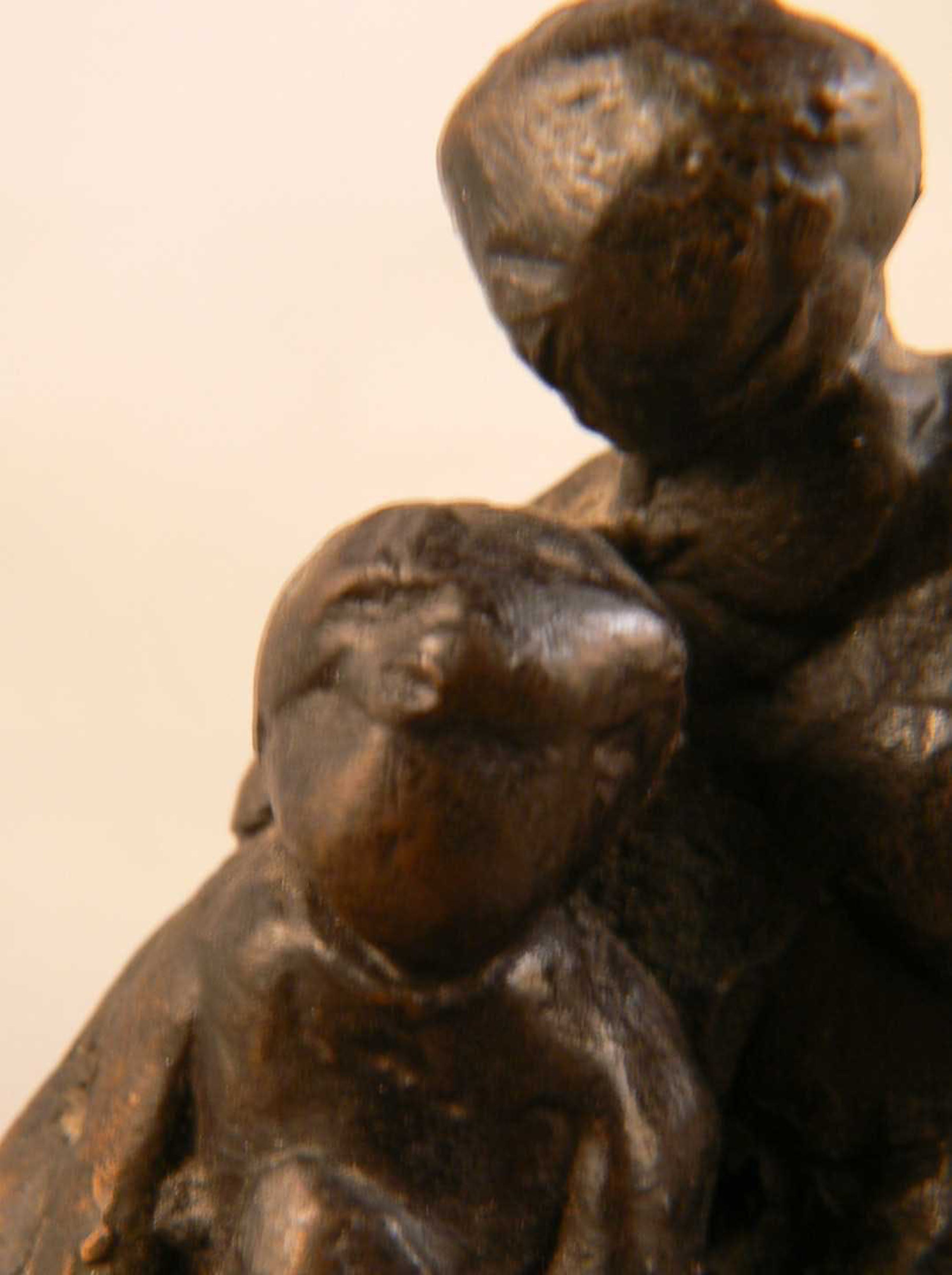 Bronzen sculptuur op houten sokkel.Aandoenlijke voorstelling van een moeder en kind. Kunstenaar onbekend. 9,5 cm hoog 9 cm breed 13 cm lang 640 gram