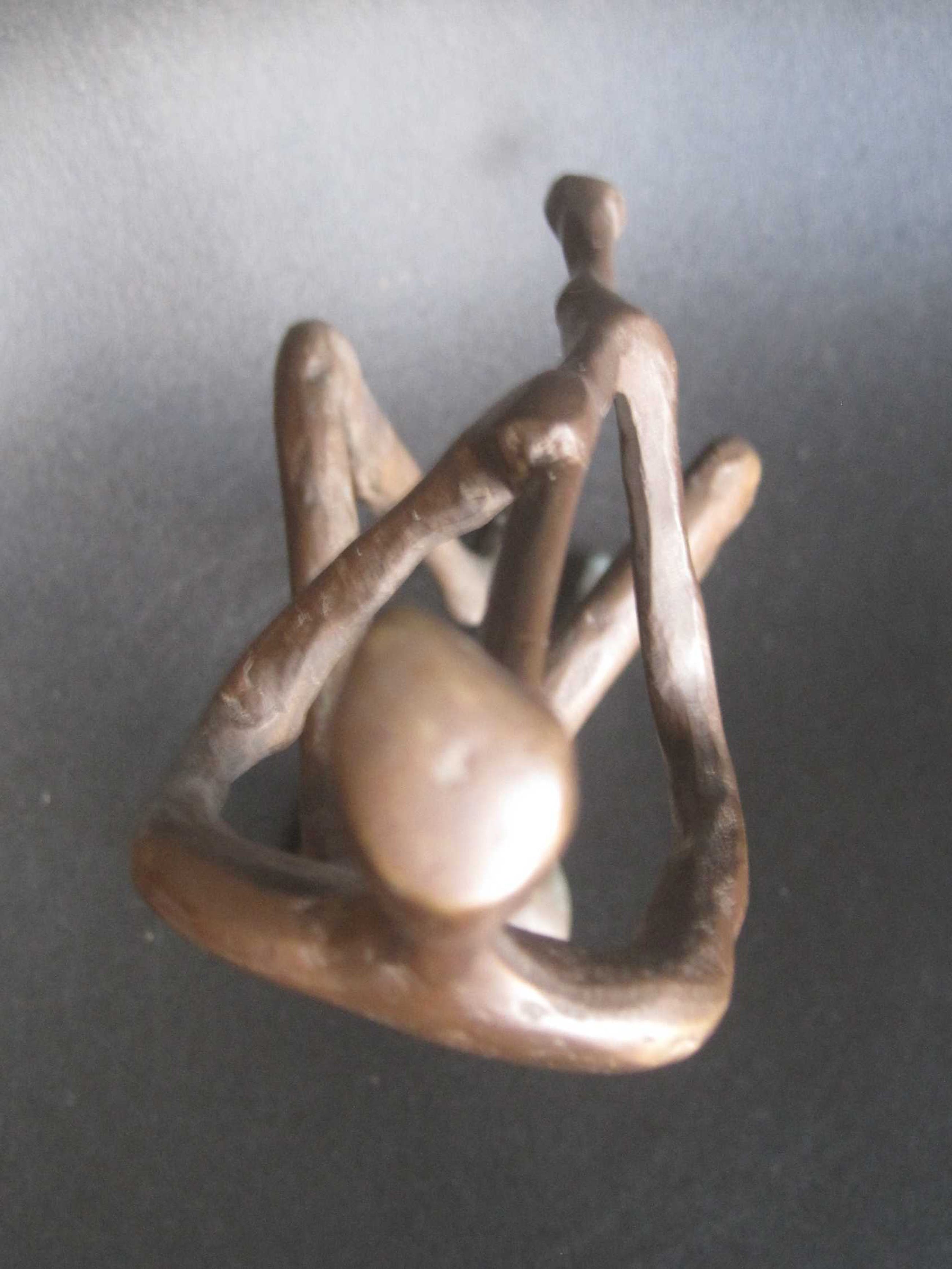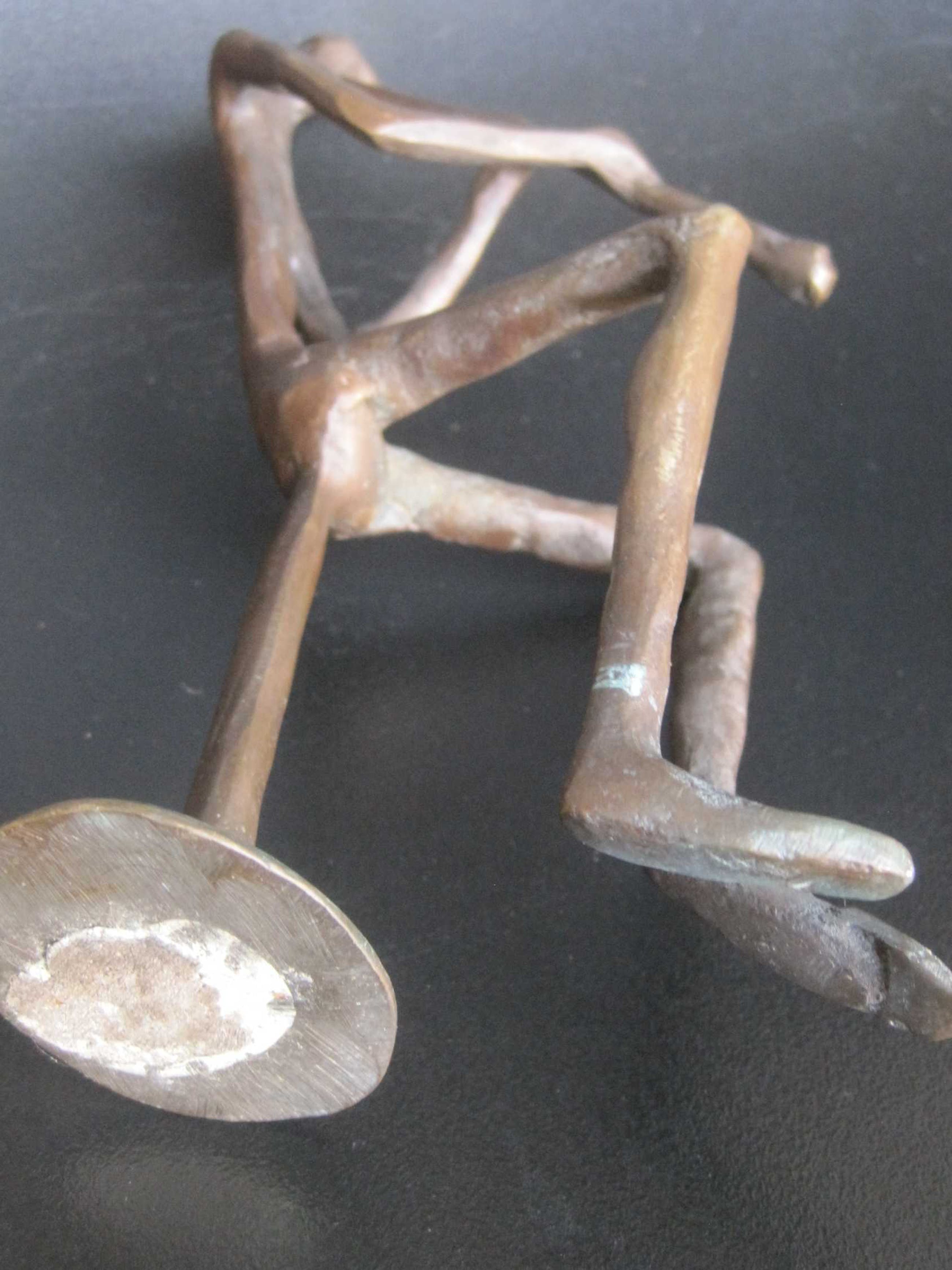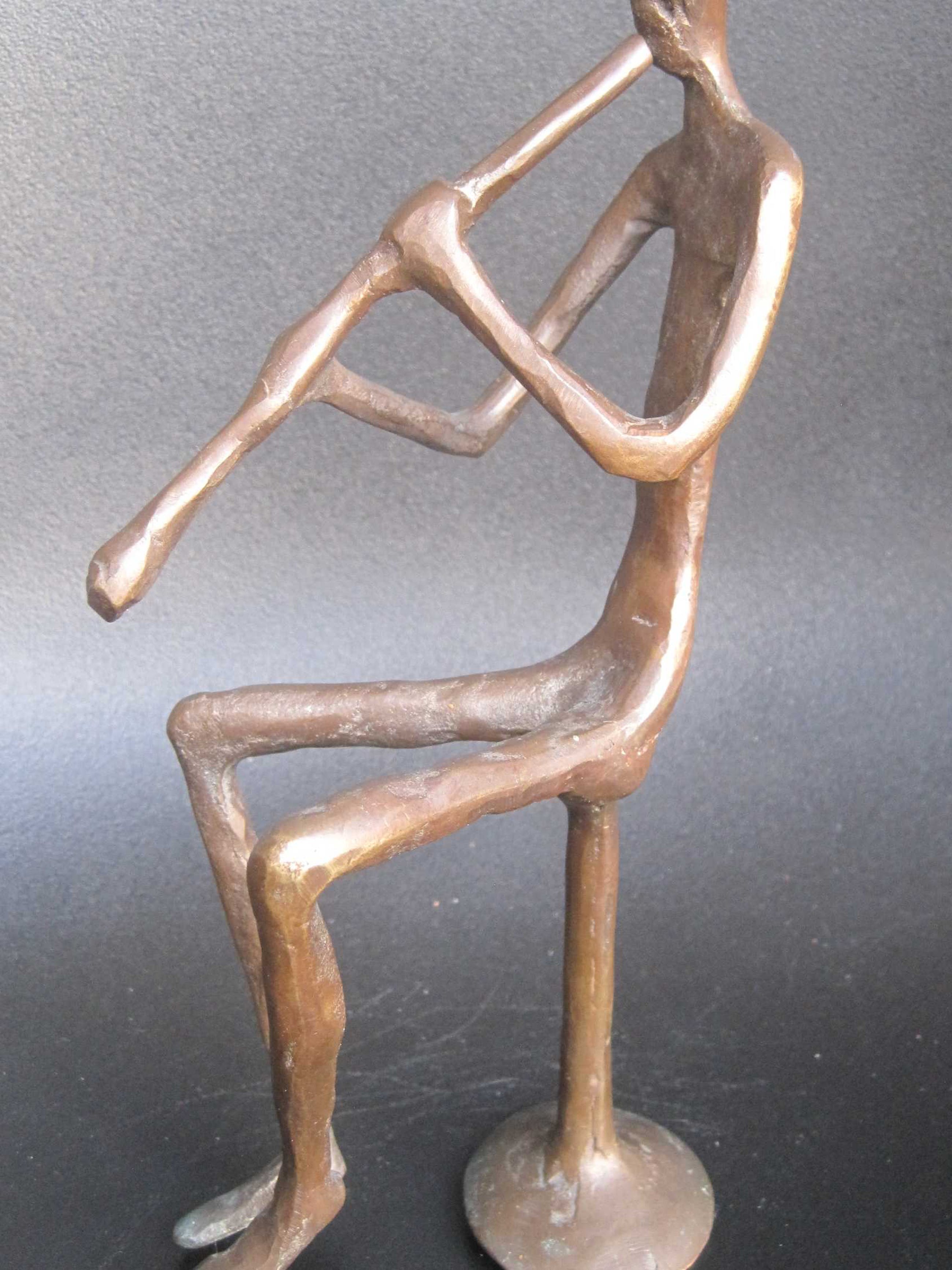 Abstract bronzen beeldje van een muzikant, die waarschijnlijk een klarinet bespeeld.