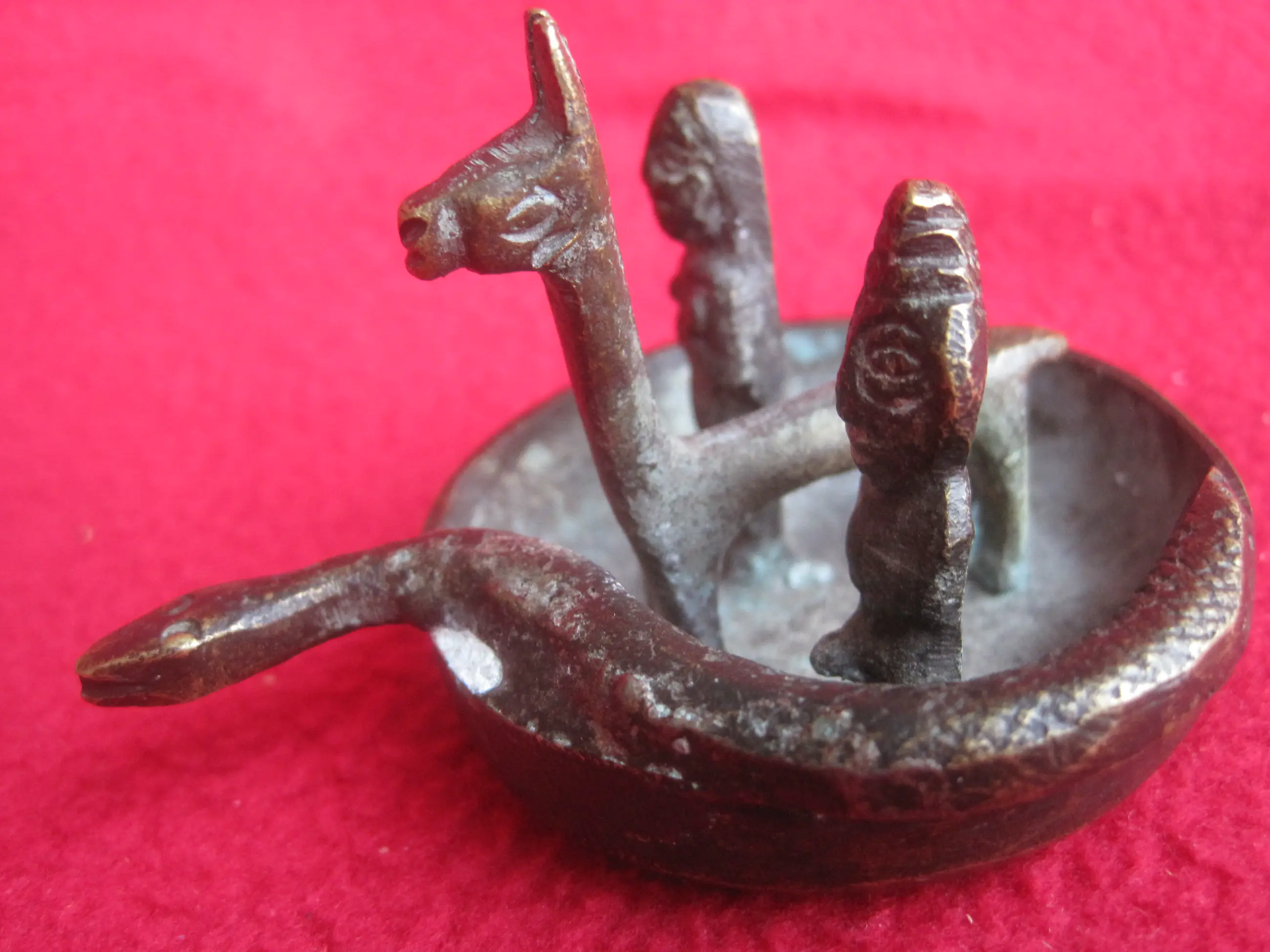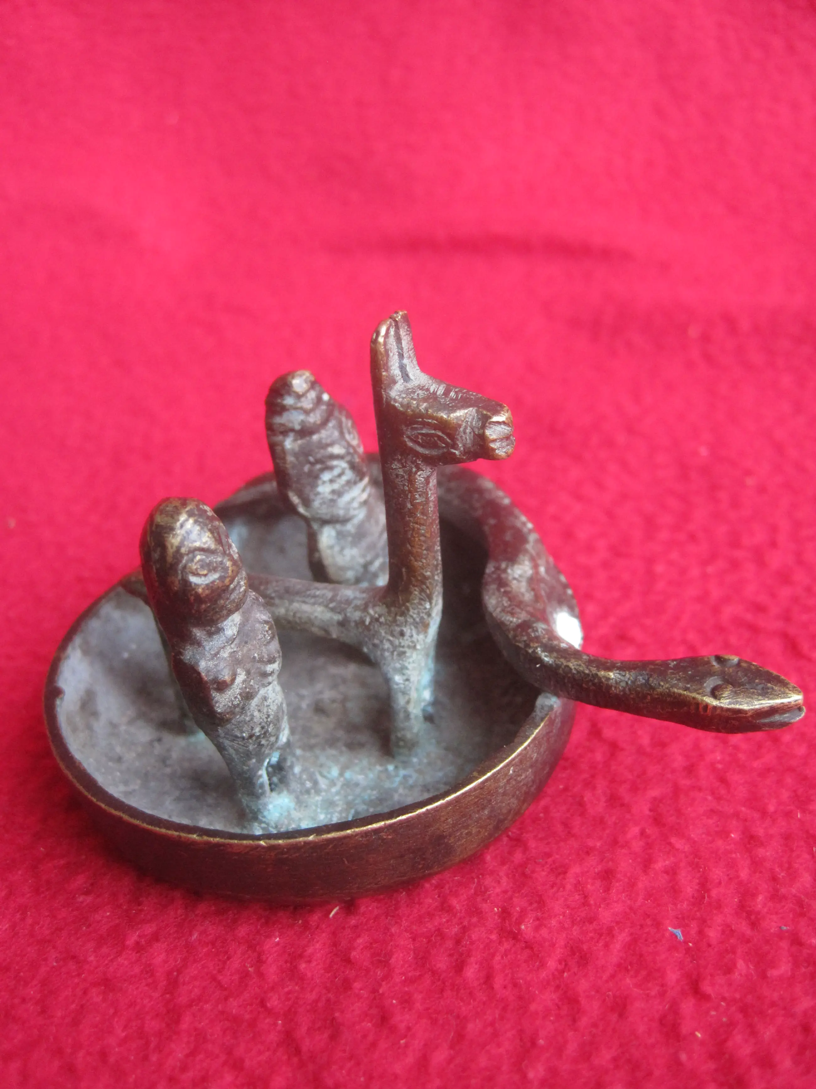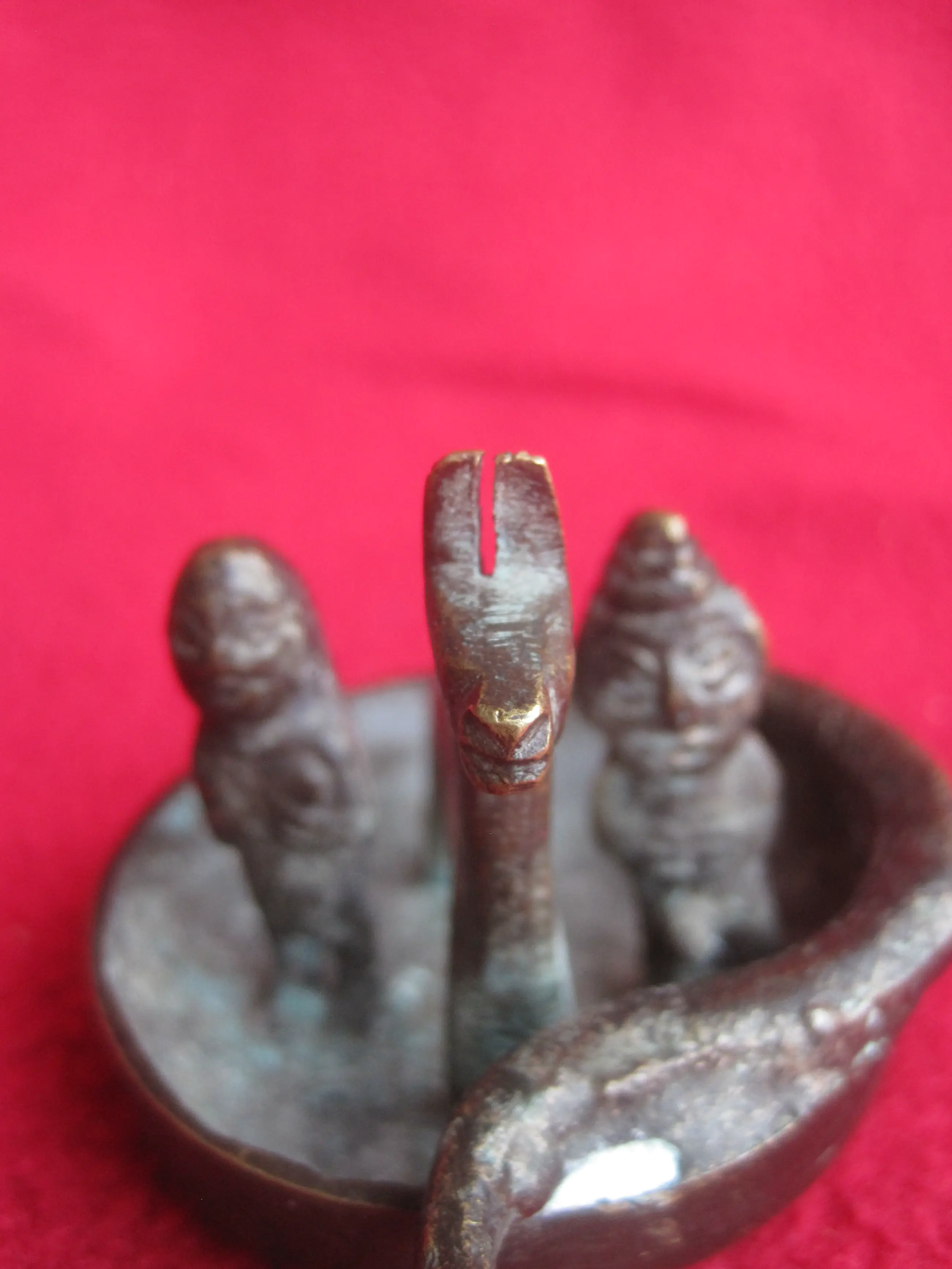 Ee bijzonder bakje met 4 figuren waarvan ik de betekenis niet weet. Ik zie een rond bootje met 4 figuren: Een slang, een lama en een man en vrouw. Het doet voor mij Zuid Amerikaans aan, vooral door de lama. Ik denk dat het een beeldje is wat geofferd kan worden ter gelegenheid van het een of ander. Als iemand het weet, hoor ik dat graag.