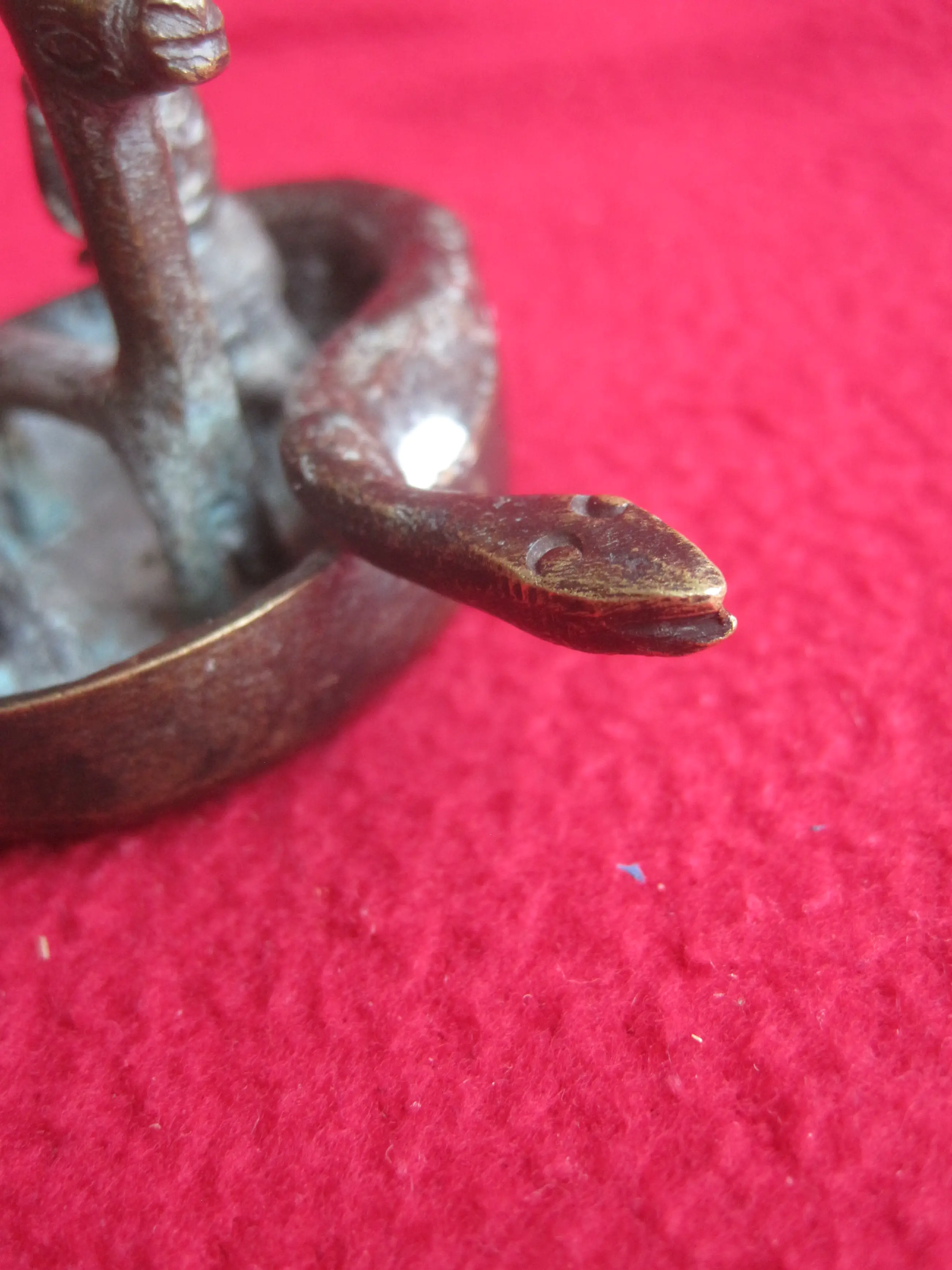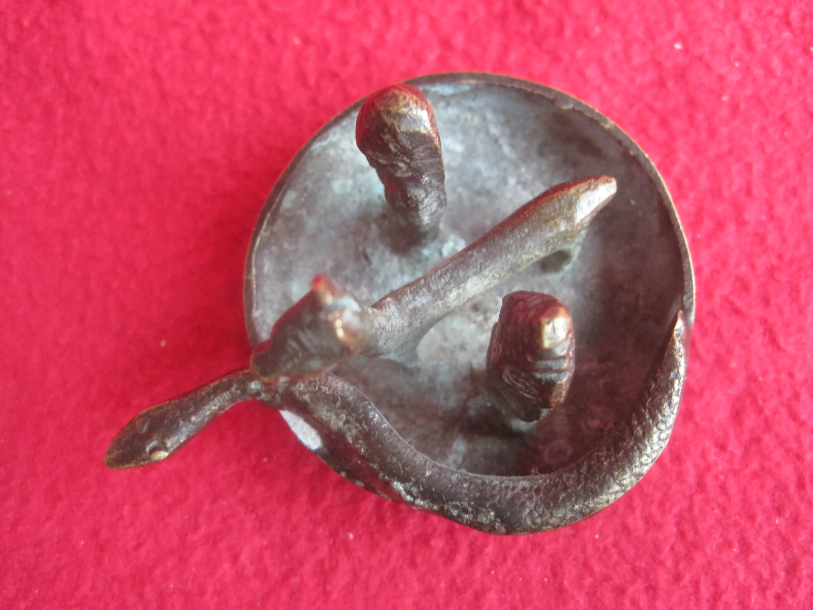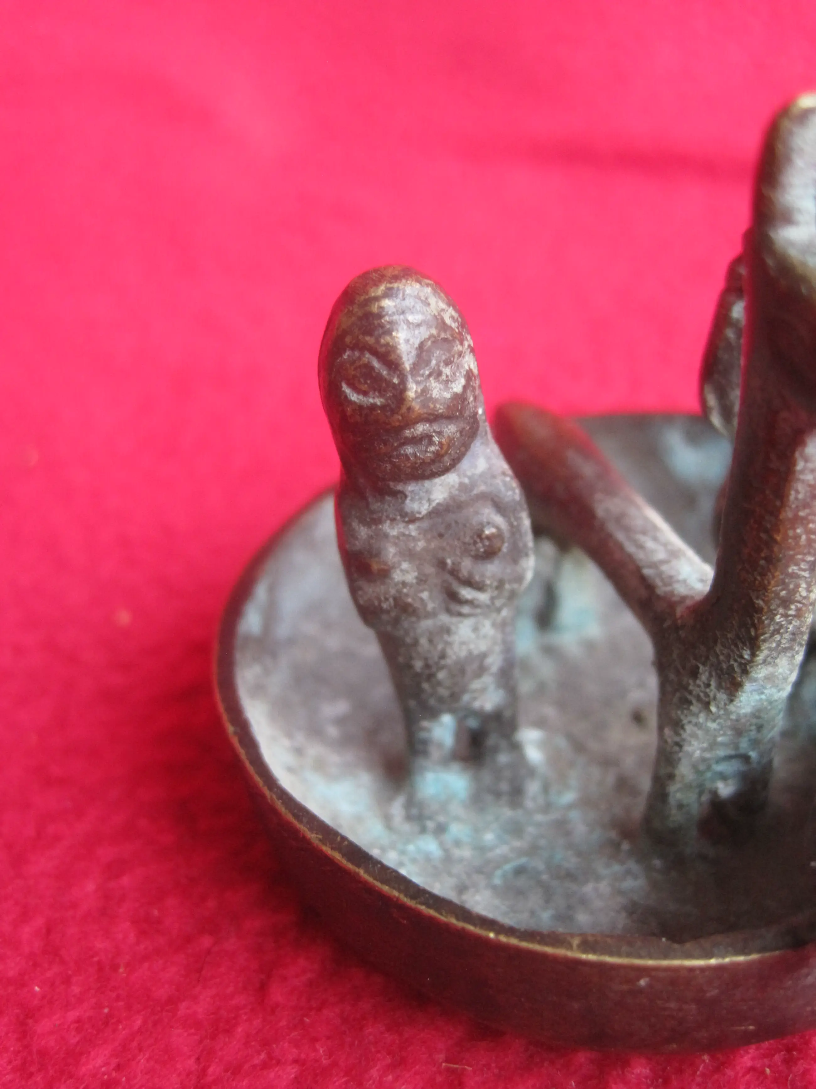 Ee bijzonder bakje met 4 figuren waarvan ik de betekenis niet weet. Ik zie een rond bootje met 4 figuren: Een slang, een lama en een man en vrouw. Het doet voor mij Zuid Amerikaans aan, vooral door de lama. Ik denk dat het een beeldje is wat geofferd kan worden ter gelegenheid van het een of ander. Als iemand het weet, hoor ik dat graag.
