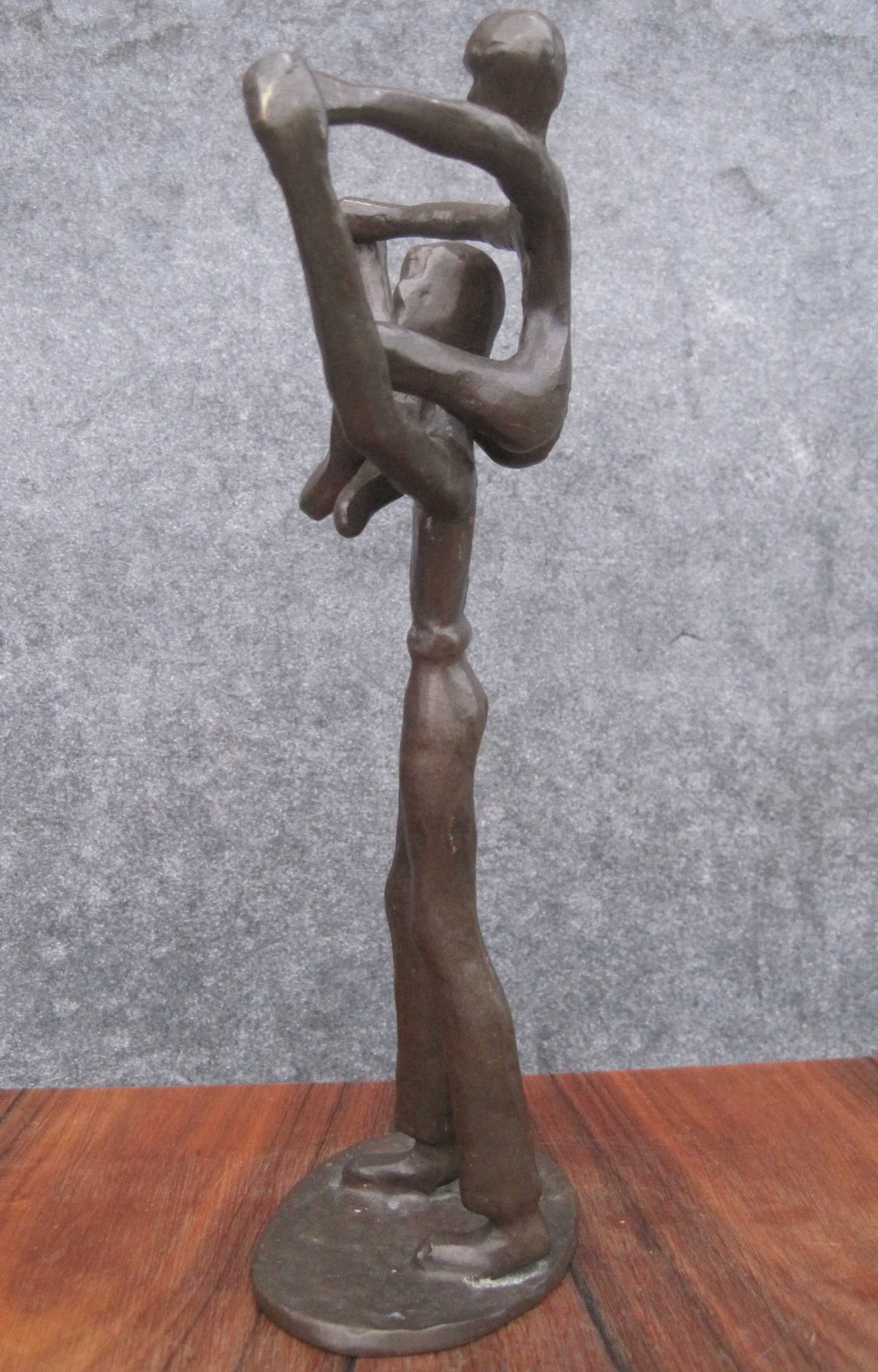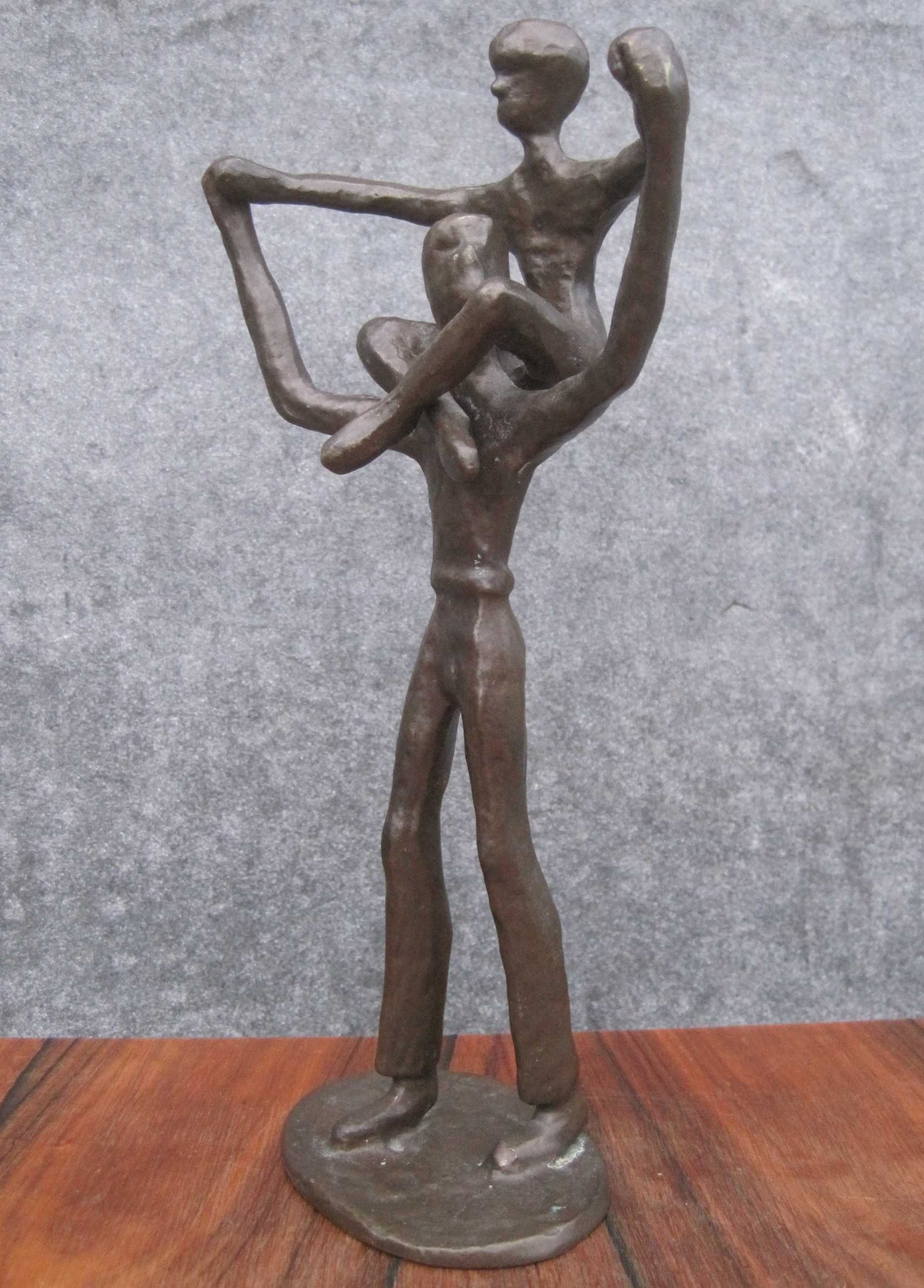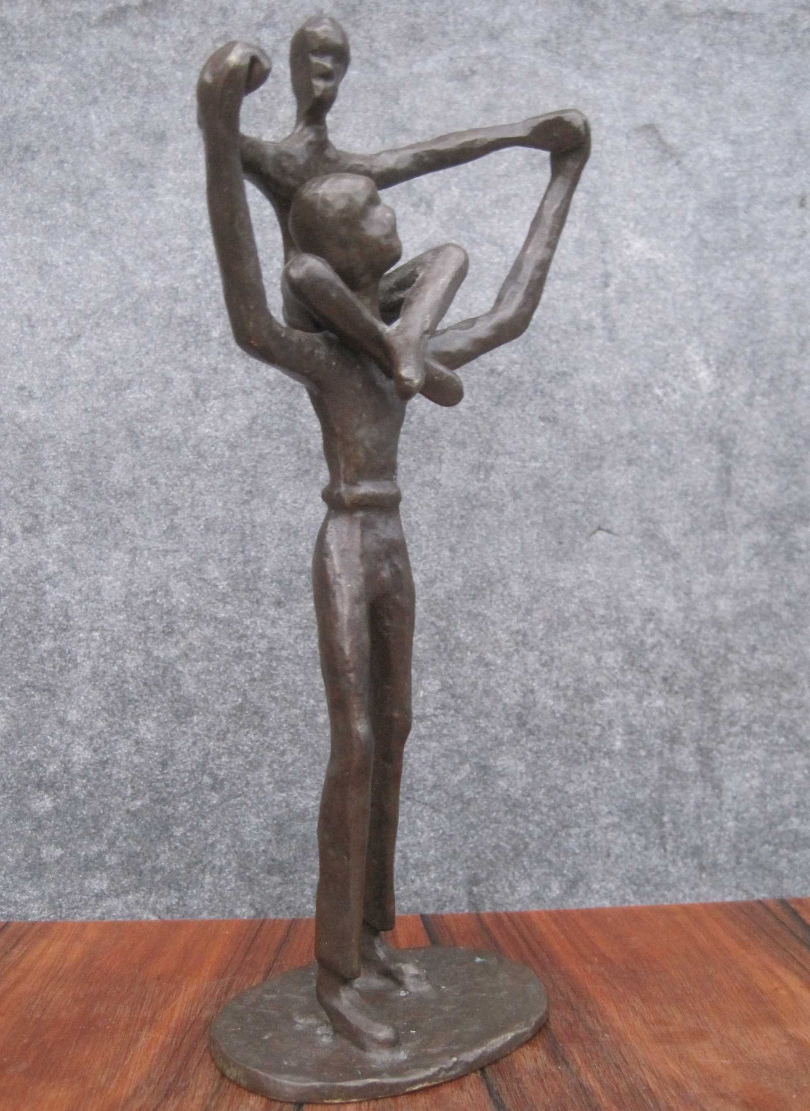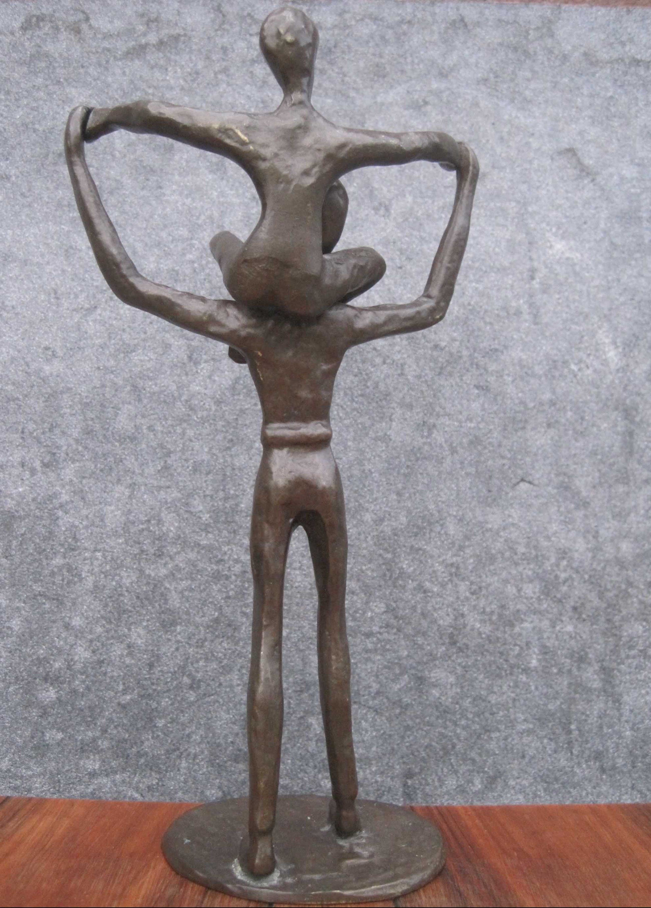 Zwaar massief bronzen beeldje van een vader met zijn kind op de nek. Het beeld is bronsgroen gepatineerd. Het beeld heeft enkele heel lichte gebruikssporen, zie foto's.