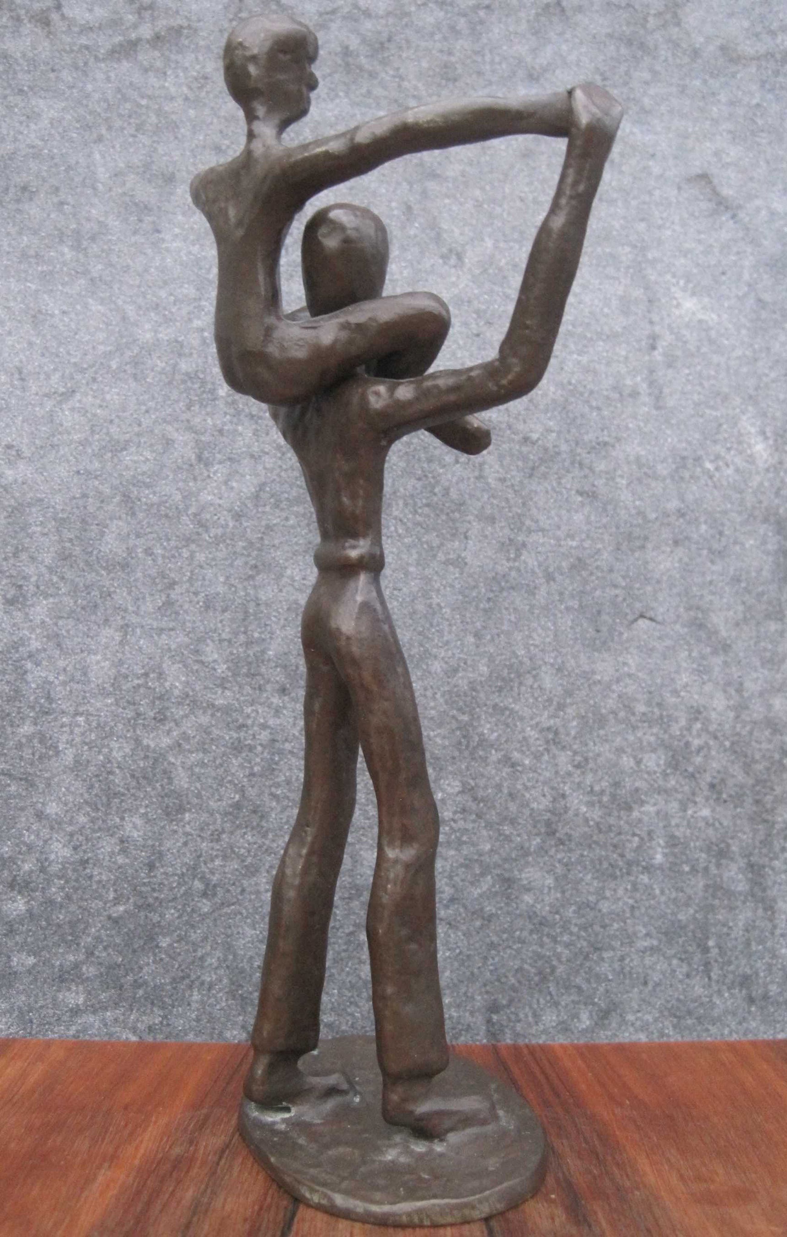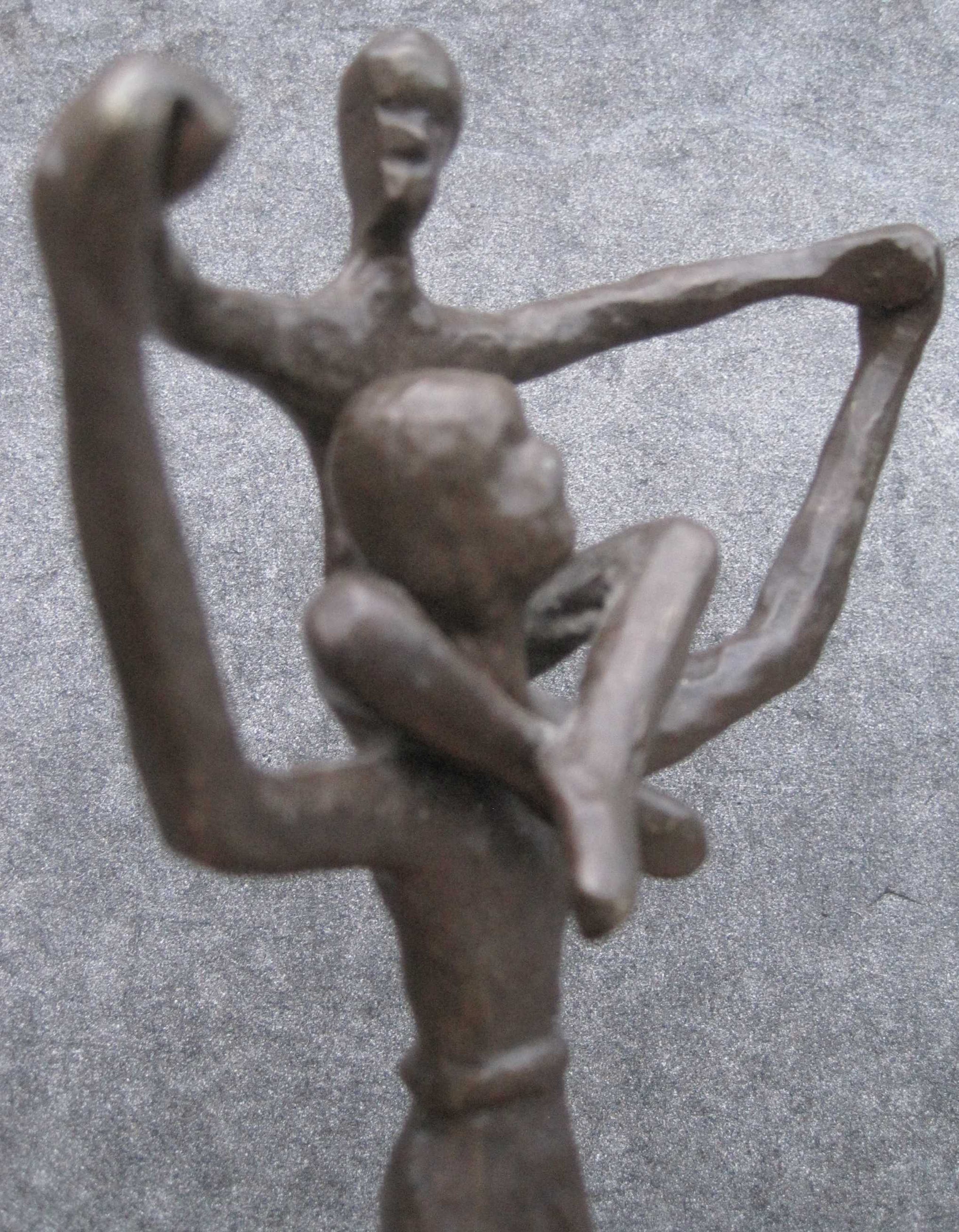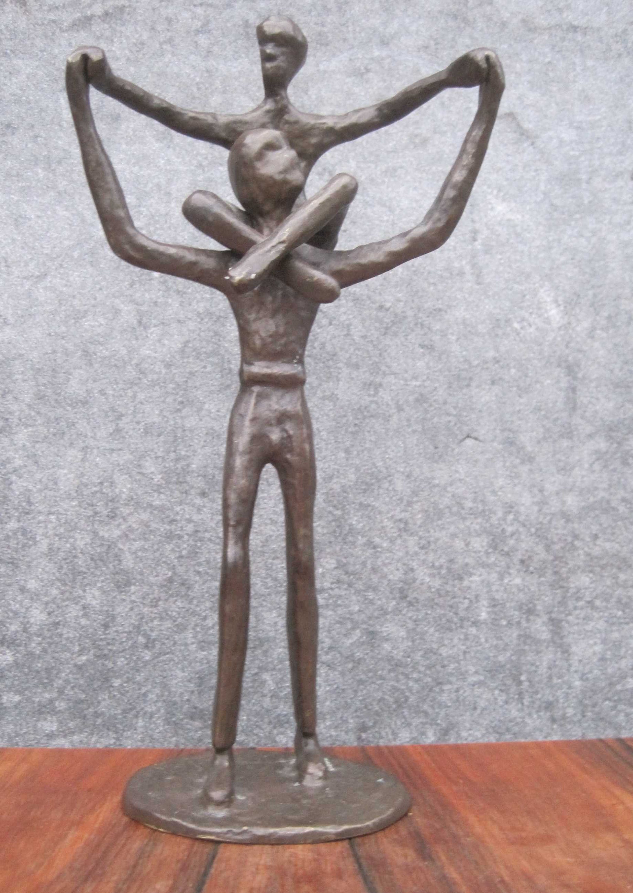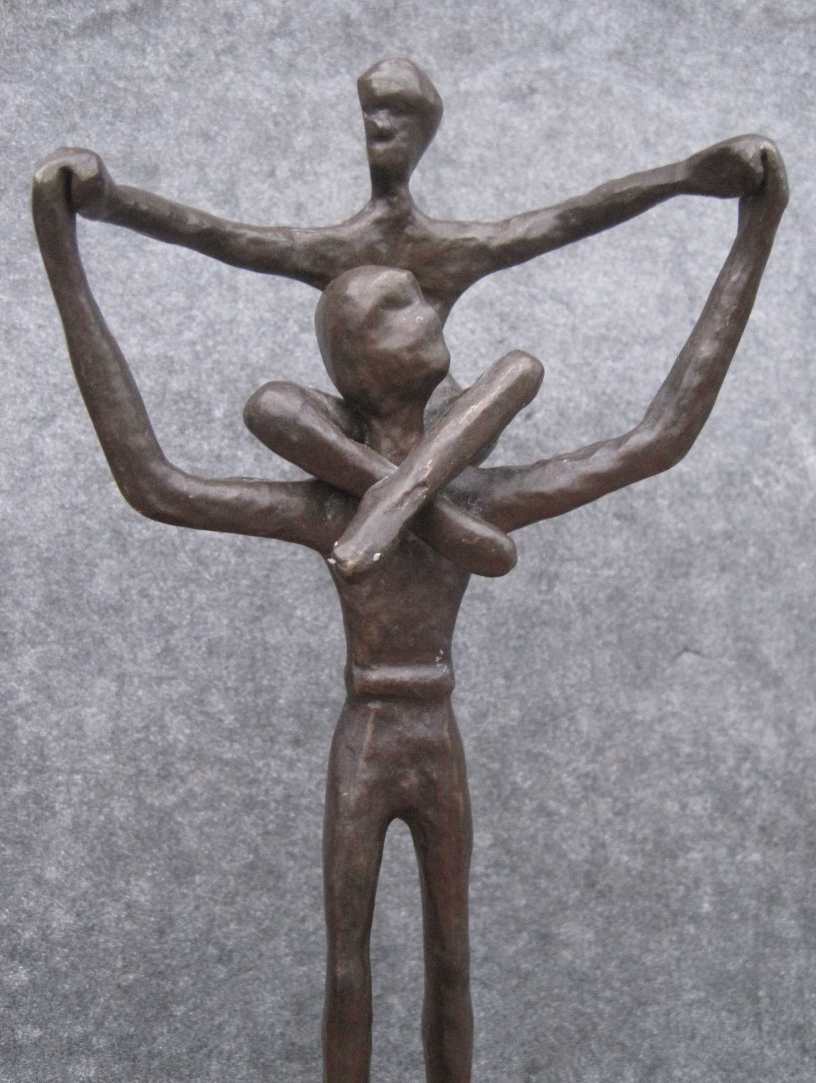 Zwaar massief bronzen beeldje van een vader met zijn kind op de nek. Het beeld is bronsgroen gepatineerd. Het beeld heeft enkele heel lichte gebruikssporen, zie foto's.