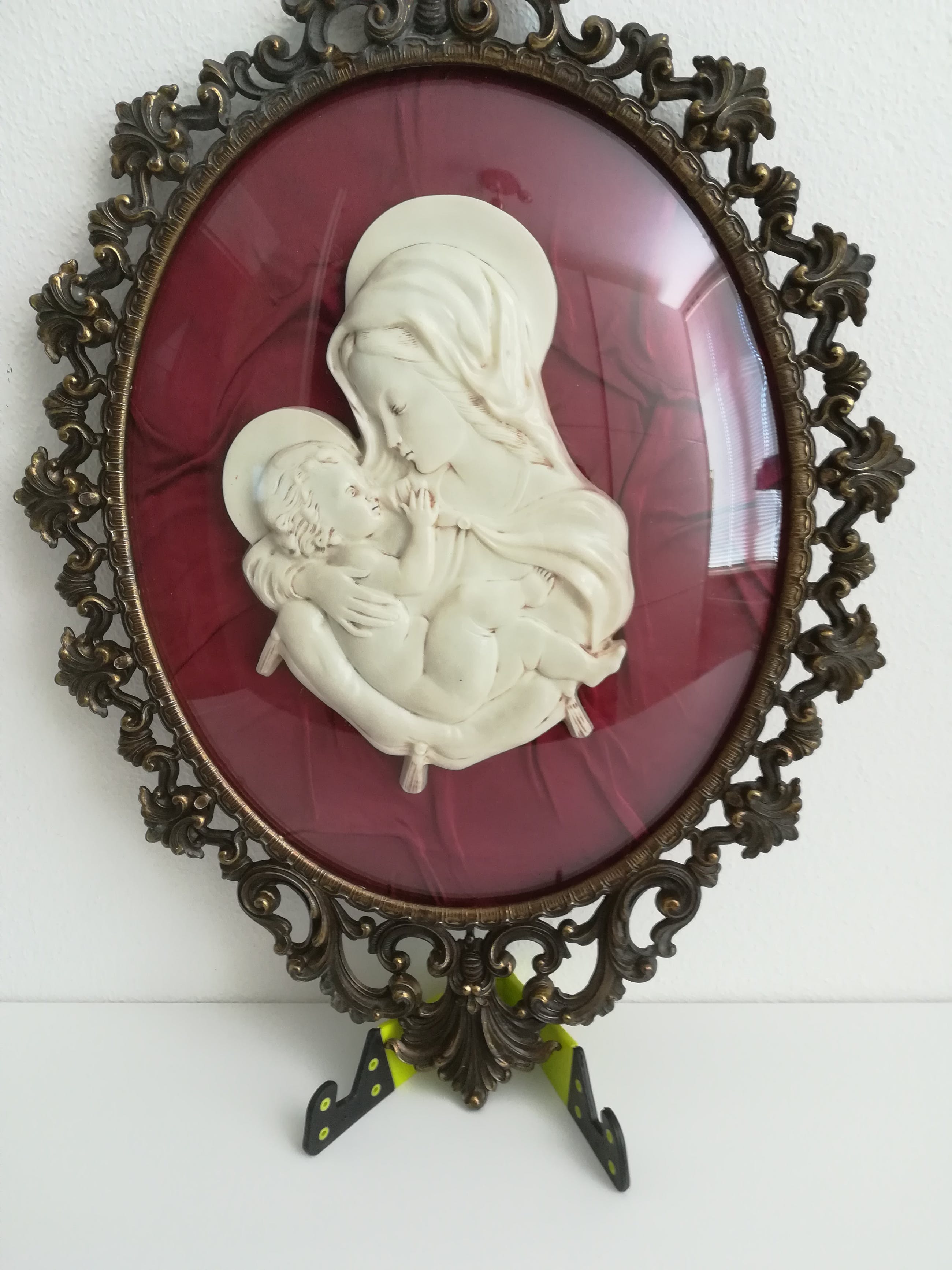 Elegante ovalen vitrine met Maria en baby Jezus in haar armen, gevleid in zachtglanzende donkerrode zijdesatijn. De bronzen omlijsting is rijkelijk versierd in Barokke stijl. Het sierlijk gebolde glas beschermt de afbeelding. Land van herkomst is Italië, eerste helft van de 20e eeuw of nog ouder.