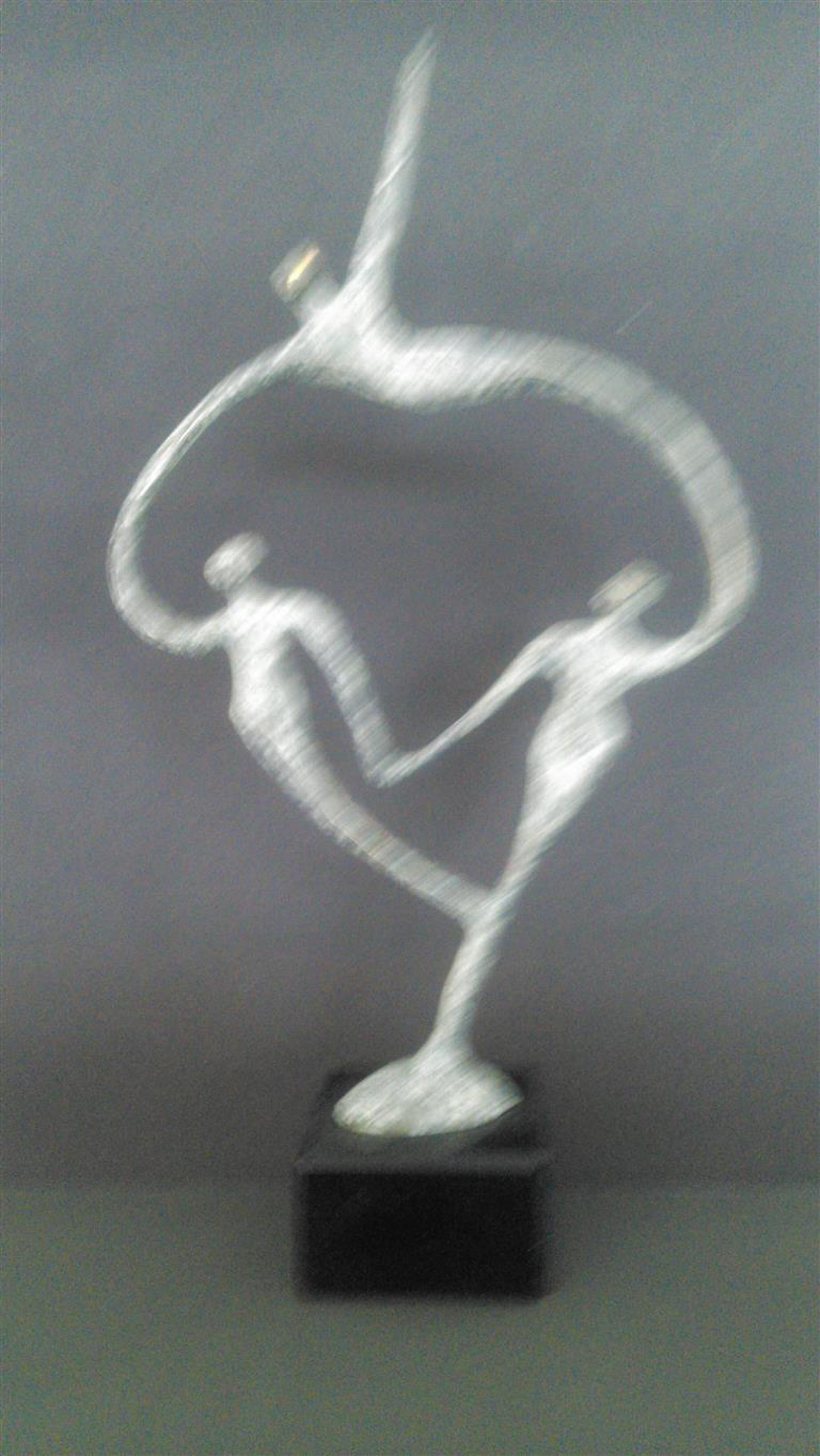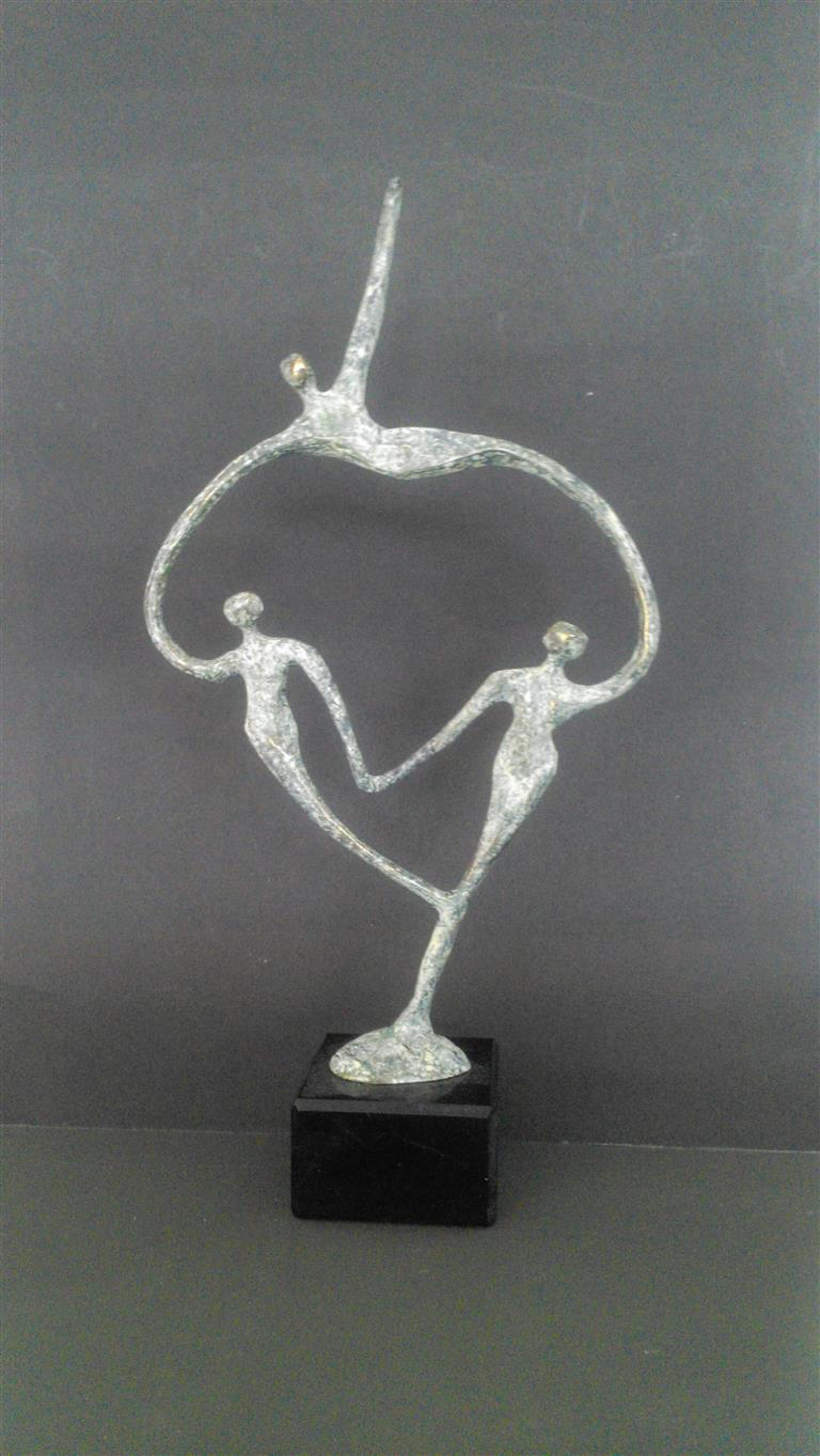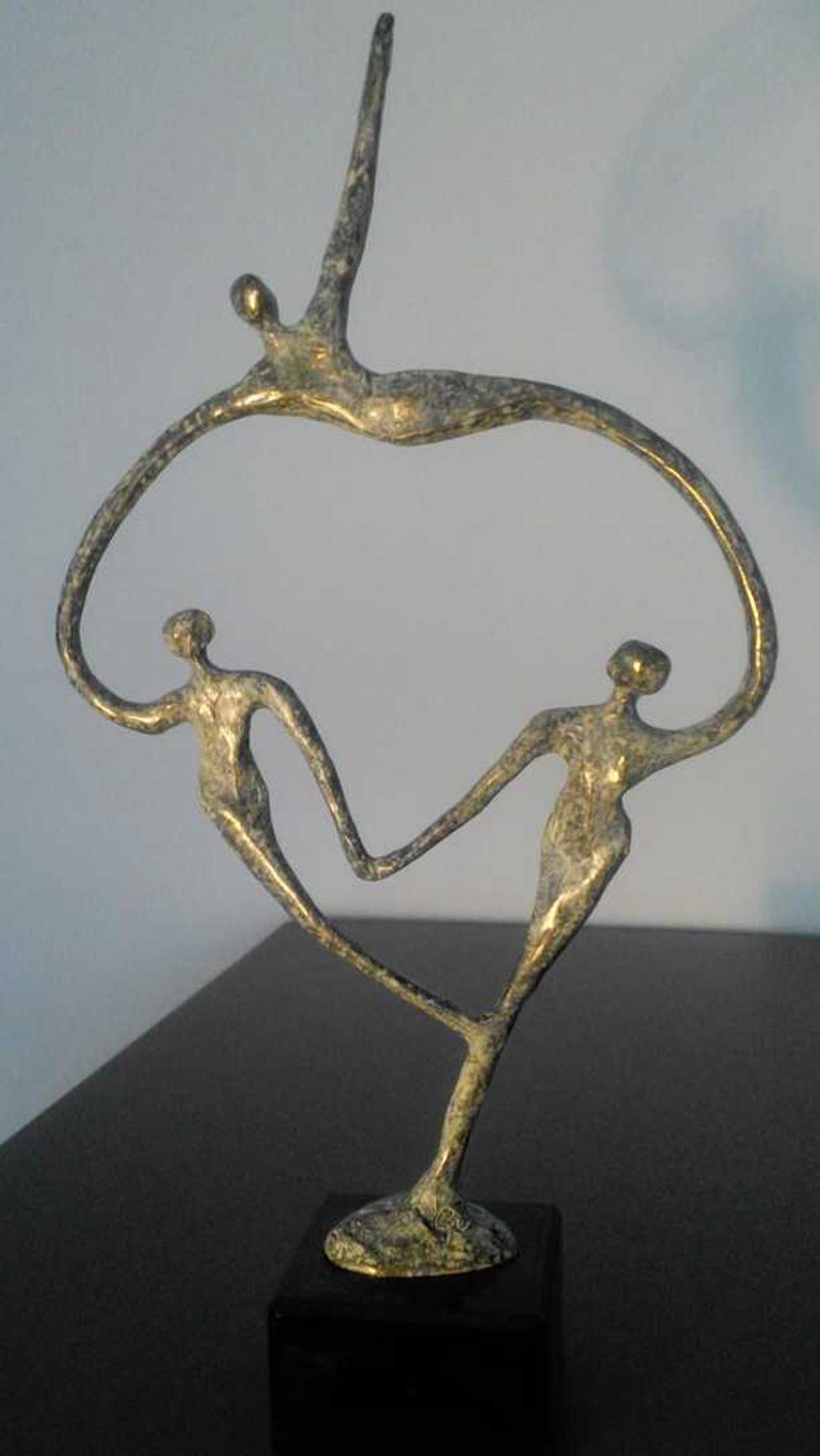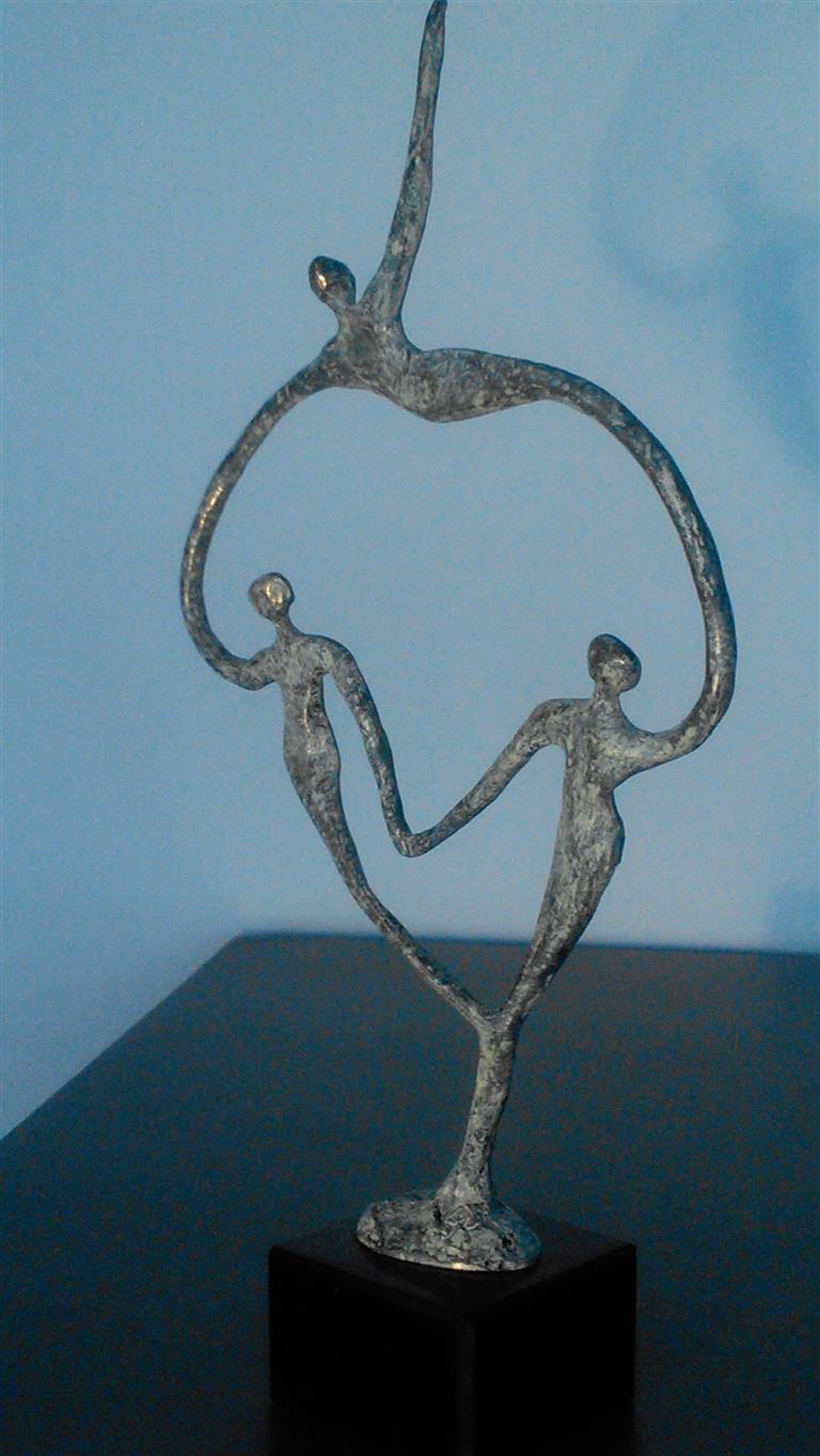 In grijs gemeleerd patin is dit luchtige beeldje op natuurstenen sokkel van drie personen gemaakt Gesigneerd maar onbekend/niet leesbaar