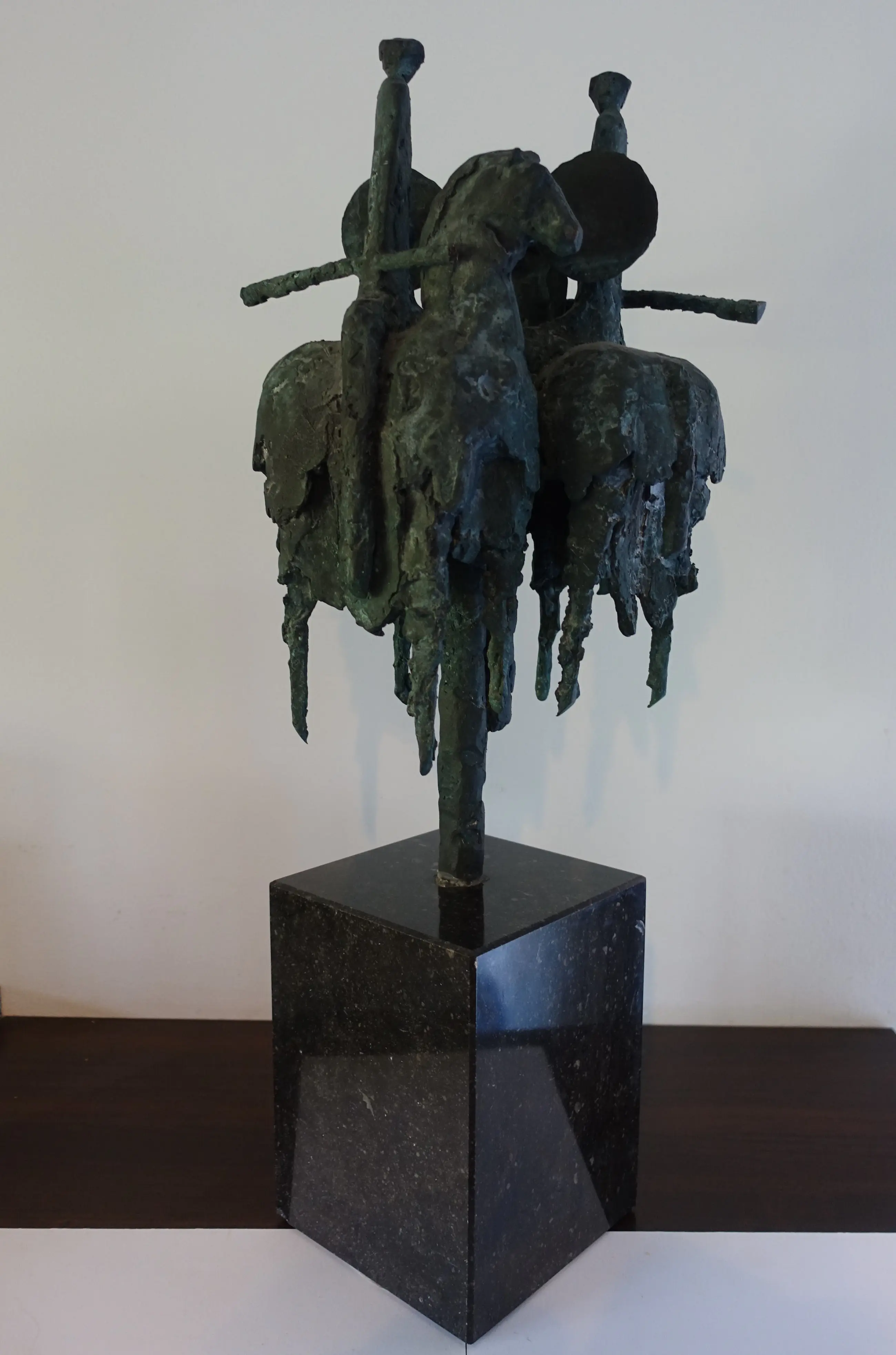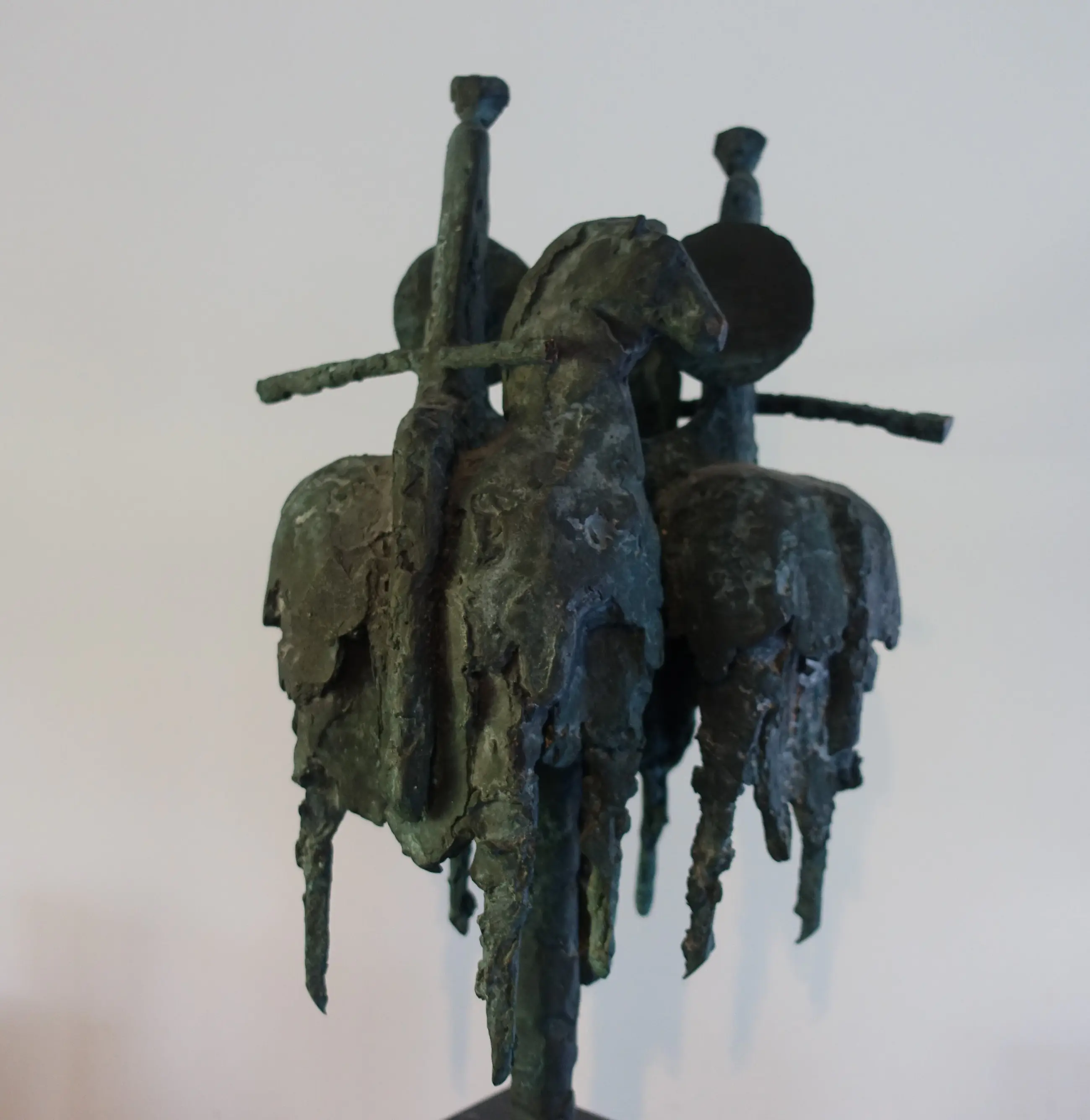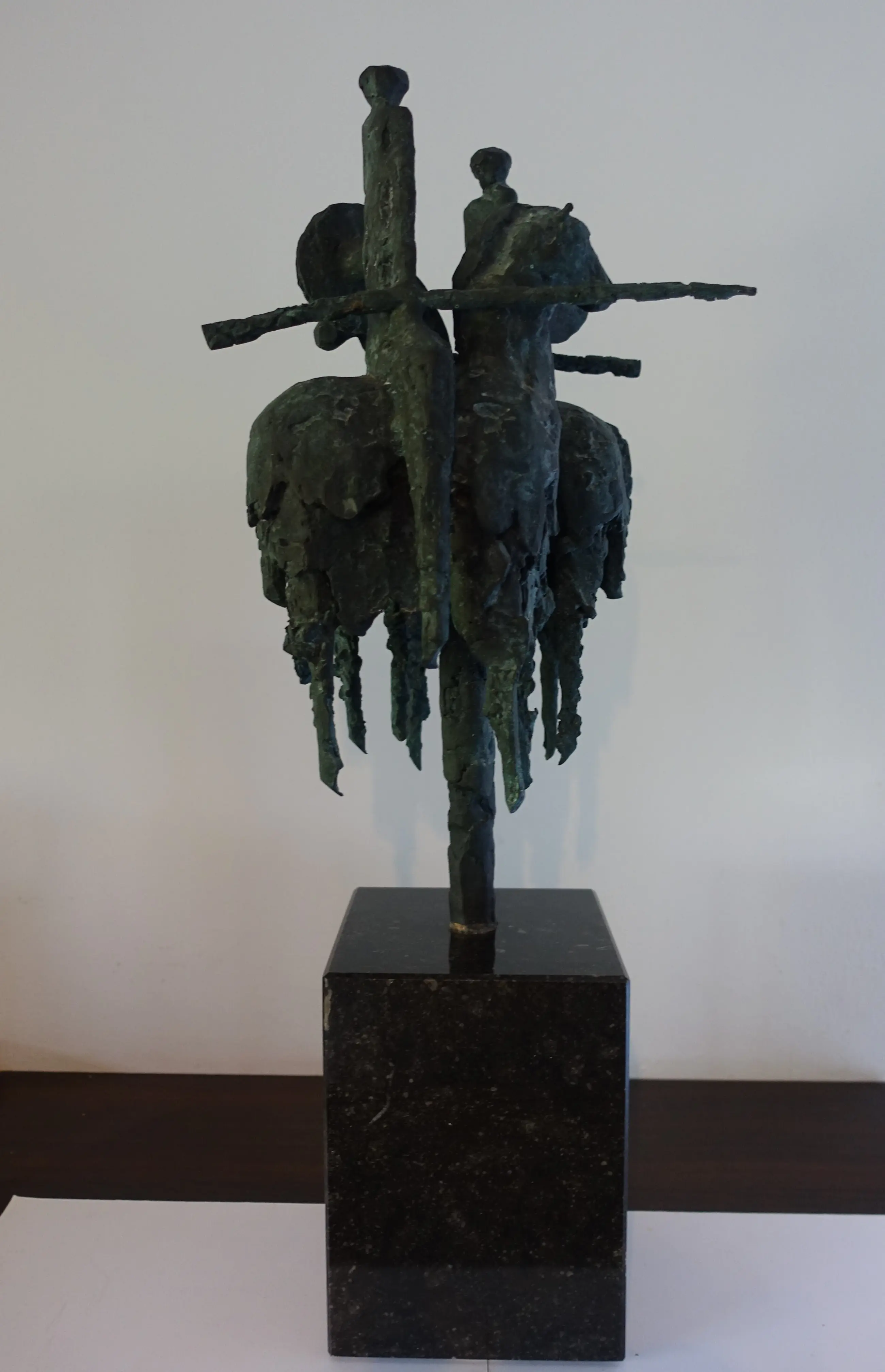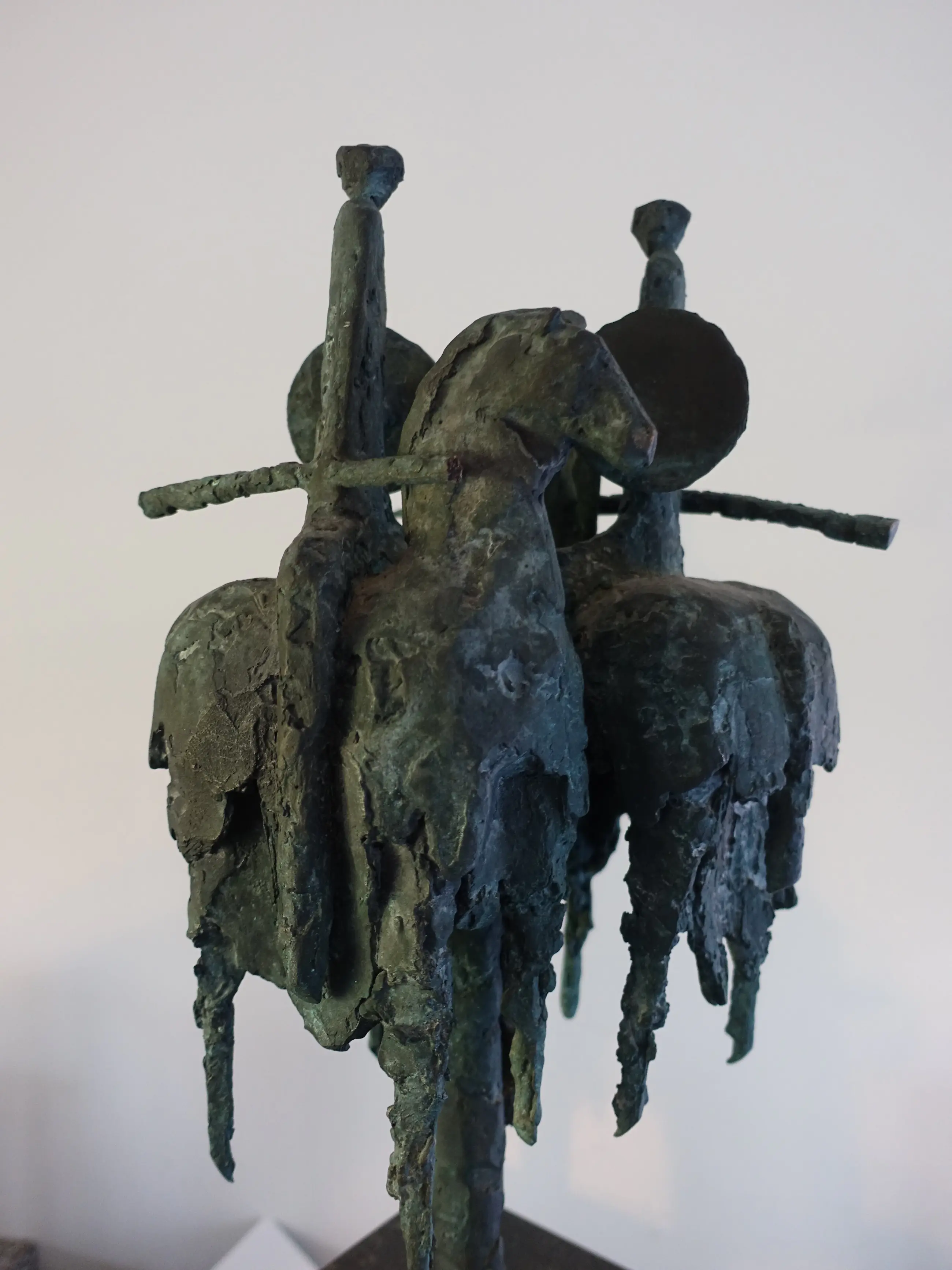 Zeer mooi en groot zwaar beeld (23,8 kg !!) van twee toernooiridders te paard. Monumentaal beeld ! Helaas is één puntje van de speren afgebroken ( zie foto 12) dit doet echter weinig afbreuk aan de schoonheid van dit prachtige en kostbare beeld. De hoogte van het brons alleen is 43,5 cm met sokkel dus 63,5 cm !!
