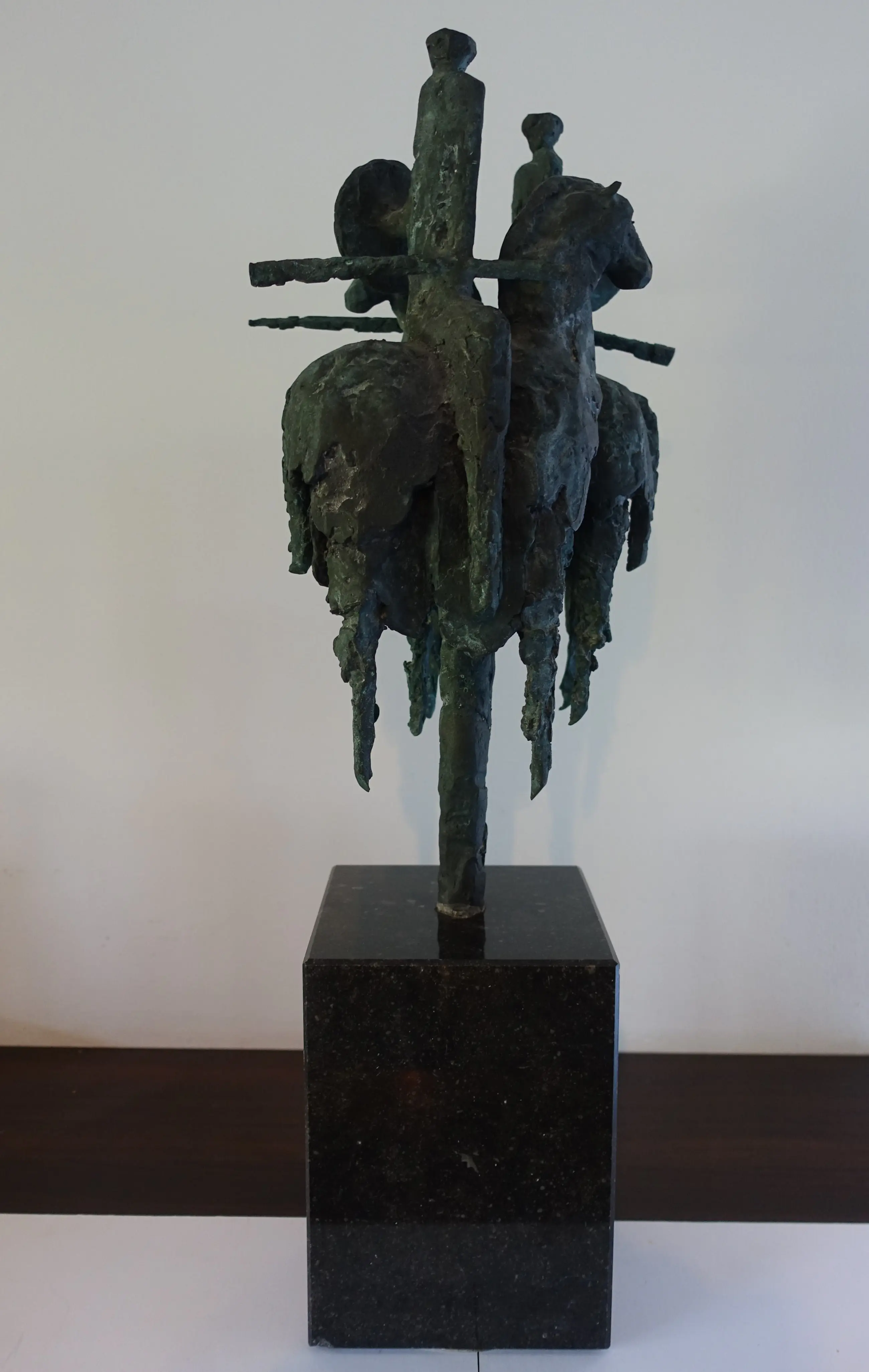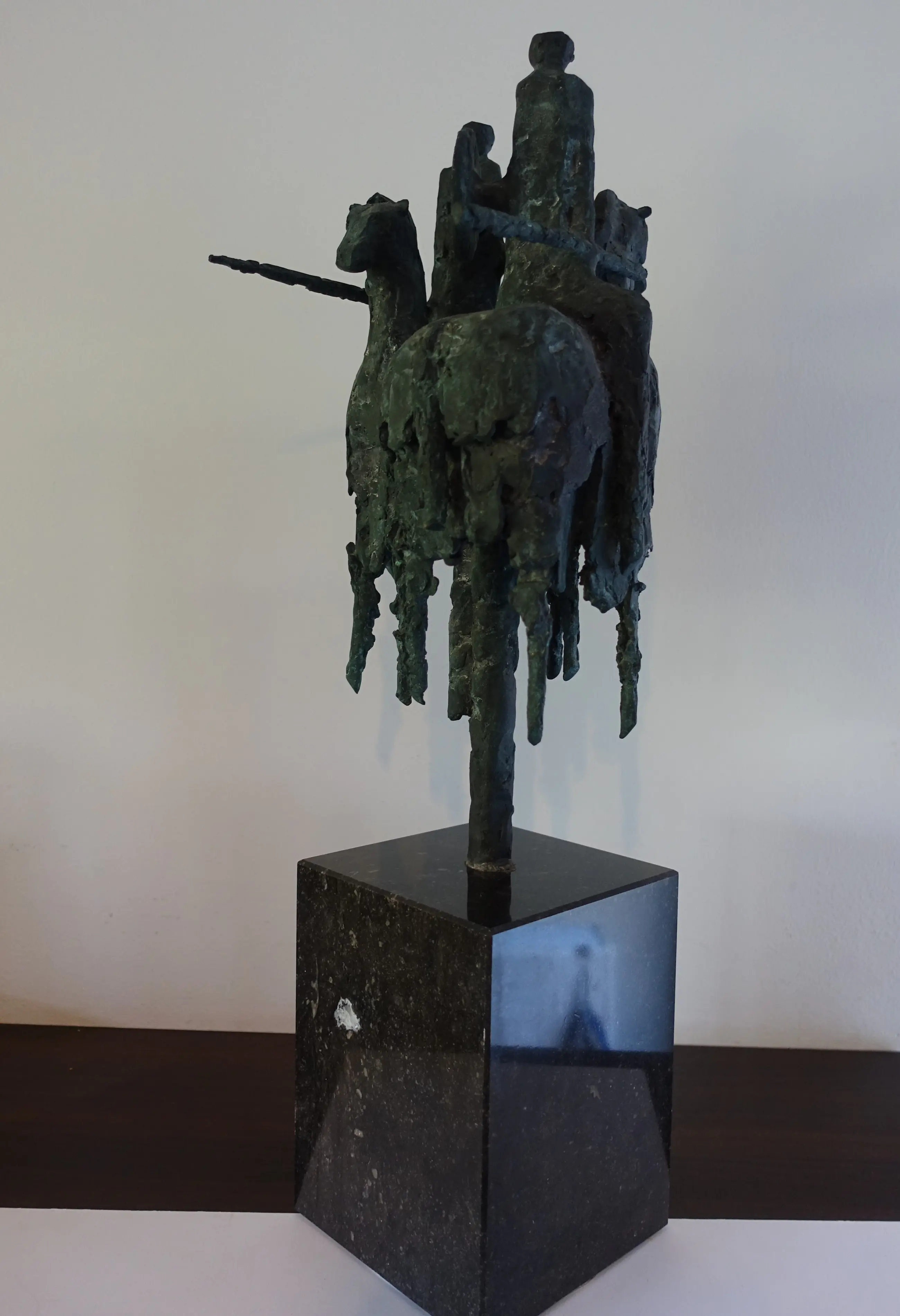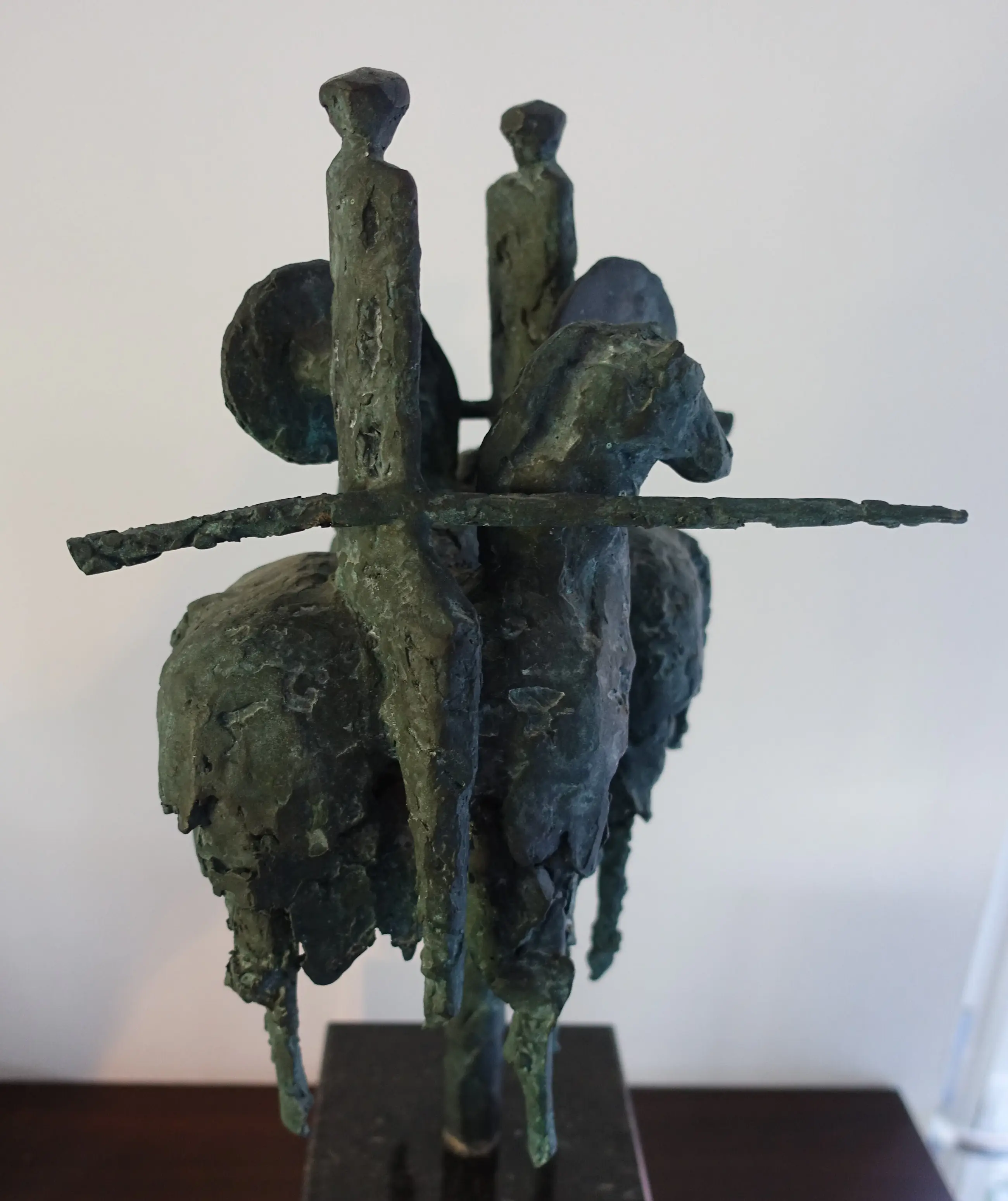 Zeer mooi en groot zwaar beeld (23,8 kg !!) van twee toernooiridders te paard. Monumentaal beeld ! Helaas is één puntje van de speren afgebroken ( zie foto 12) dit doet echter weinig afbreuk aan de schoonheid van dit prachtige en kostbare beeld. De hoogte van het brons alleen is 43,5 cm met sokkel dus 63,5 cm !!