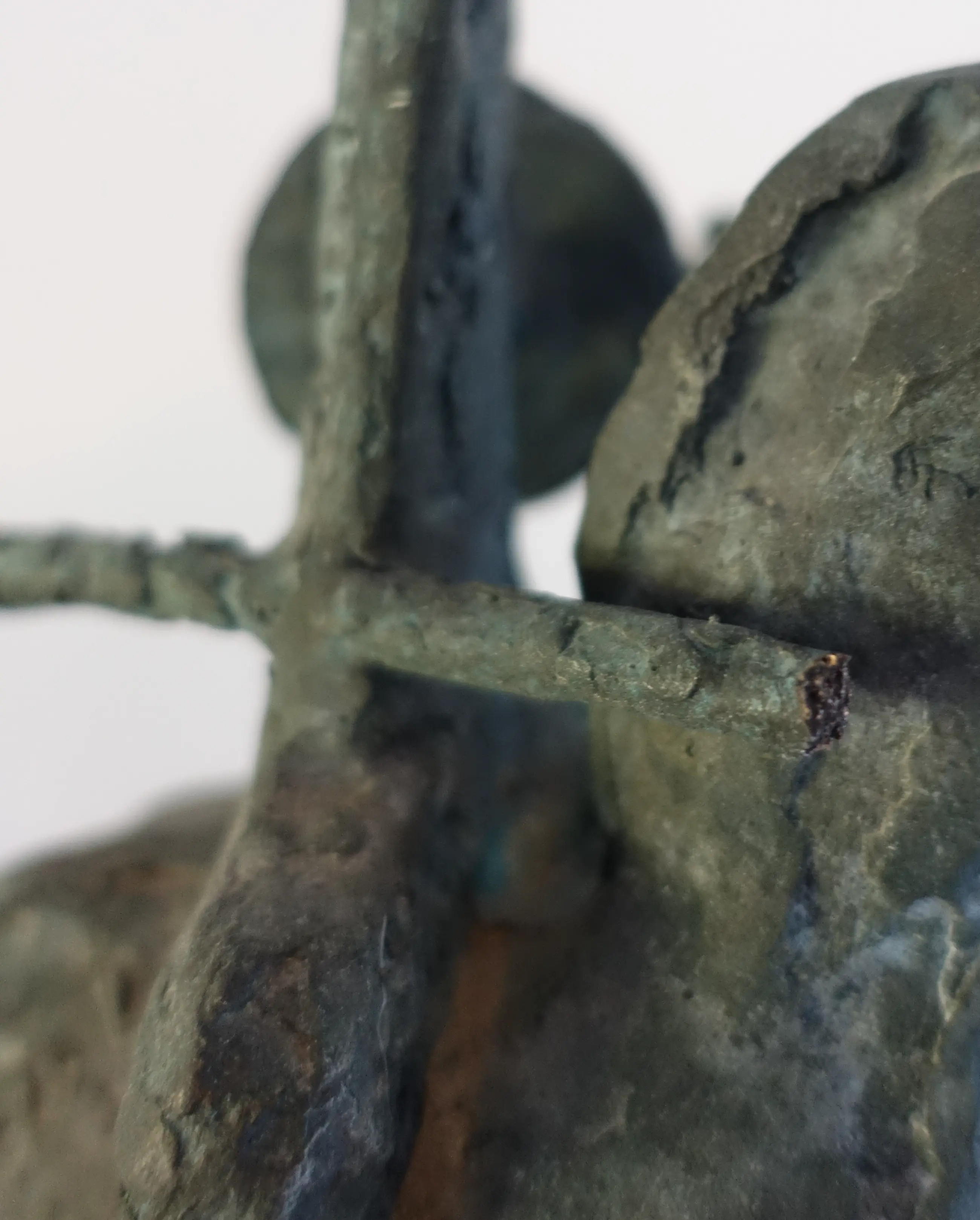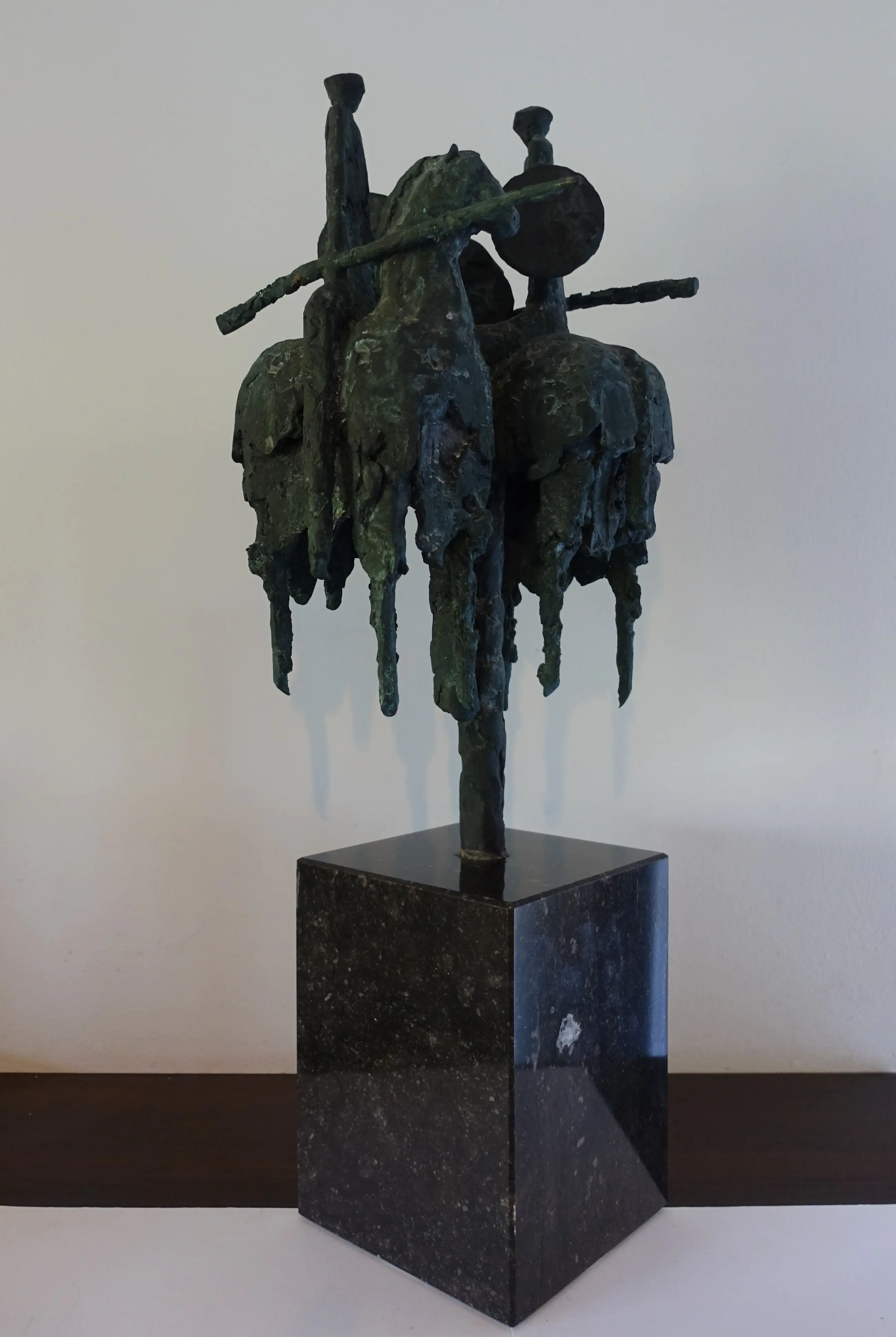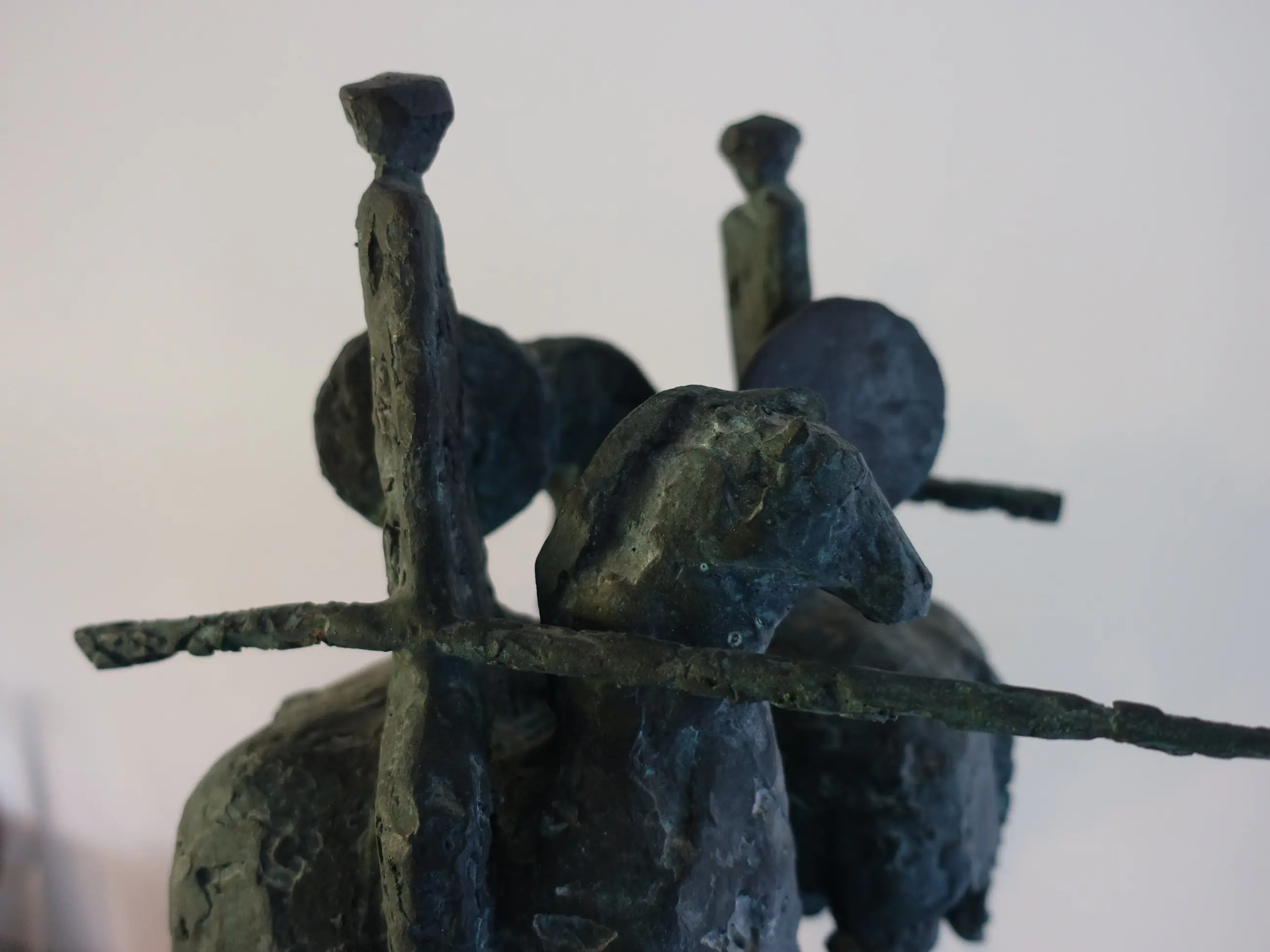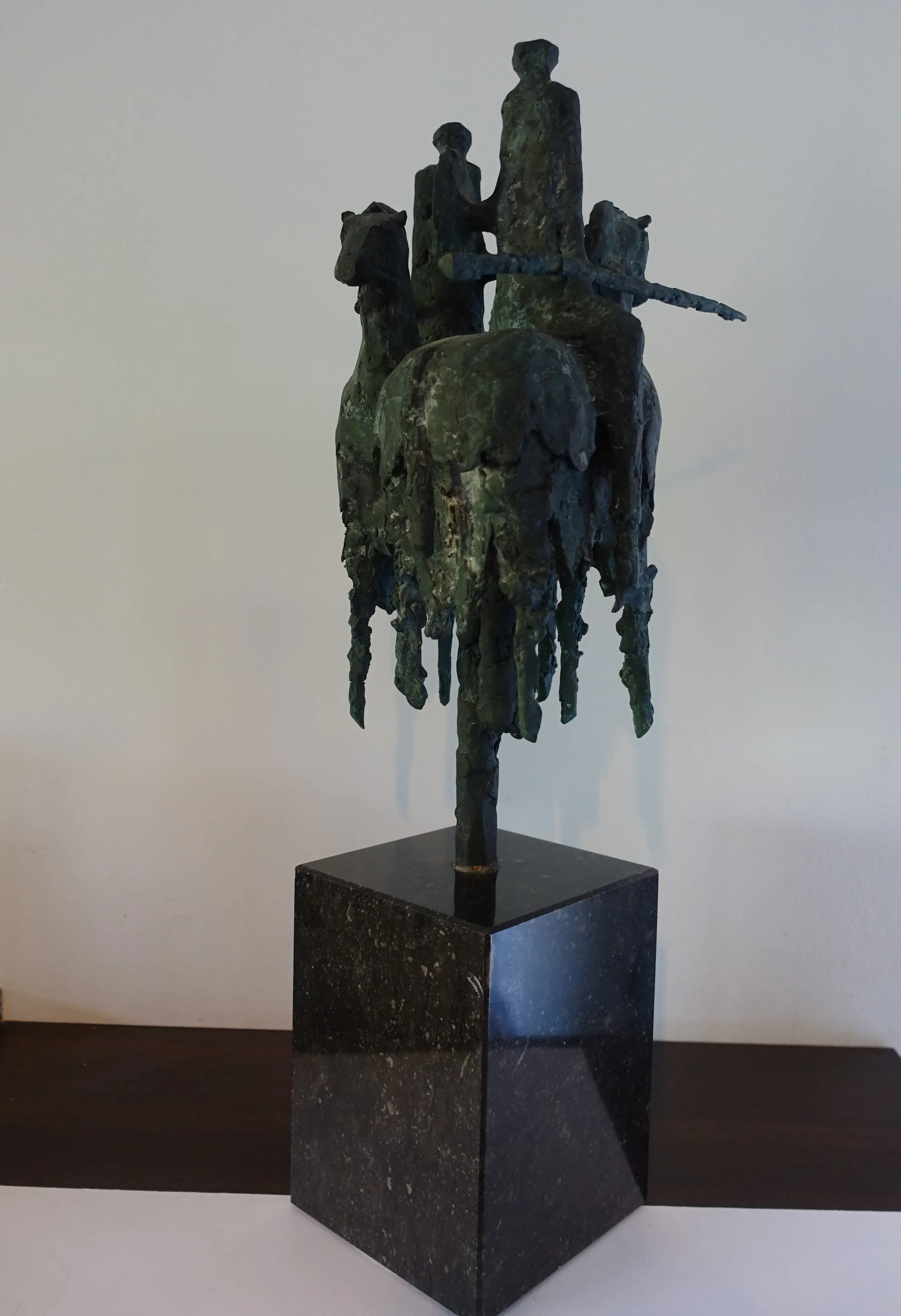 Zeer mooi en groot zwaar beeld (23,8 kg !!) van twee toernooiridders te paard. Monumentaal beeld ! Helaas is één puntje van de speren afgebroken ( zie foto 12) dit doet echter weinig afbreuk aan de schoonheid van dit prachtige en kostbare beeld. De hoogte van het brons alleen is 43,5 cm met sokkel dus 63,5 cm !!