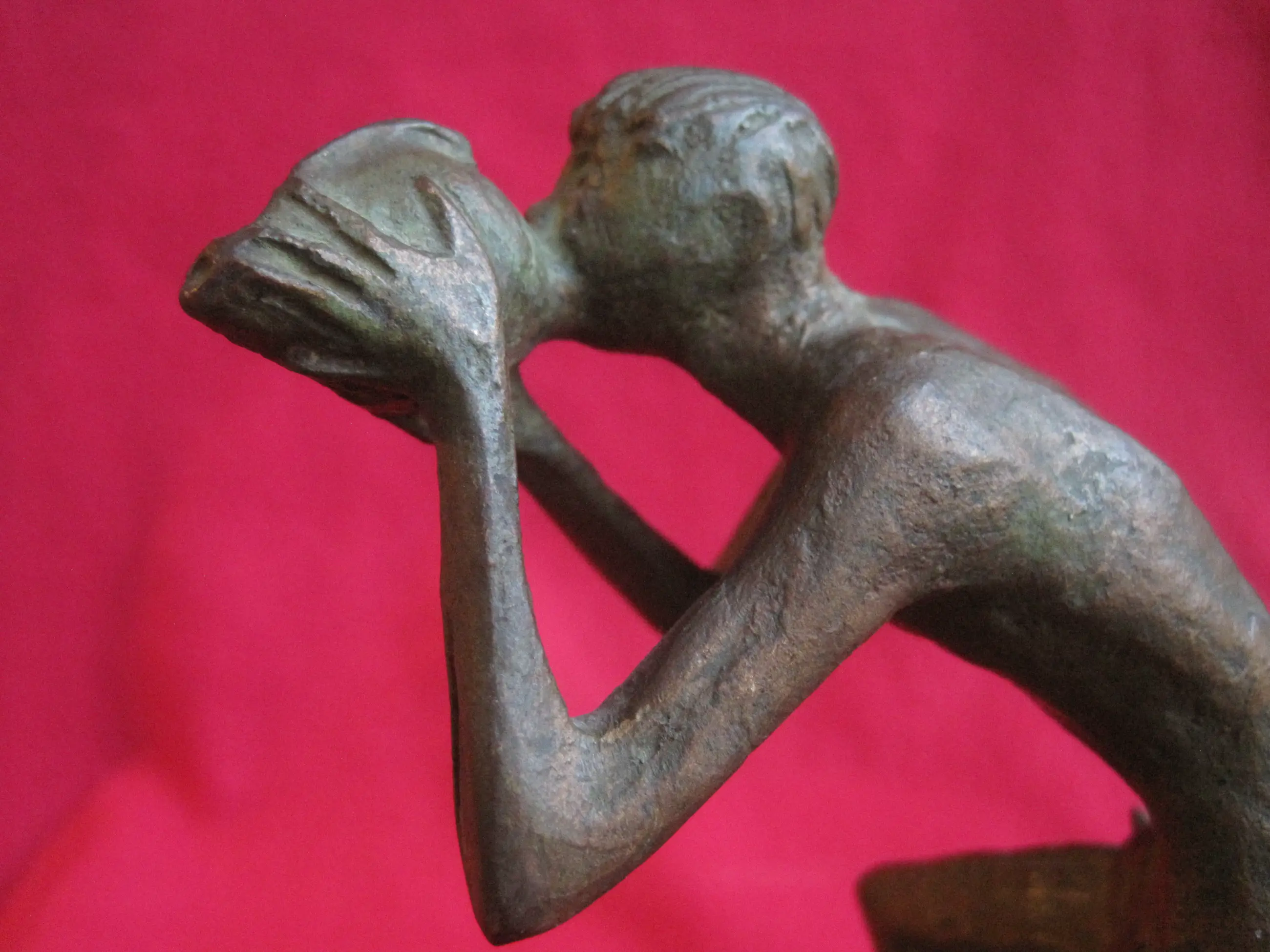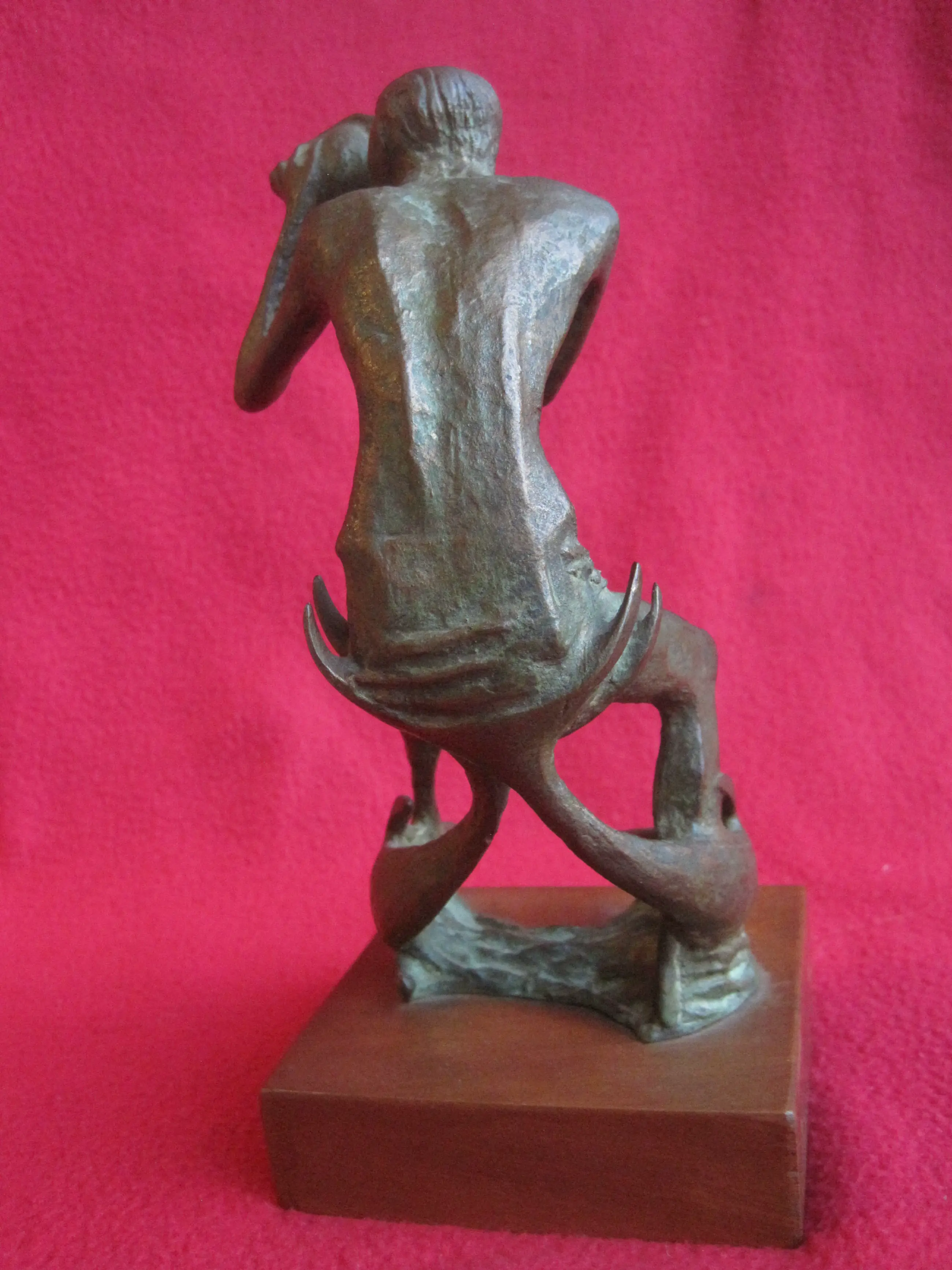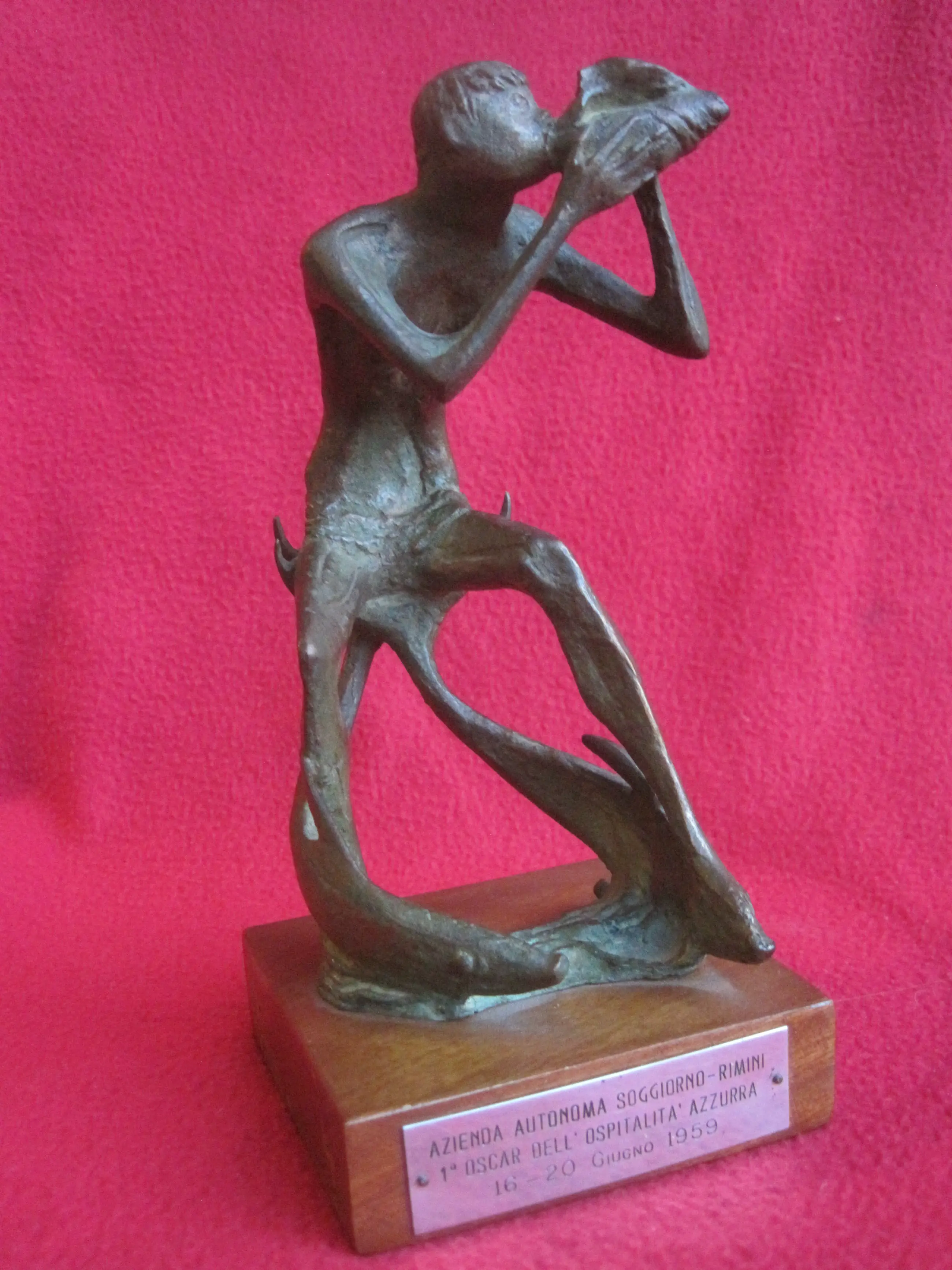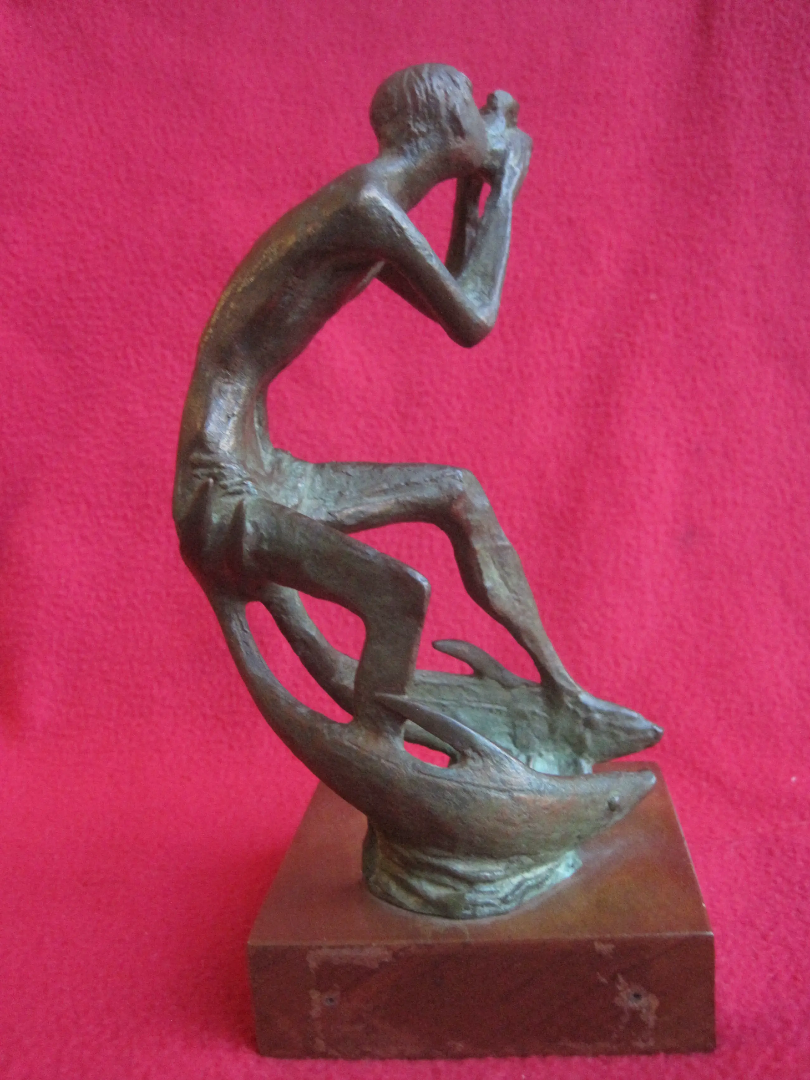 Bronzen beeldje van de zee god Triton, blazend op een kinkhoorn, op de ruggen van twee dolfijnen. Triton (Oudgrieks: Τρίτων) is een god uit de Griekse mythologie. Triton was een zoon van Poseidon en Amphitrite. Het beeldje is gesigneerd EM ( denk ik ). De totale hoogte van het beeldje inclusief de houten sokkel is 18,5 cm. Afgaande op het tekst plaatje is het beeldje afkomstig uit Italië, maar ik denk niet dat het betrekking heeft op het beeldje en later is aangebracht. Er zijn nog 2 gaatjes te zien waar een tekst plaatje gezeten heeft. Wie herkent de signatuur?