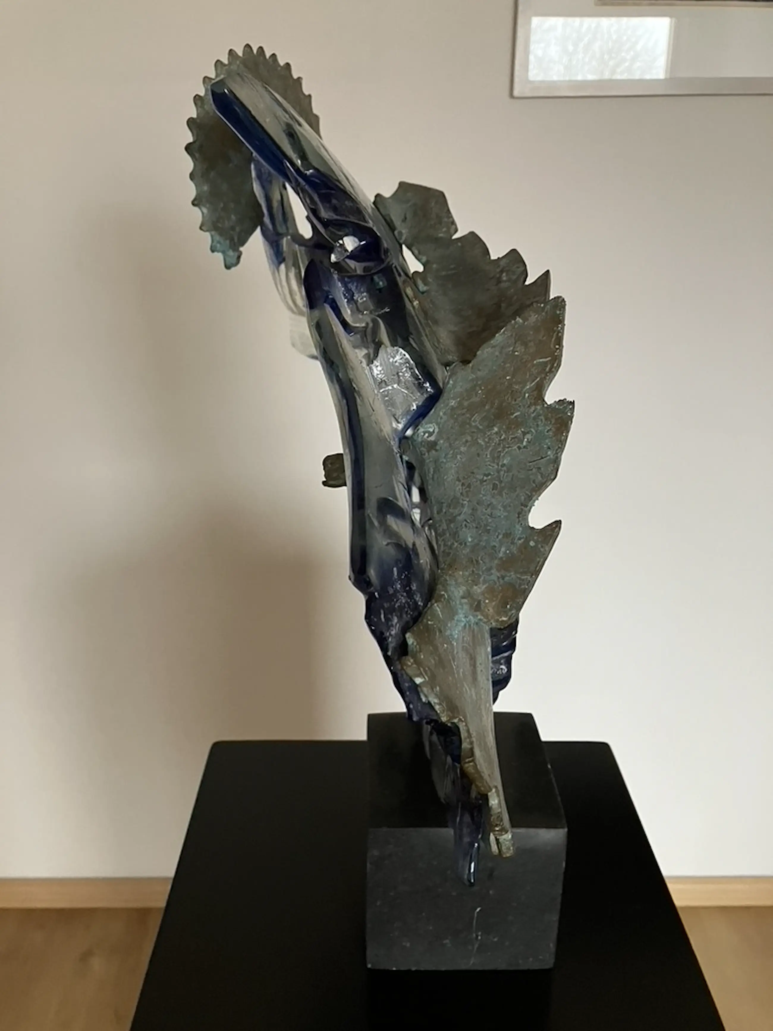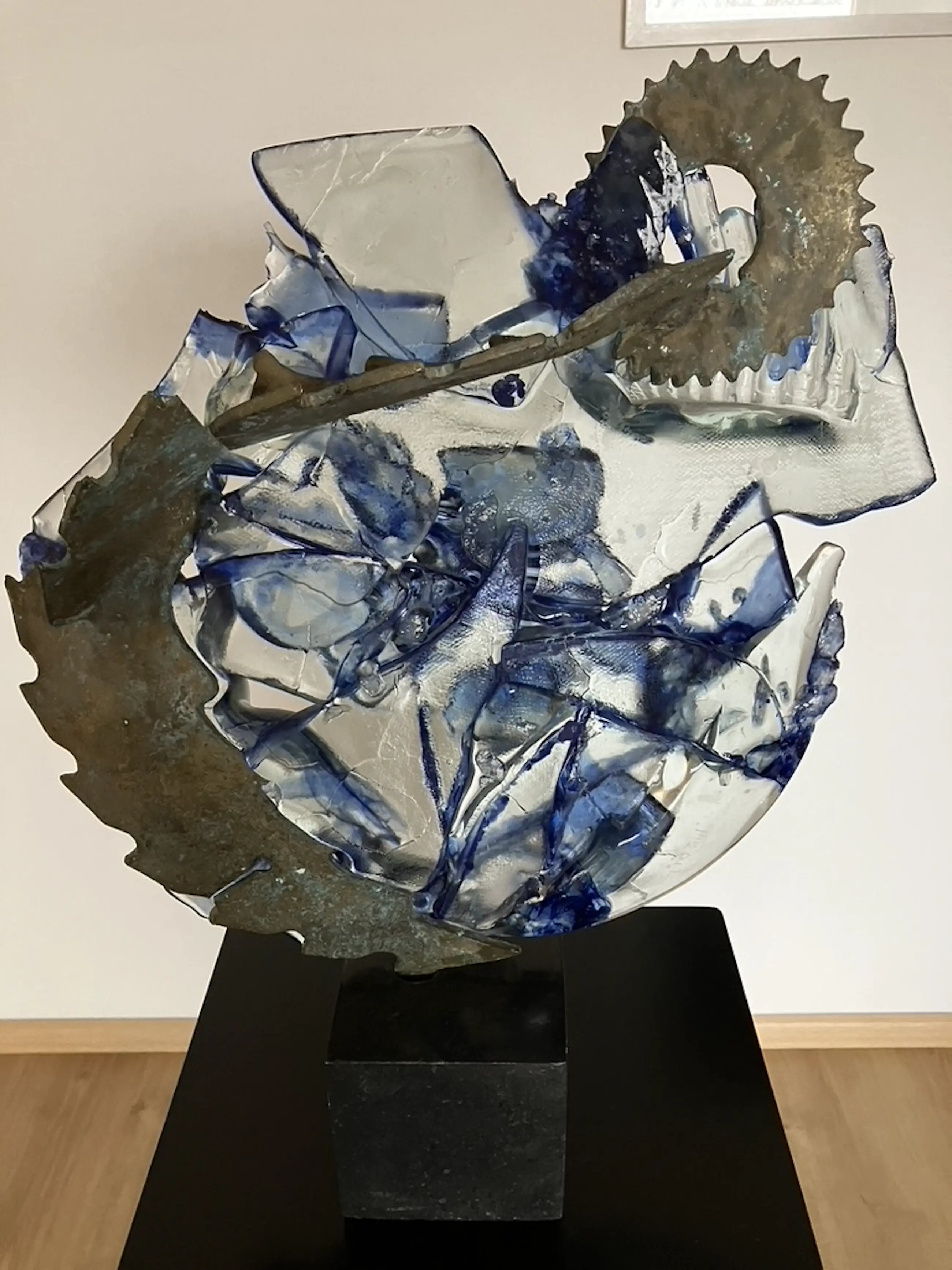 Het betreft een schitterend heel zwaar beeld dat is gemaakt van glas en brons.