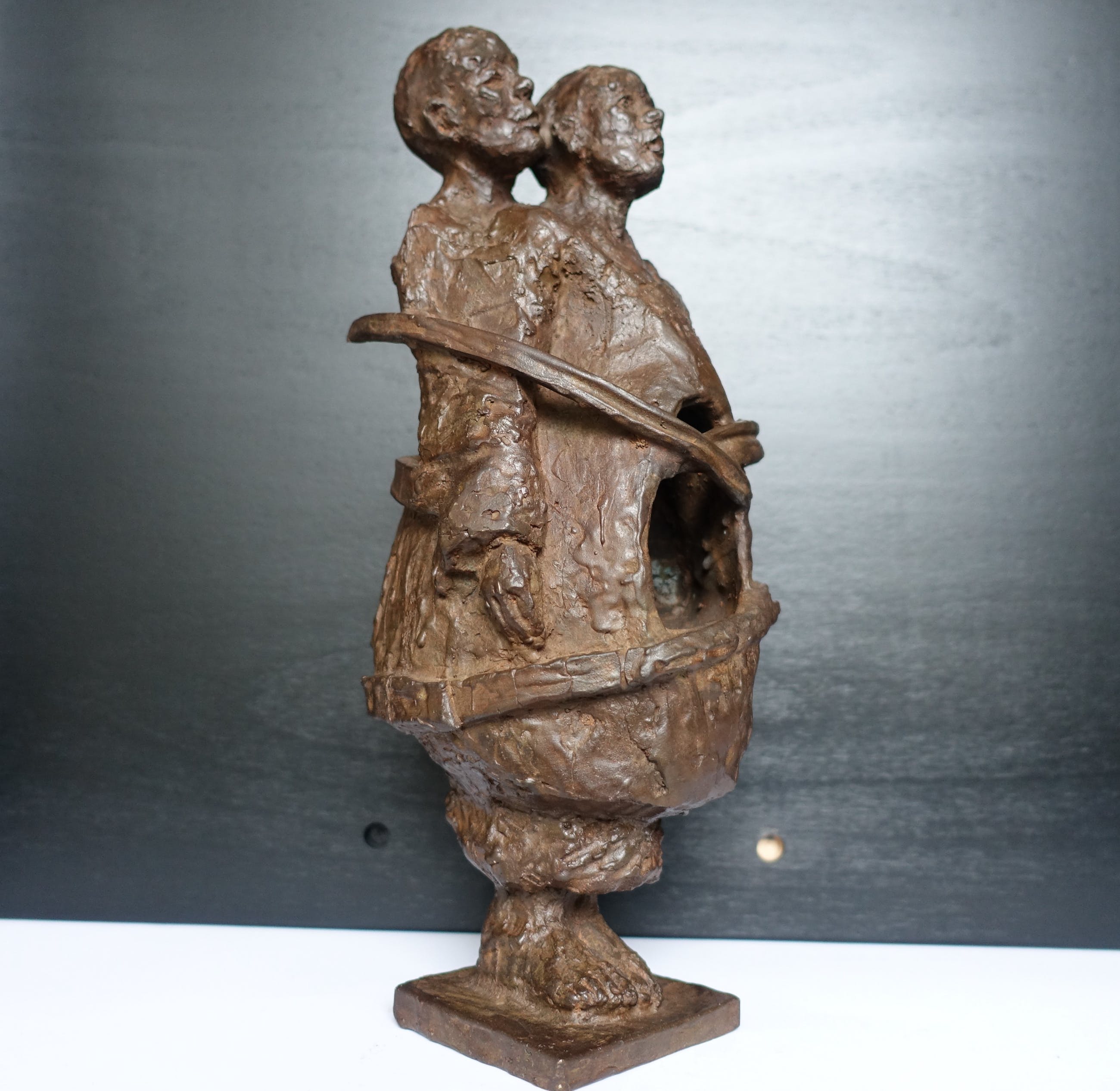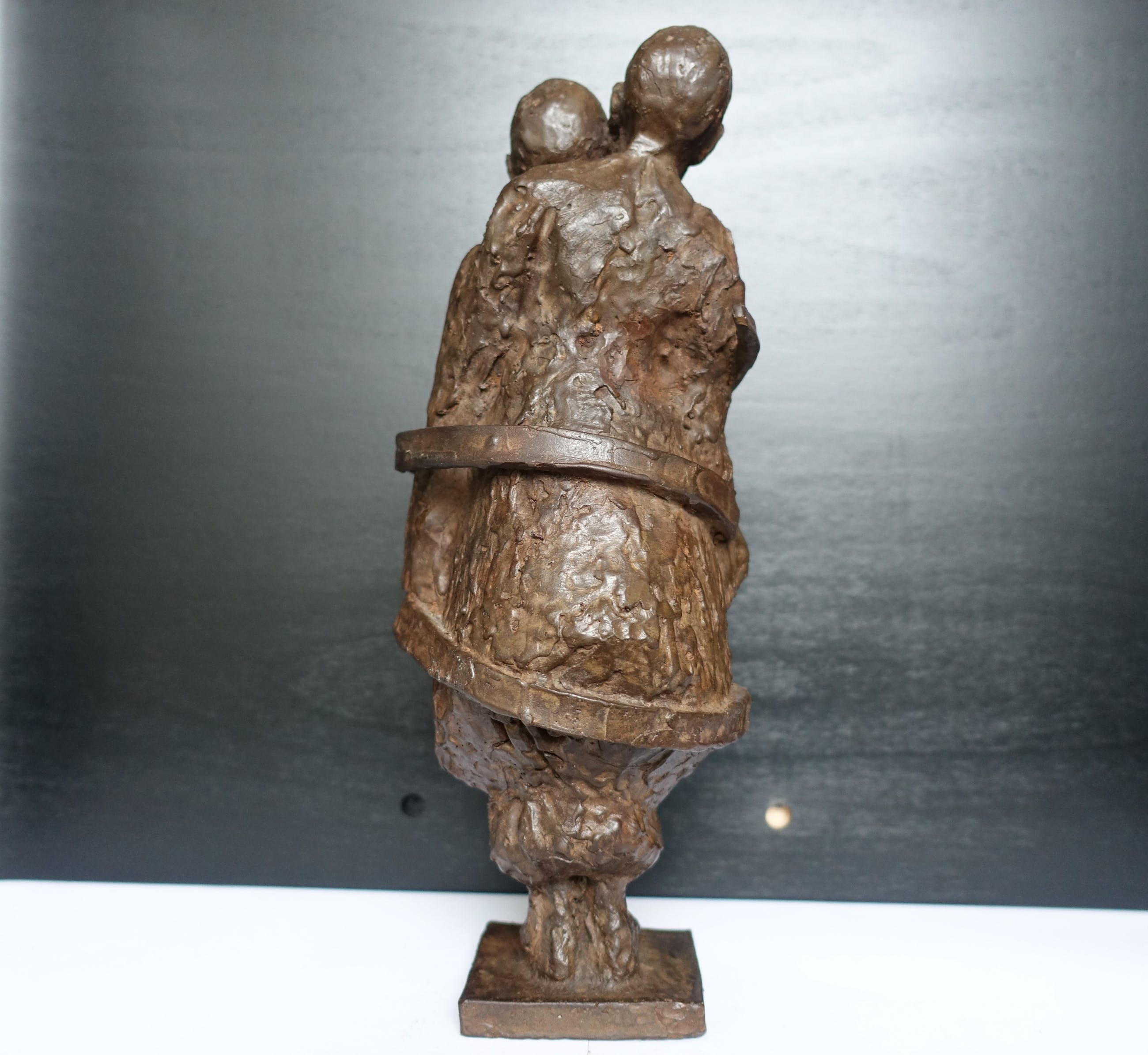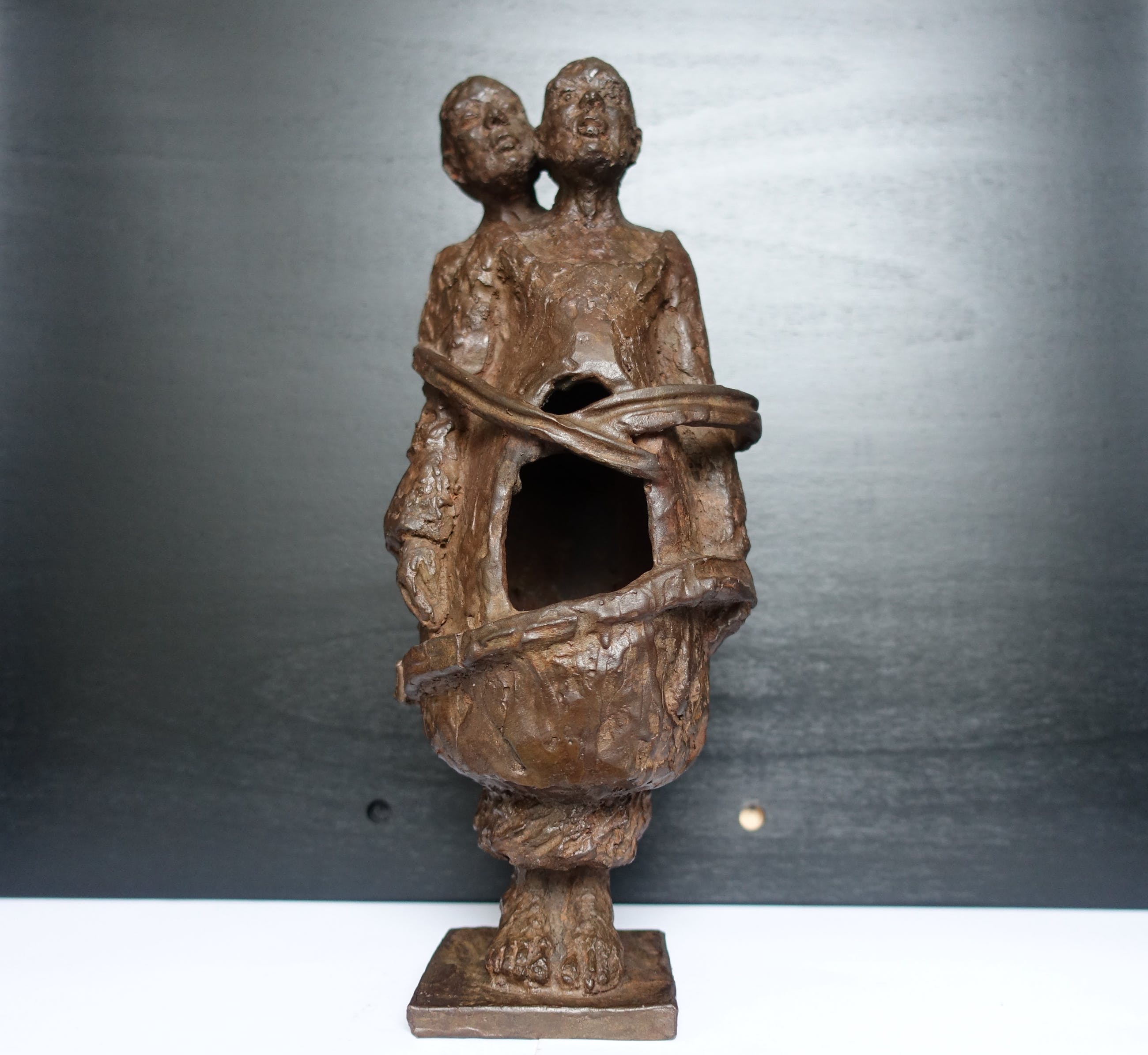 Een beeld wat hoop en verbondenheid uitstraalt in een tijd waarin afstand geboden is. Het is een zwaar beeld, 7 kg! Het beeld is gesigneerd M v P (??)