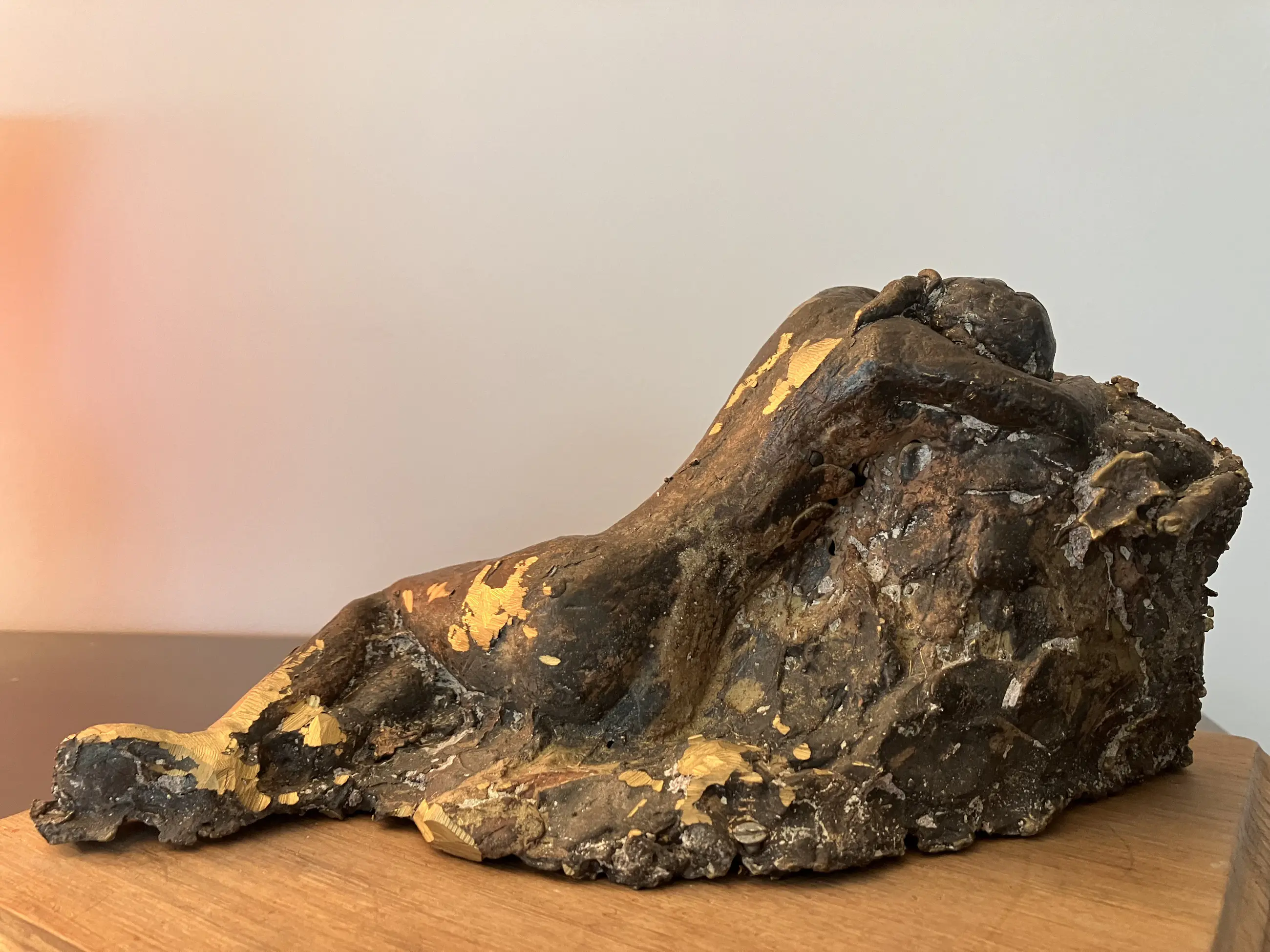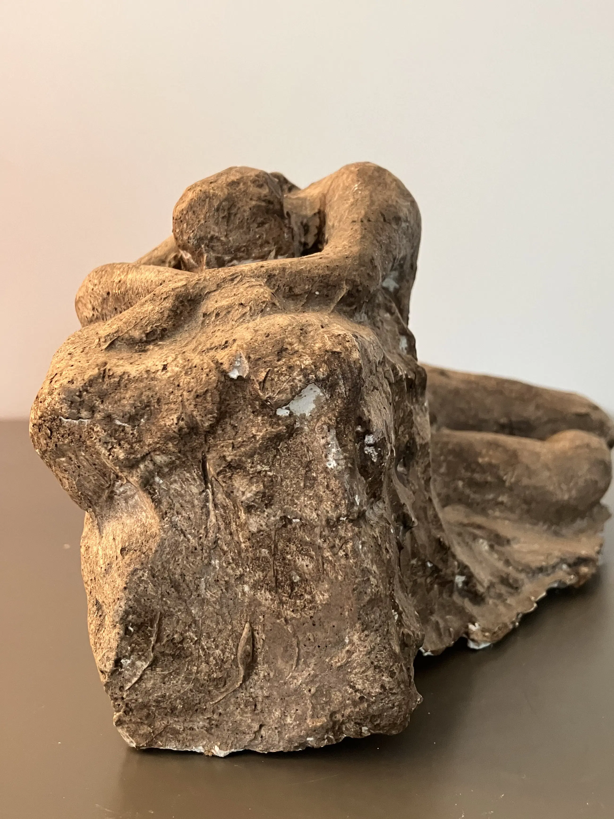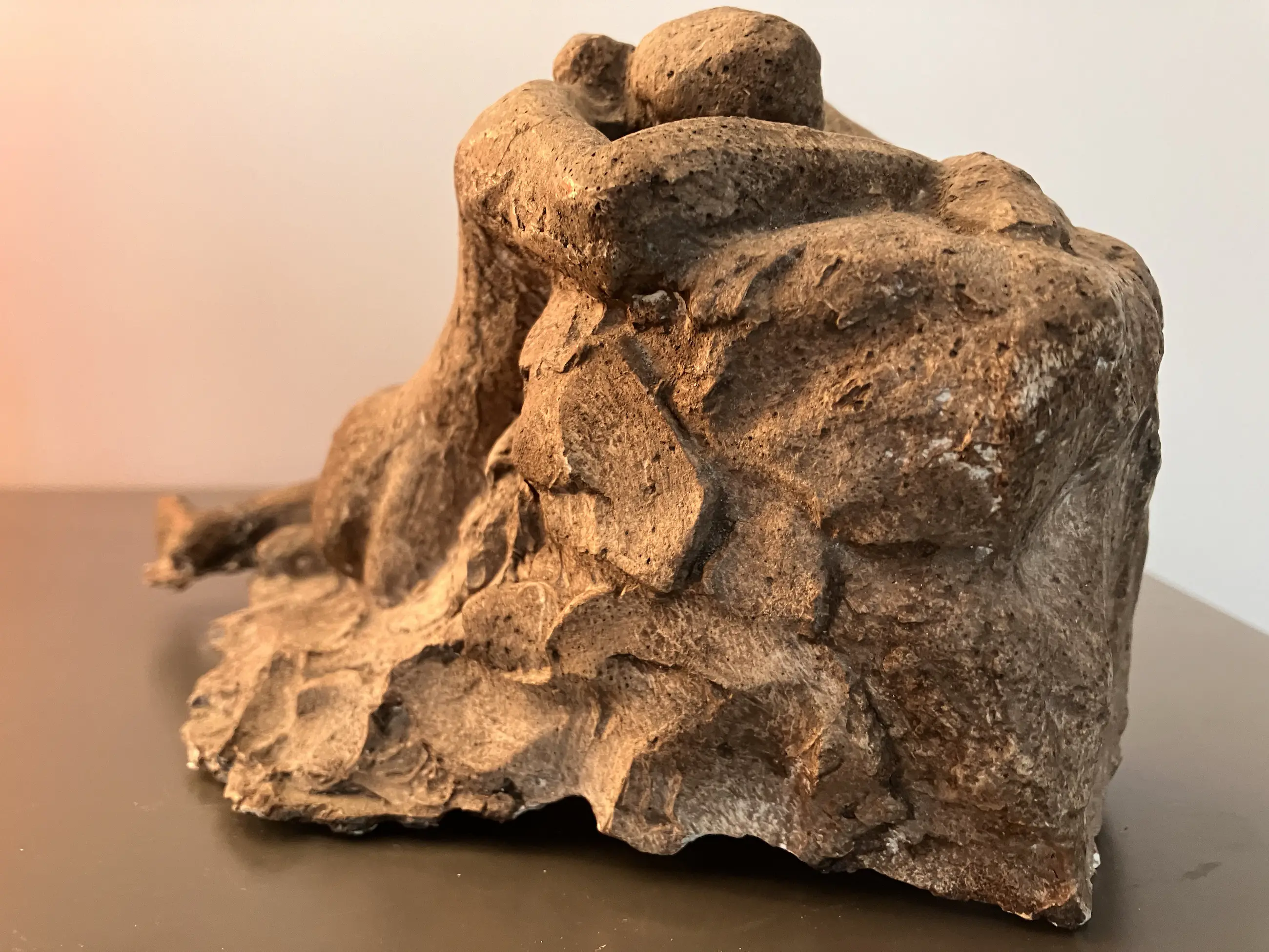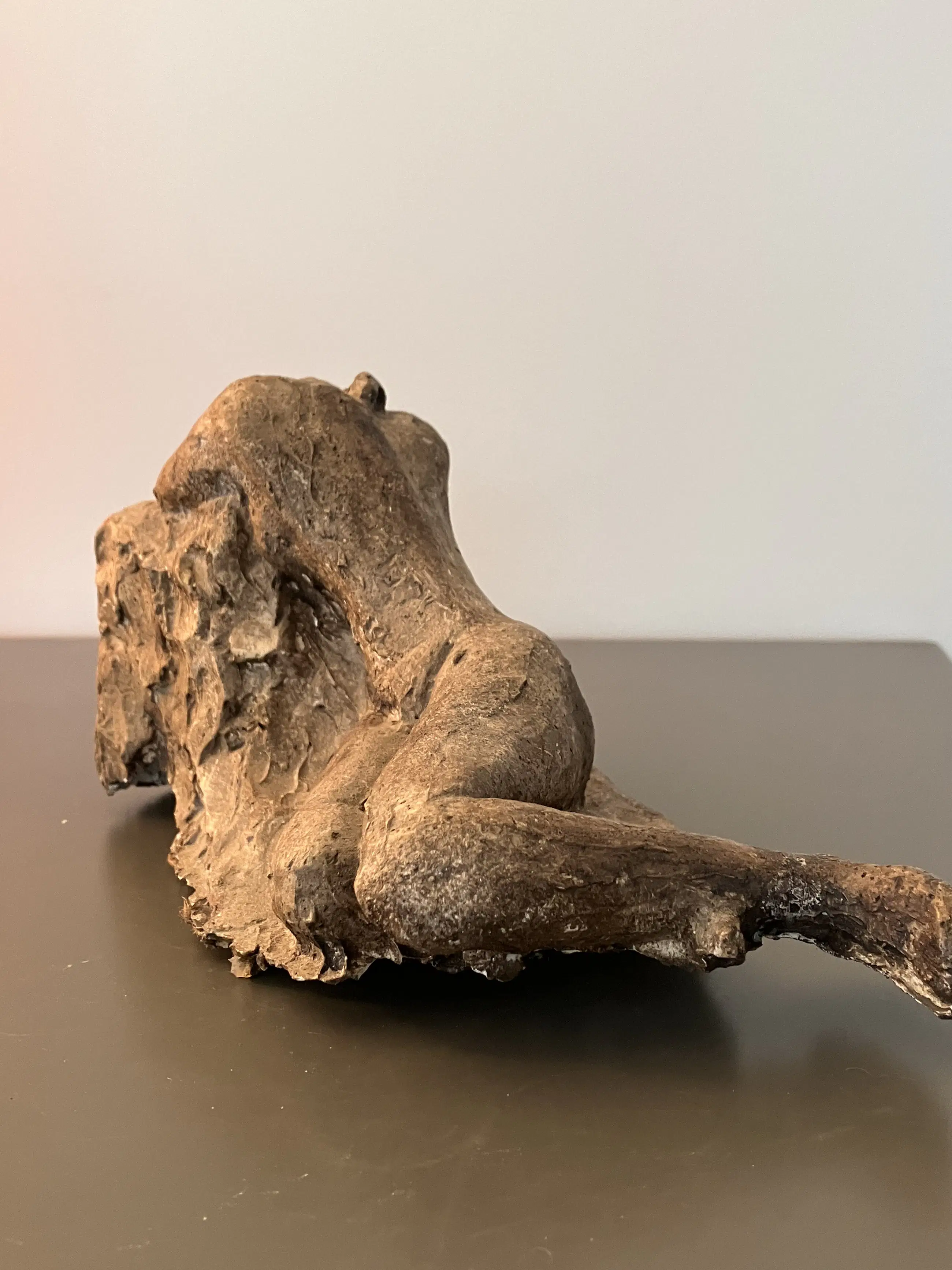 Zwaar en ruw is dit beeld mogelijk geïnspireerd door Le Danaide van Auguste Rodin Vrouw liggend tegen een rots bevestigd op een eiken plateau Foto 1 tot en met 7