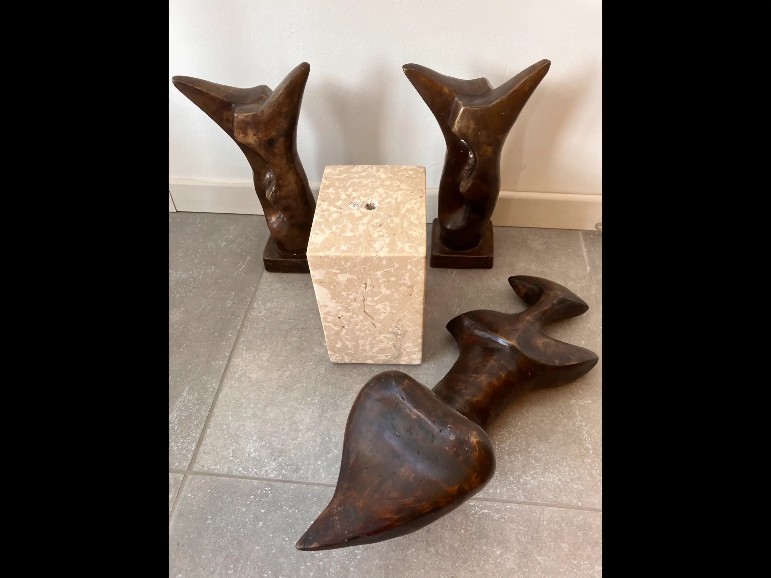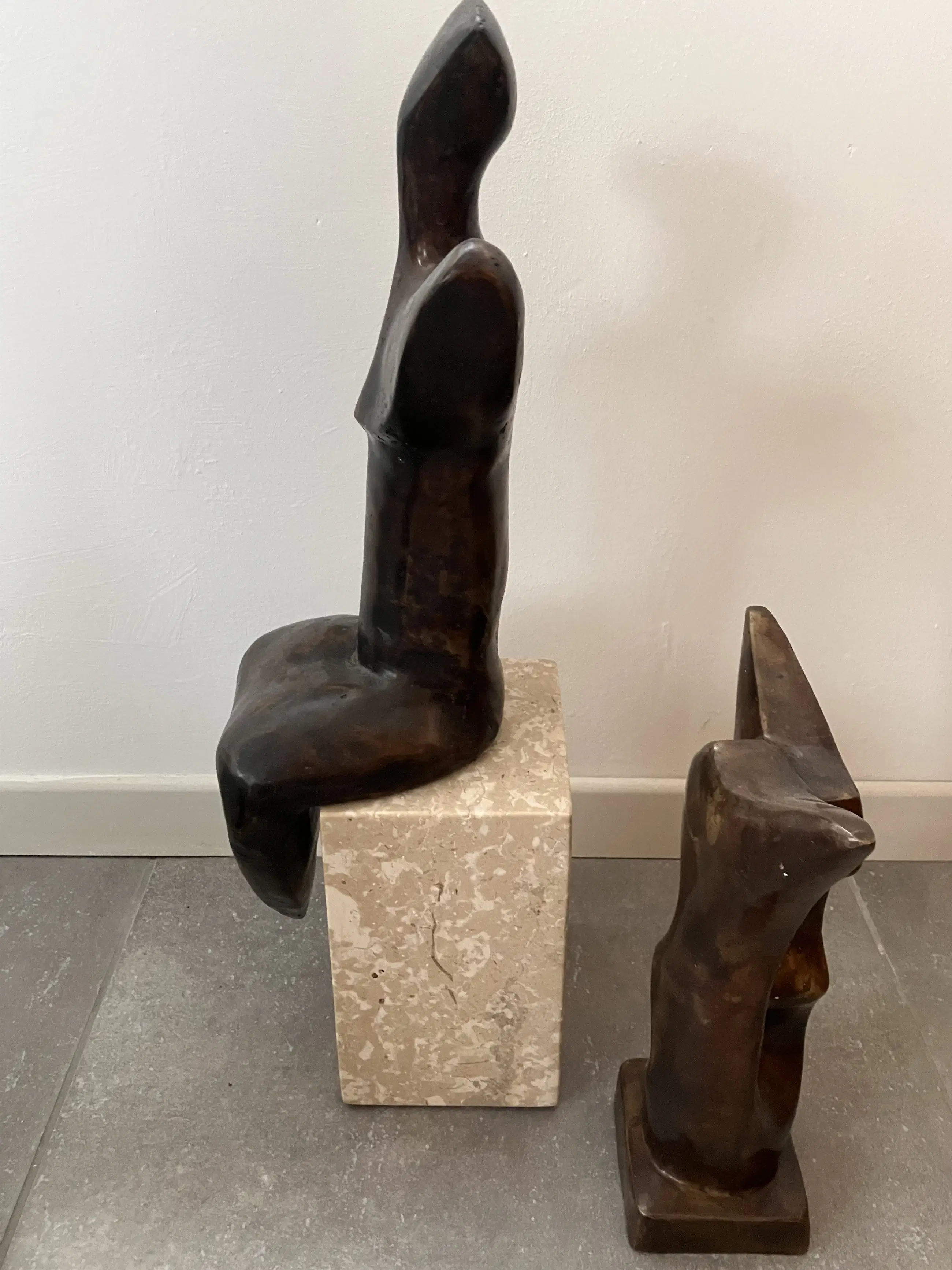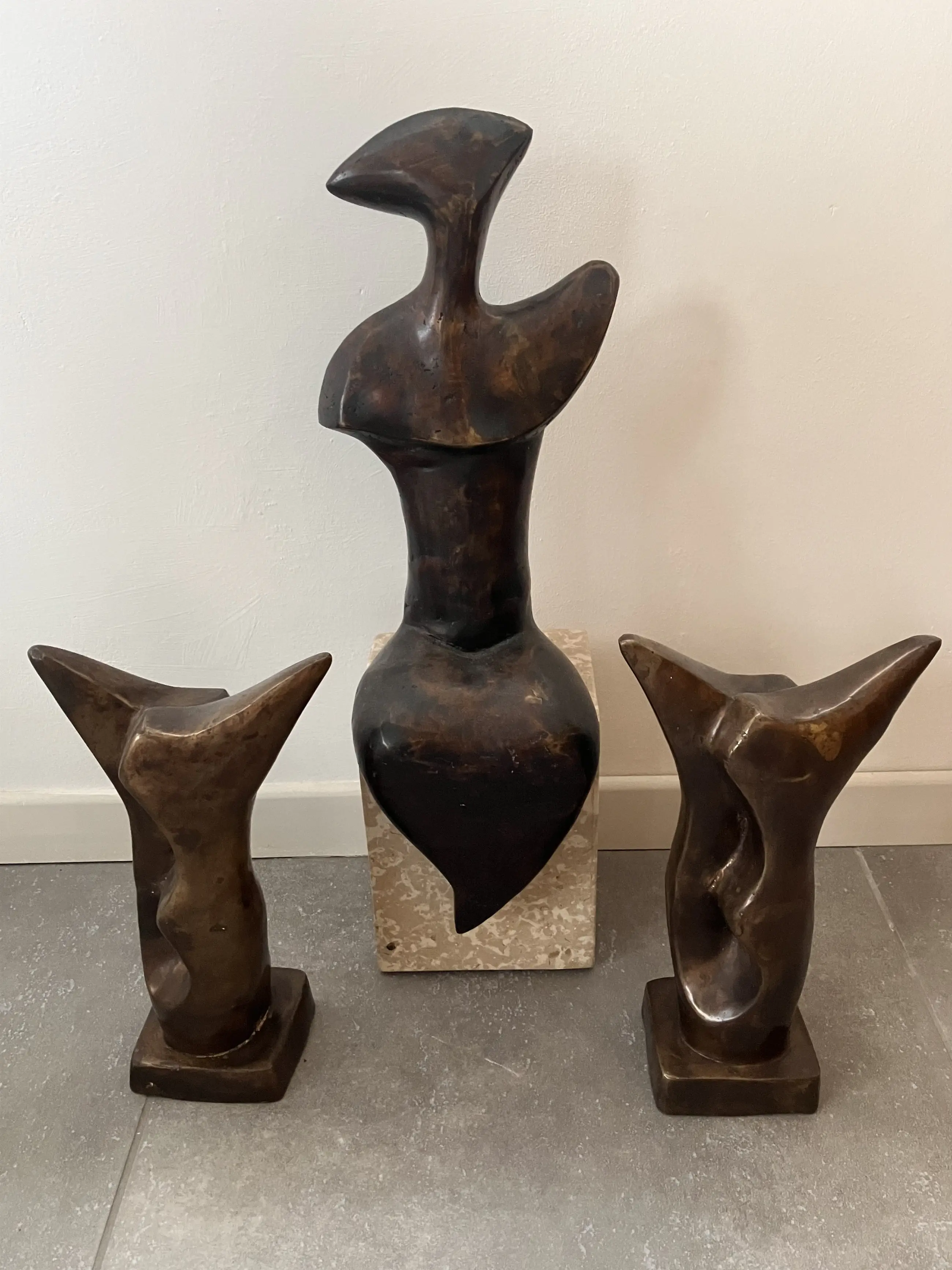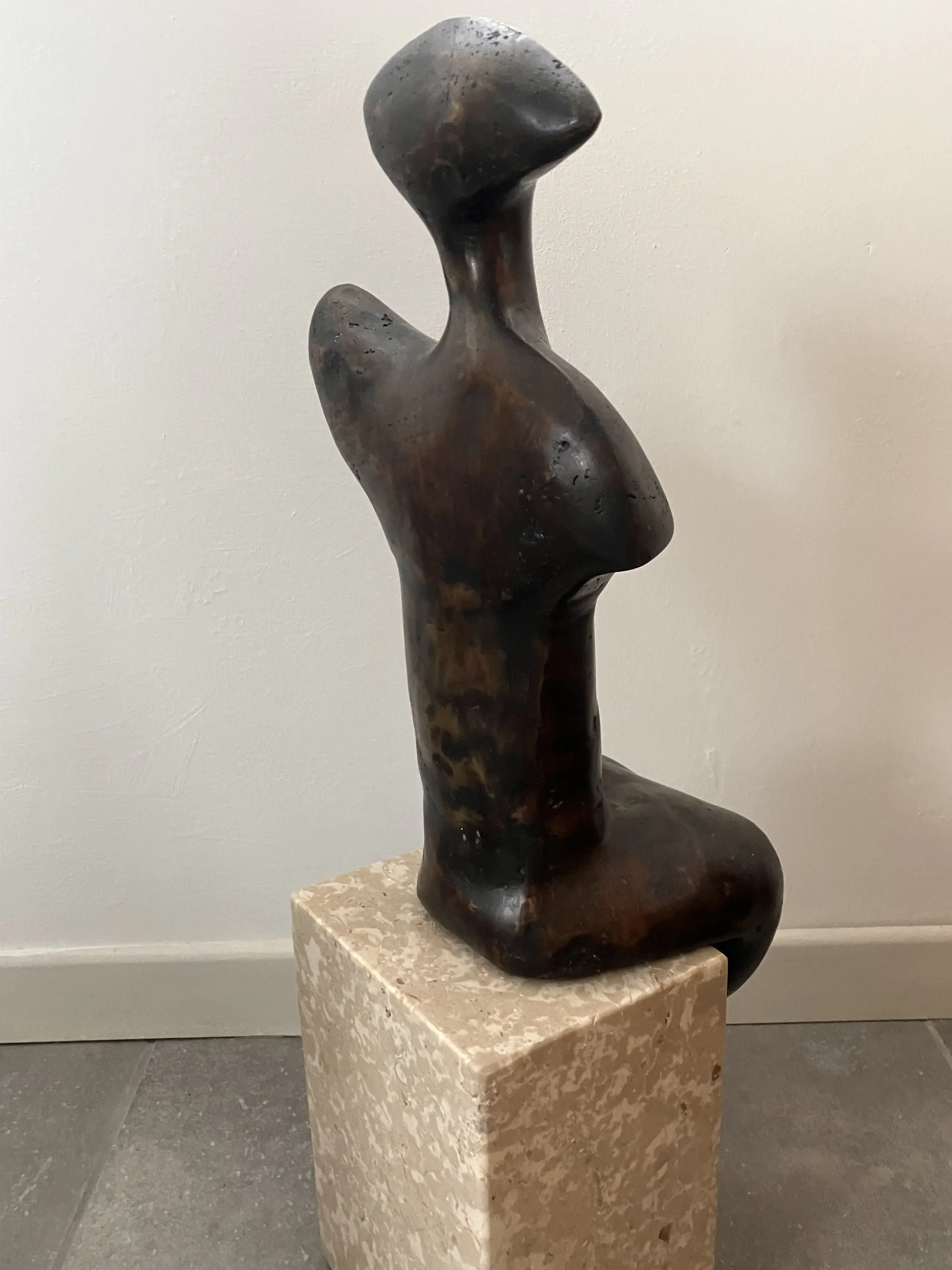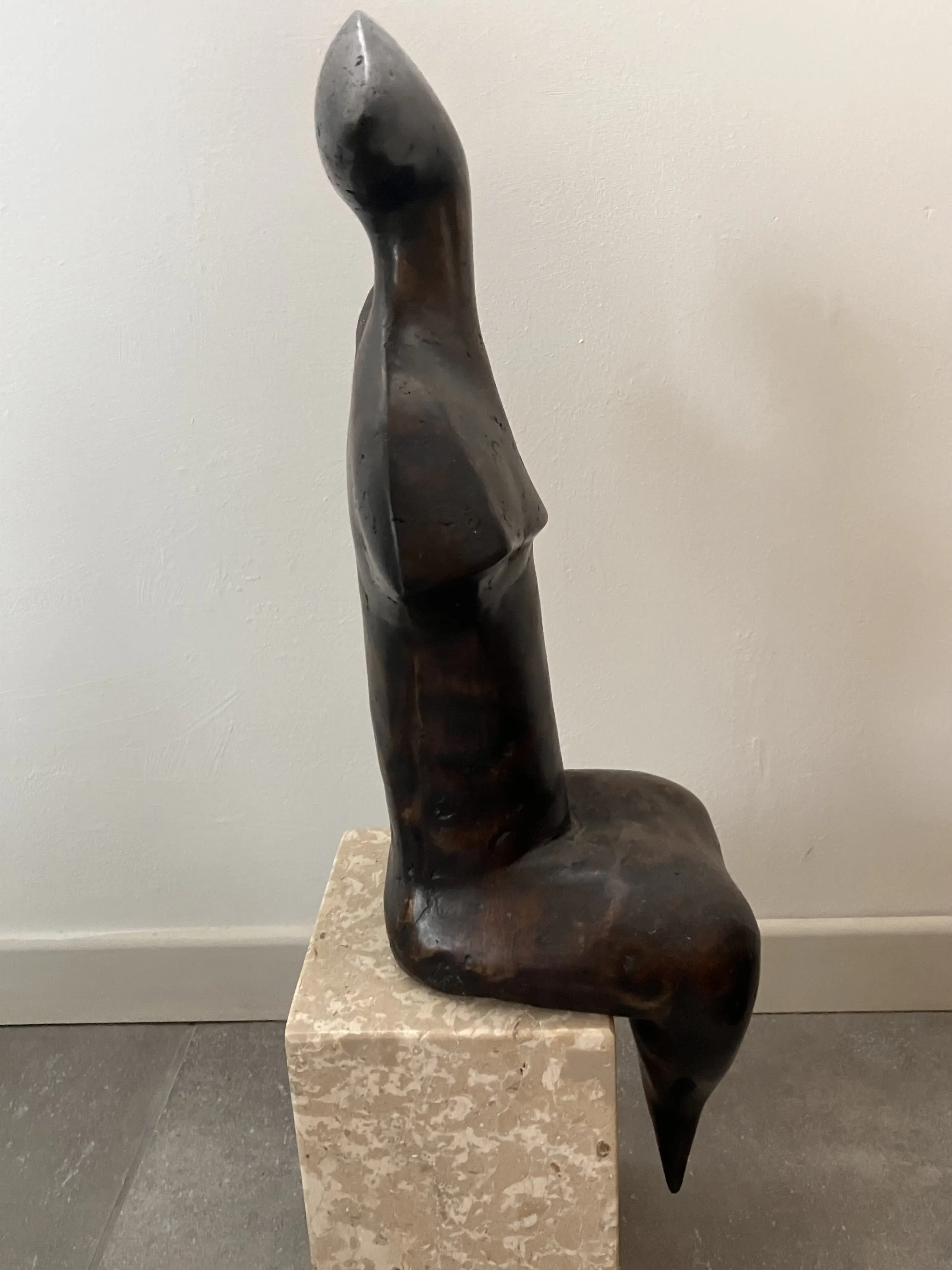 Semi abstract beeld van zittende vrouw op natuurstenen sokkel bijgestaan door twee wachters.