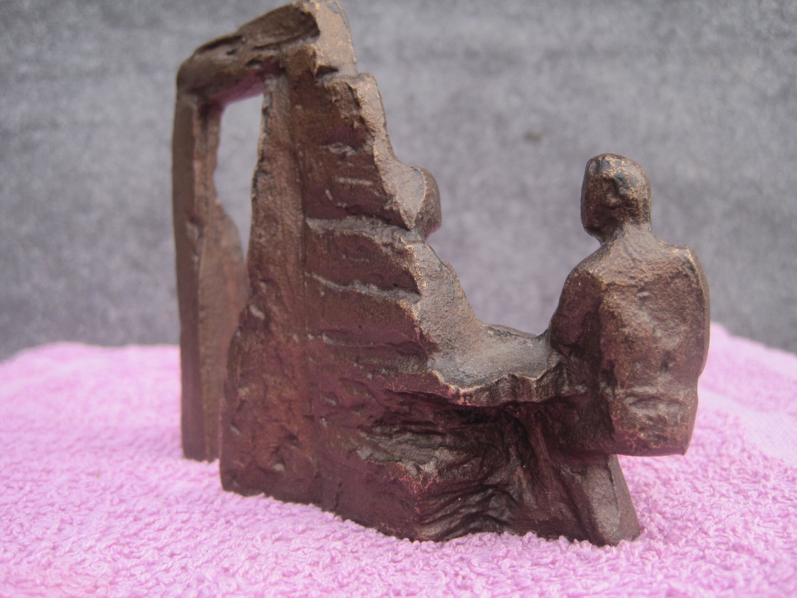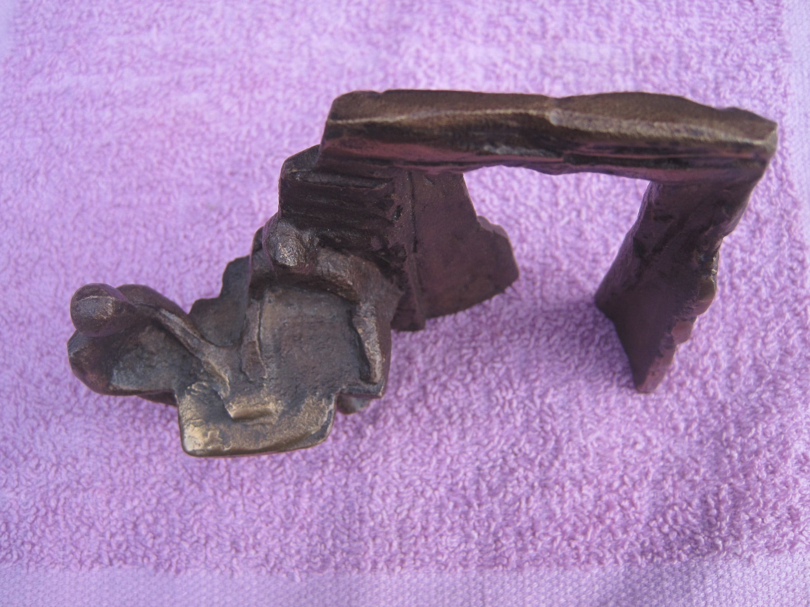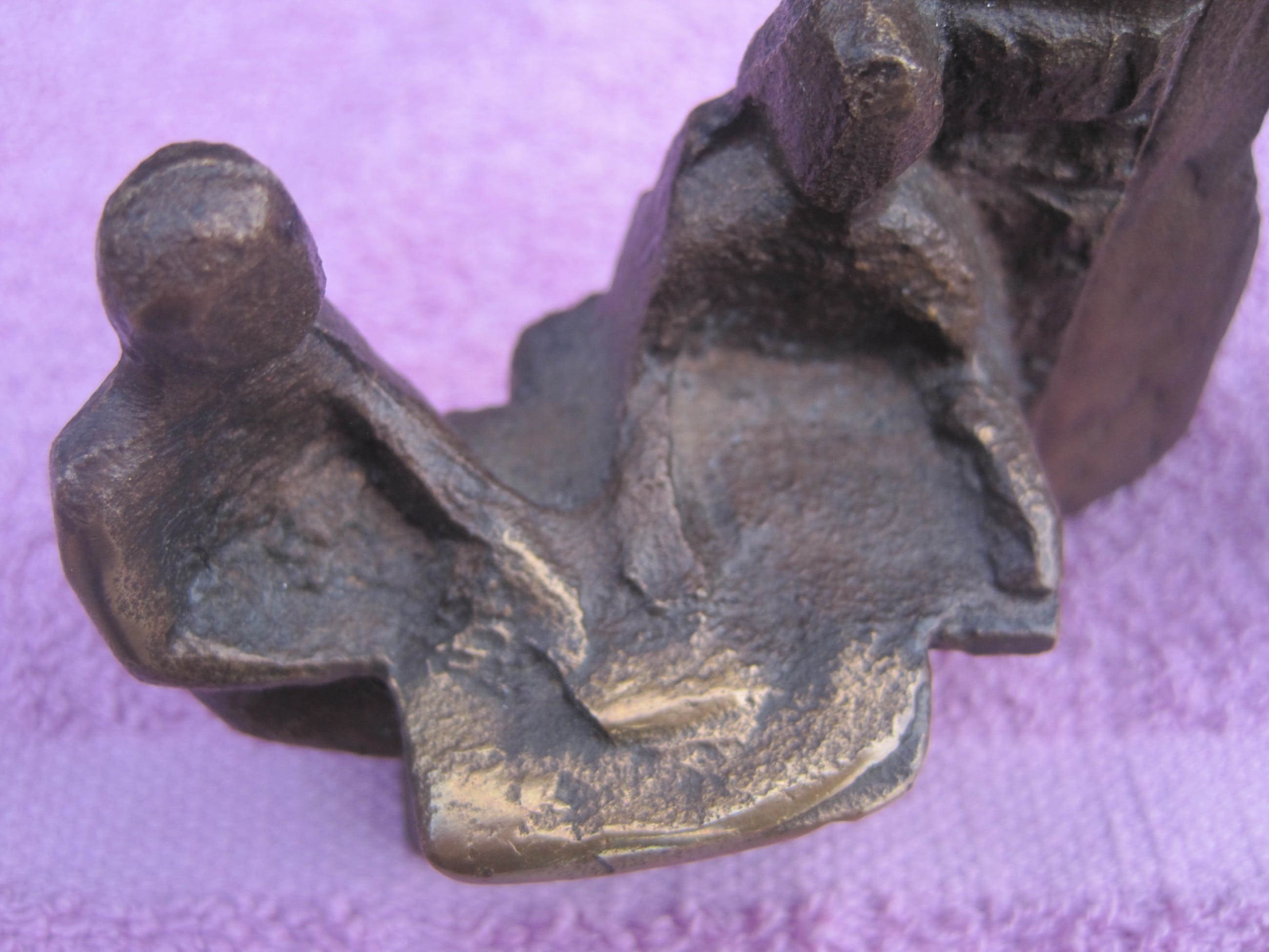 Een mooi abstract bronzen beeldje van twee personen zittend naast een poort, een doorgang. Jammer genoeg niet gesigneerd. Wie weet wie de kunstenaar is, mag mij mailen. Het beeldje is zwaar voor het formaat.