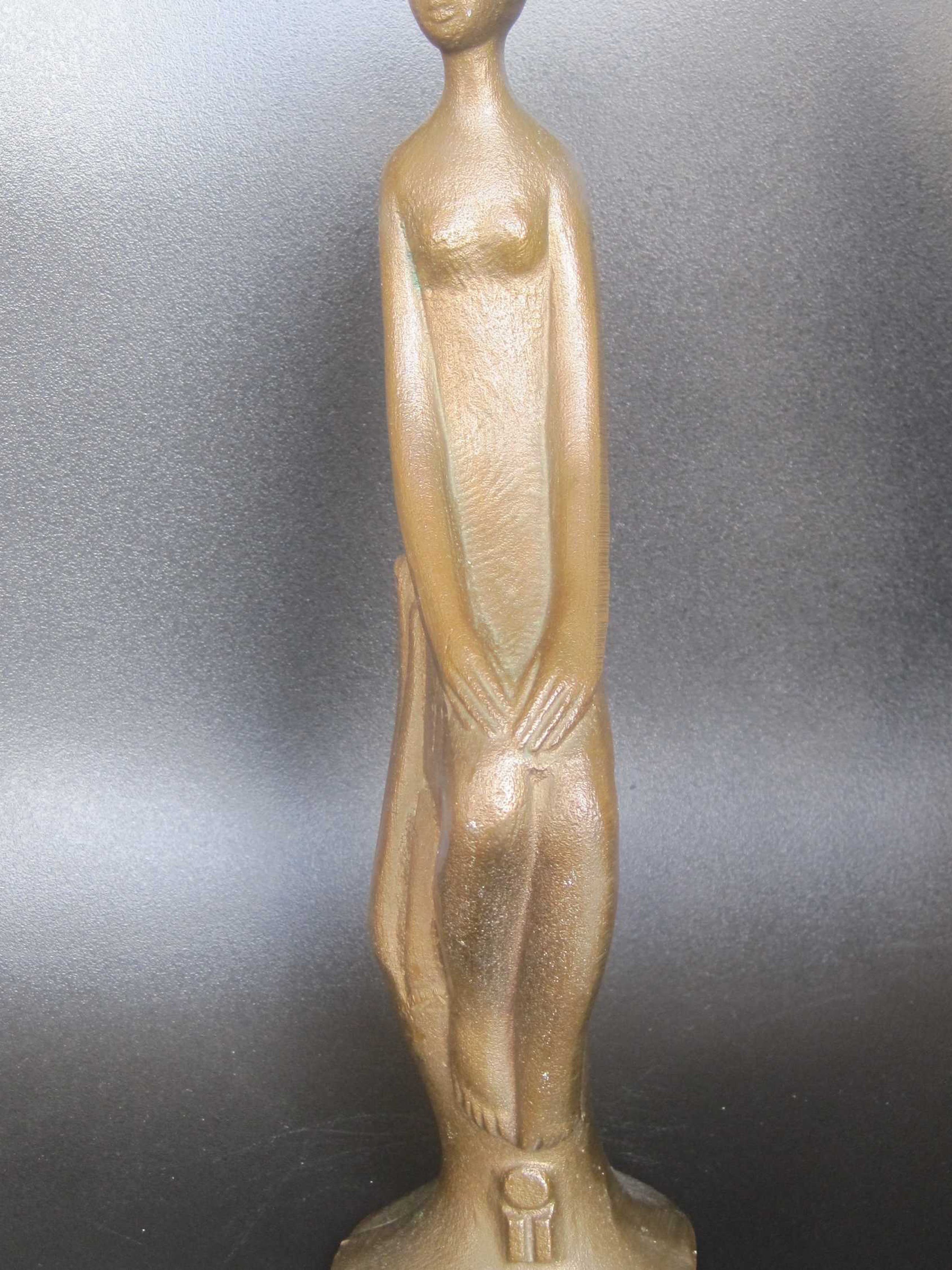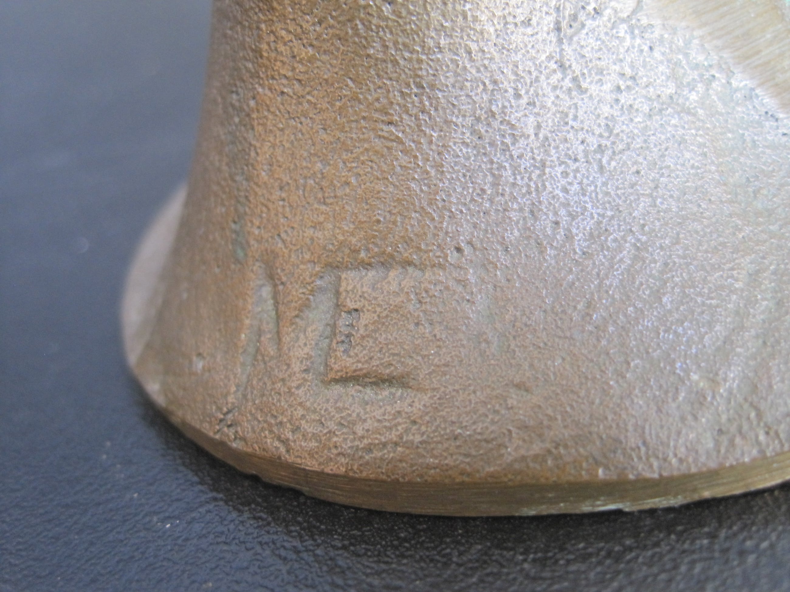 Massief bronzen beeld gesigneerd MC of ME.Voorzijde voorzien van een soort logo.Dit beeld is in de jaren 70 gegoten bij de gieterij Vulcain in Aalst België. De eigenaar was een kunstliefhebber en beeldhouwers konden daar hun beelden gieten.