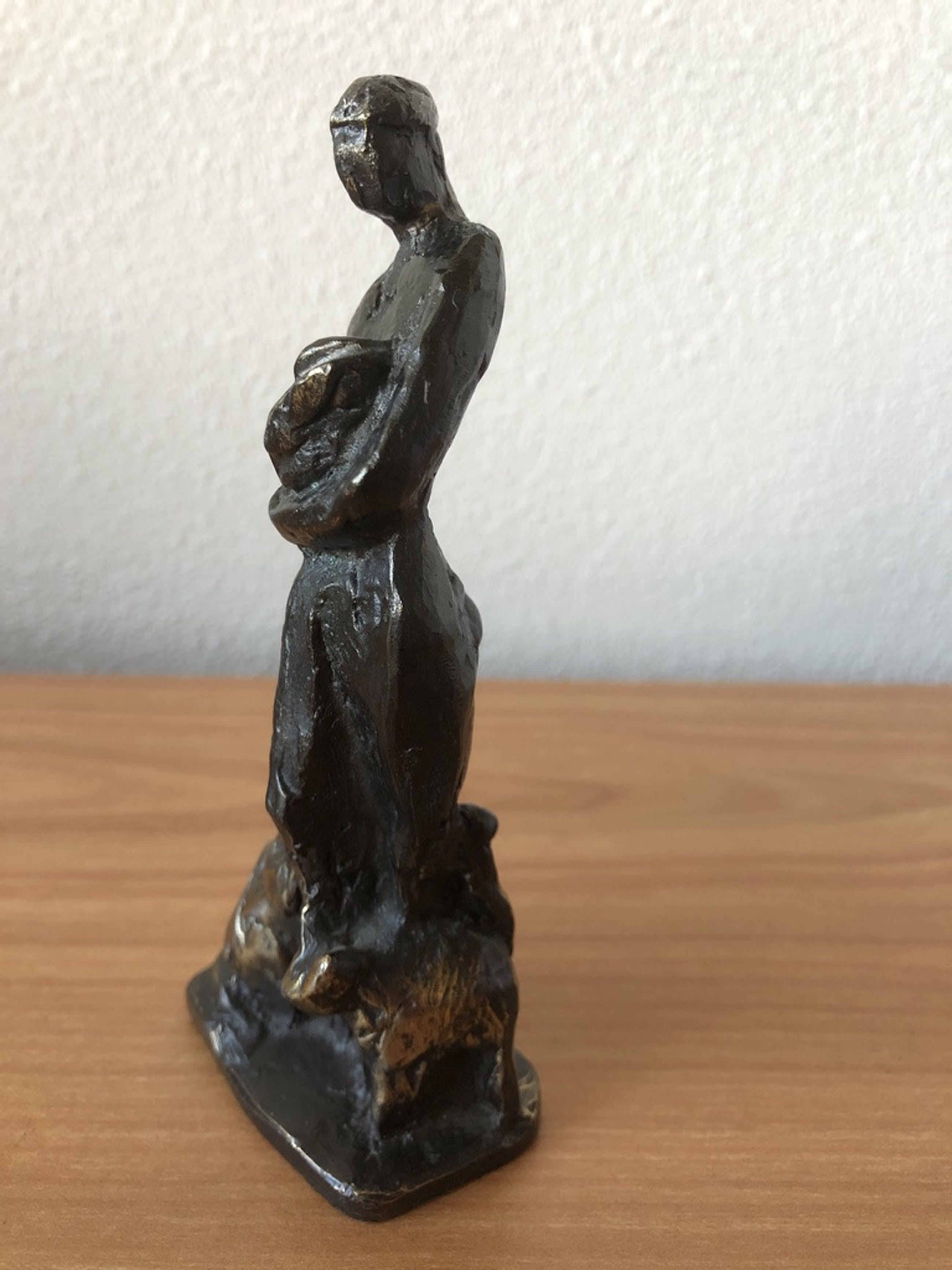 Het betreft een schitterend zwaar bronzen beeld met aan de linkerkant van het been van de man een zittende hond en aan de rechterkant een kat. In zijn hand heeft de man een konijn.
