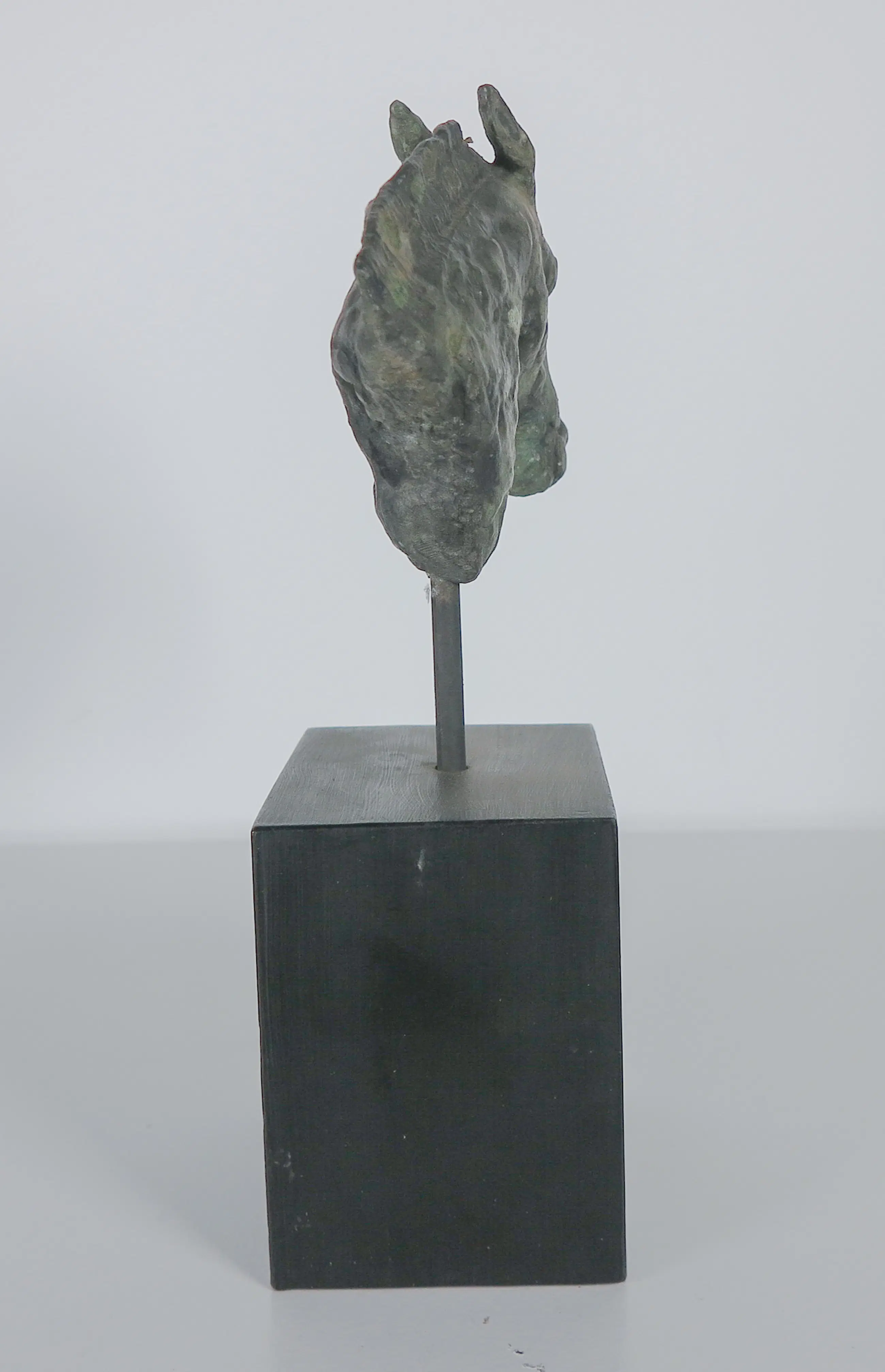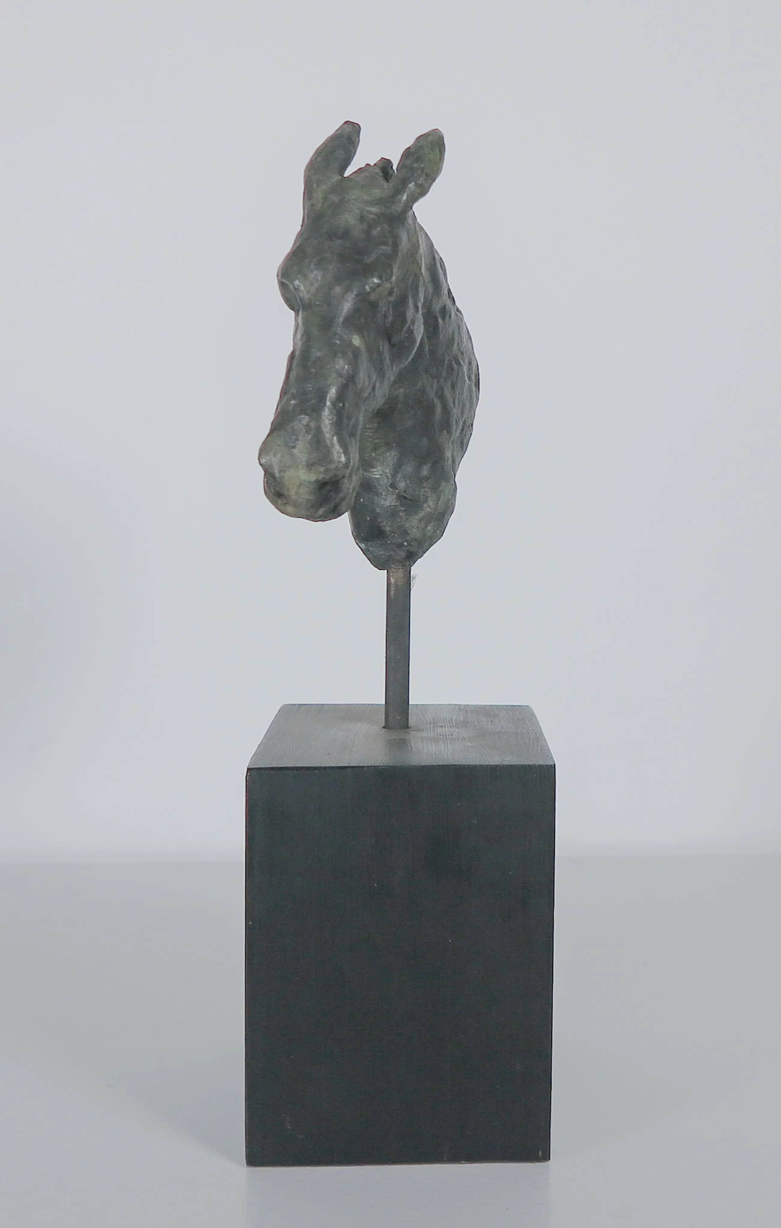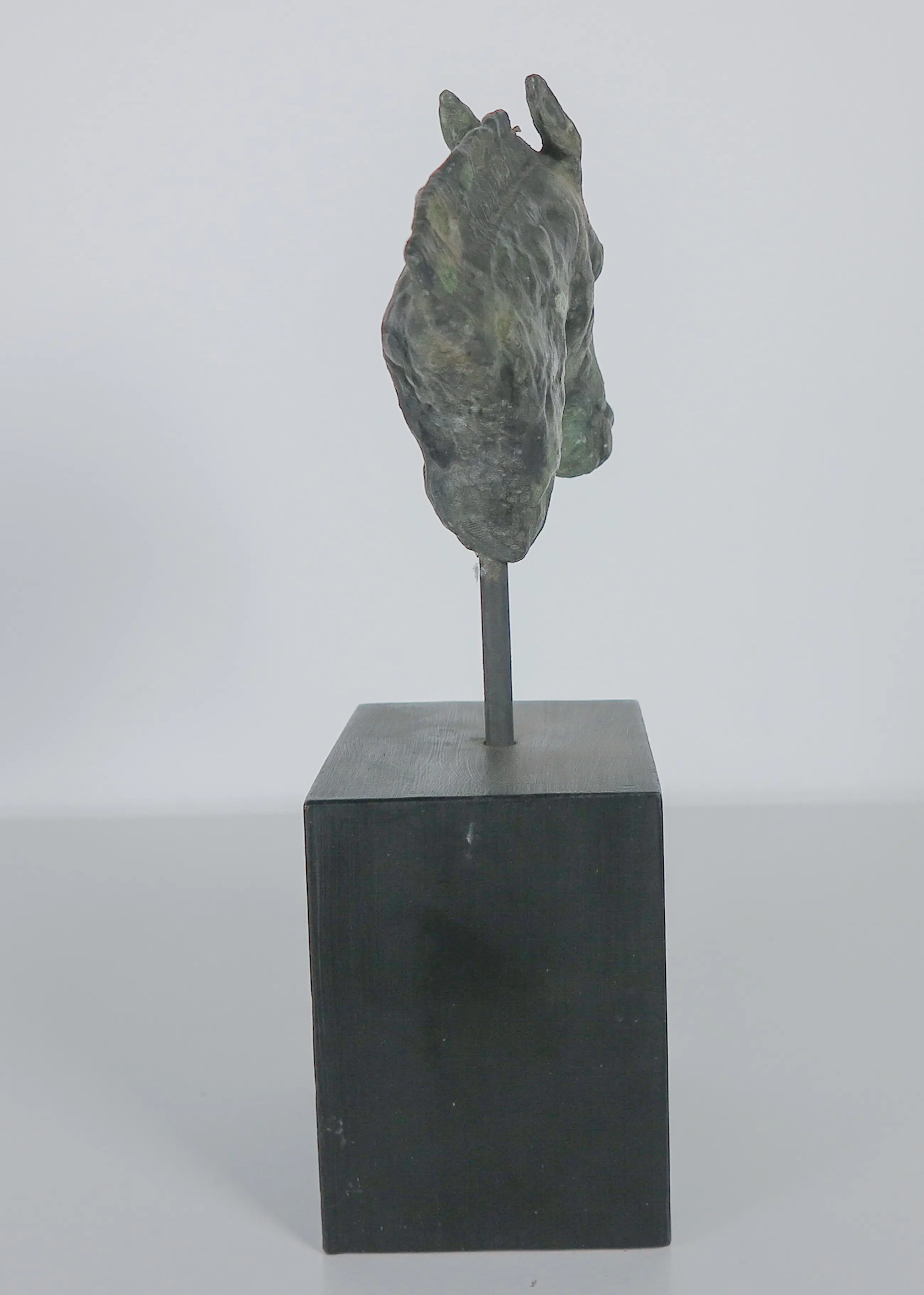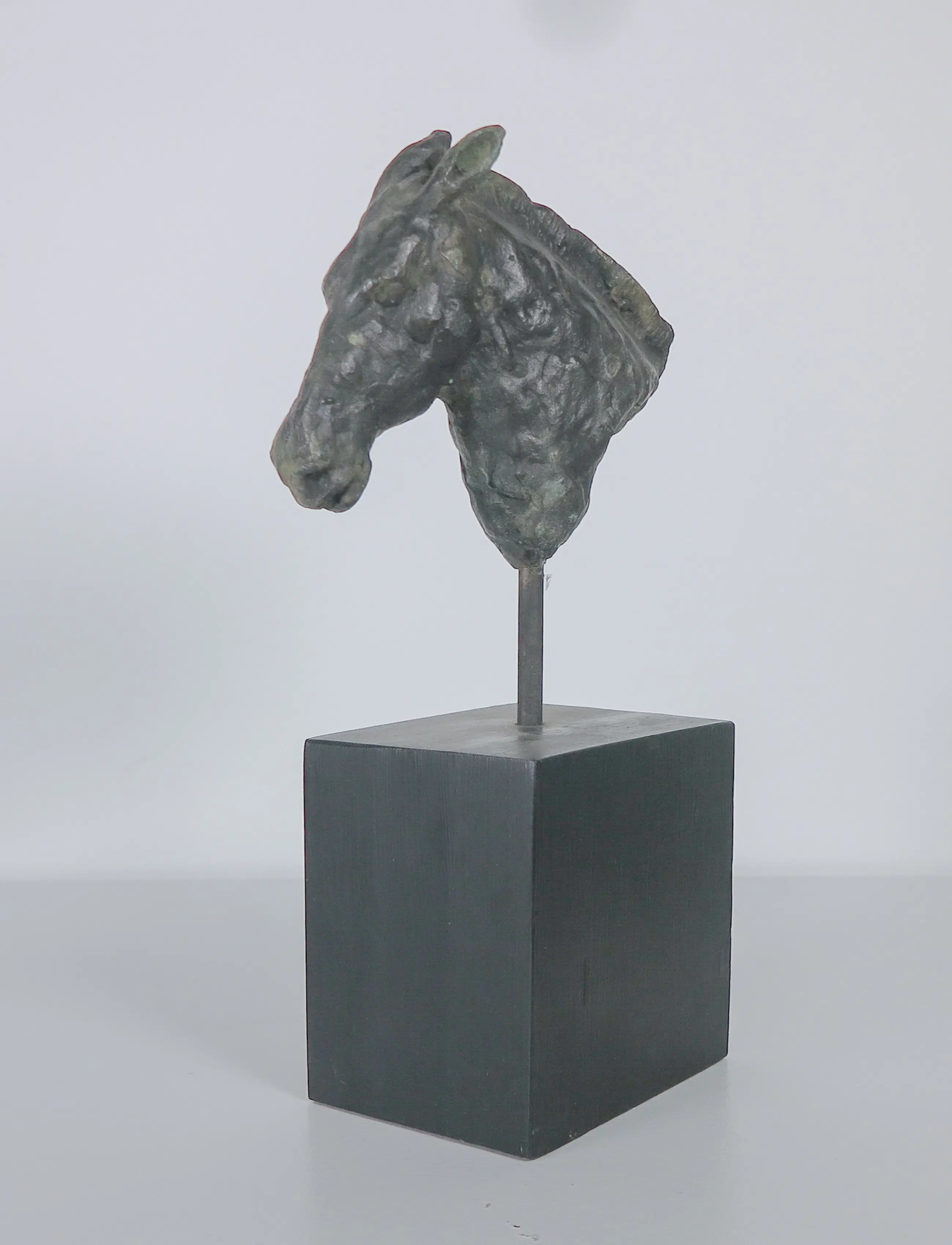 Brons paardenhoofd op een pin en houten sokkel.