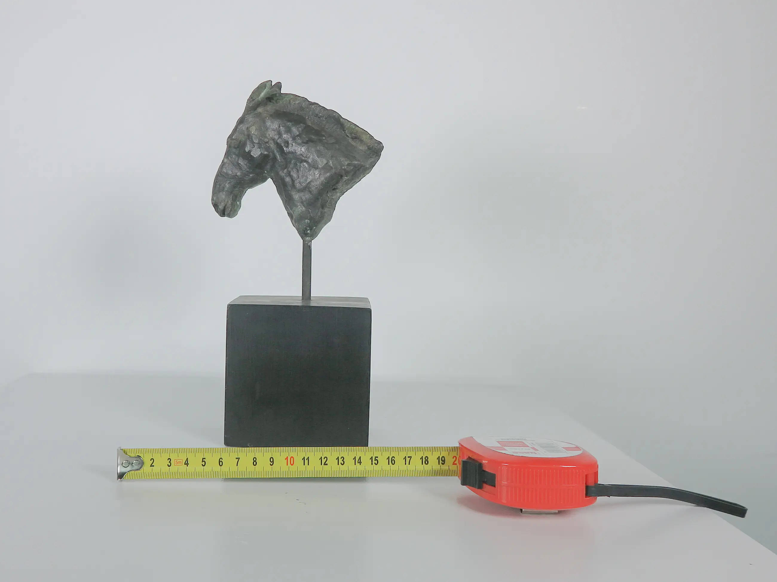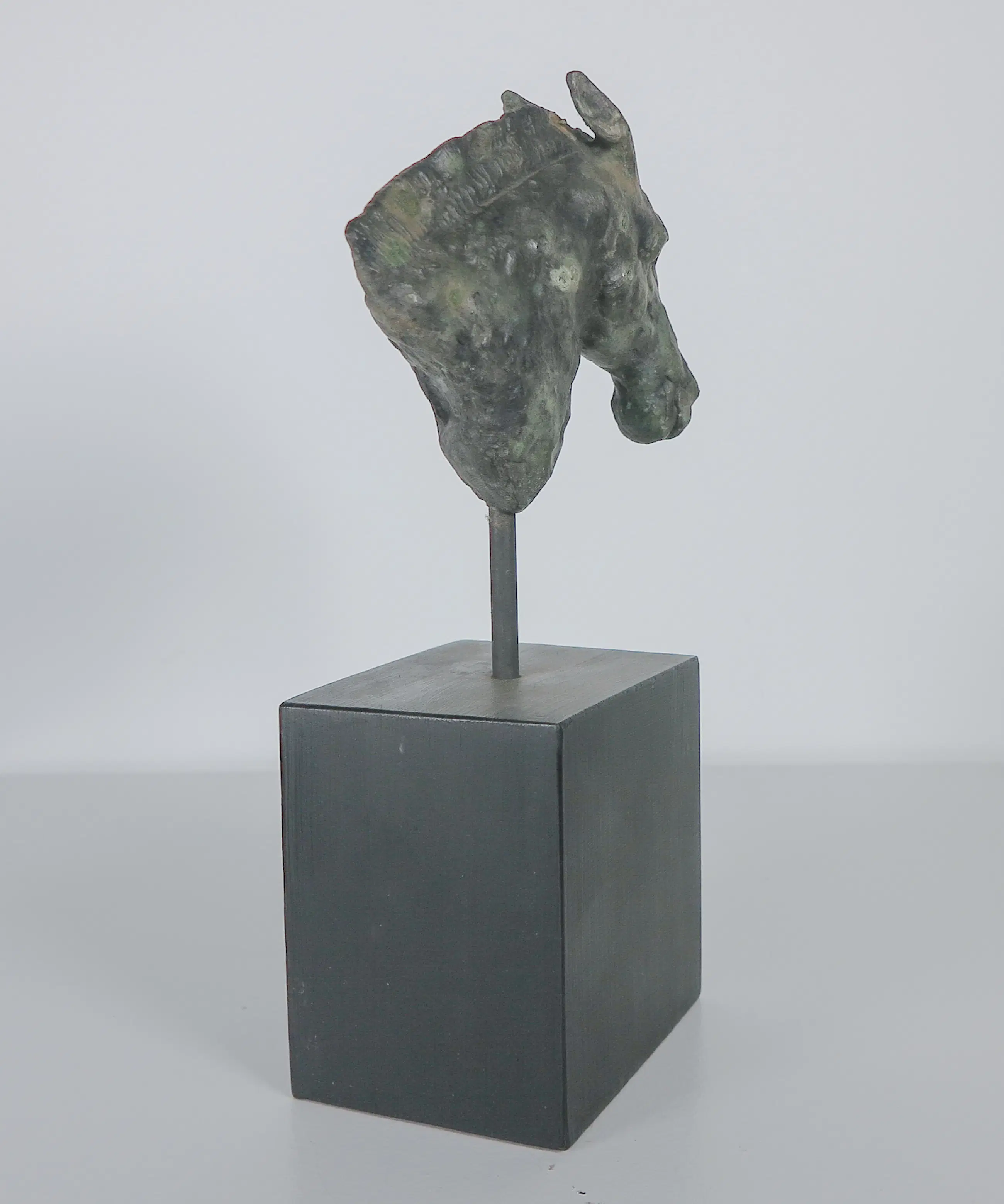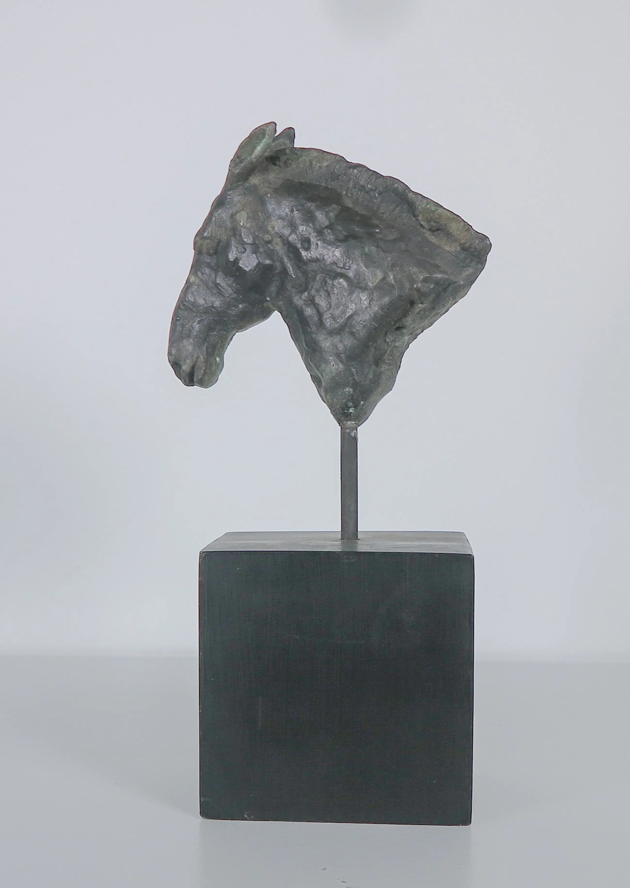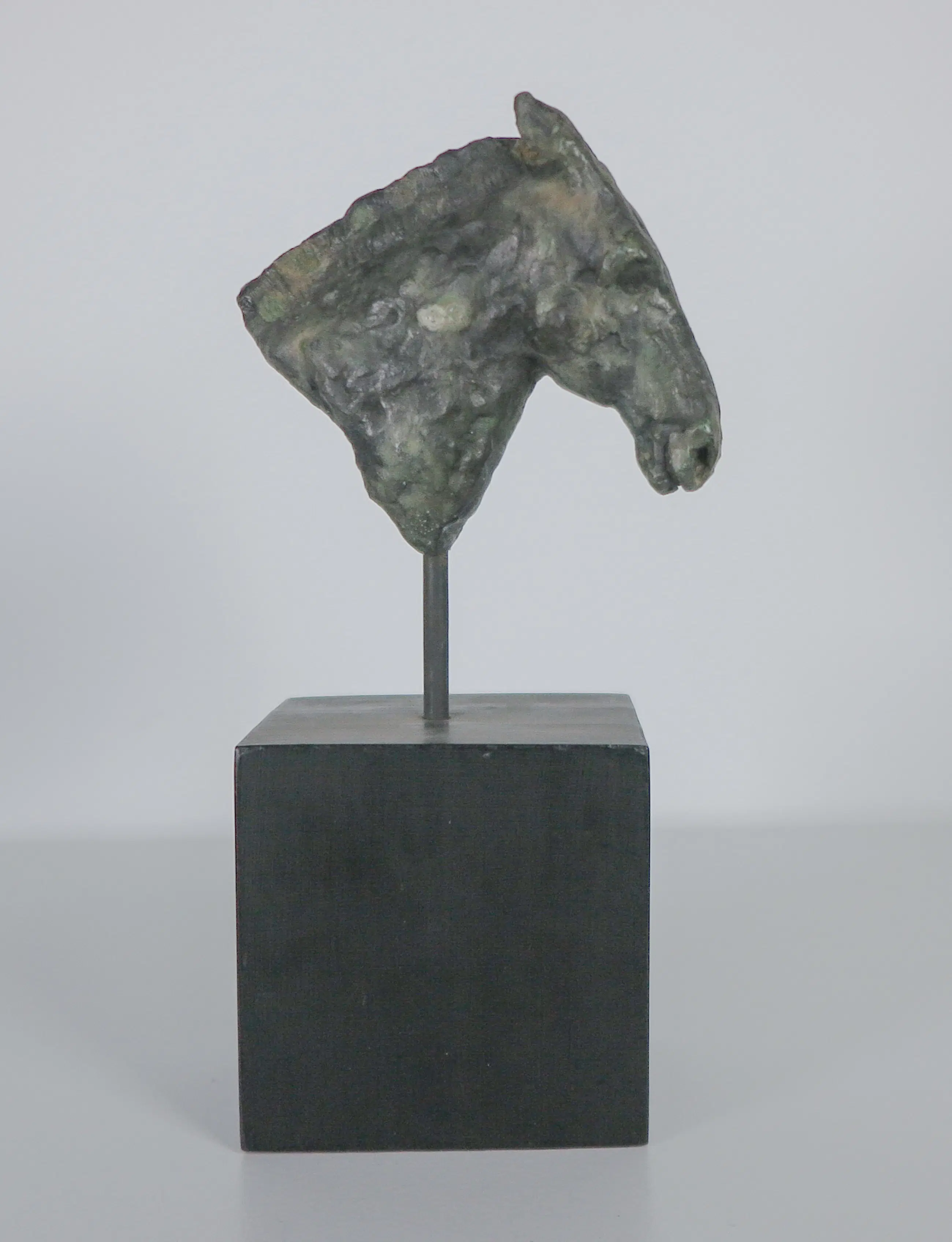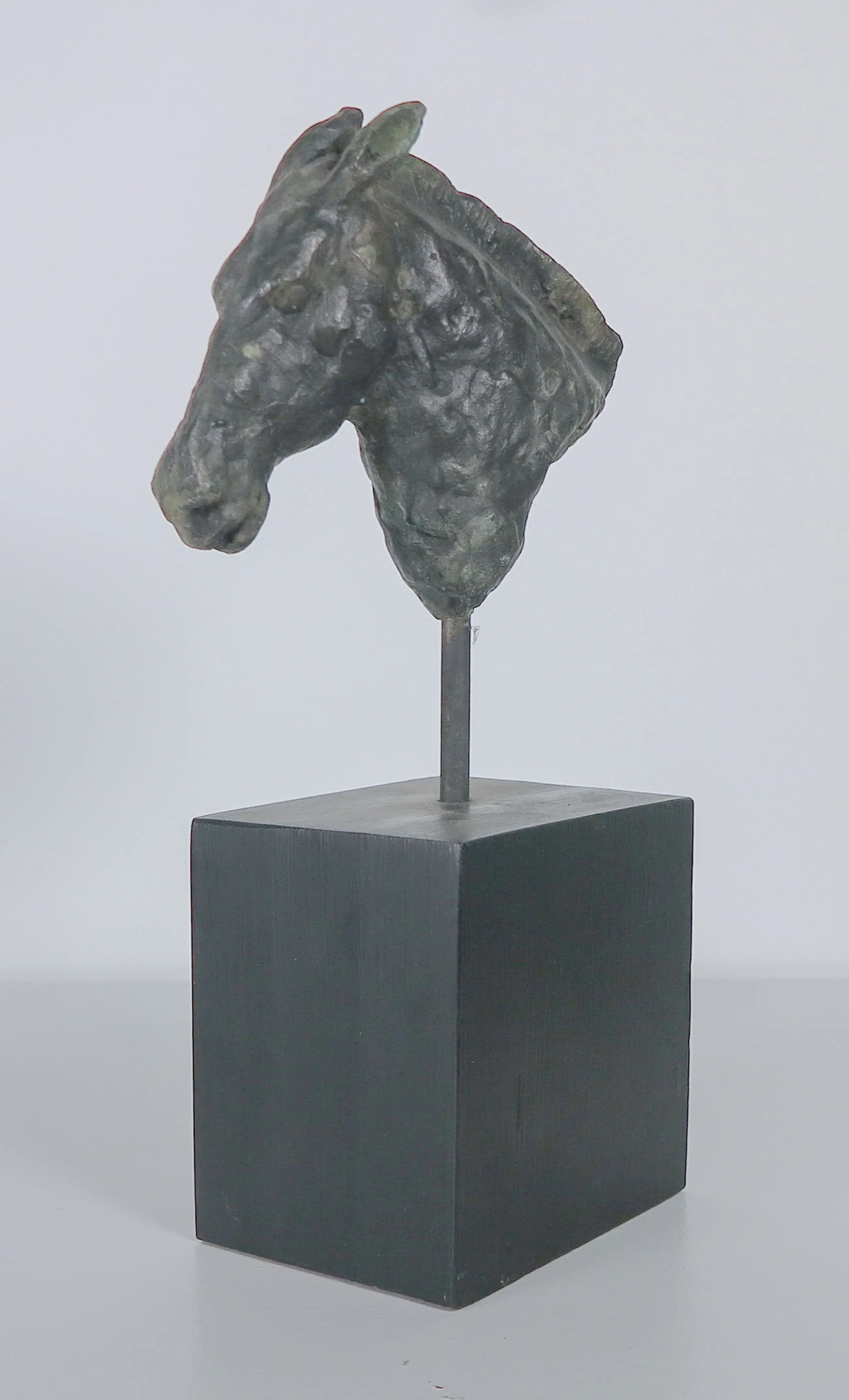 Brons paardenhoofd op een pin en houten sokkel.