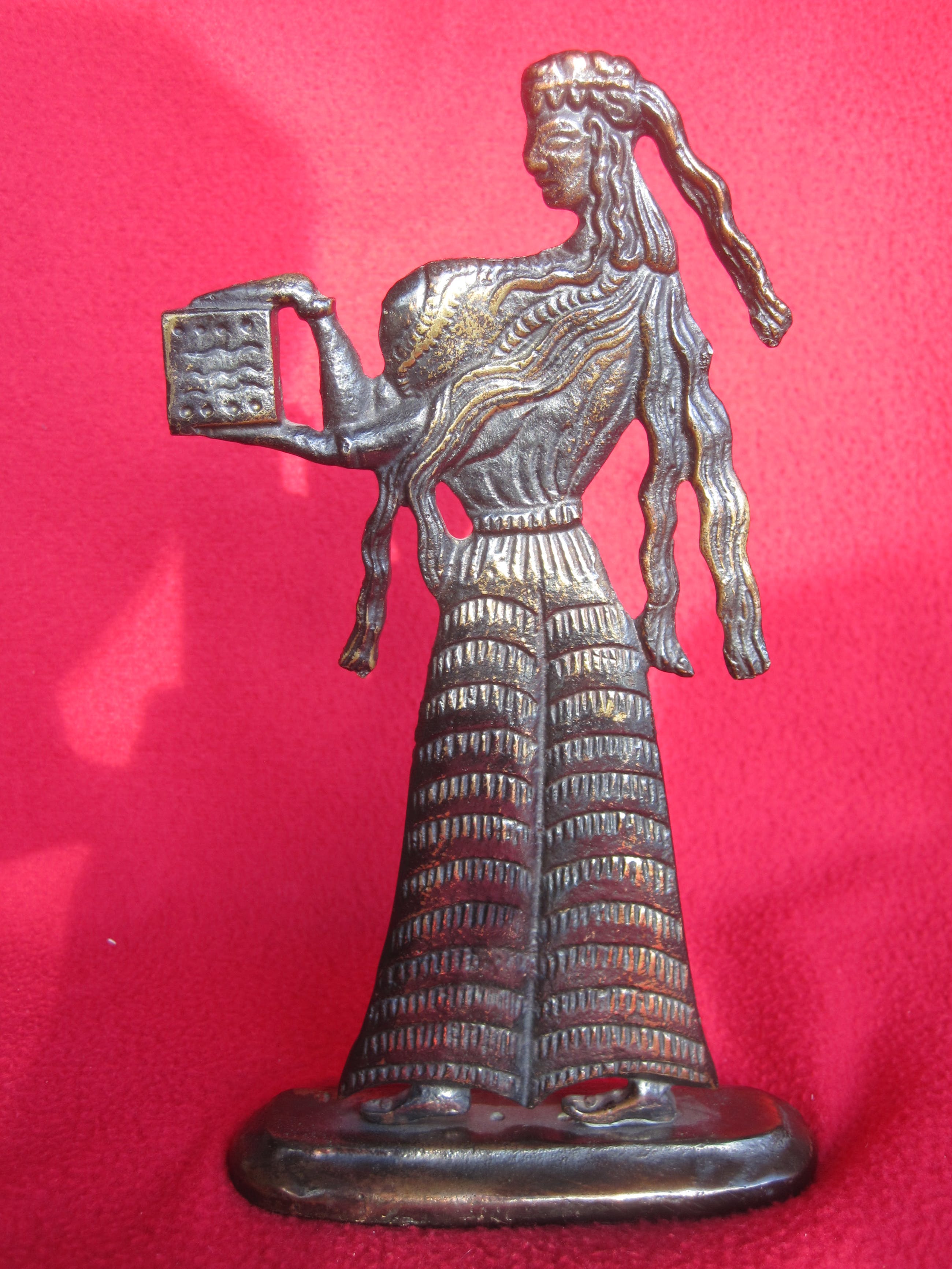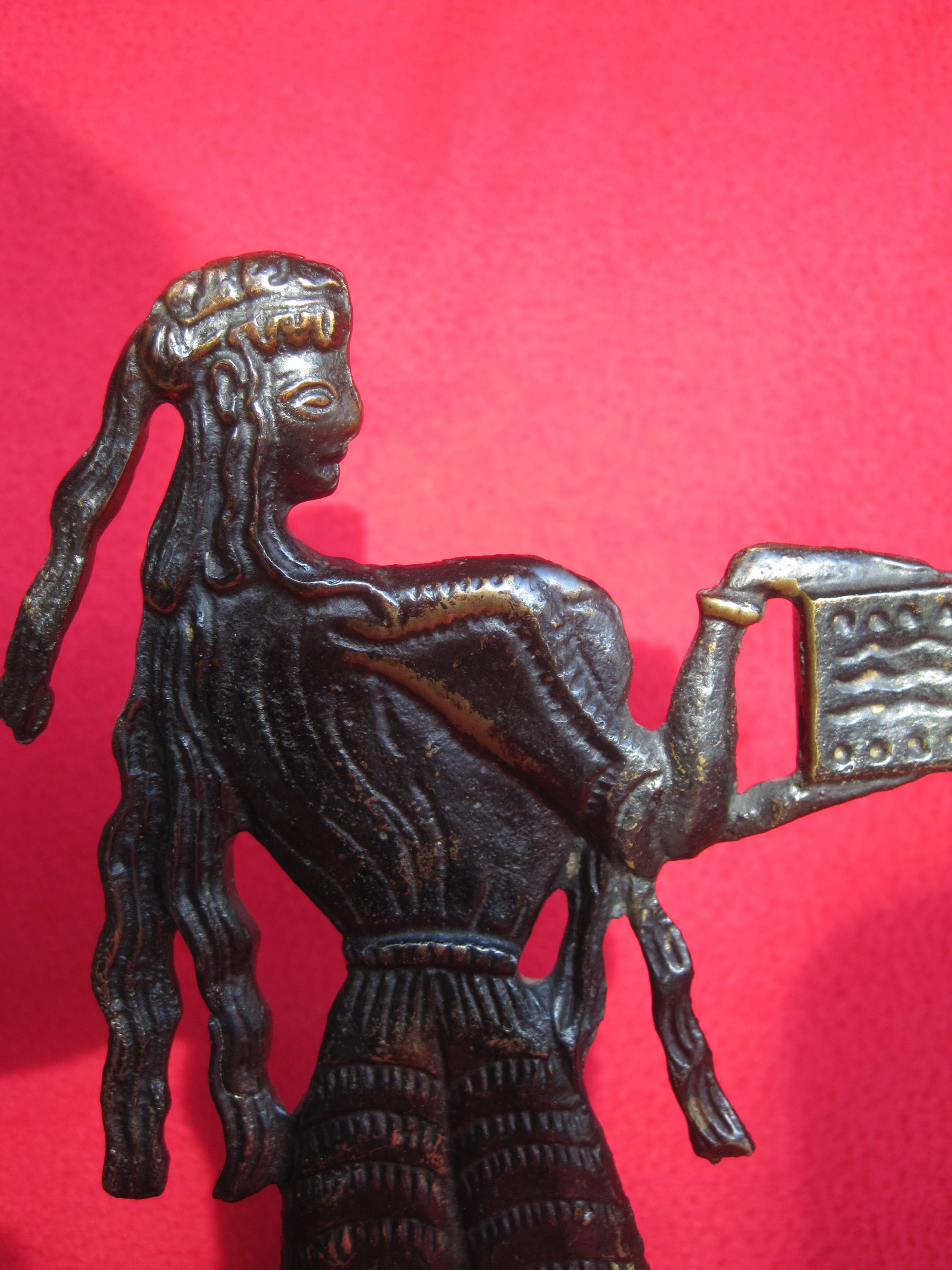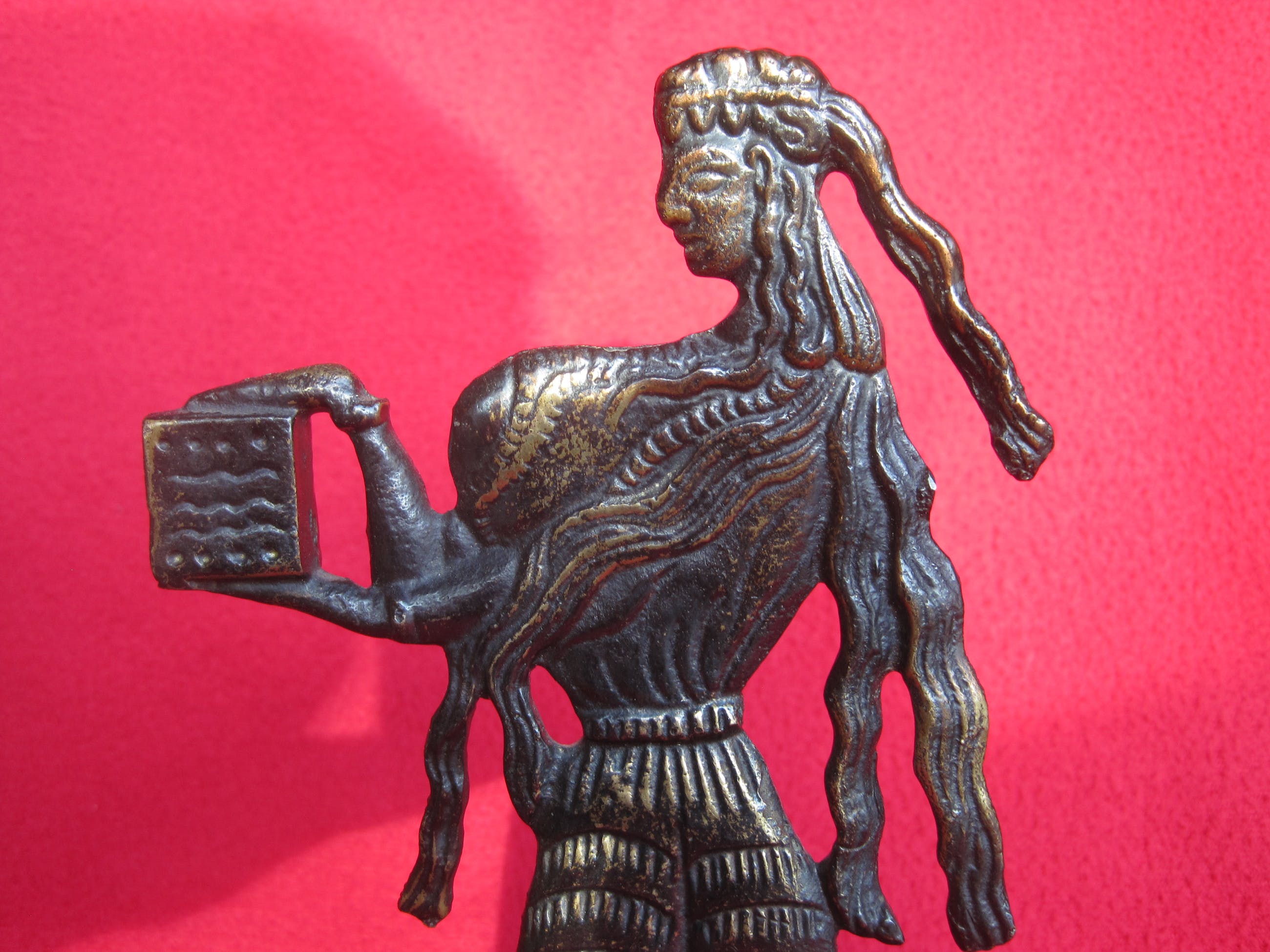 Een licht surrealistisch bronzen beeld van een vrouw met een doos in haar handen. Het beeld bestaat uit 2 delen: de sokkel zit aan het beeld geschroefd.