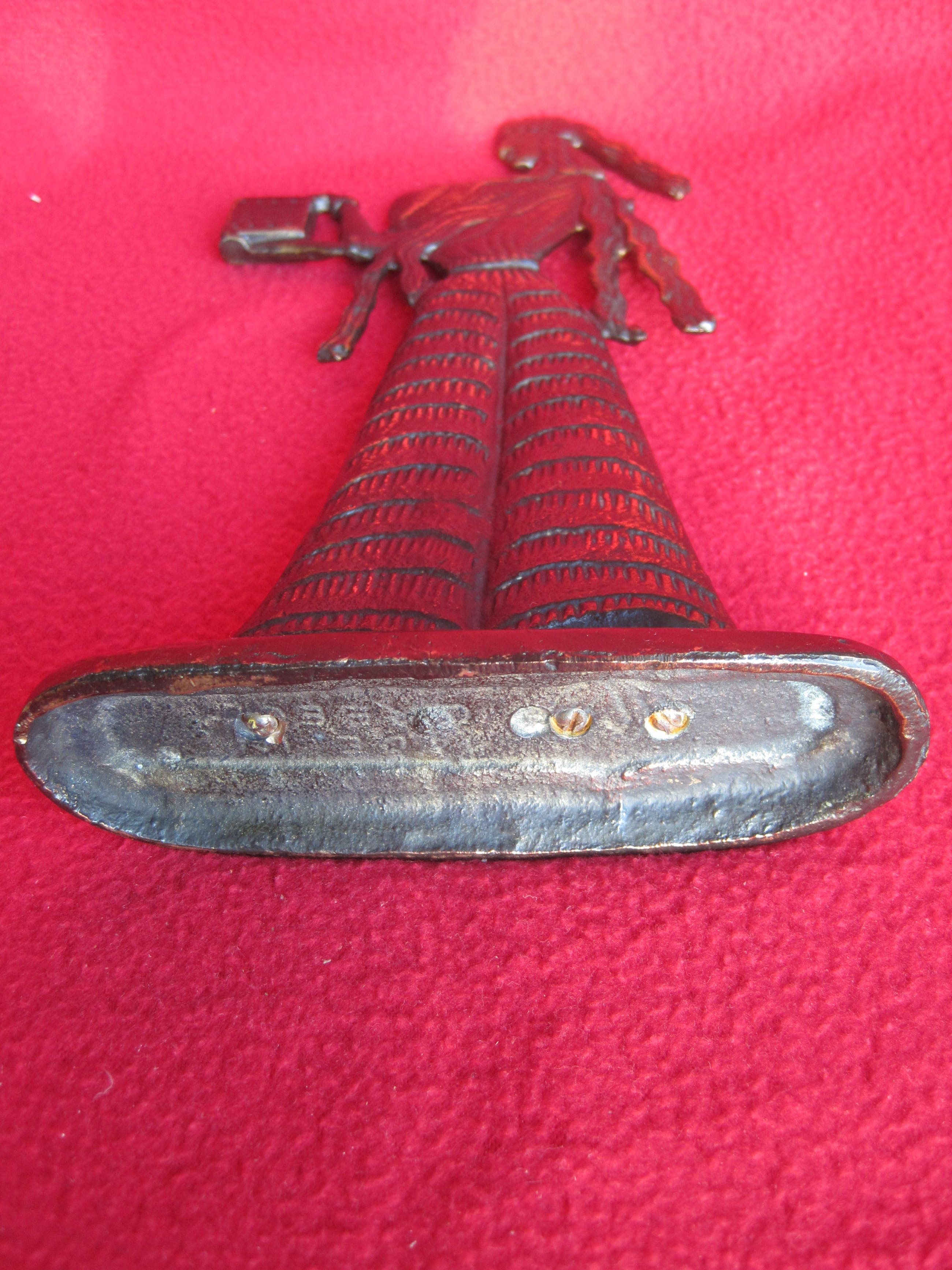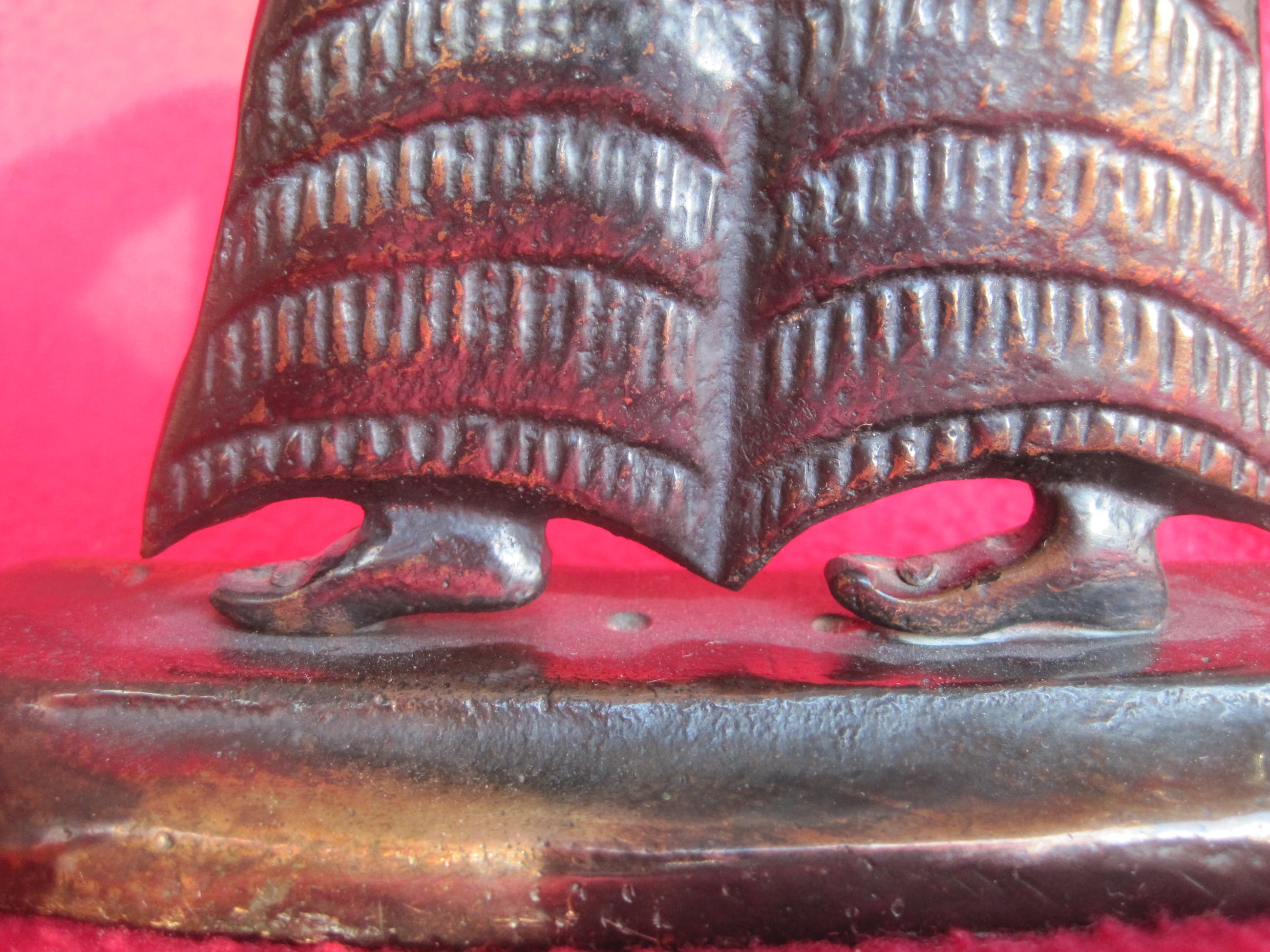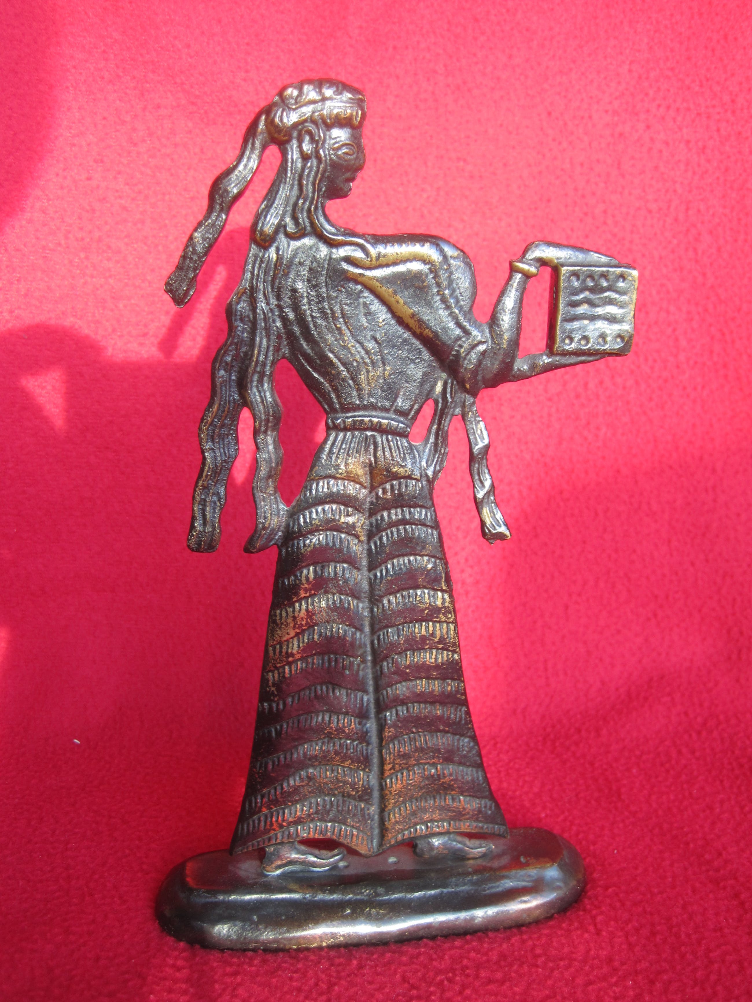 Een licht surrealistisch bronzen beeld van een vrouw met een doos in haar handen. Het beeld bestaat uit 2 delen: de sokkel zit aan het beeld geschroefd.