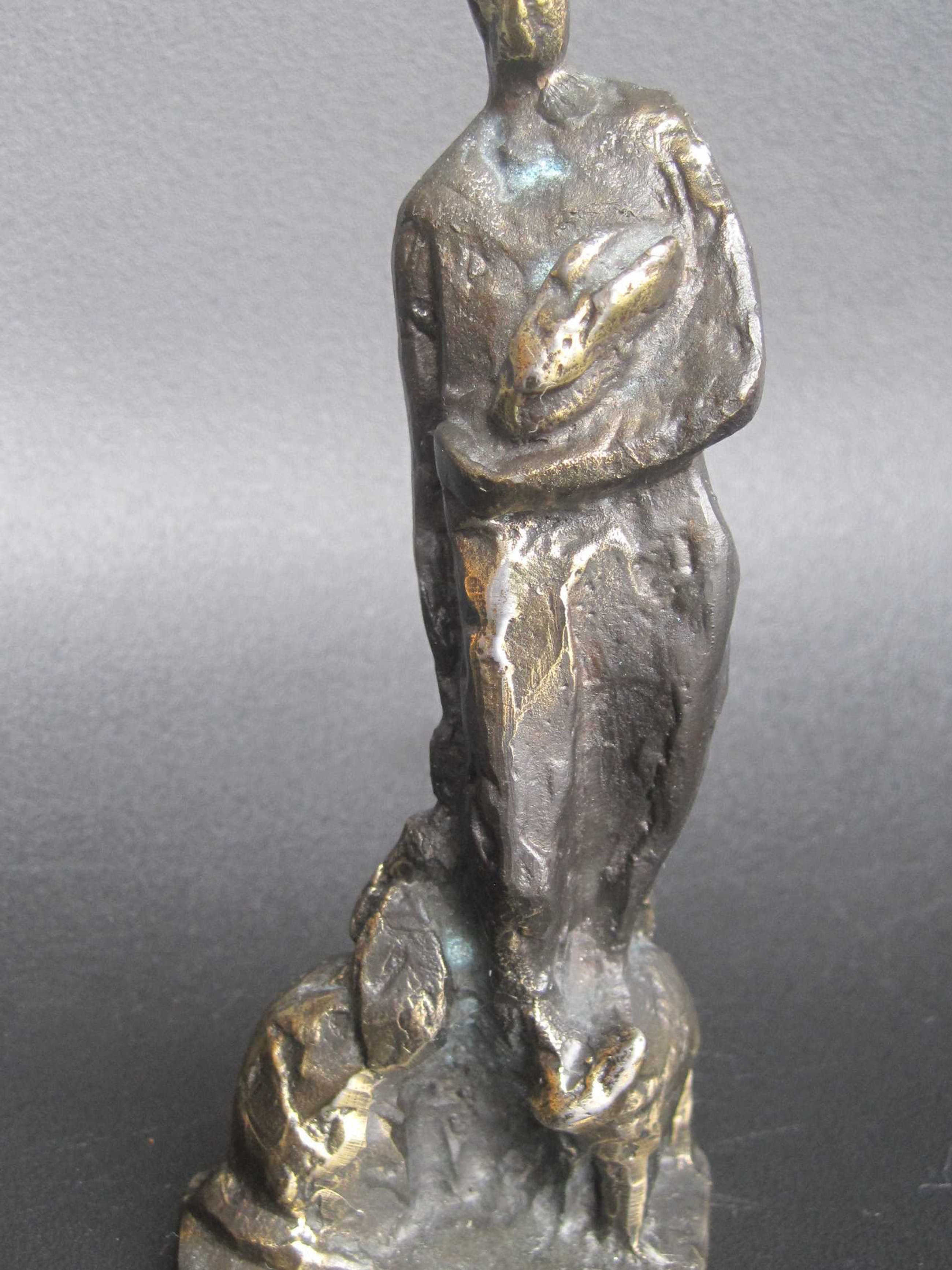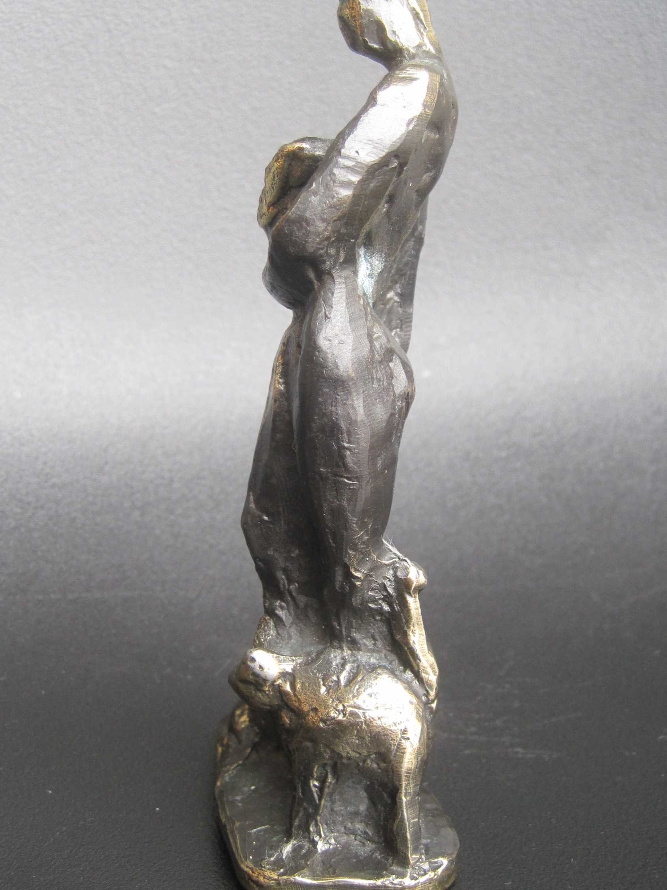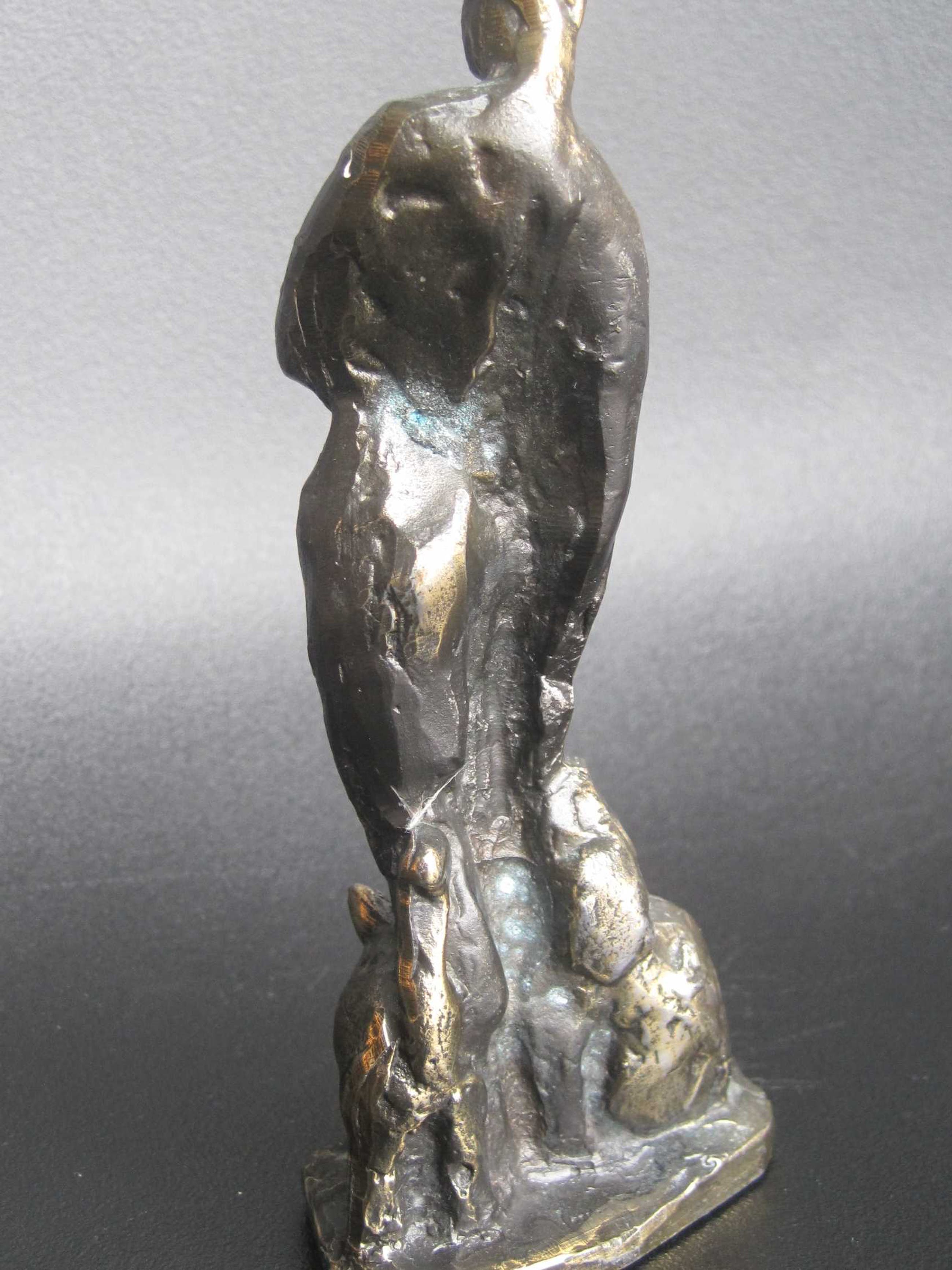 Een door een helaas onbekende getalenteerde kunstenaar gemaakt beeldje van brons.Een staande figuur met een konijn in de arm en een hond en kat aan de voet.Het beeldje is niet gesigneerd.Het beeldje verkeert in een heel goede staat.